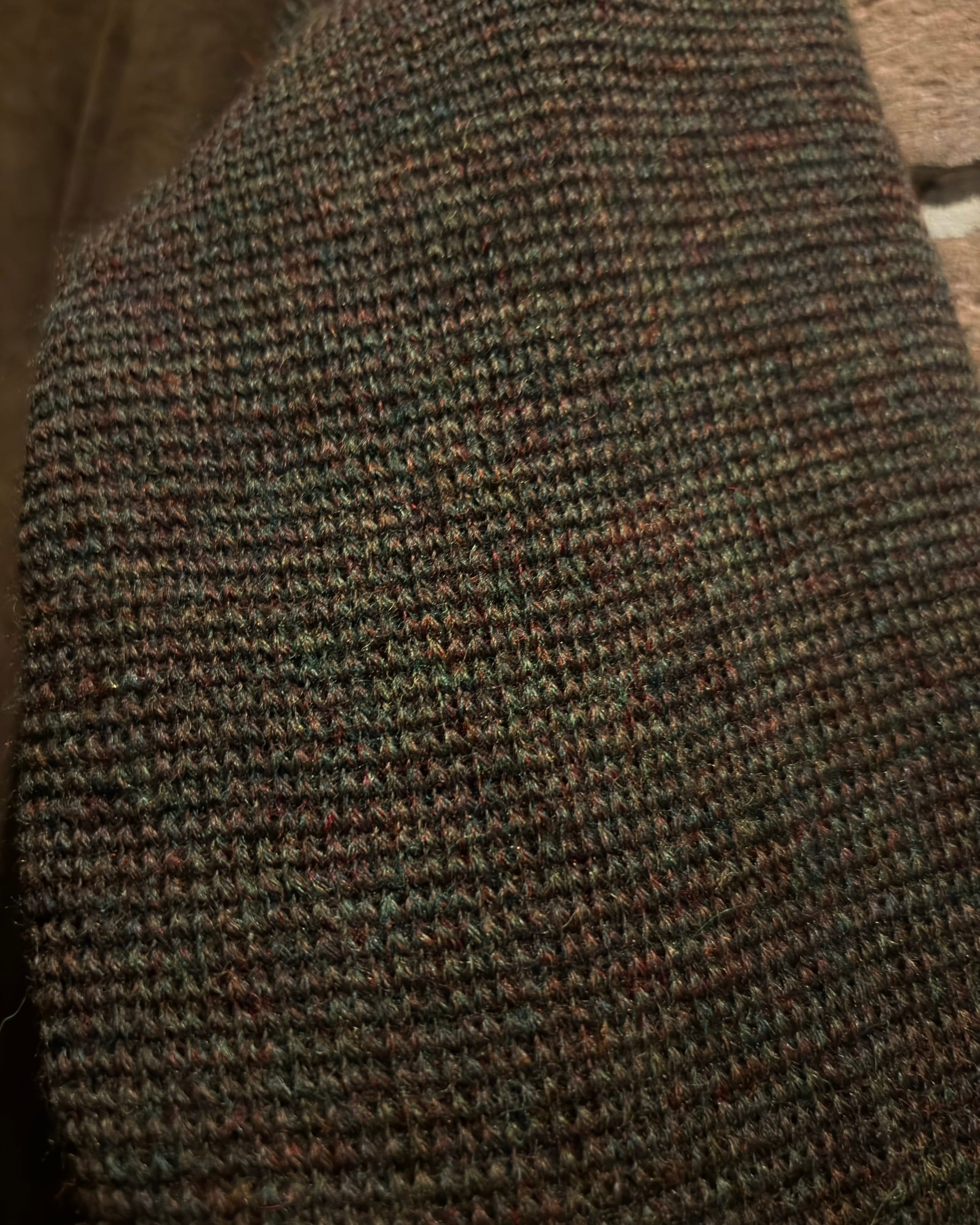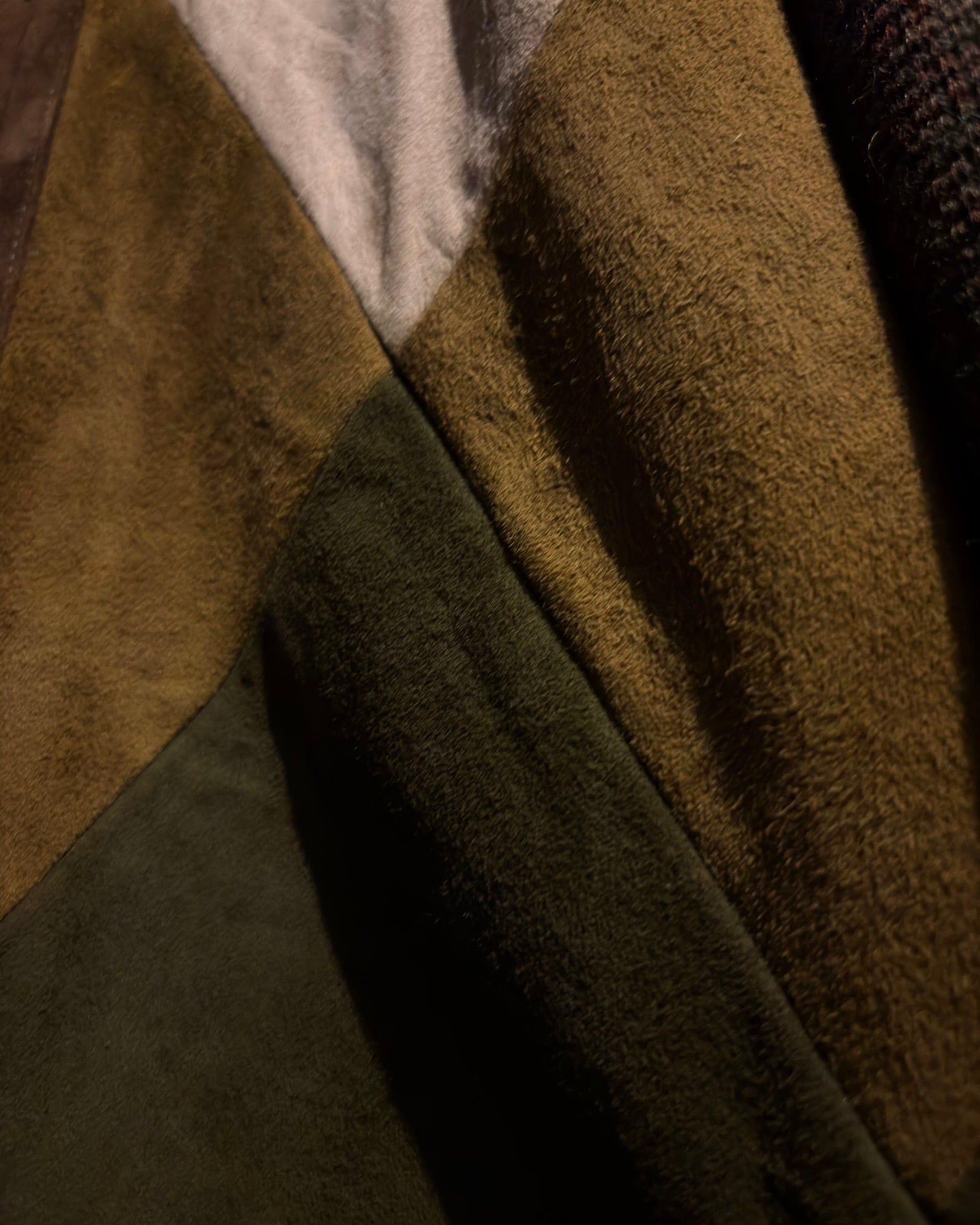落ち着いたブラウン、オリーブ、ベージュでダイヤ状に構成されたフロントは、スエードレザー特有の起毛感と相まって立体的な表情に。