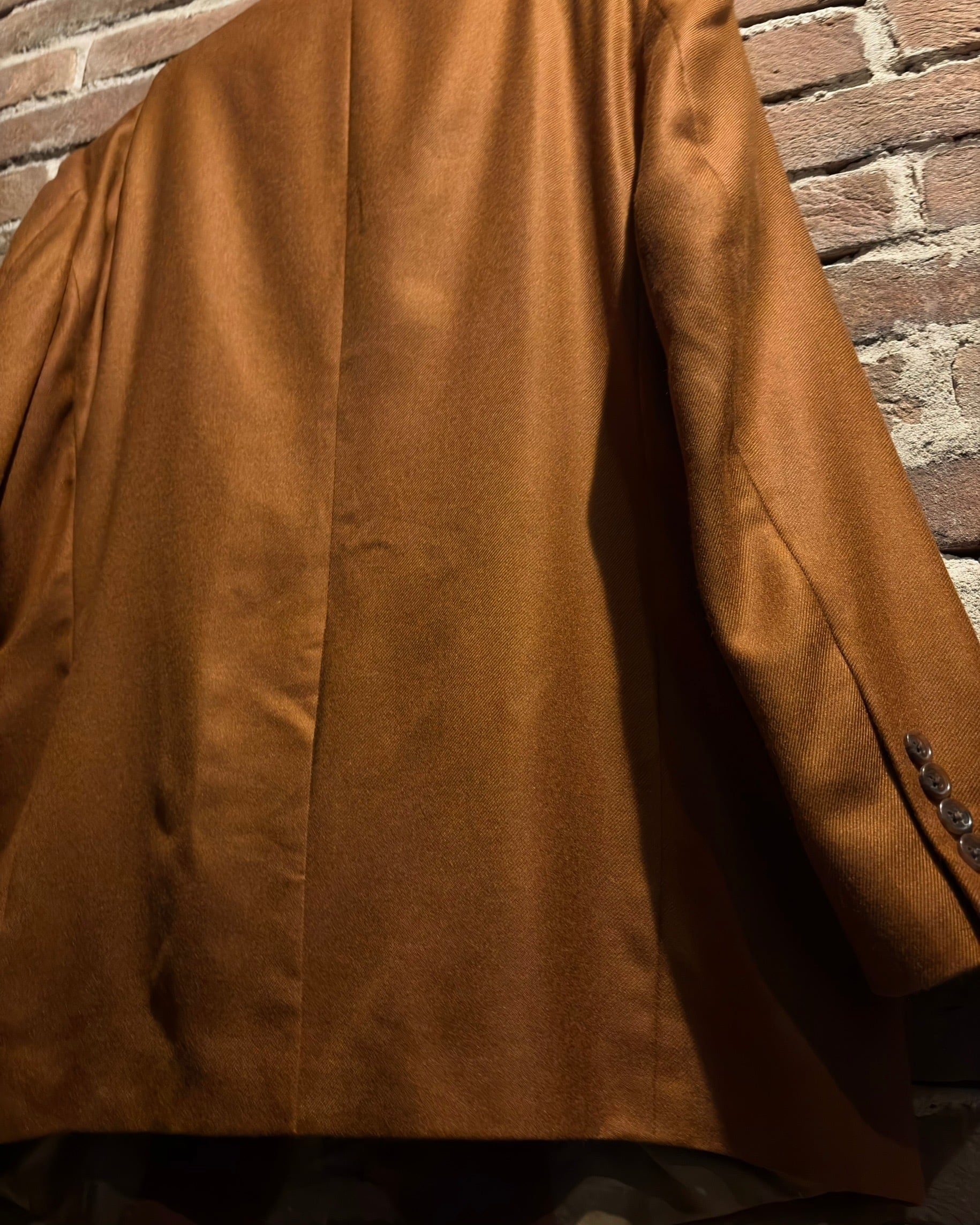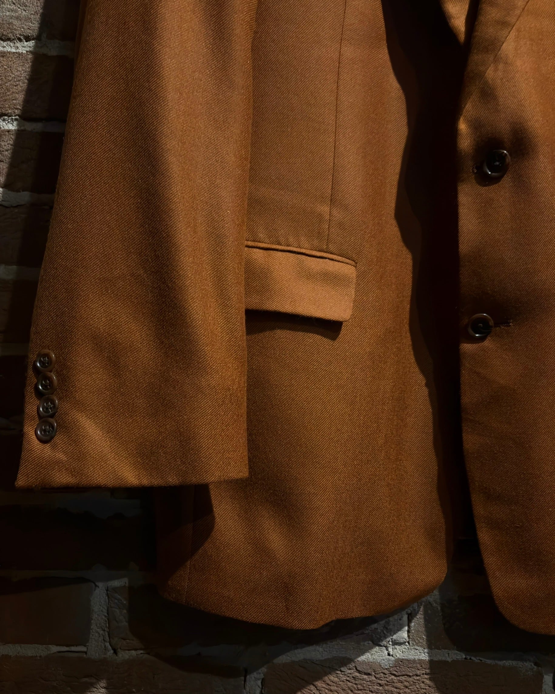手に取った瞬間に伝わる、とろみのある落ち感としっとりと吸い付くようなタッチ。ライトブラウンの中に奥行きを生む控えめな光沢が、ロロ・ピアーナらしい圧倒的クオリティを一目で、そして一触で感じさせてくれる1着です。