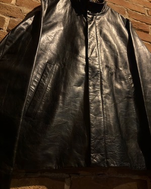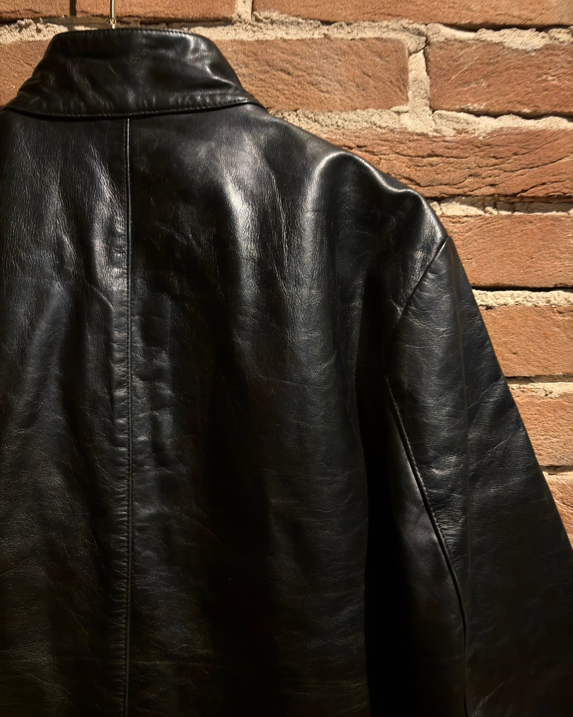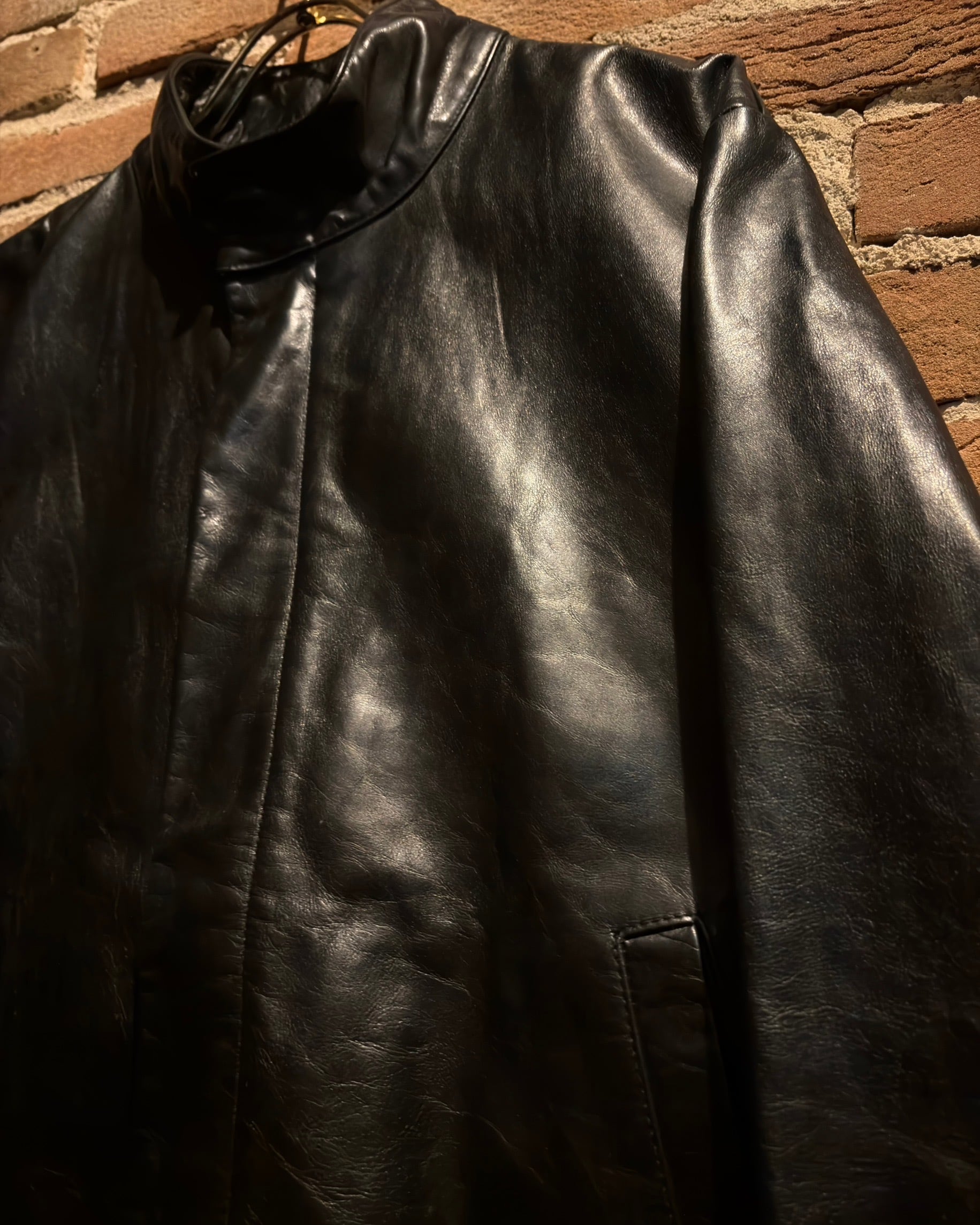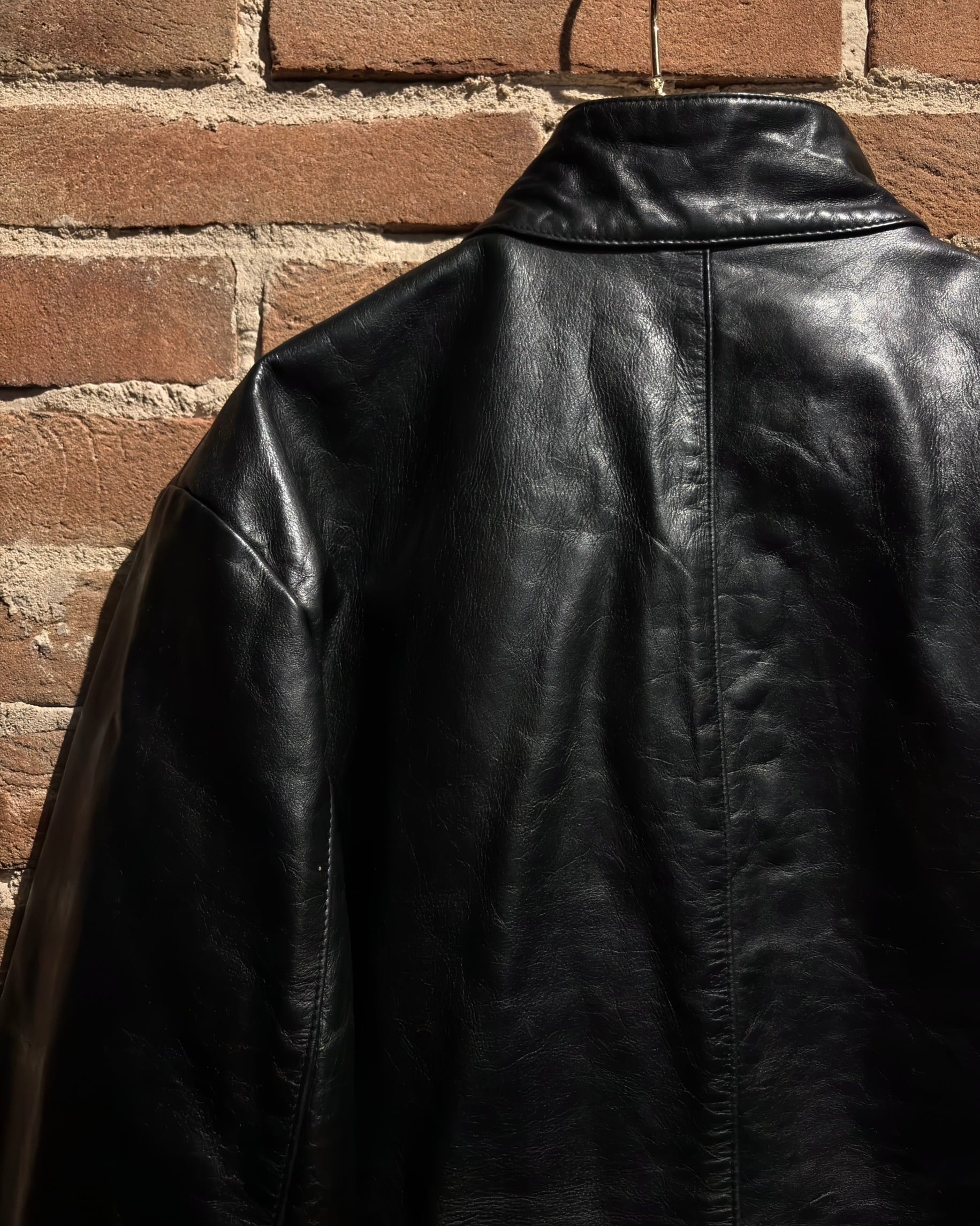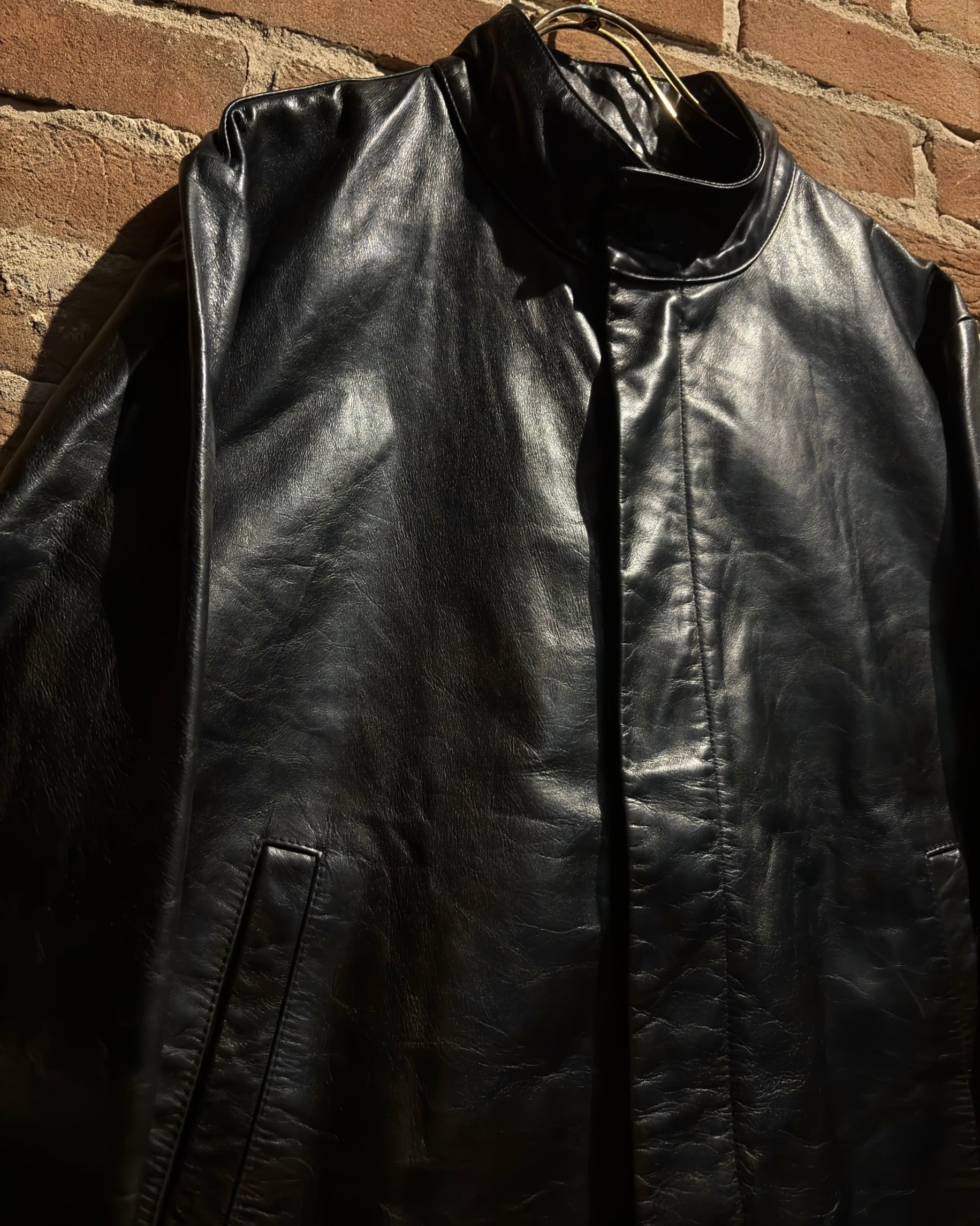 襟元はすっきりとしたスタンドカラー。フロントはジップとスナップボタンを組み合わせた比翼仕立てで、レザーの質感とシルエットをよりクリーンに引き立てる構成。派手さはありませんが、素材のクオリティによってプロダクトとしての高さをしっかり感じられます。