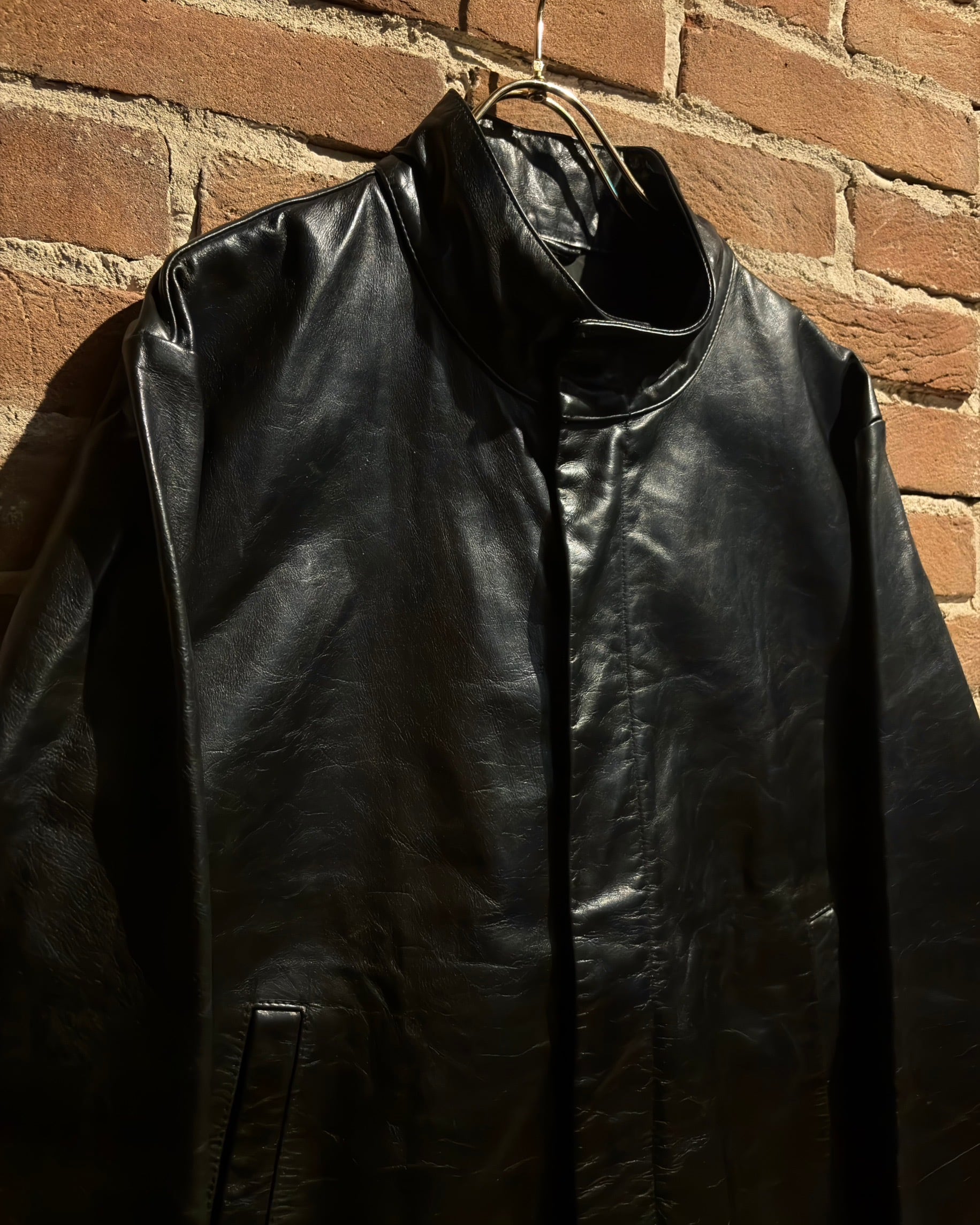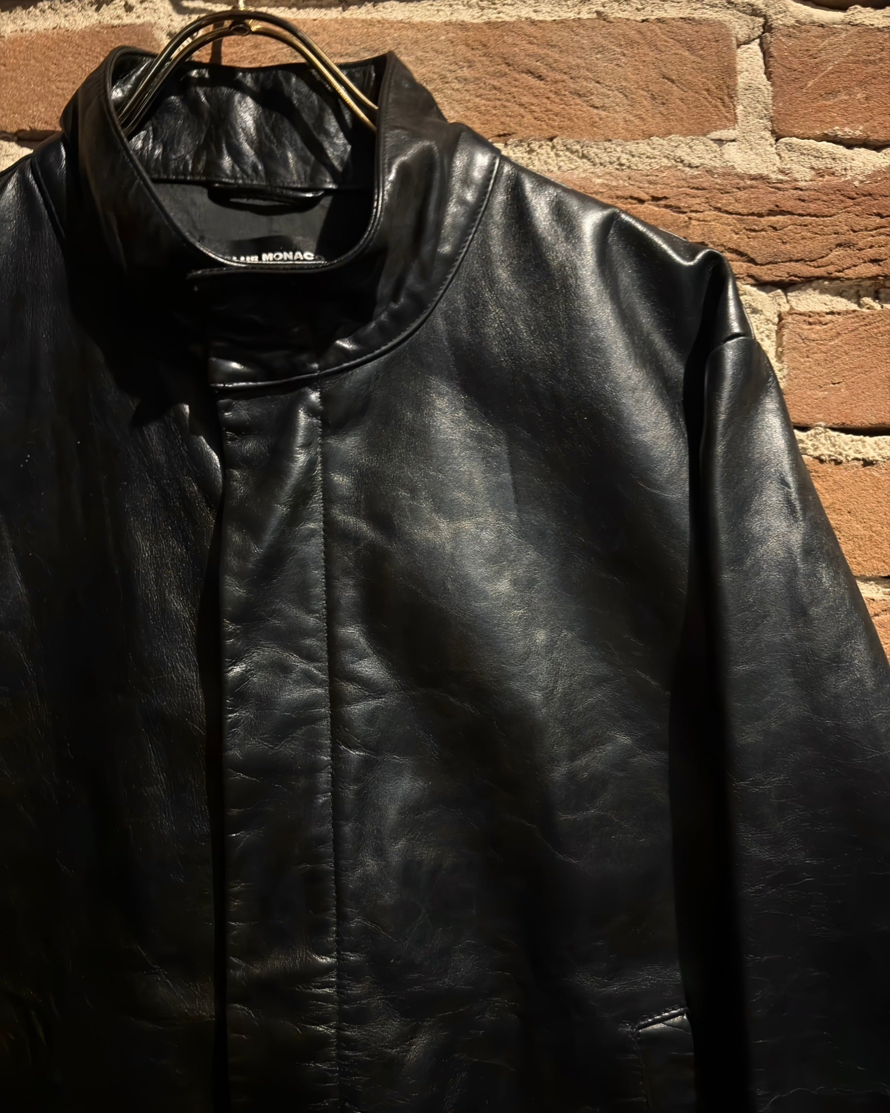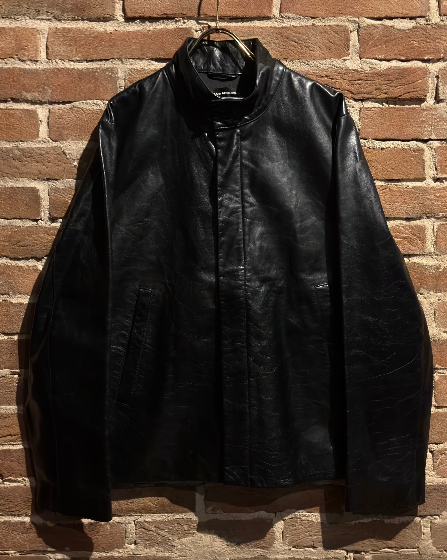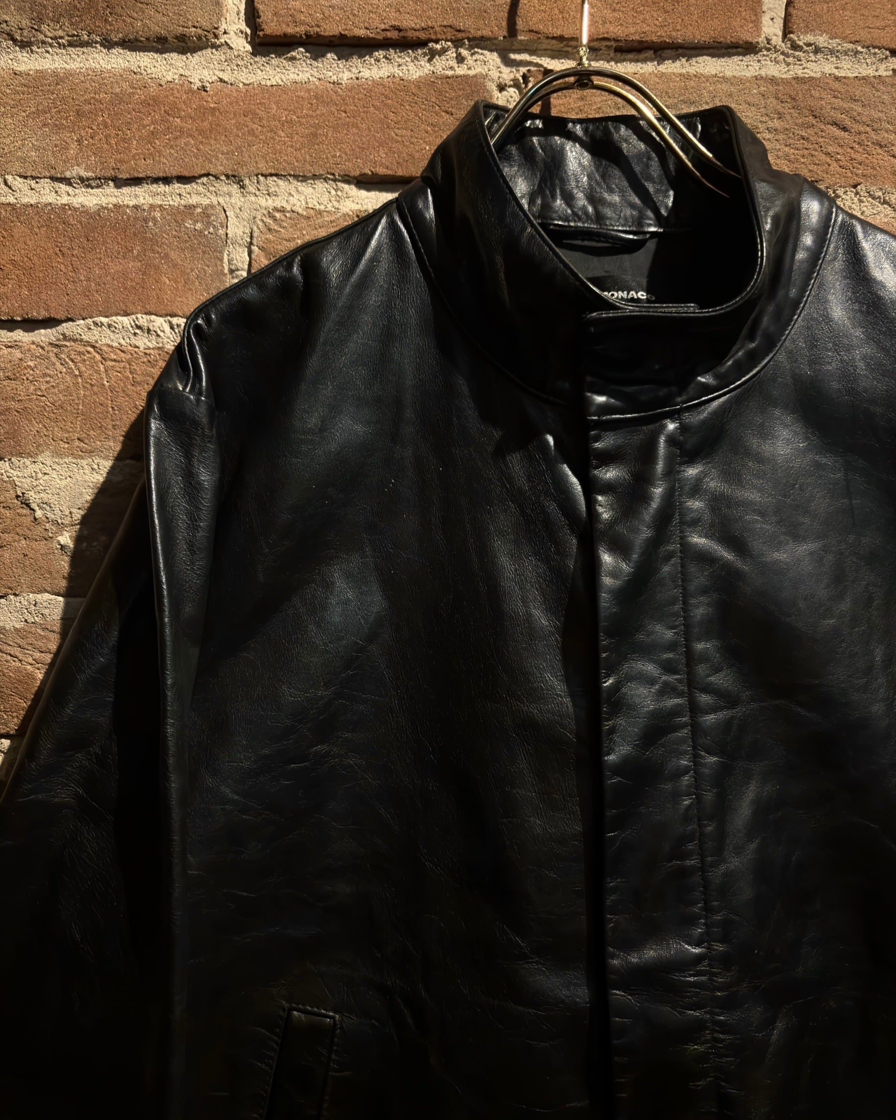 襟元はすっきりとしたスタンドカラー。フロントはジップとスナップボタンを組み合わせた比翼仕立てで、レザーの質感とシルエットをよりクリーンに引き立てる構成。派手さはありませんが、素材のクオリティによってプロダクトとしての高さをしっかり感じられます。