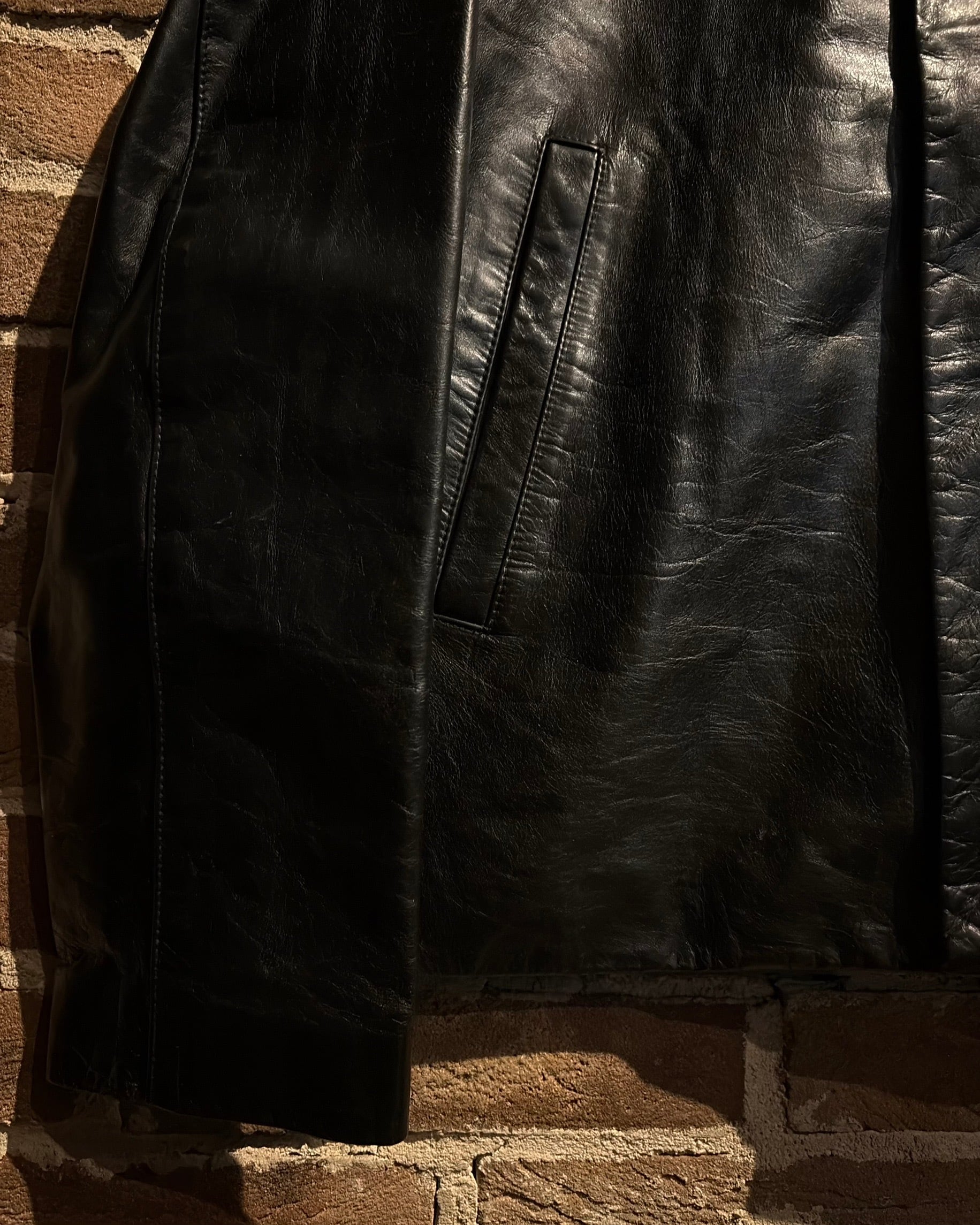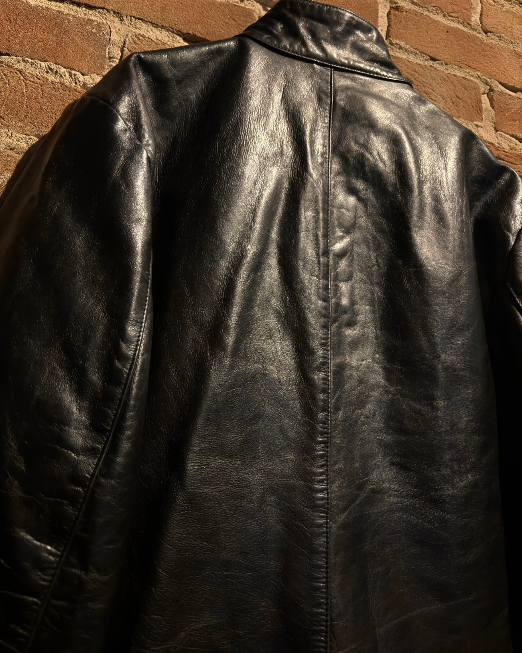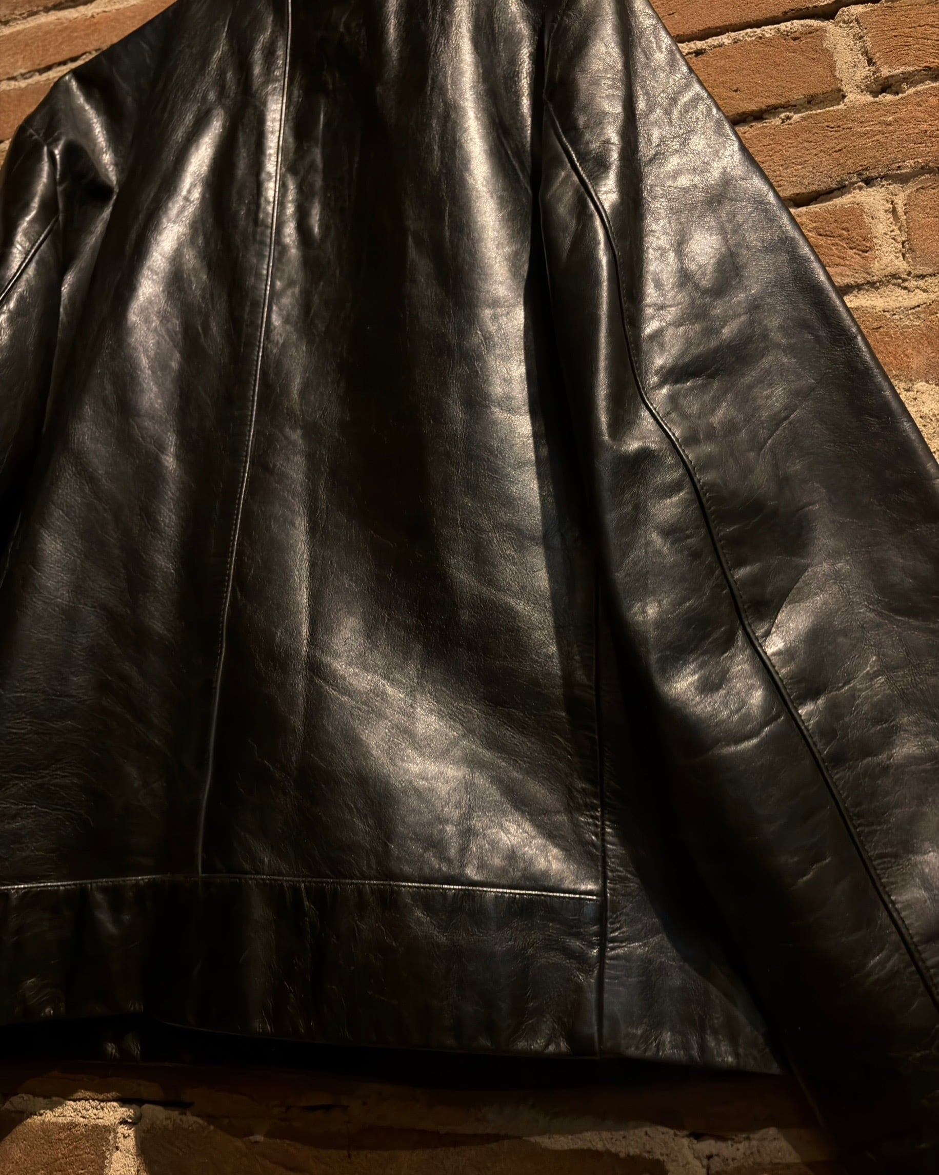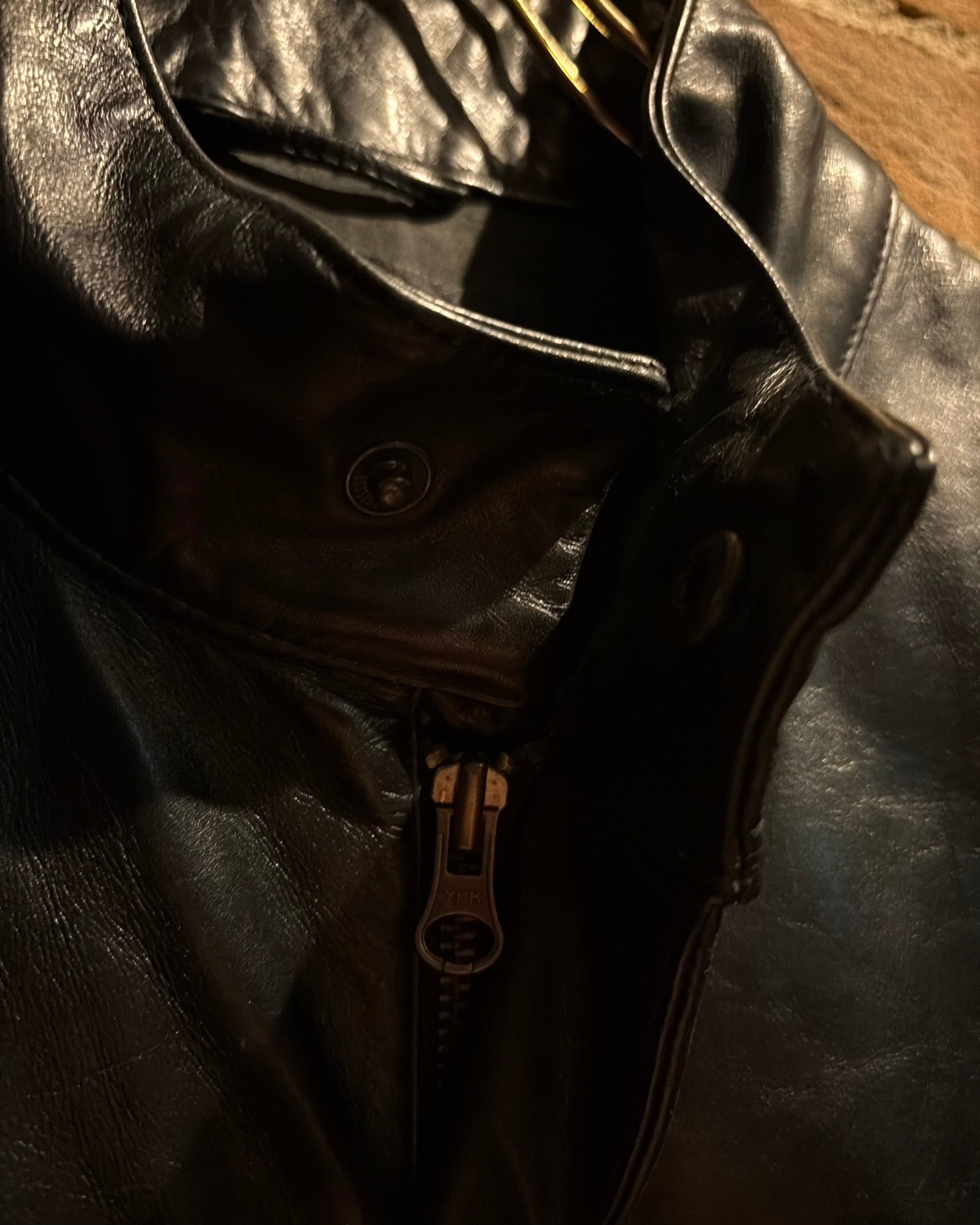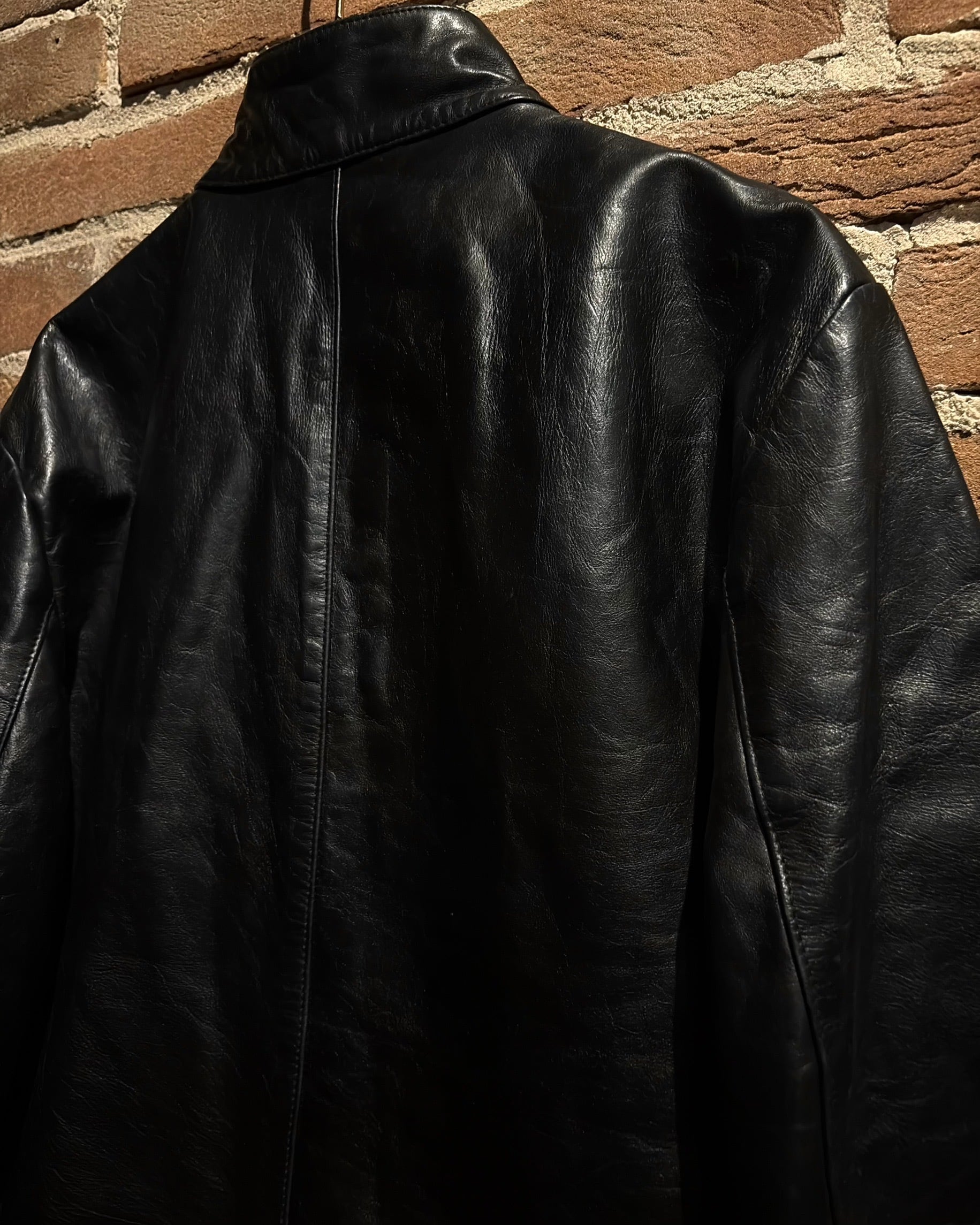 襟元はすっきりとしたスタンドカラー。フロントはジップとスナップボタンを組み合わせた比翼仕立てで、レザーの質感とシルエットをよりクリーンに引き立てる構成。派手さはありませんが、素材のクオリティによってプロダクトとしての高さをしっかり感じられます。