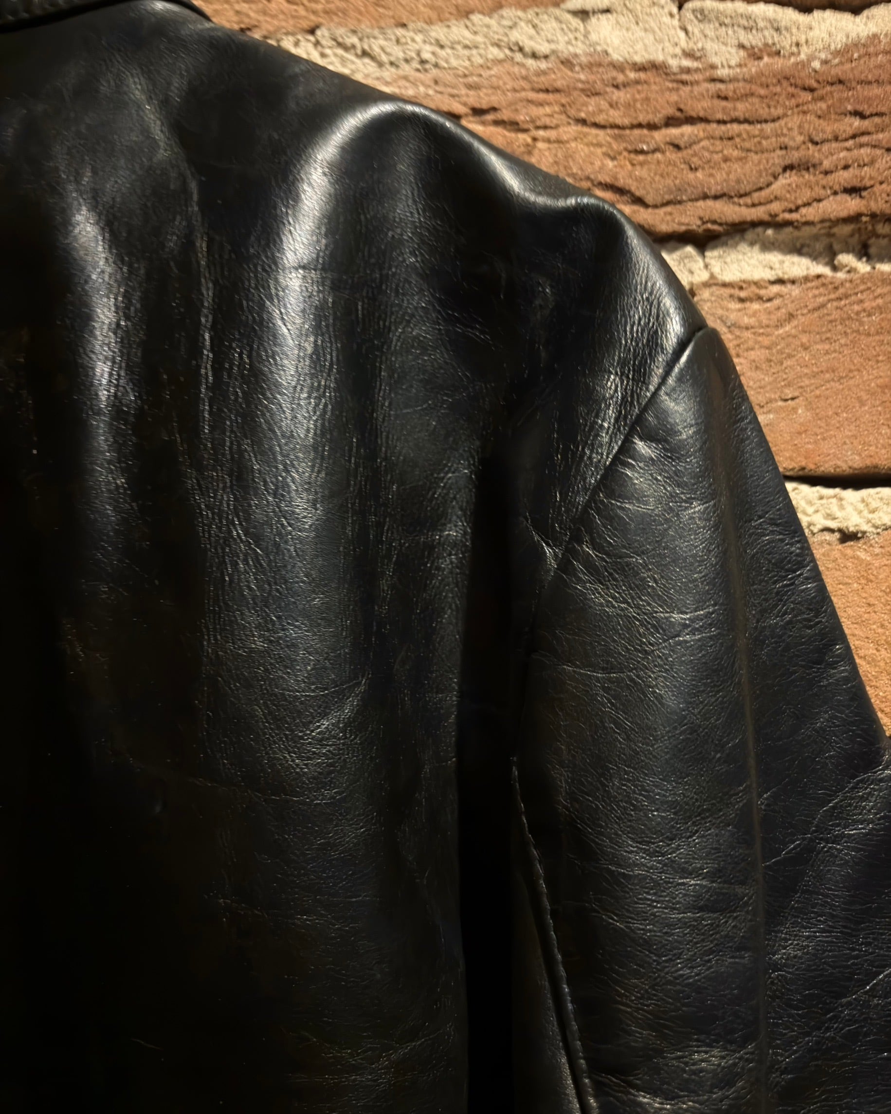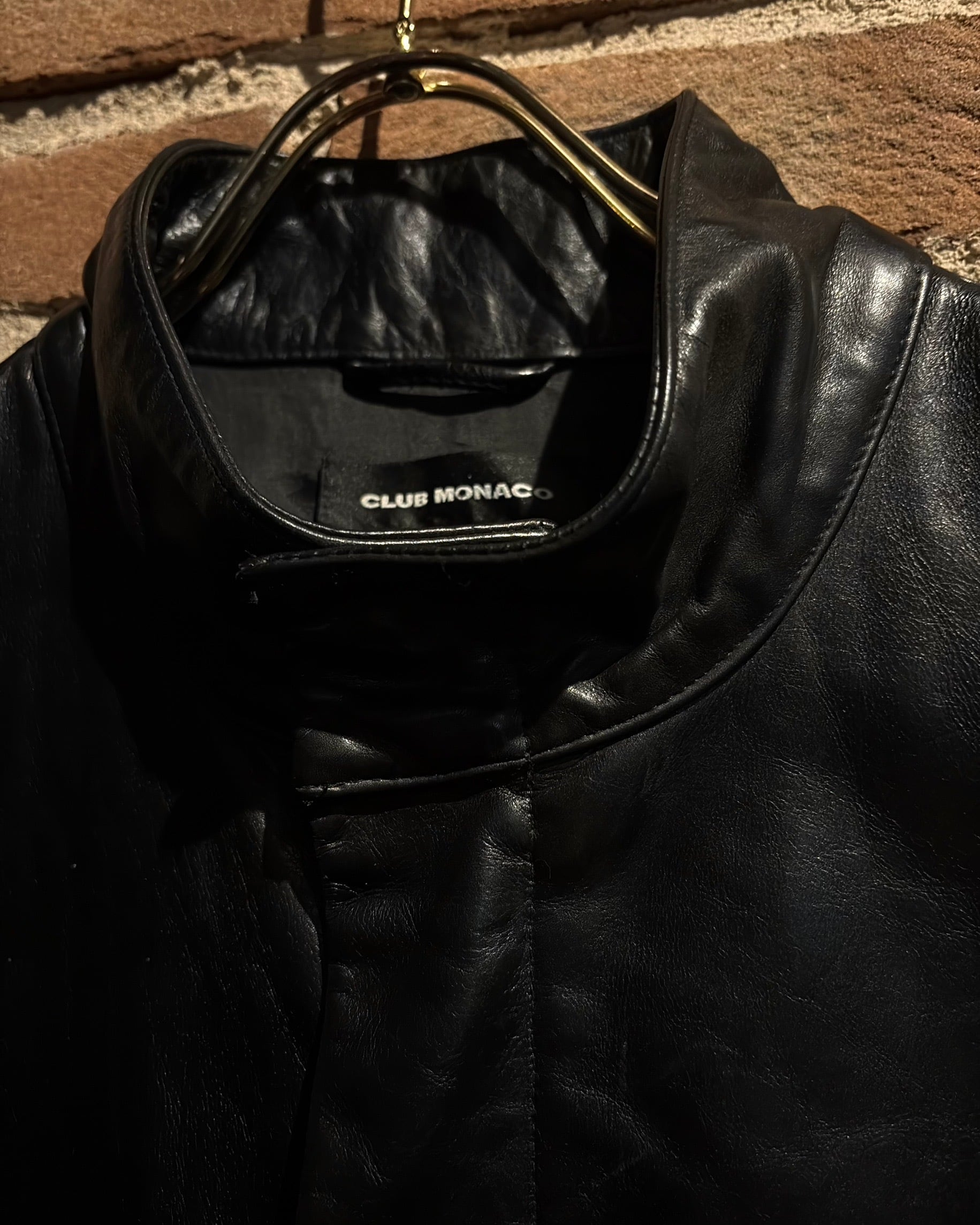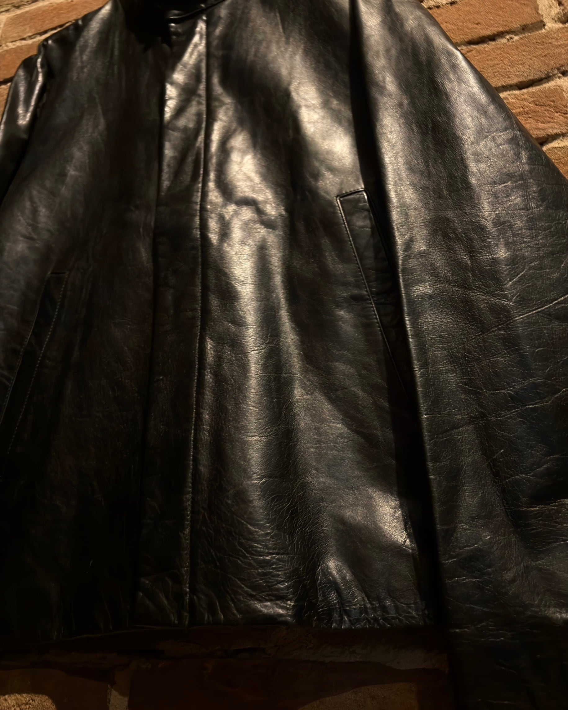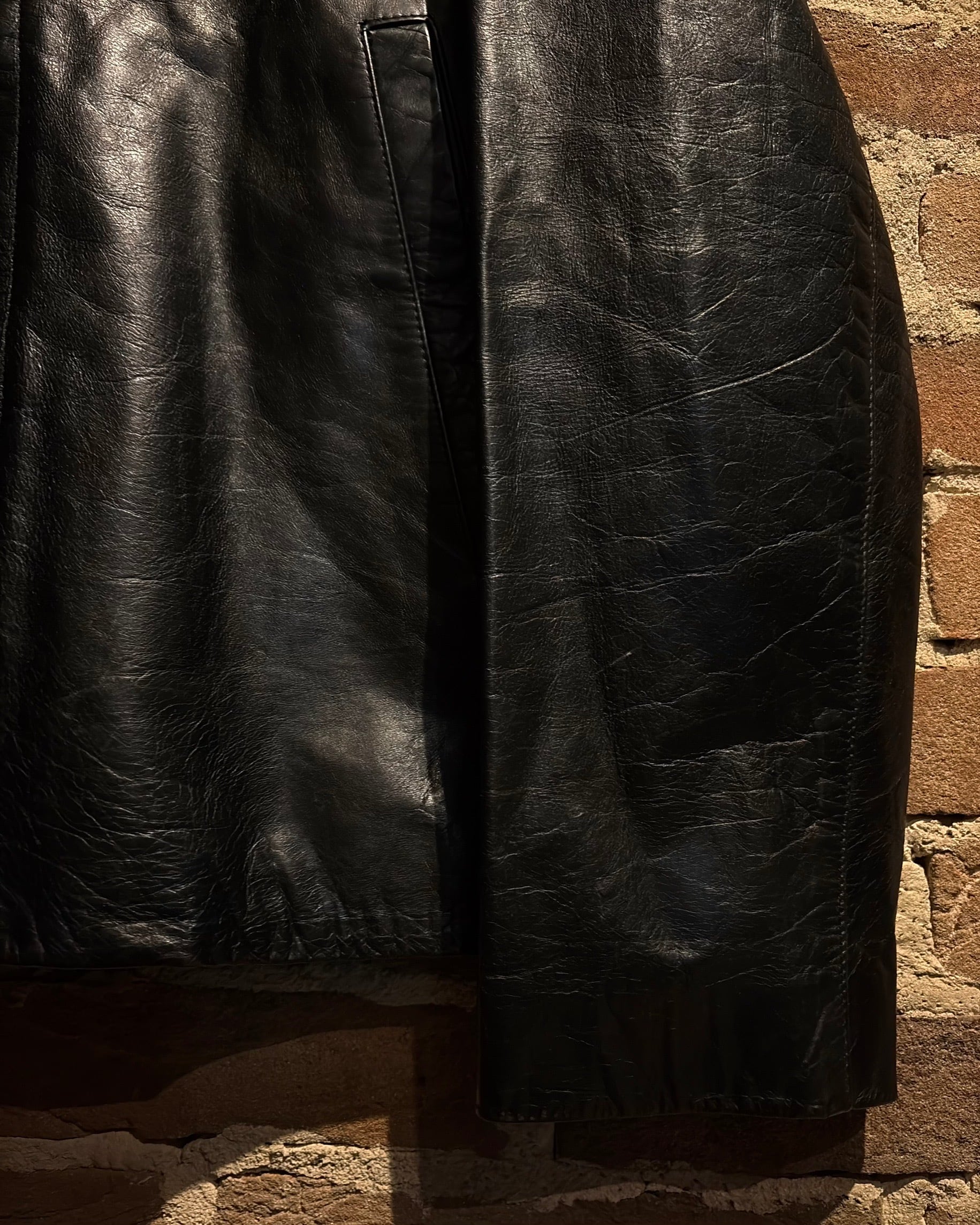 襟元はすっきりとしたスタンドカラー。フロントはジップとスナップボタンを組み合わせた比翼仕立てで、レザーの質感とシルエットをよりクリーンに引き立てる構成。派手さはありませんが、素材のクオリティによってプロダクトとしての高さをしっかり感じられます。