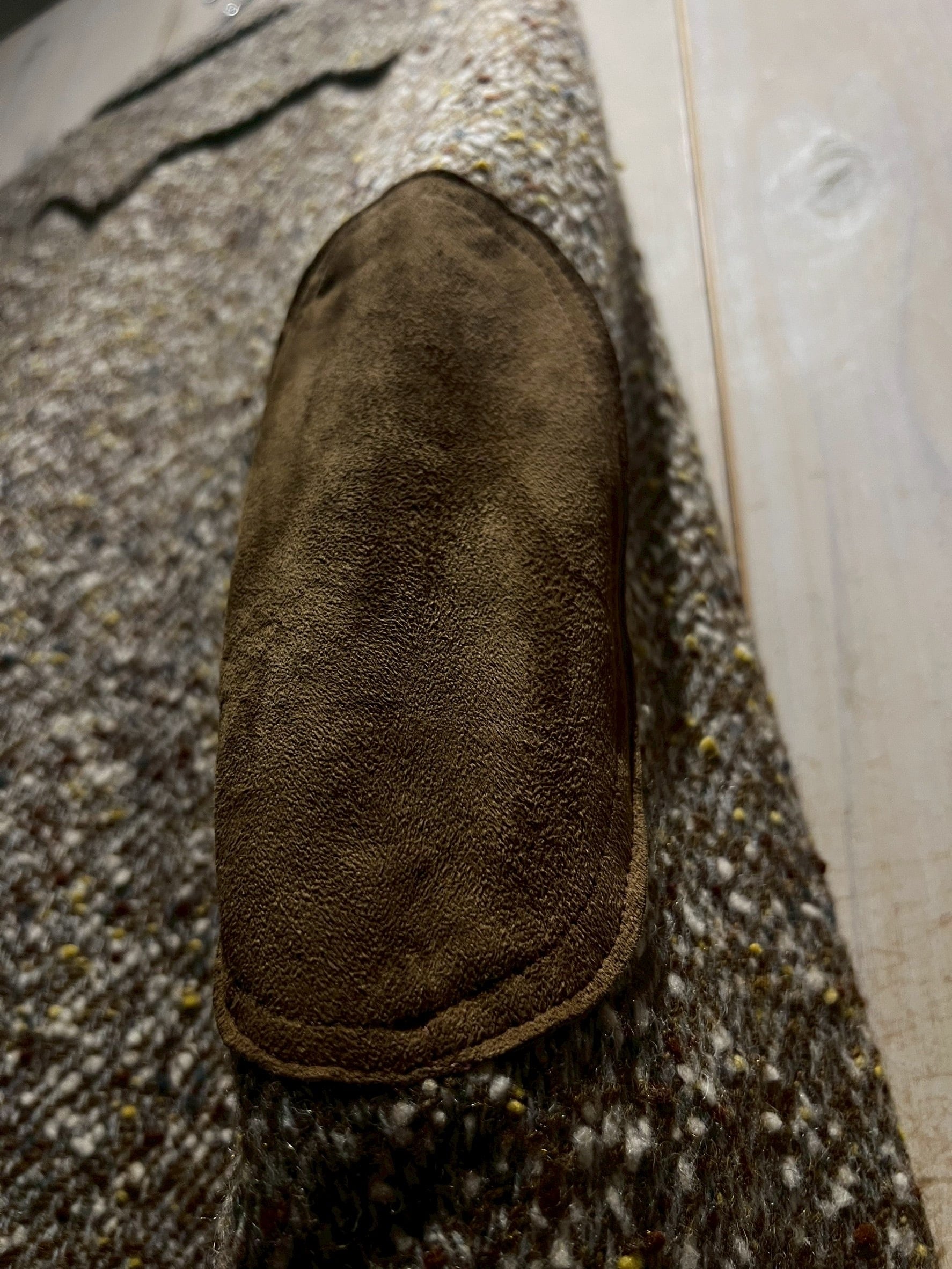 表情豊かなネップツイードのボディは、糸の凹凸や混ざり合う色味によって奥行きのある佇まいを演出。そこにスエードレザーを切り替えることで、素材のコントラストがより一層際立つ1着に仕上げられています。