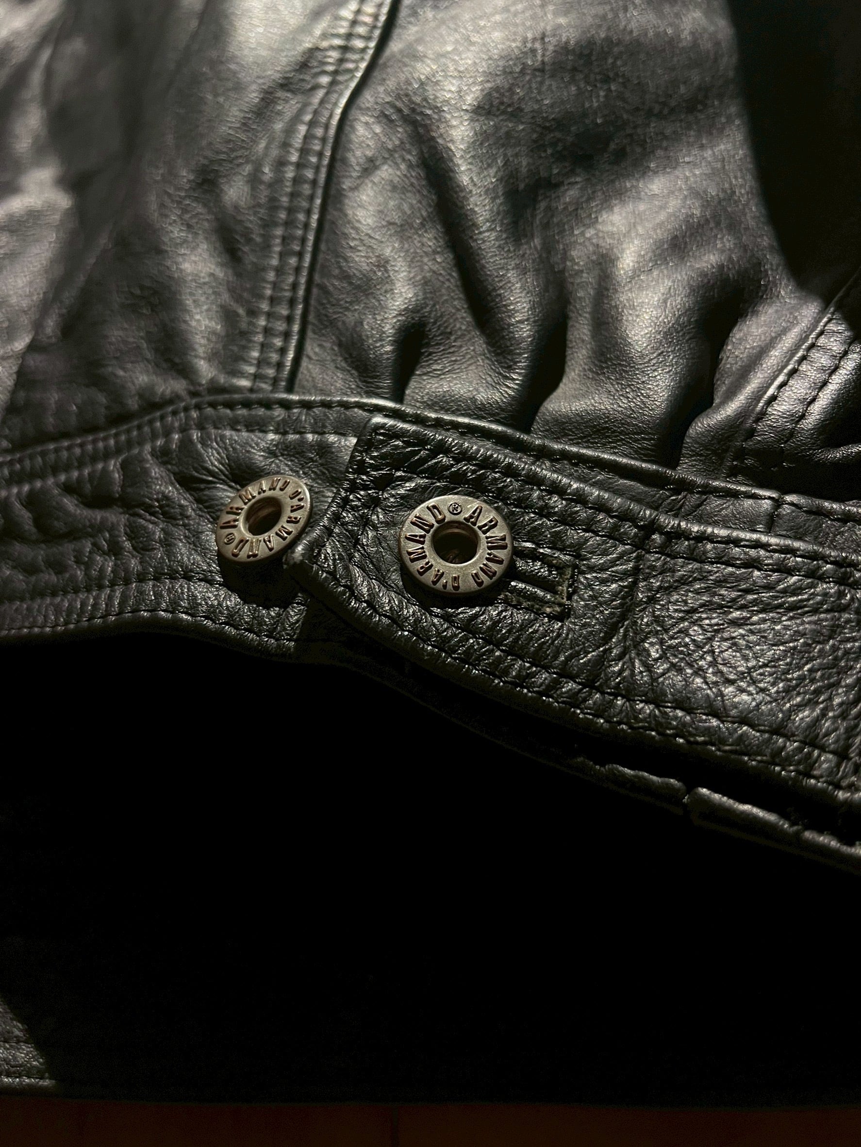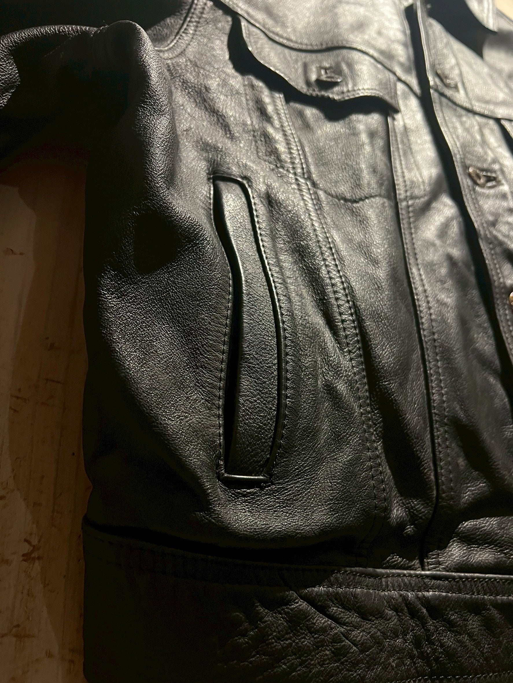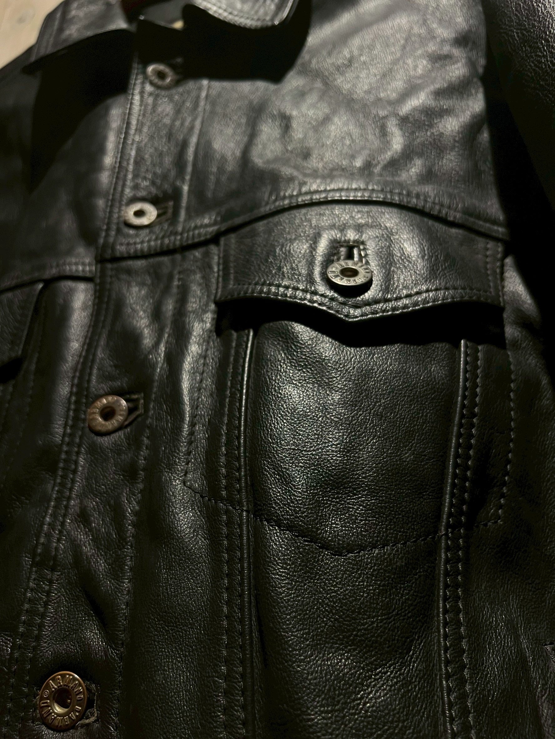フロントのフラップポケットやV字の切り替え、背面など、トラッカー型らしい王道ディテールを踏襲しつつ、レザー特有の重厚感によって一段階上のムードに昇華されています。
