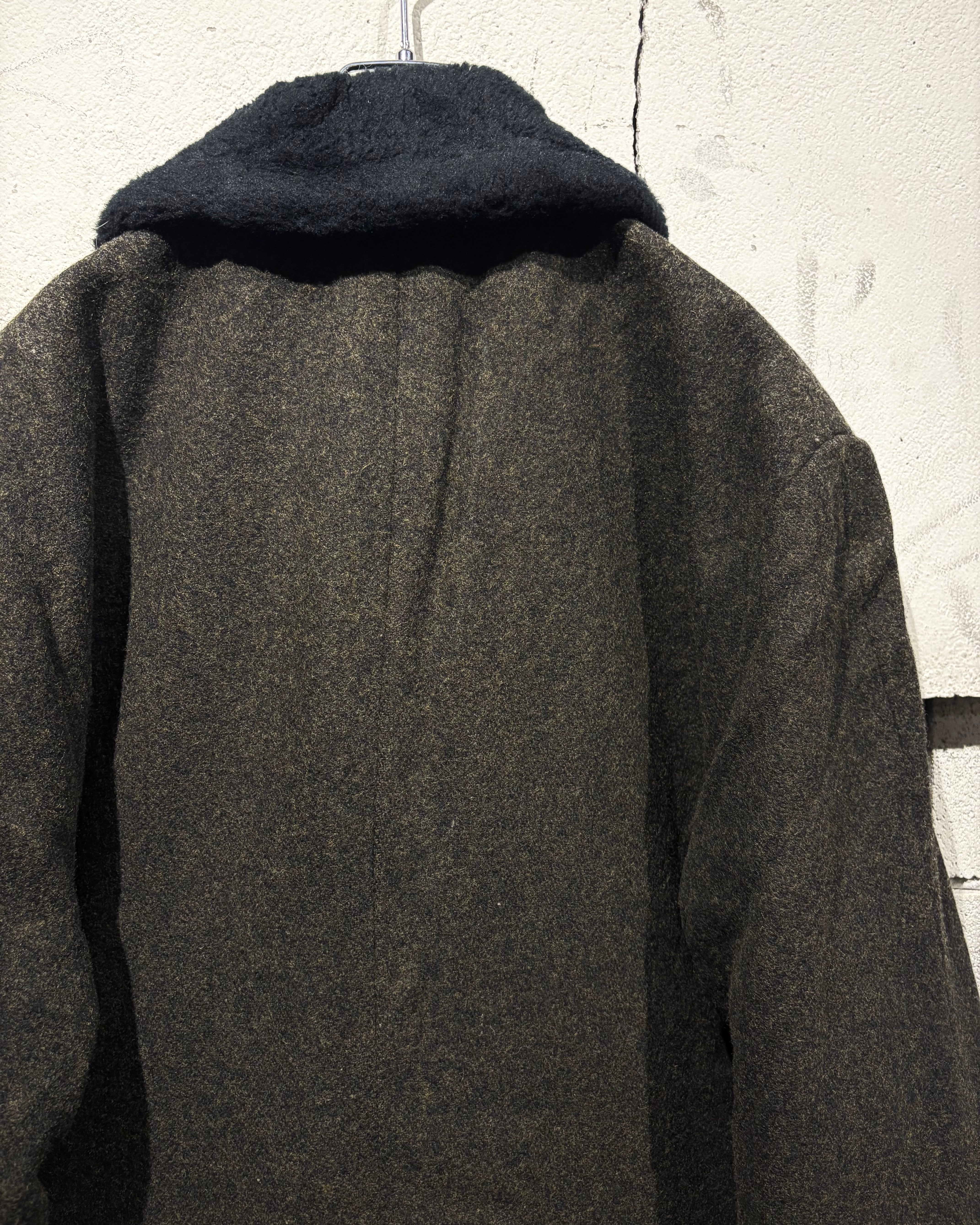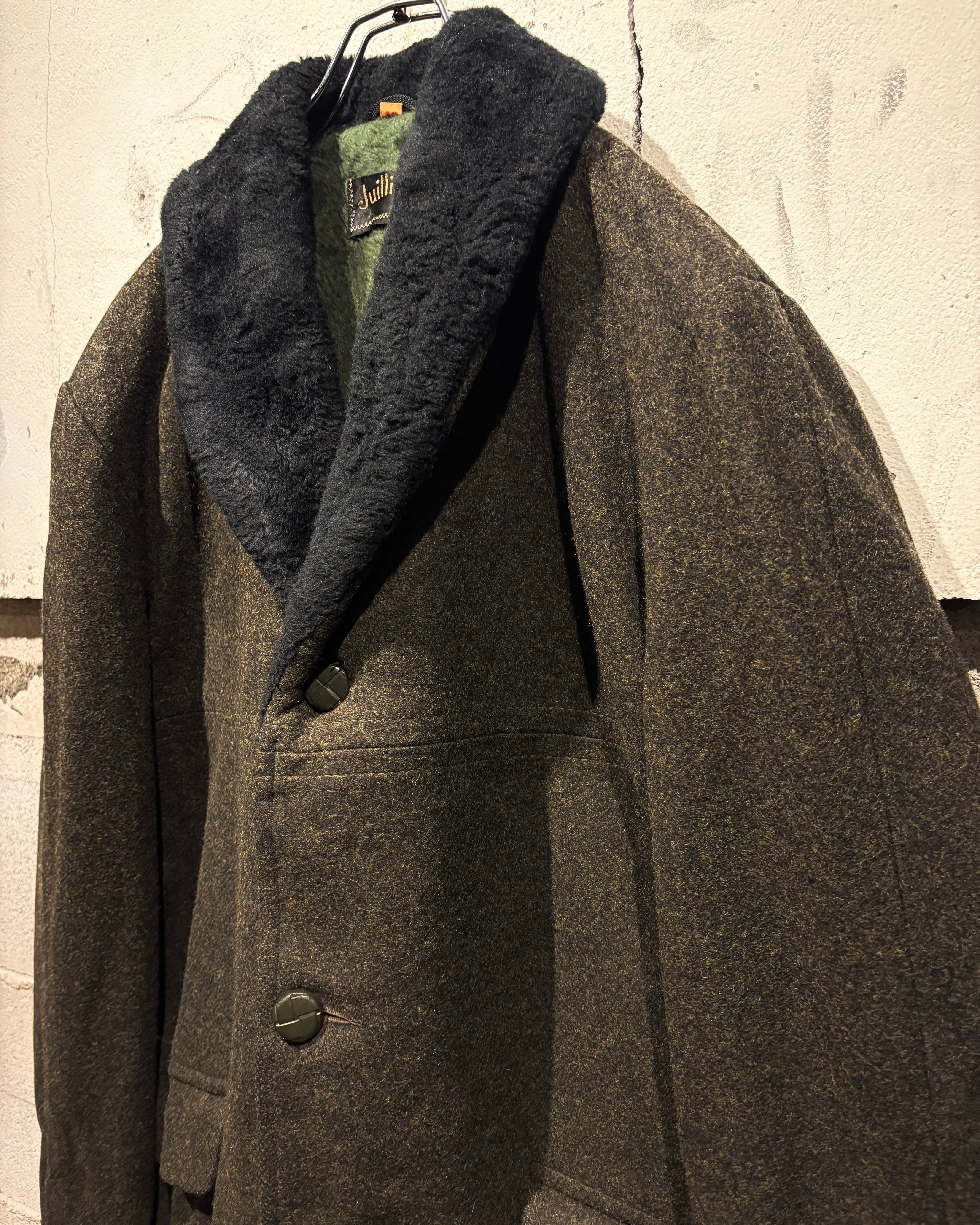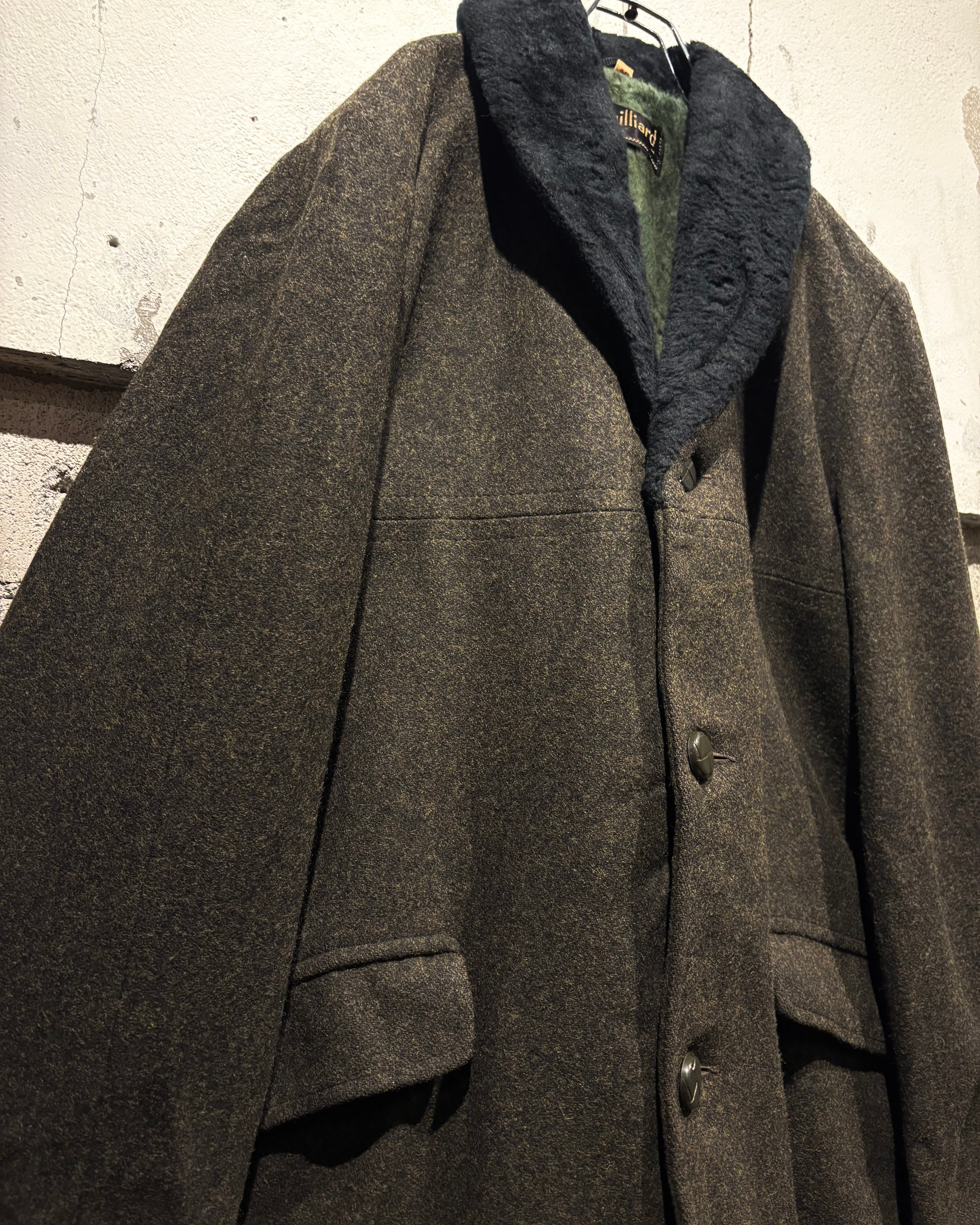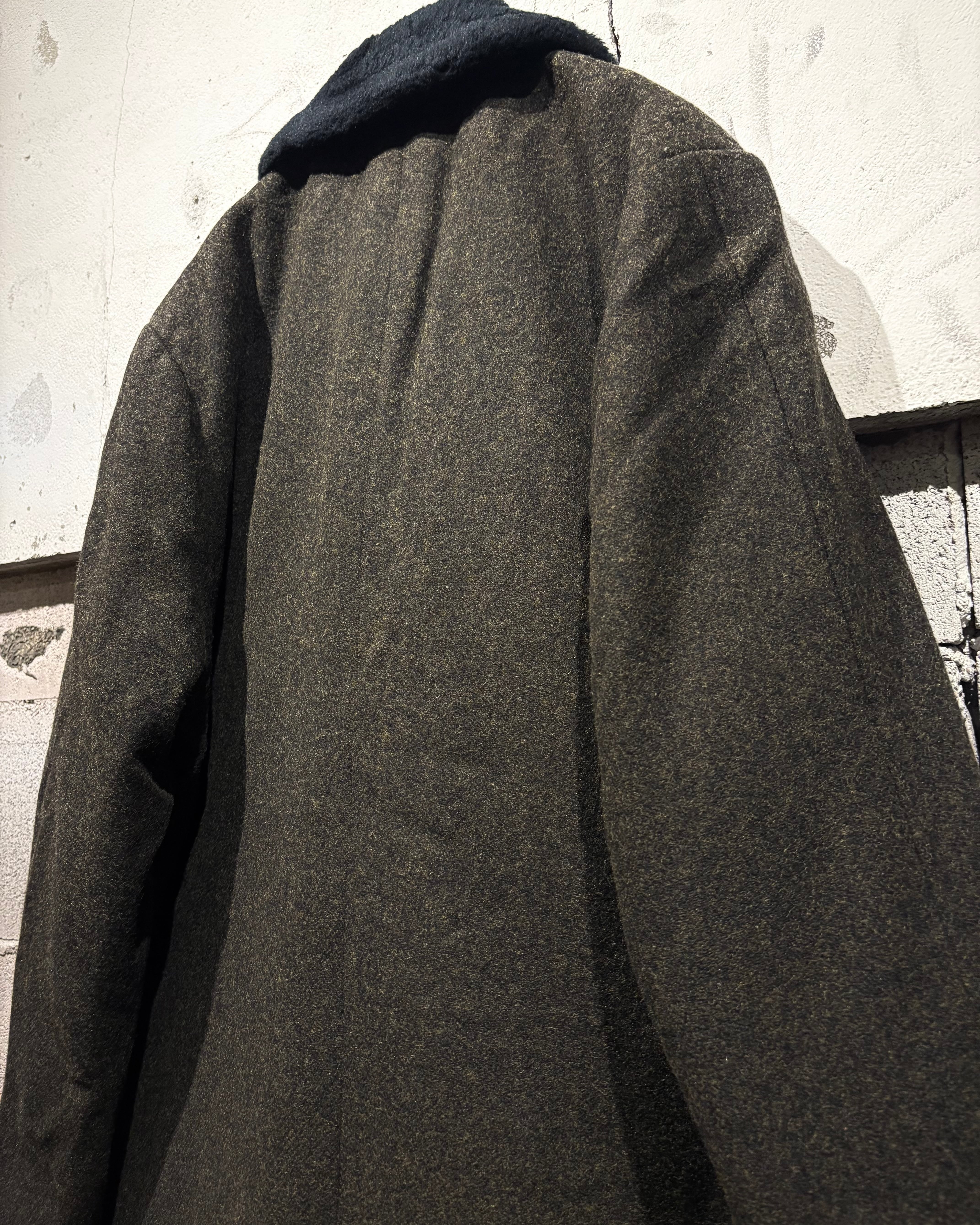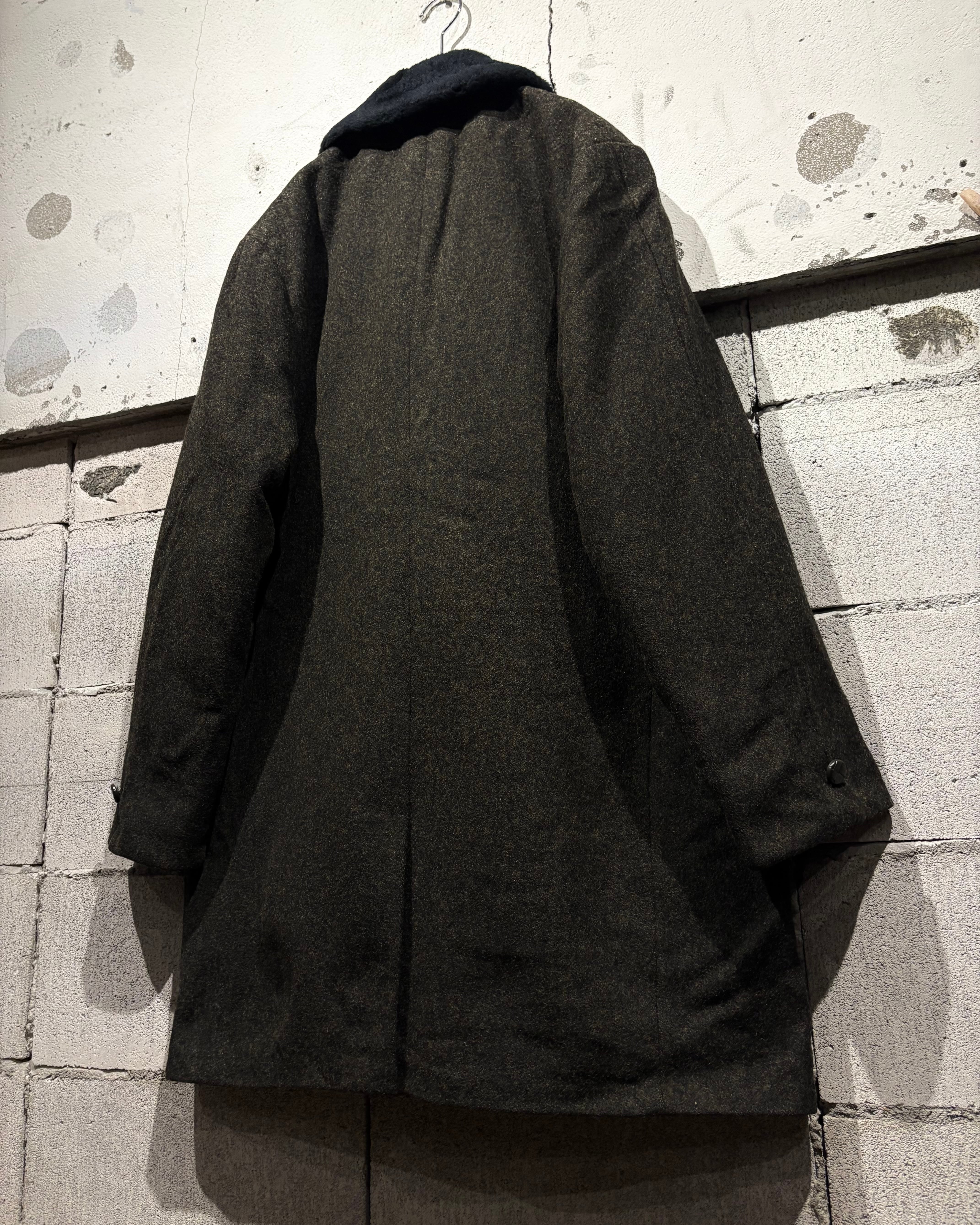 ハリを持ちつつも柔らかく、肉感のあるウールを用いたボディに、襟にはエコファーを切り替えた60'sヴィンテージのコート。