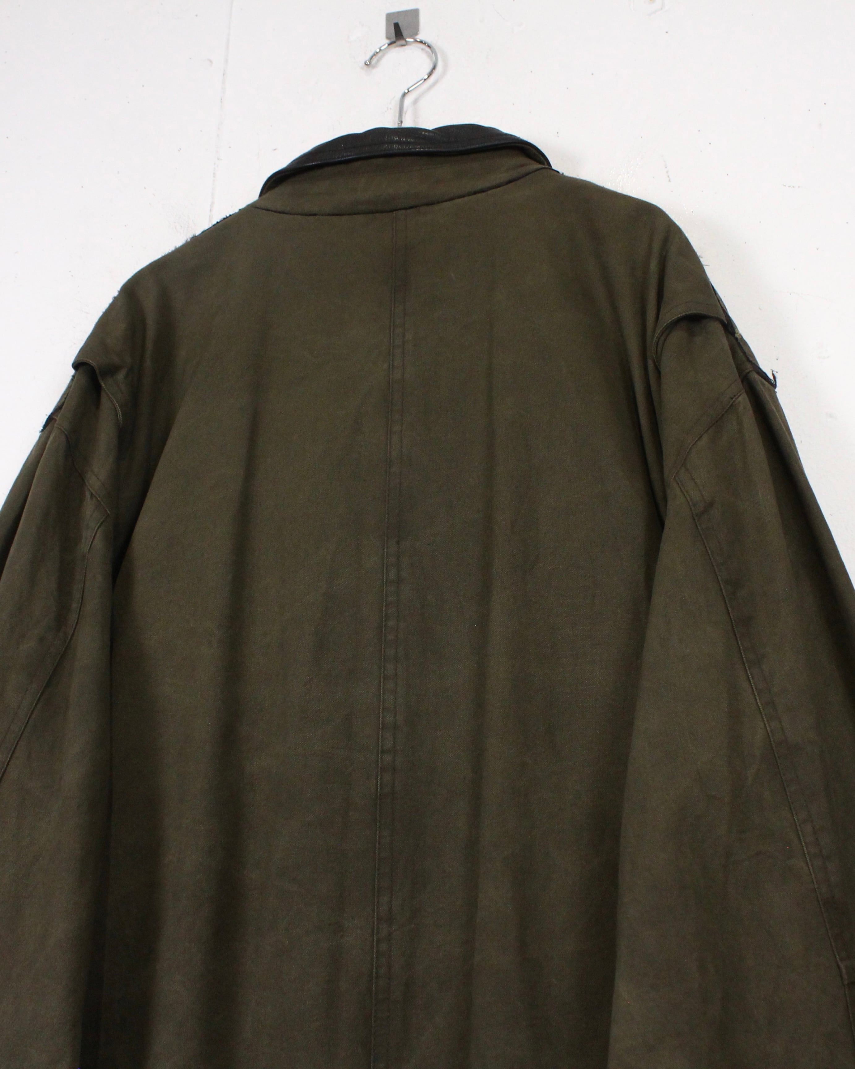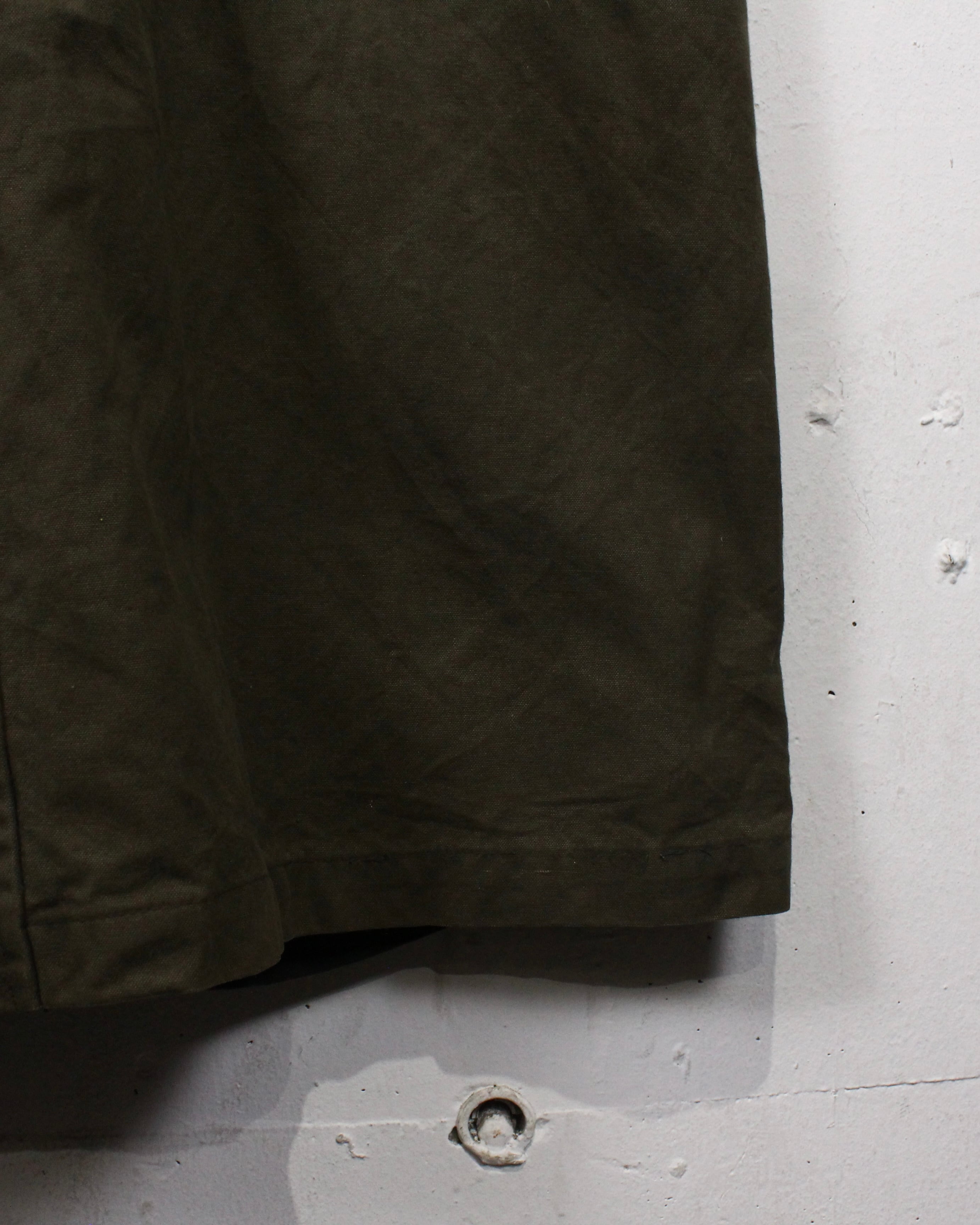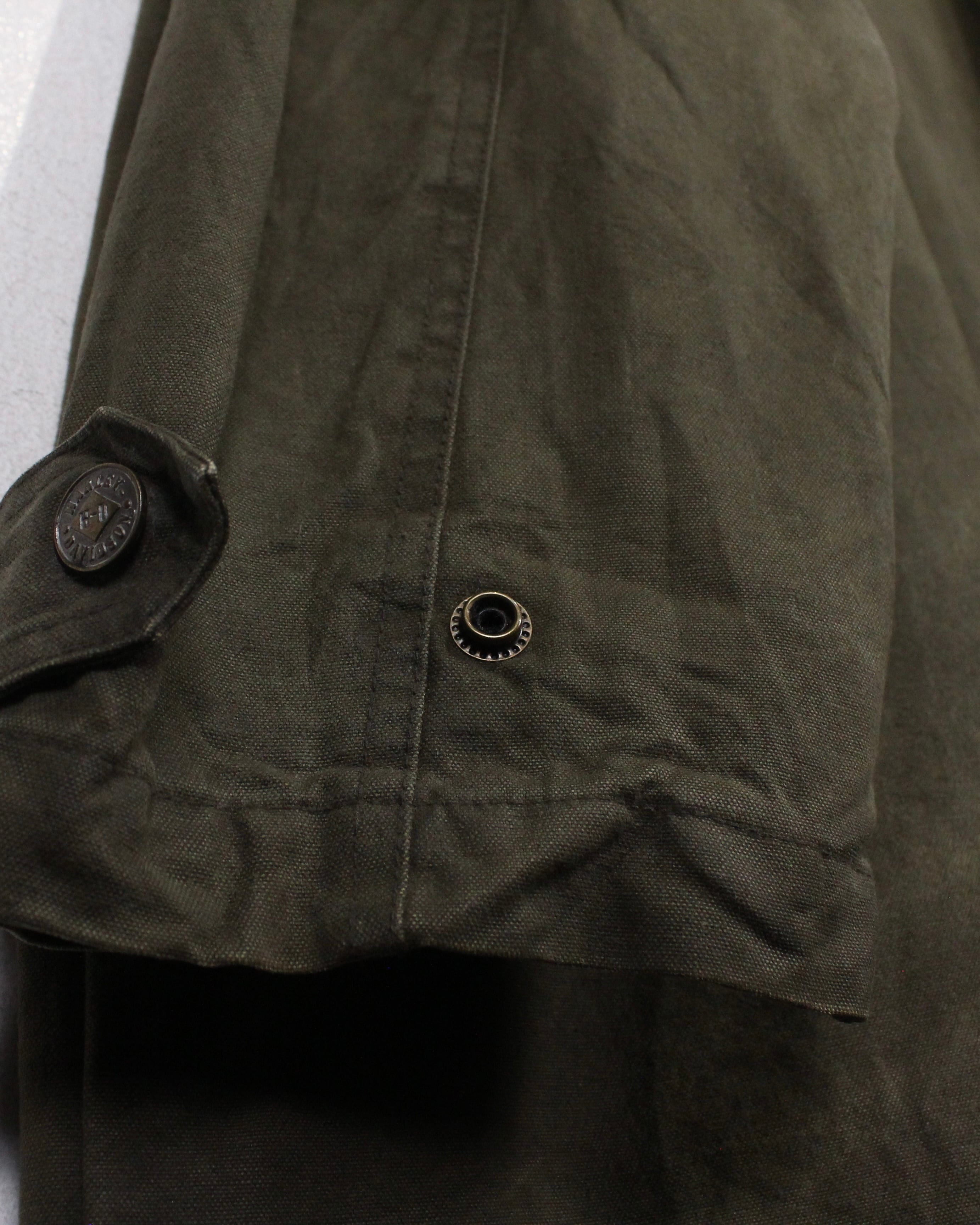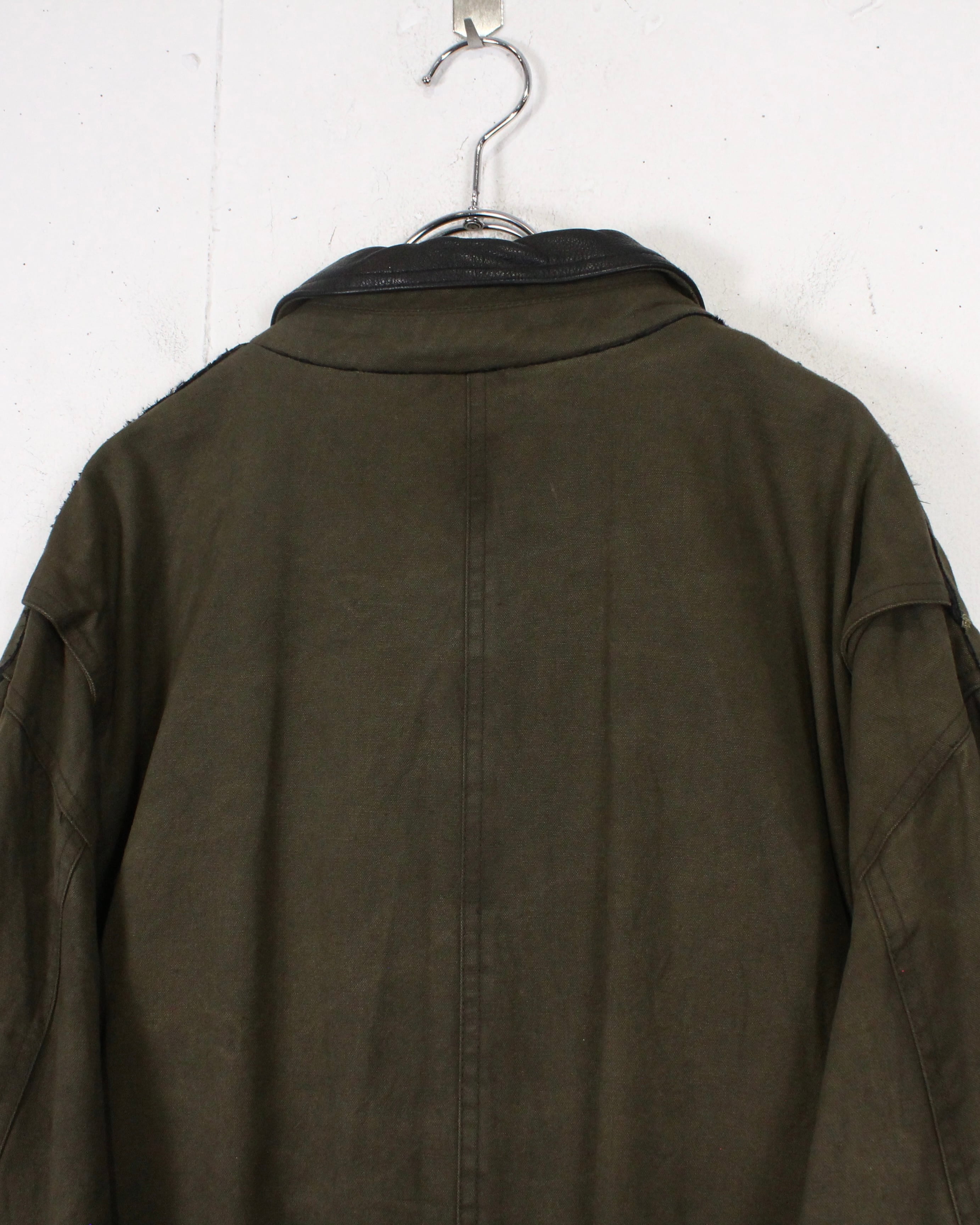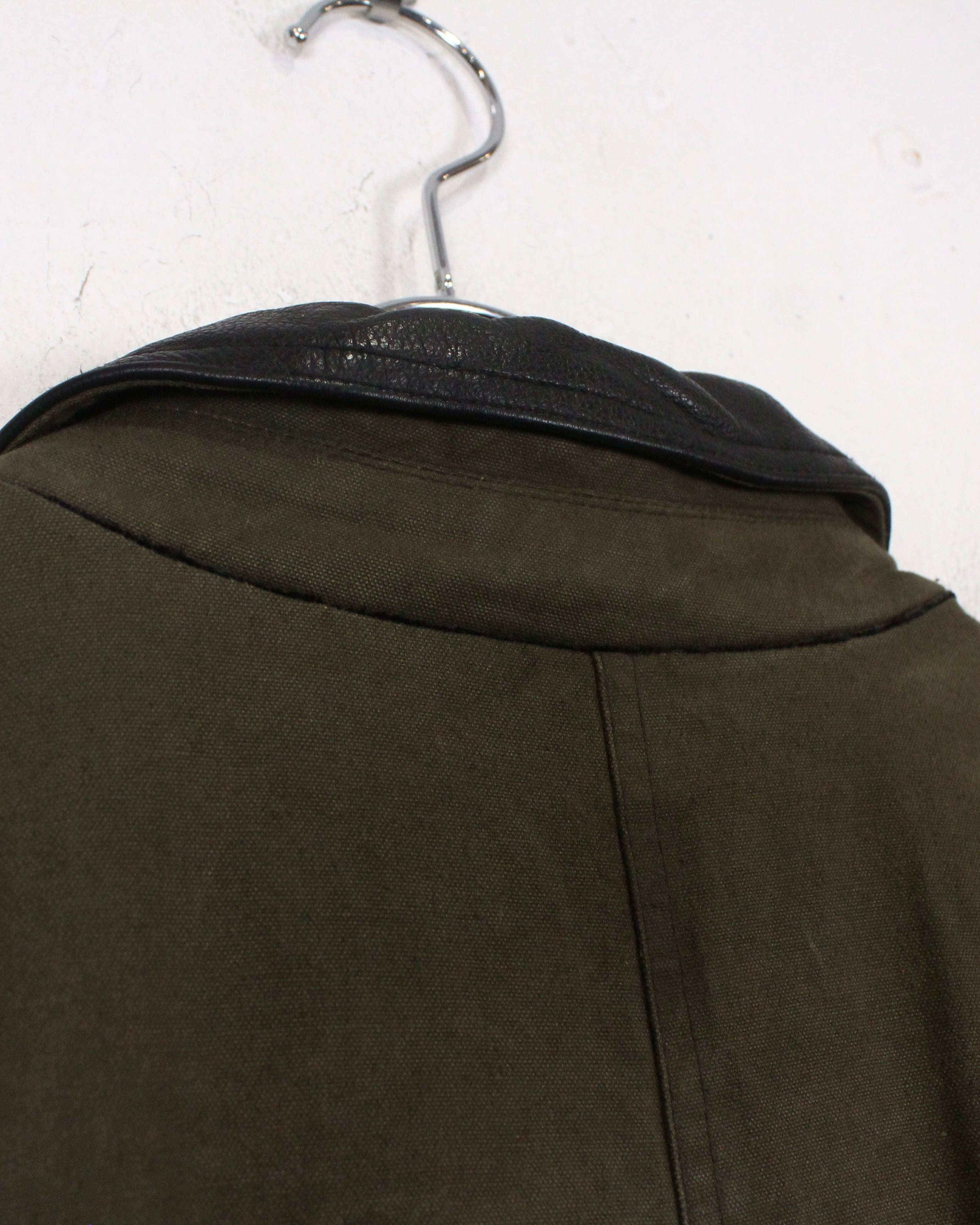襟元はブラックレザーで切り替えられ、キャンバス地とのコントラストが◎。フロントはジップとスナップボタンの比翼仕立てで、防風性とミニマルなルックスを両立。フラップ付きポケットなど、実用性を重視したディテールも魅力です。