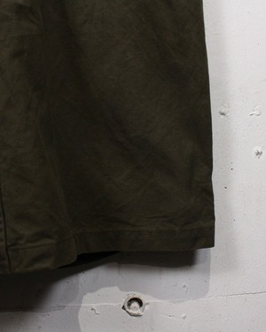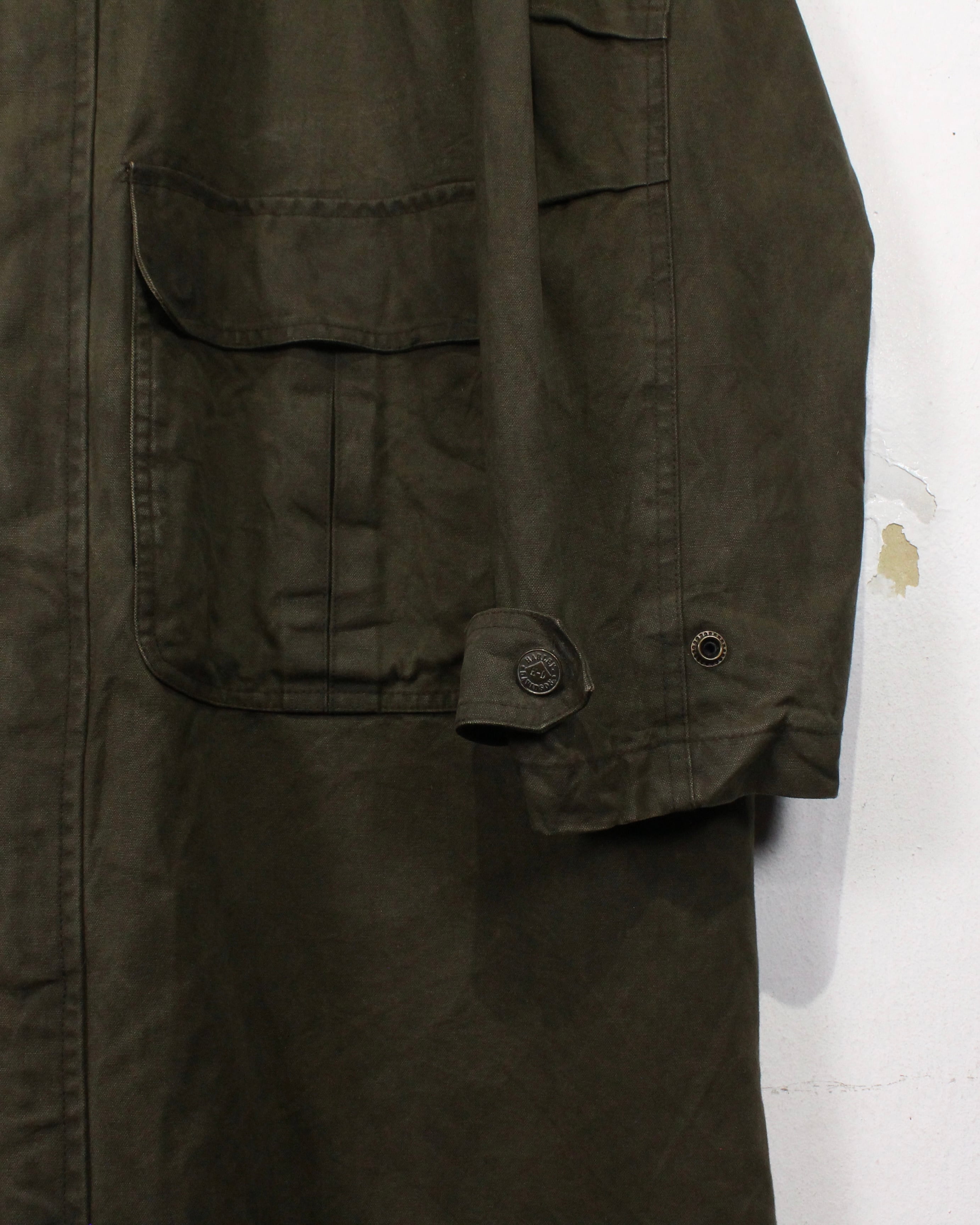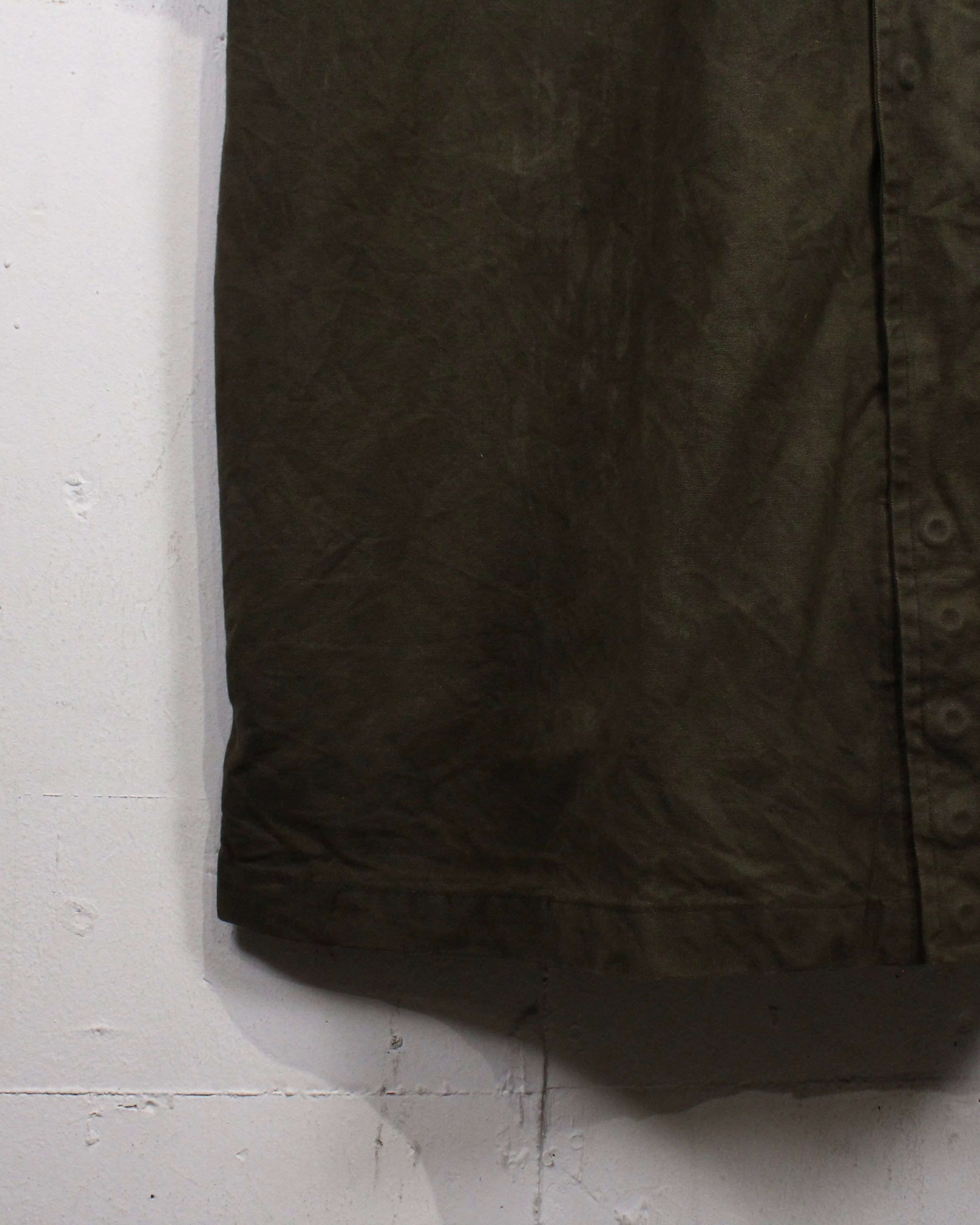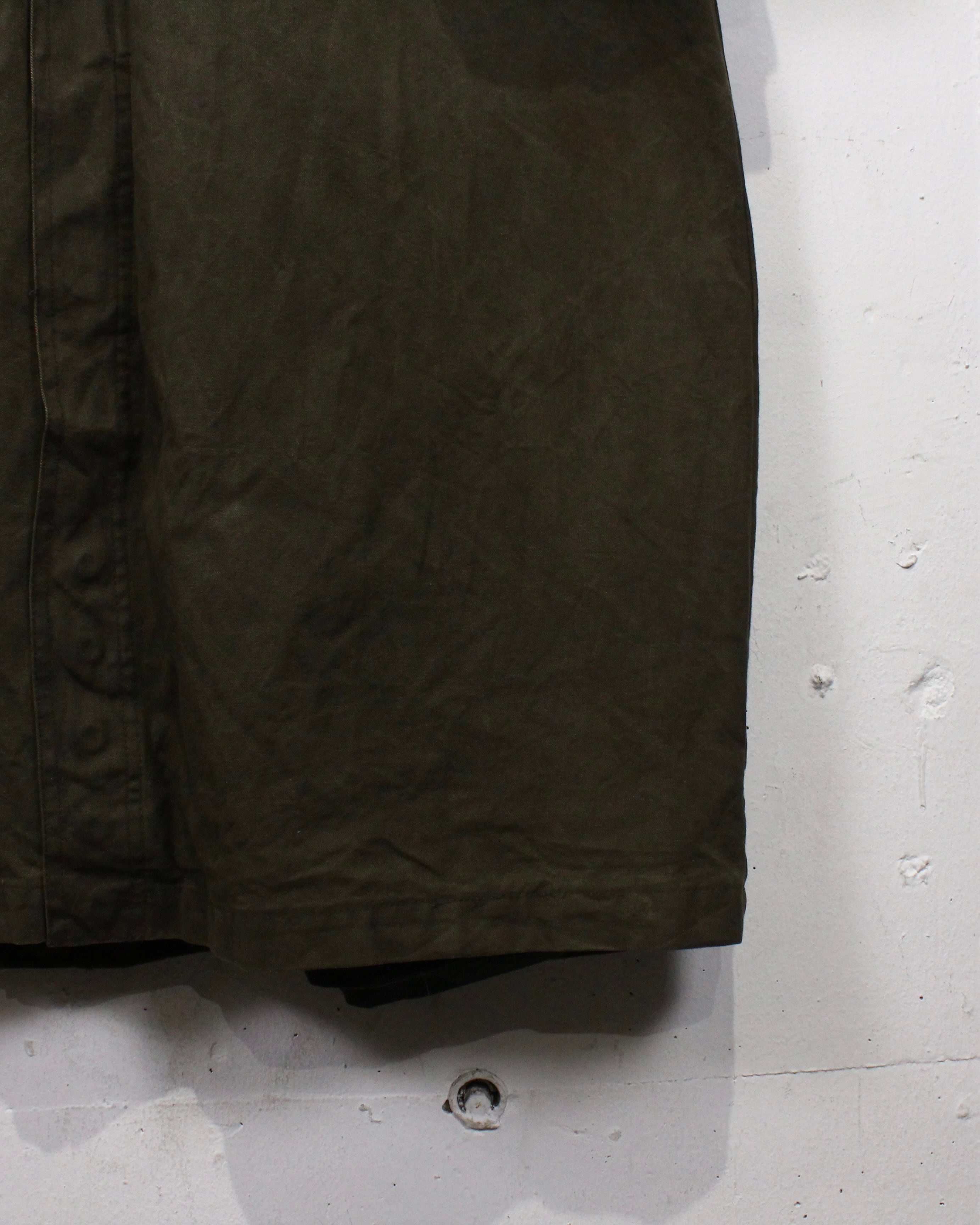 オリーブトーンのコットンキャンバスをベースに、しっかりとしたハリ感と経年によるシワやアタリが刻まれた表情豊かな素材感が雰囲気を漂わせる1着。着込まれることで生まれたムラ感が、“Harley Davidson”ならではのタフな空気感を際立たせています。
