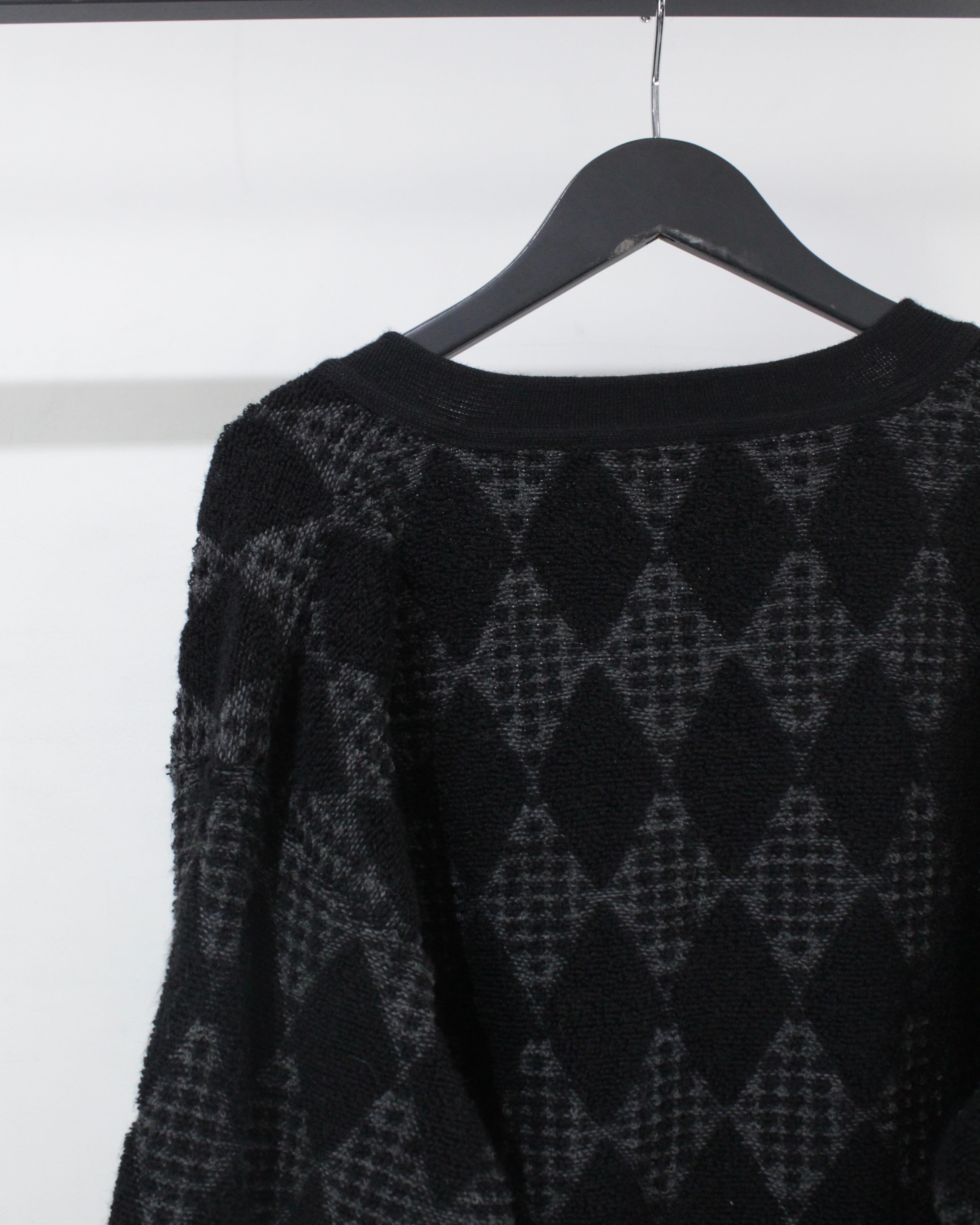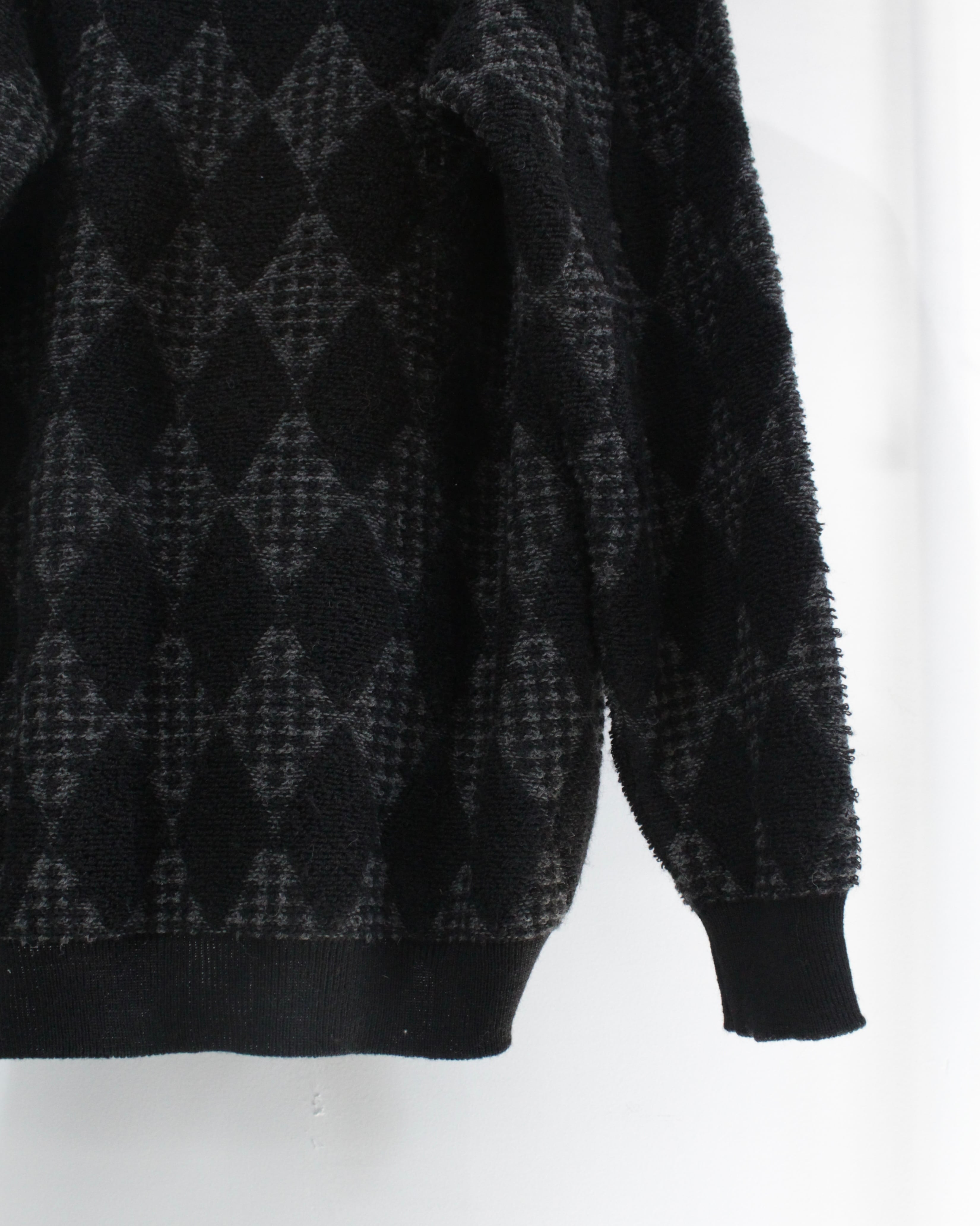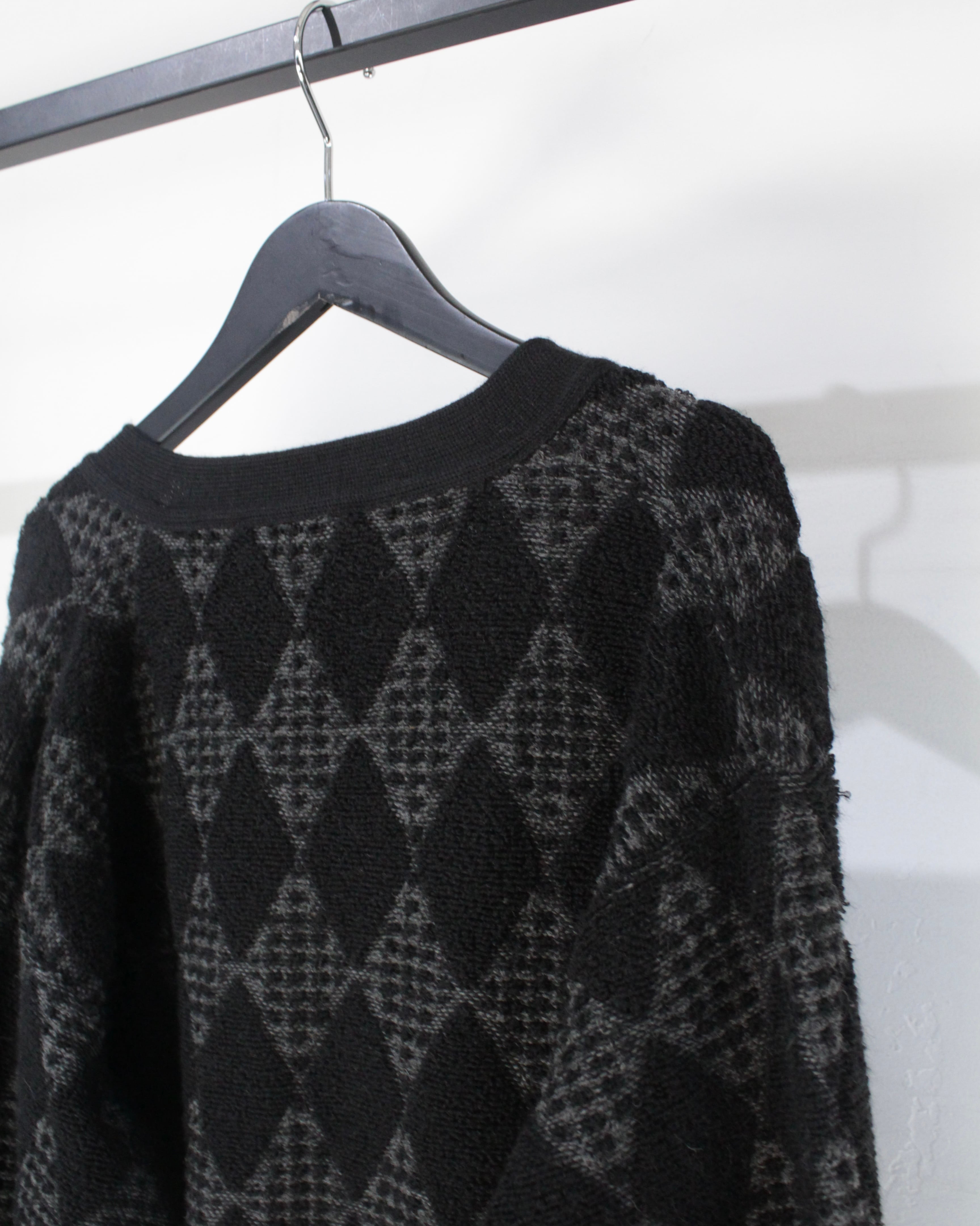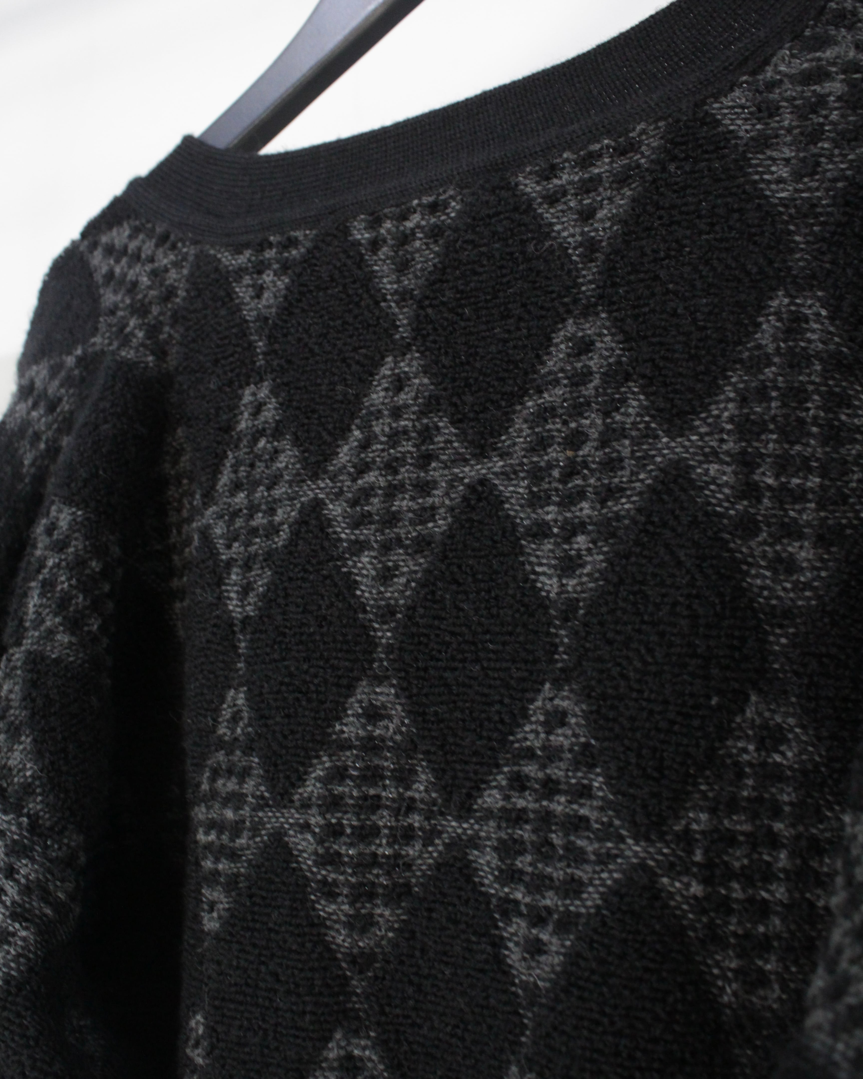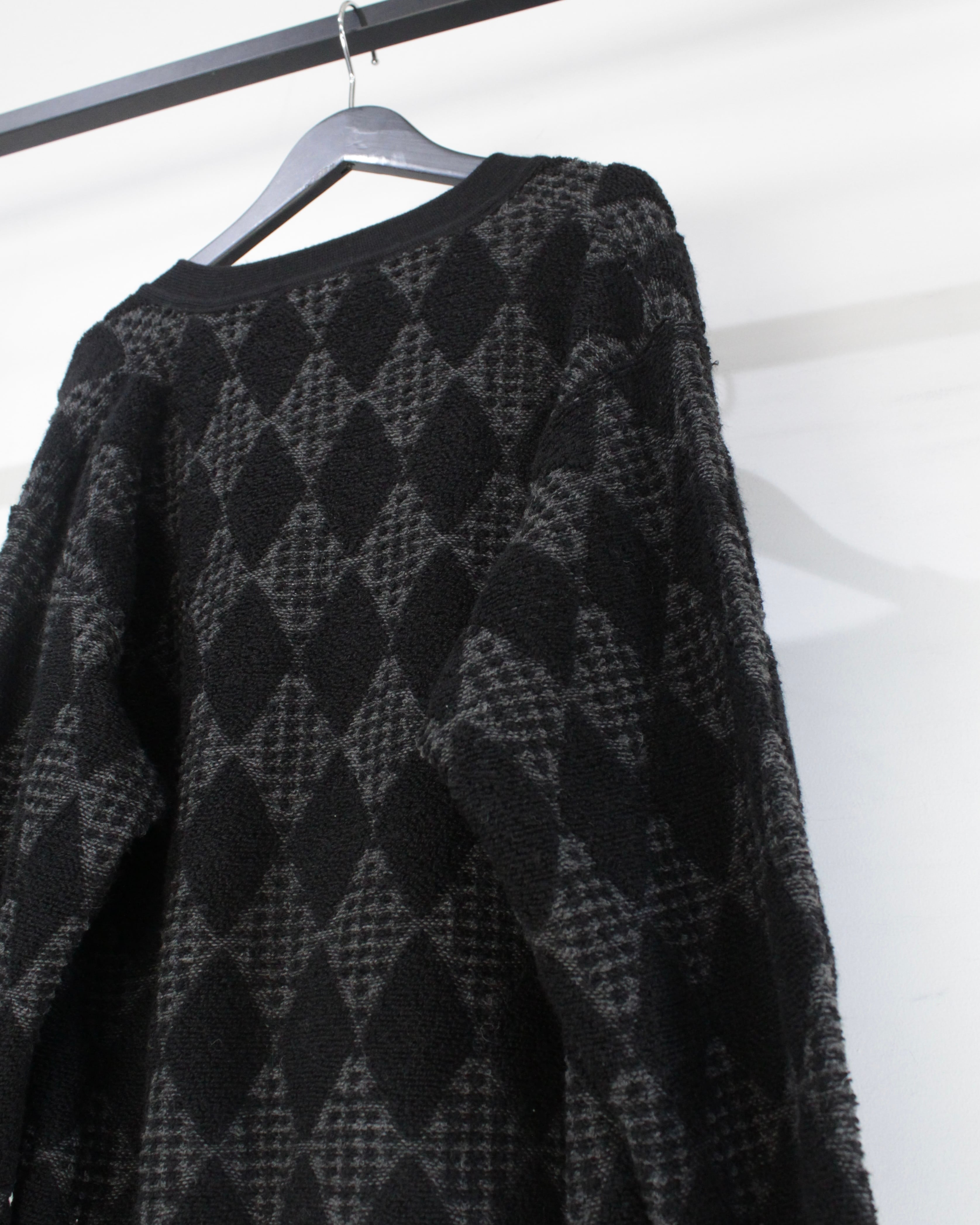 ボディには立体感のあるパイルニットを採用し、柔らかく起毛したタッチで、グレーをベースにブラックのアーガイル柄を配置。パイルの起毛感と上質な編み立てがデザインを引き立てています。
