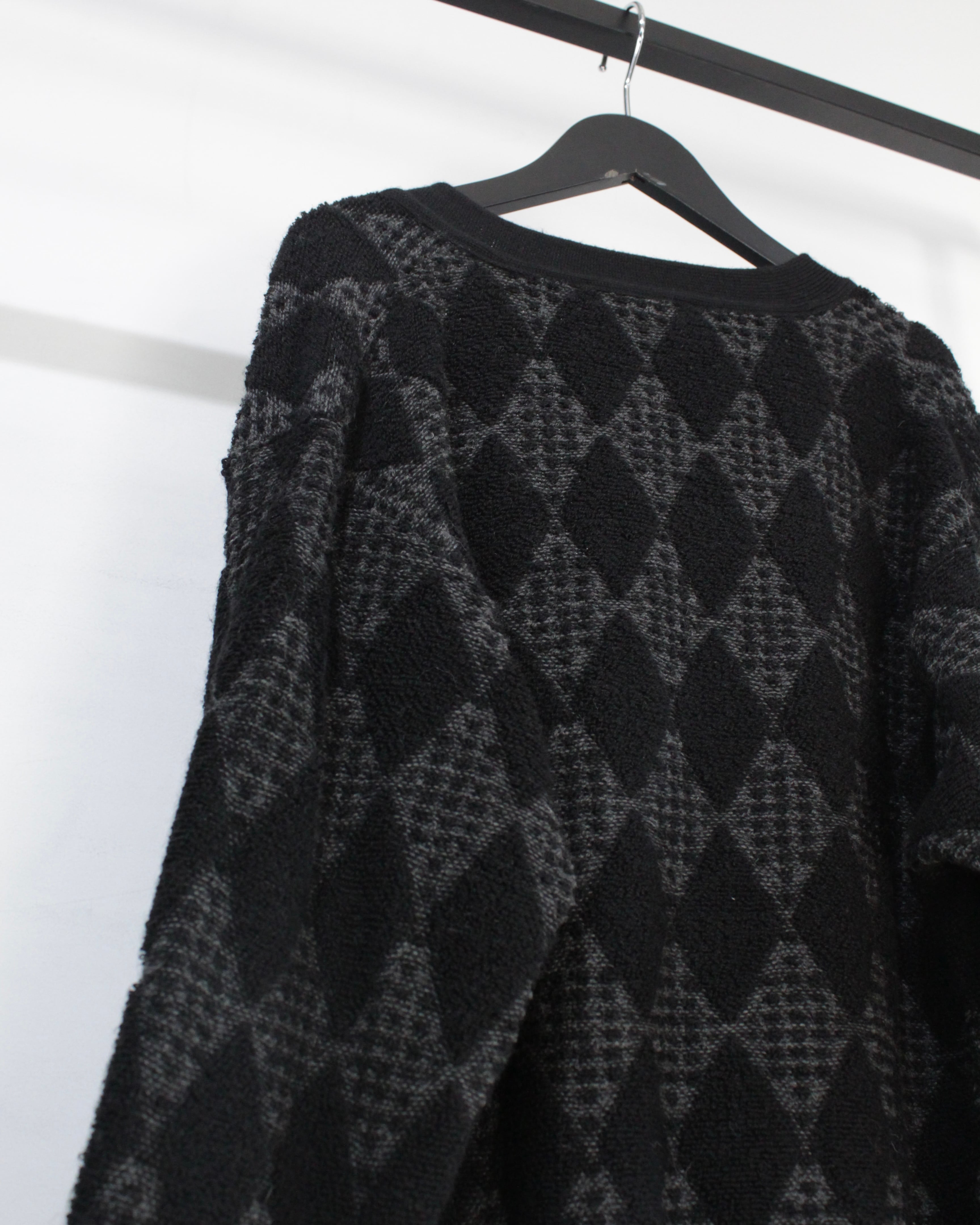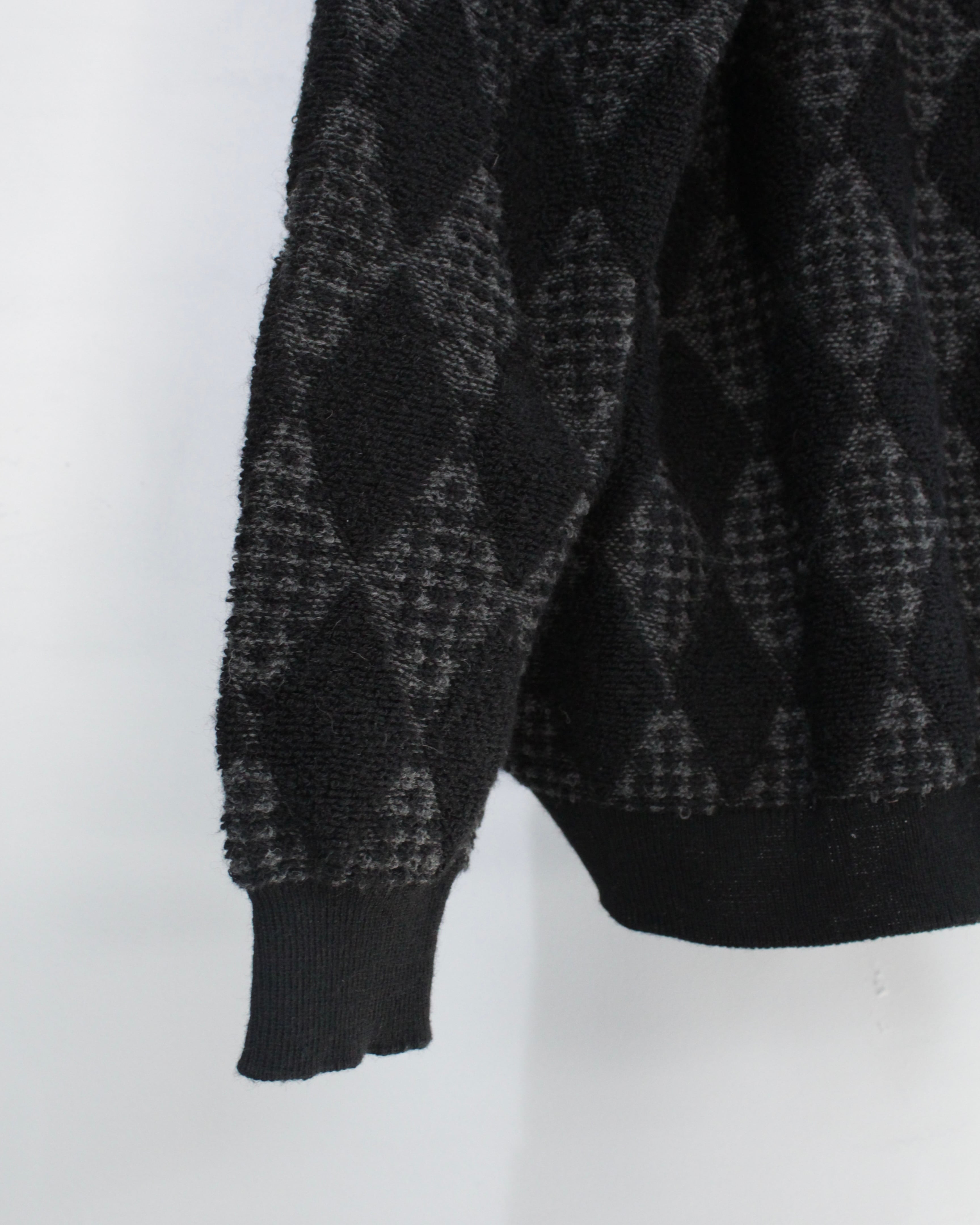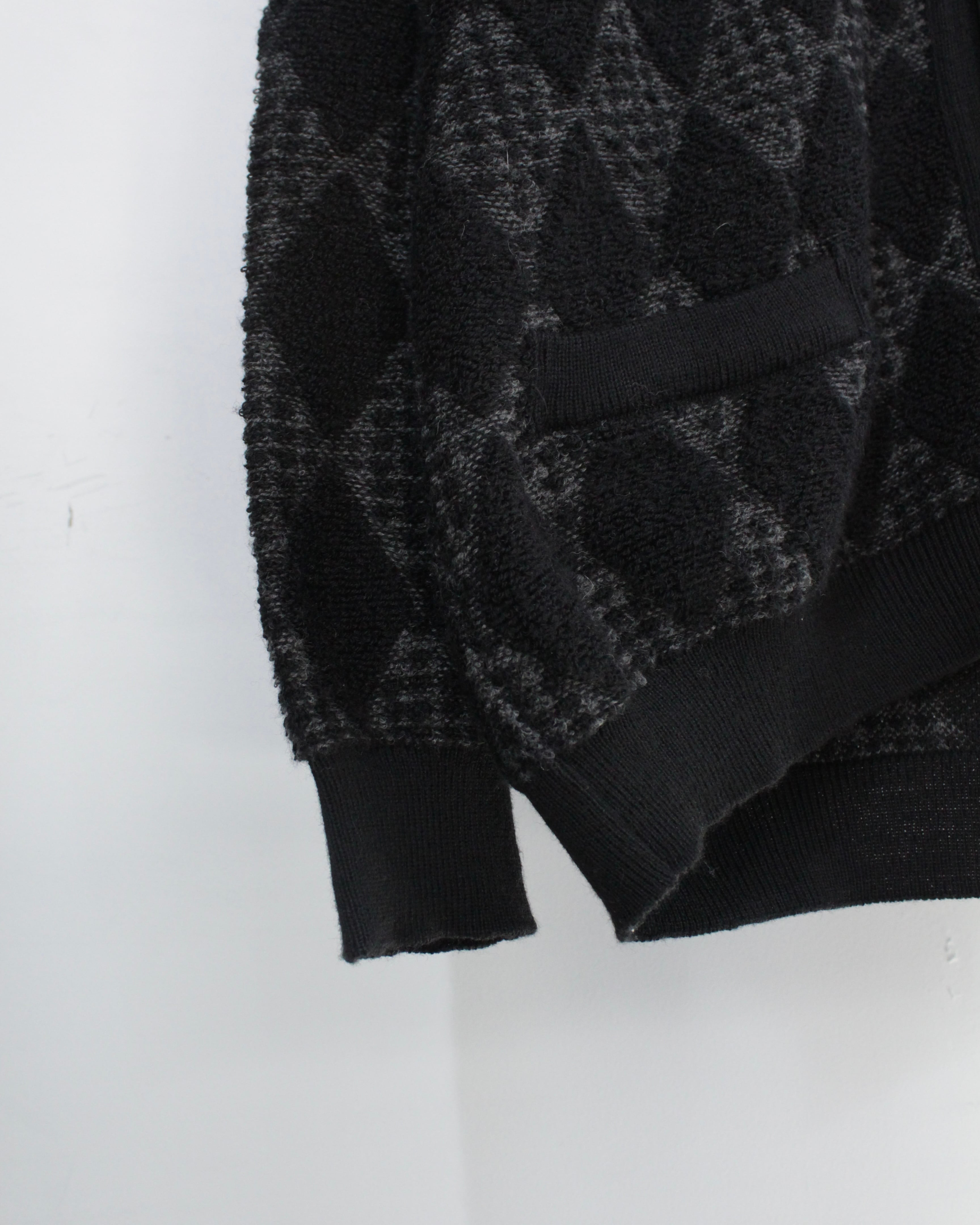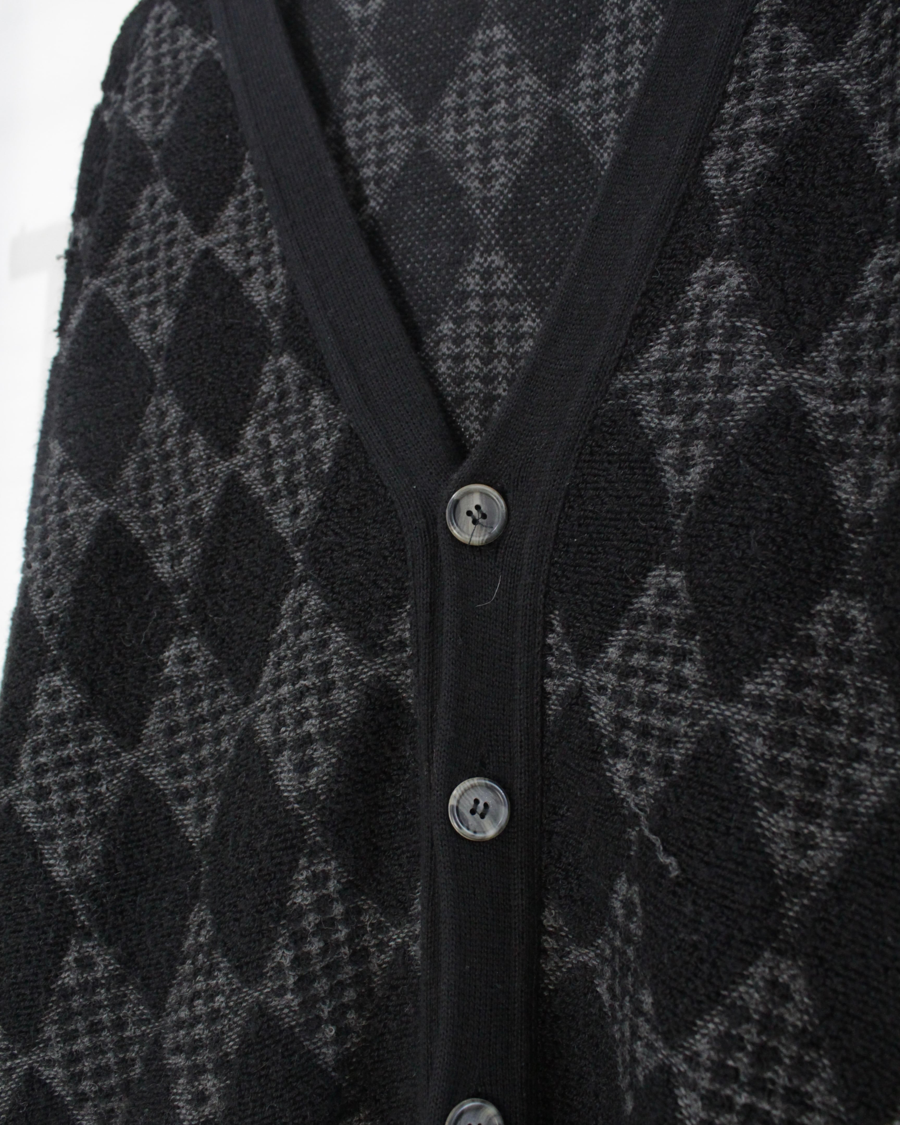 ボディには立体感のあるパイルニットを採用し、柔らかく起毛したタッチで、グレーをベースにブラックのアーガイル柄を配置。パイルの起毛感と上質な編み立てがデザインを引き立てています。