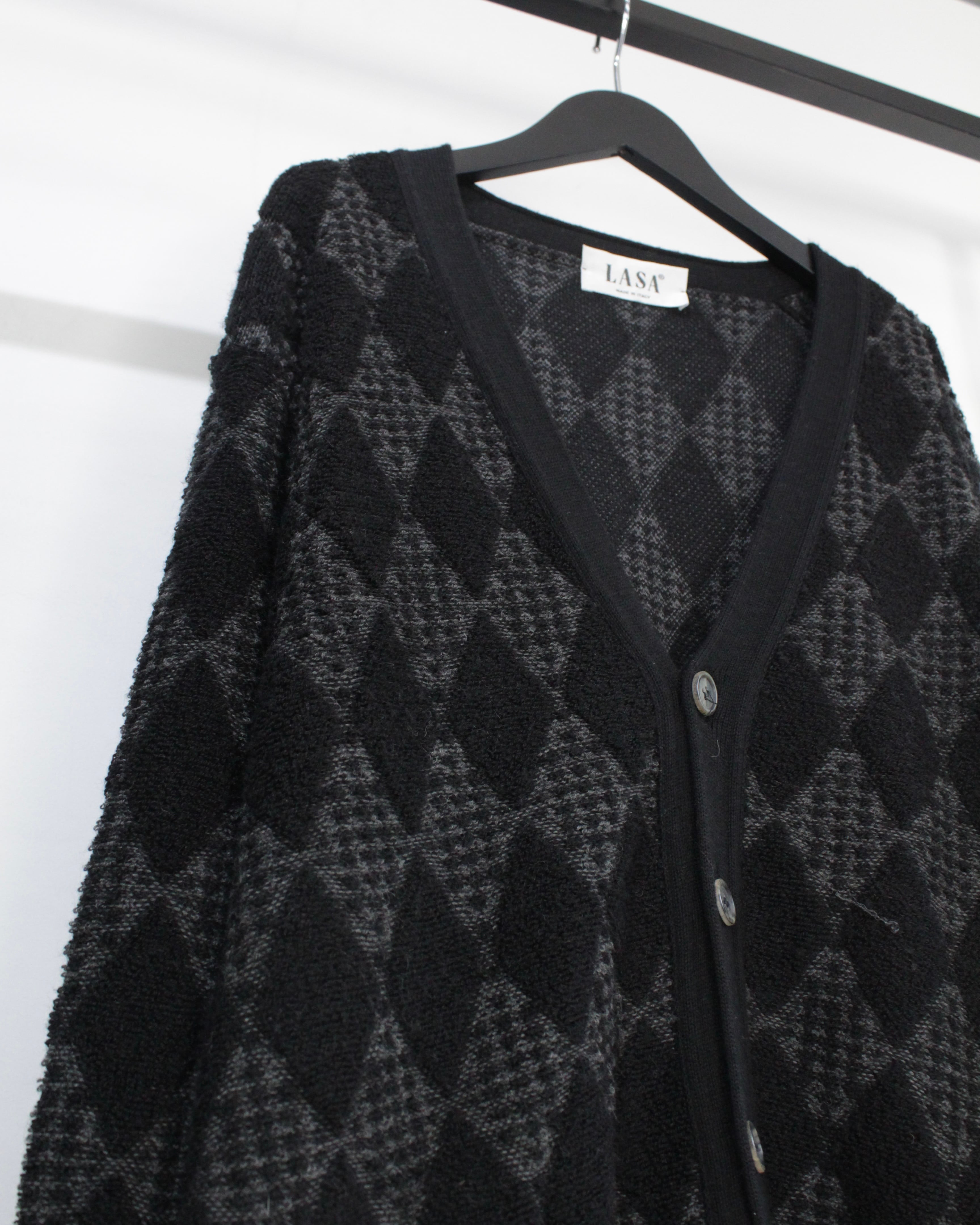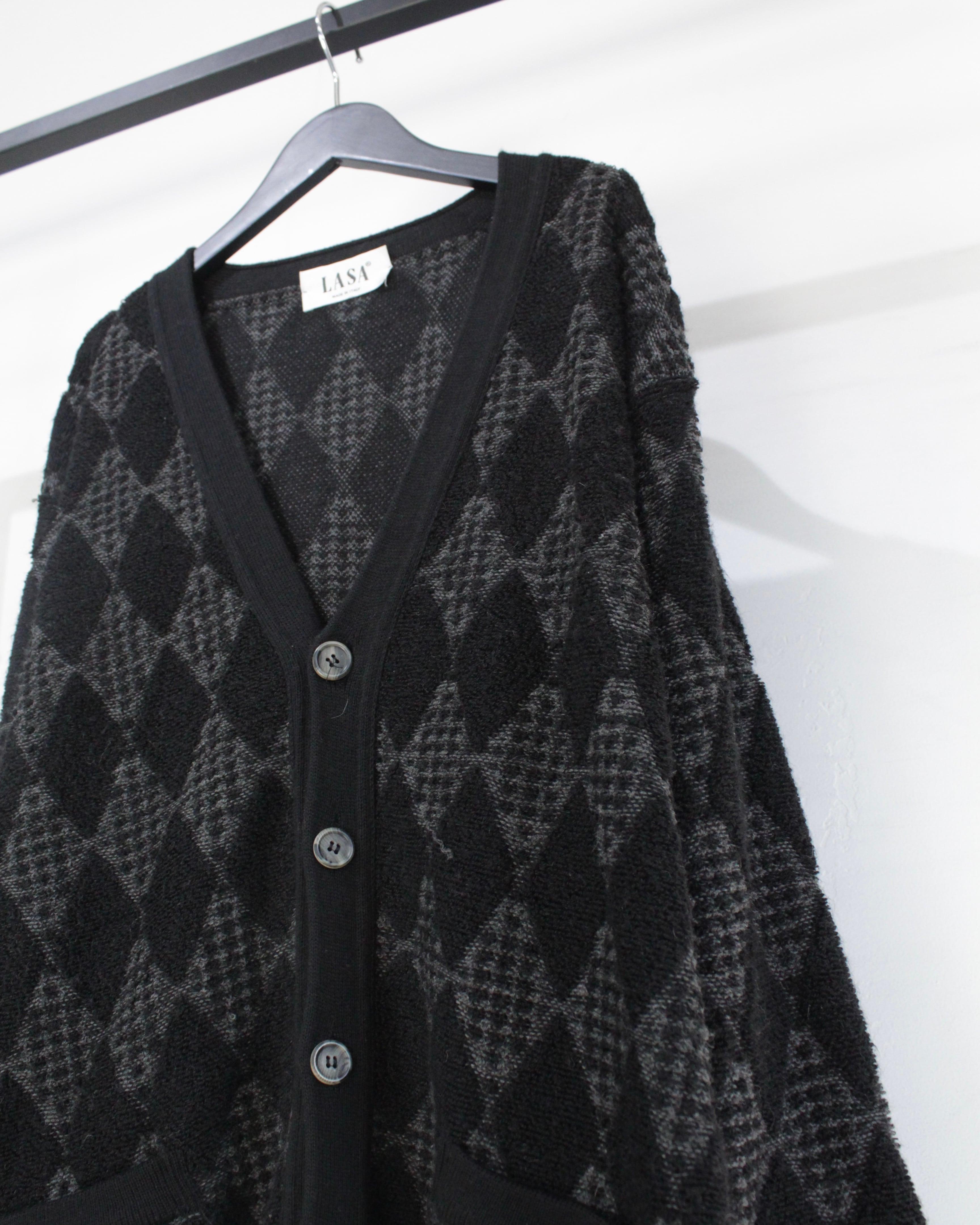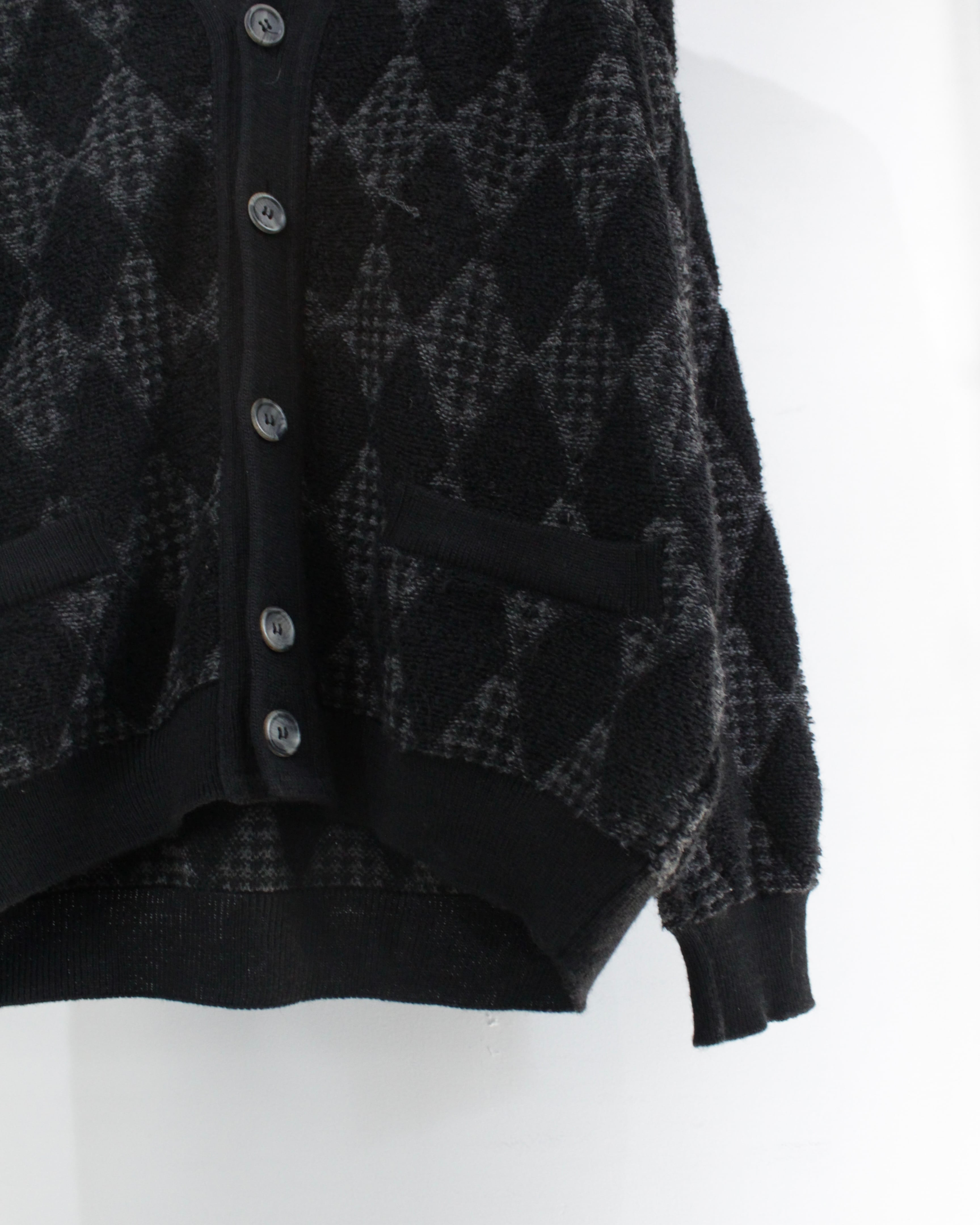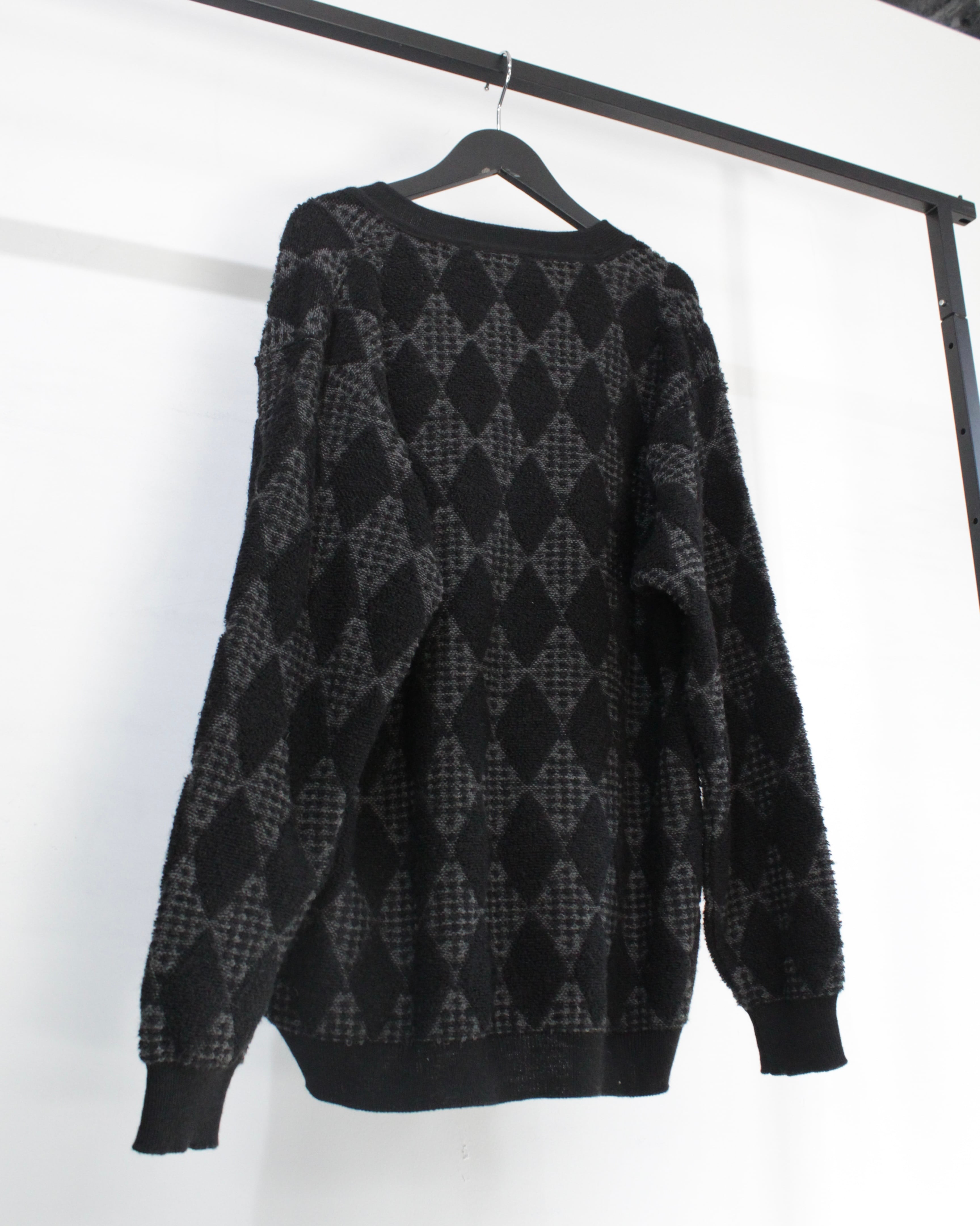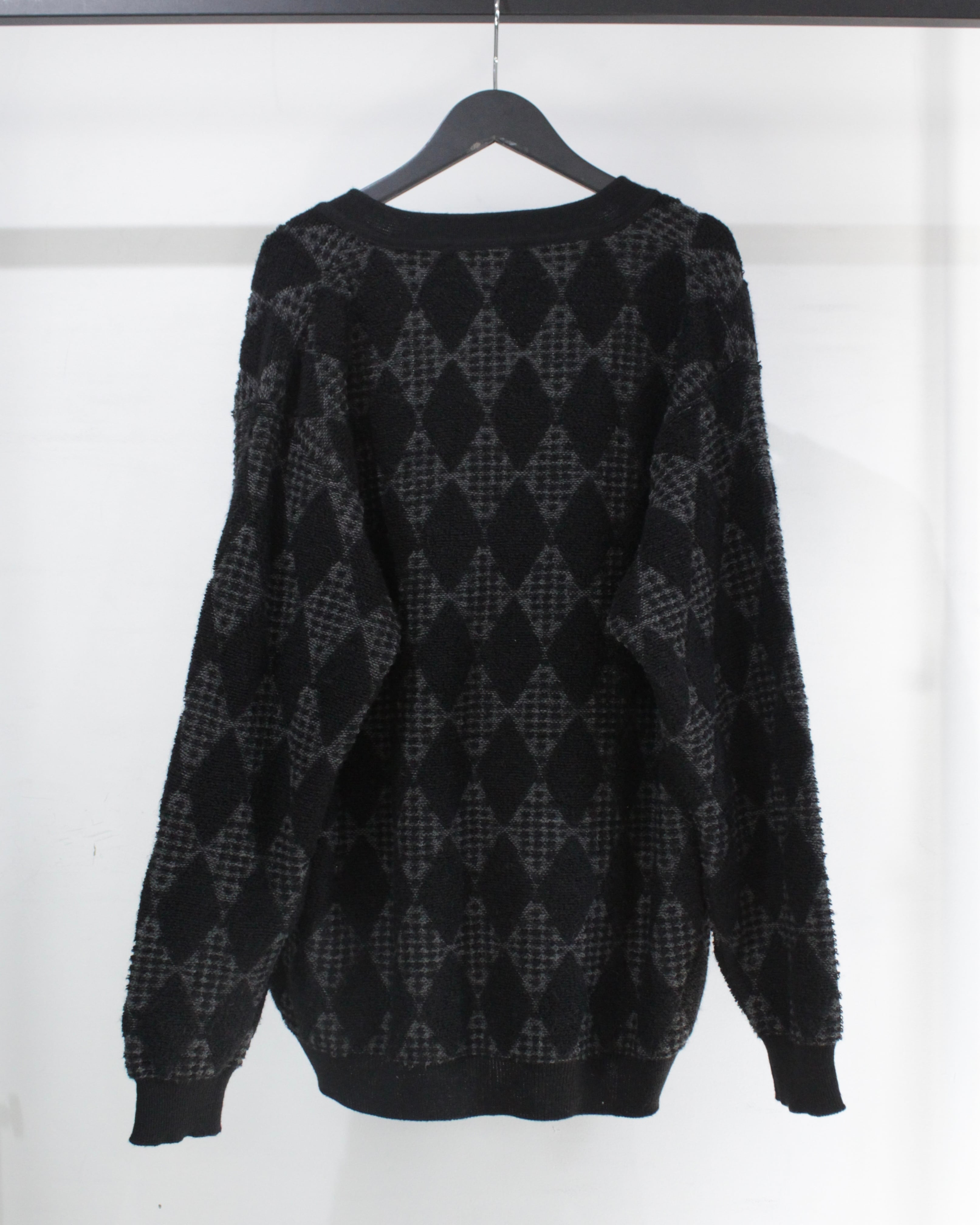 ボディには立体感のあるパイルニットを採用し、柔らかく起毛したタッチで、グレーをベースにブラックのアーガイル柄を配置。パイルの起毛感と上質な編み立てがデザインを引き立てています。