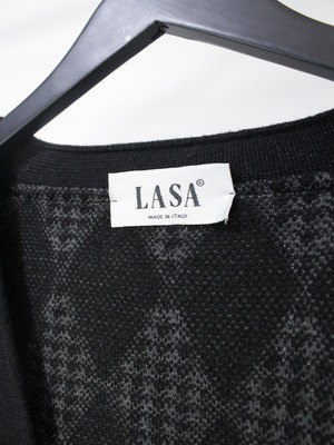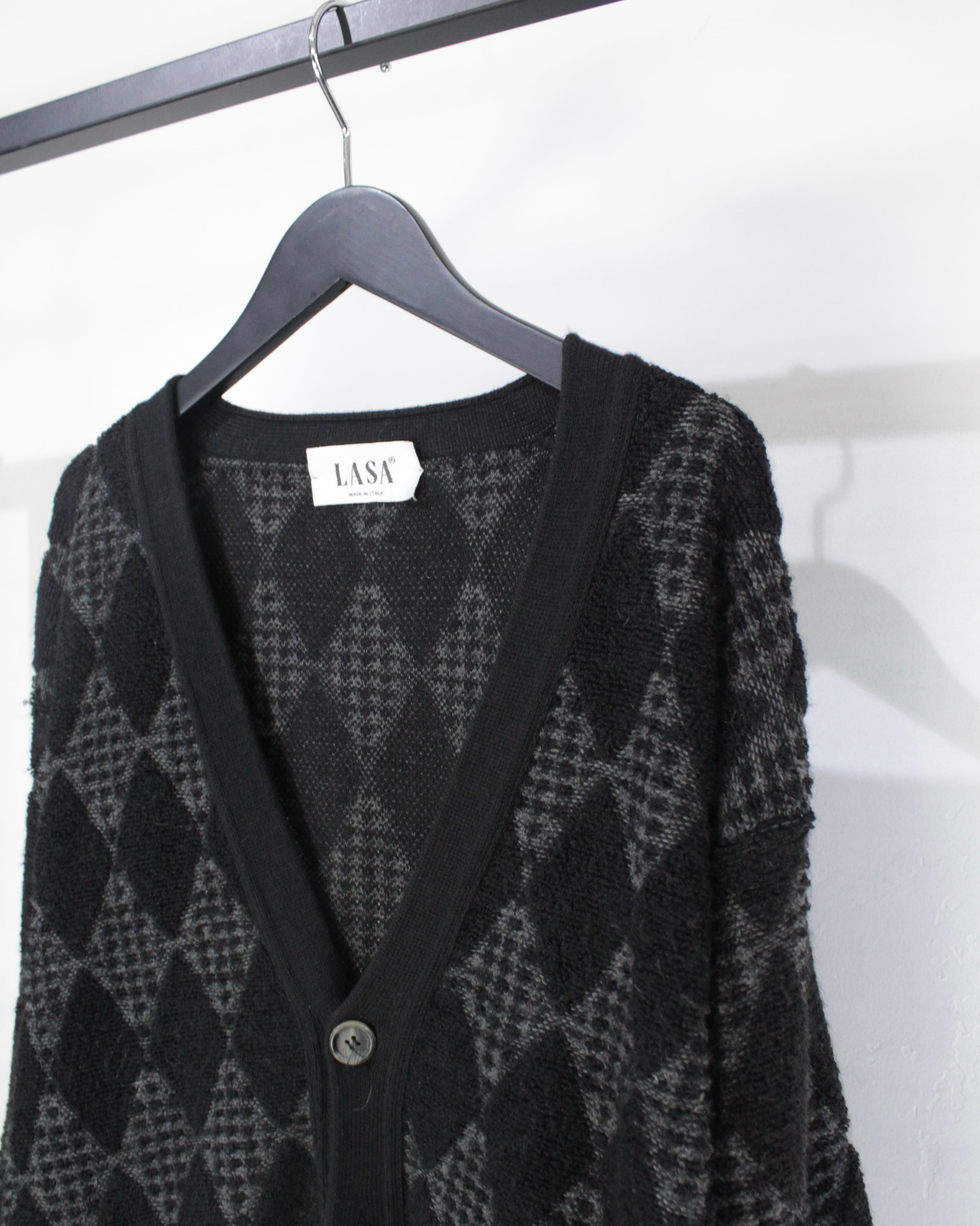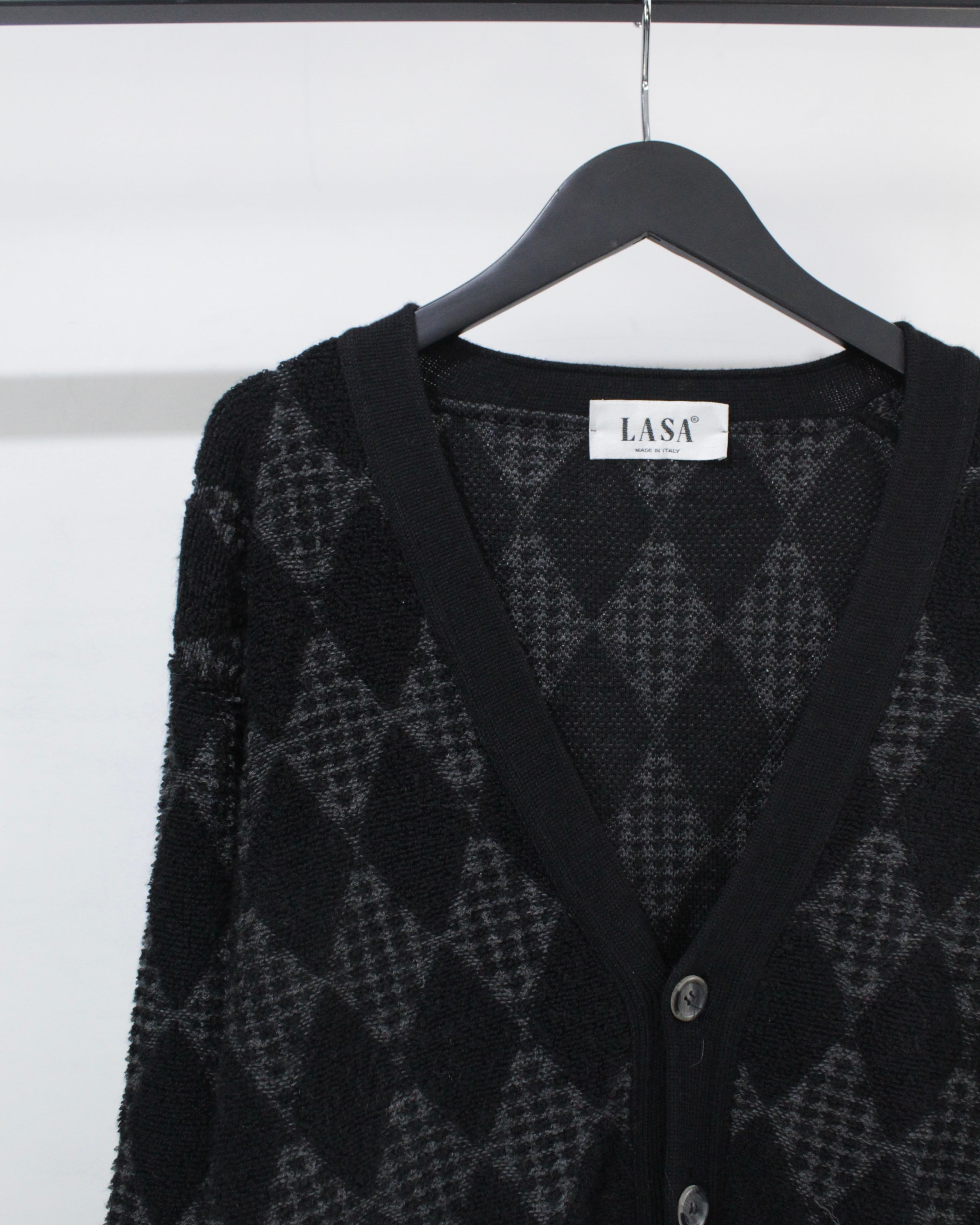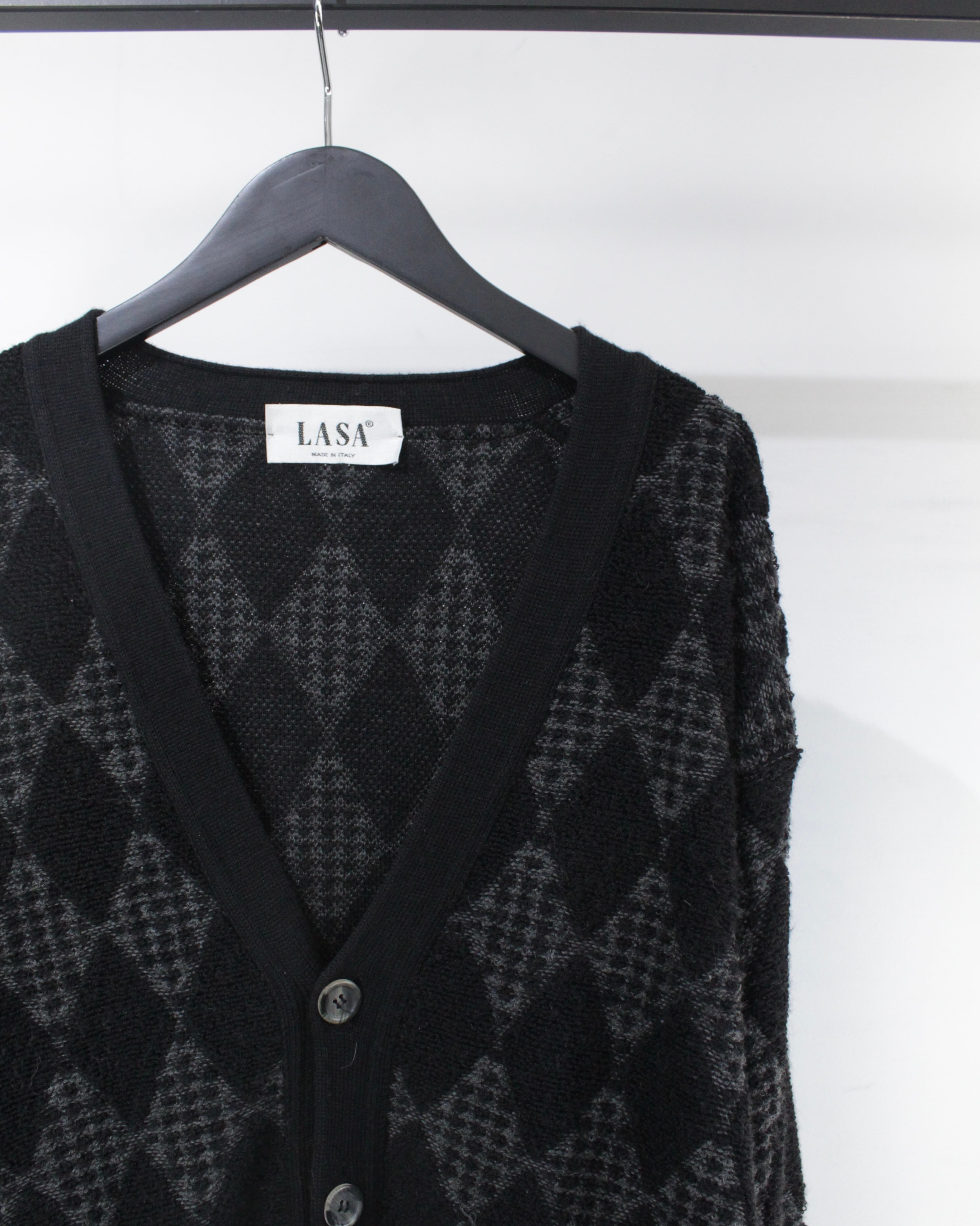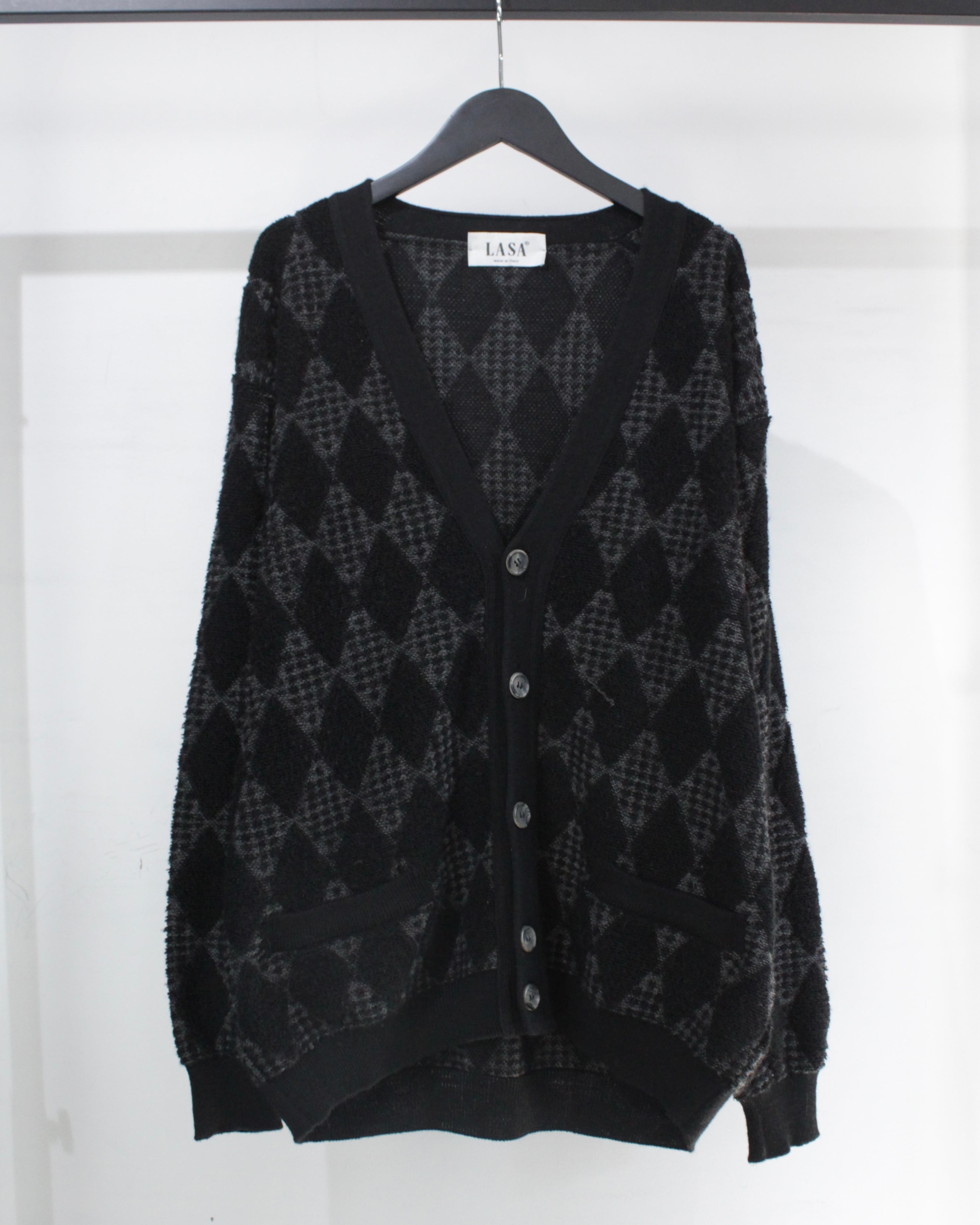 ボディには立体感のあるパイルニットを採用し、柔らかく起毛したタッチで、グレーをベースにブラックのアーガイル柄を配置。パイルの起毛感と上質な編み立てがデザインを引き立てています。