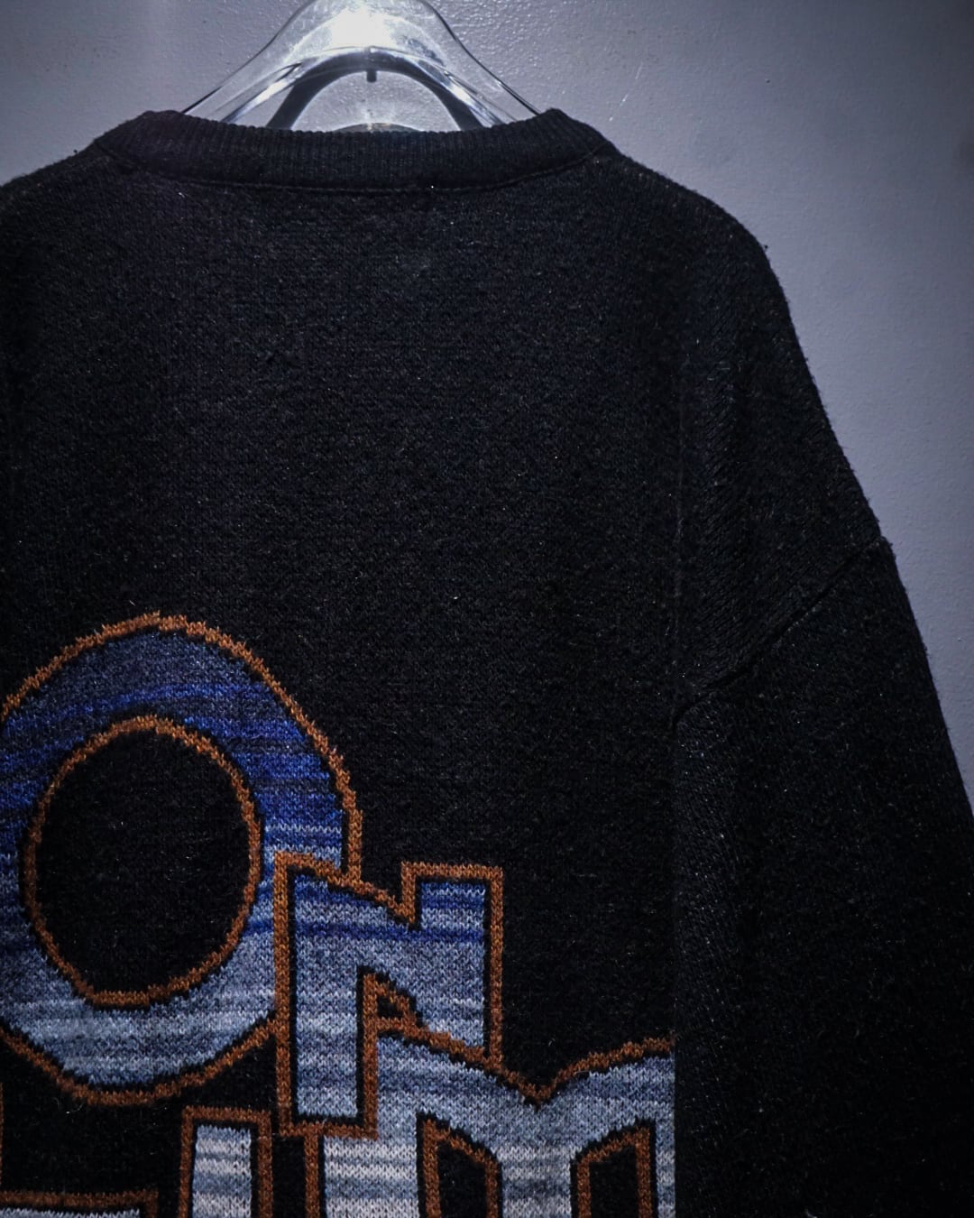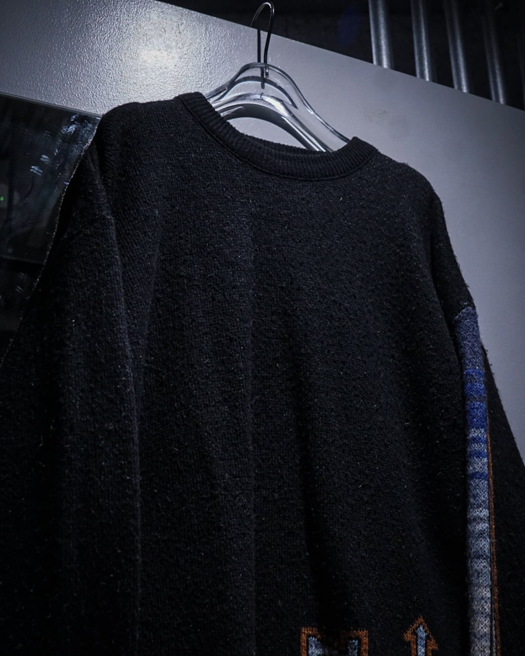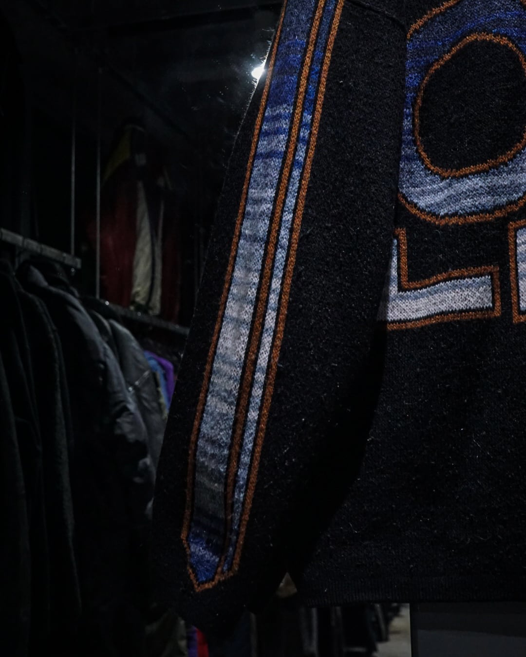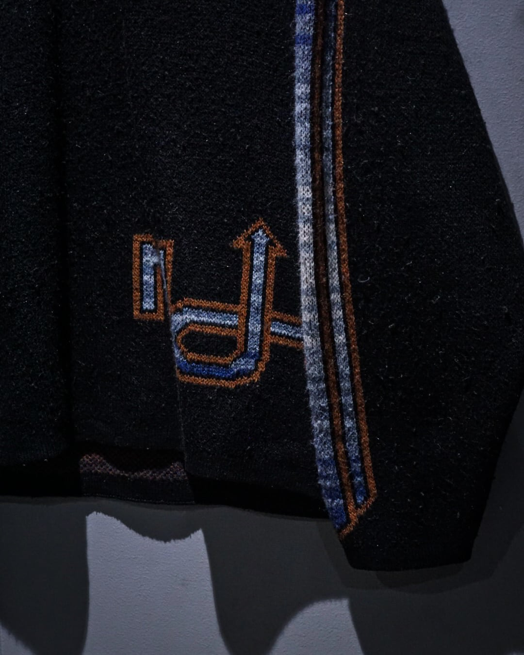 ブラックをベースに、フロントから袖、バックにかけて大胆に配置されたグラフィカルなニットパターンが目を惹く存在感抜群の仕上がり。直線的で矢印のようなモチーフや、立体感のあるロゴ表現が、80〜90年代のスキーウェアを想起させるレトロフューチャーなムードを演出しています。