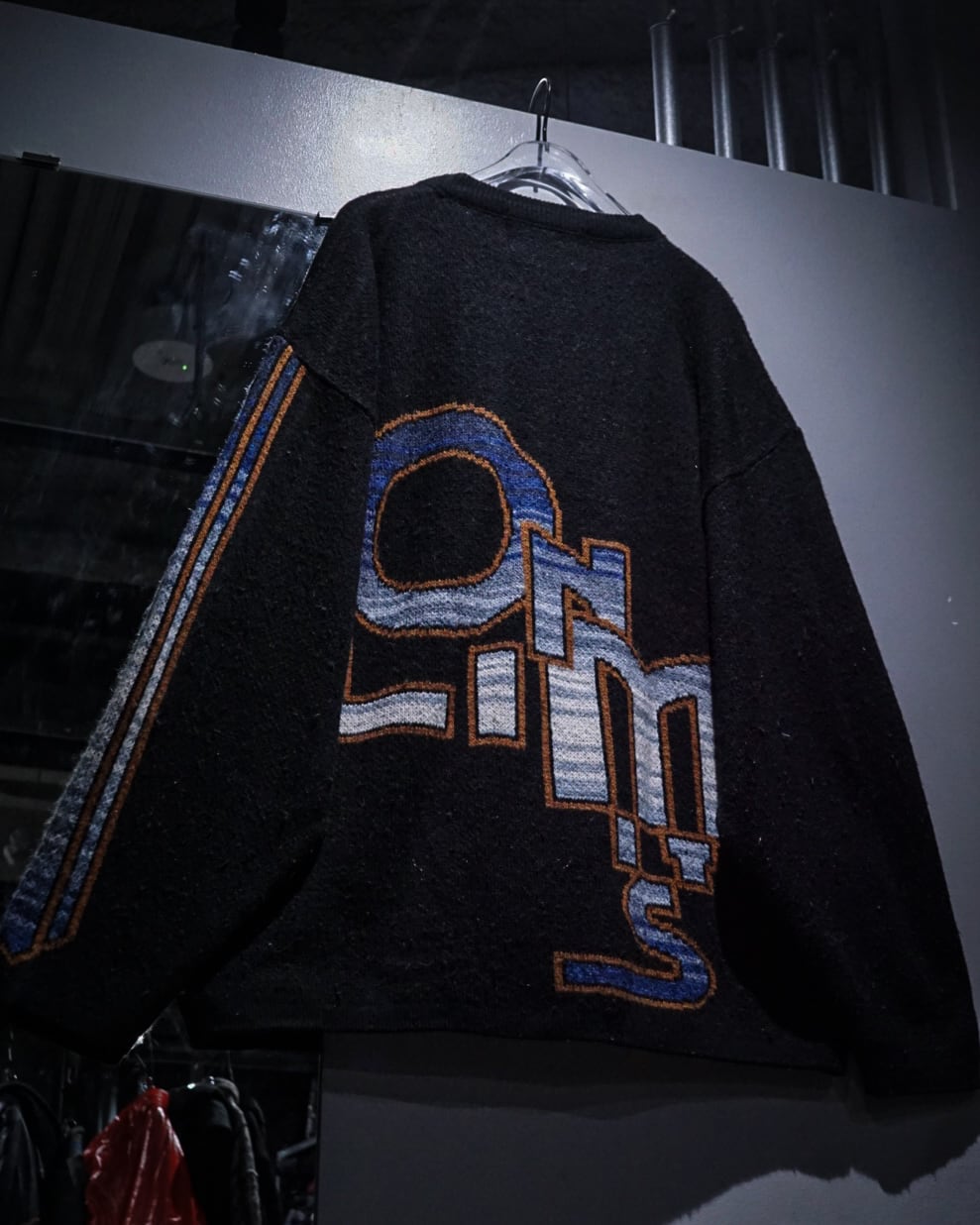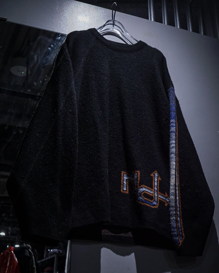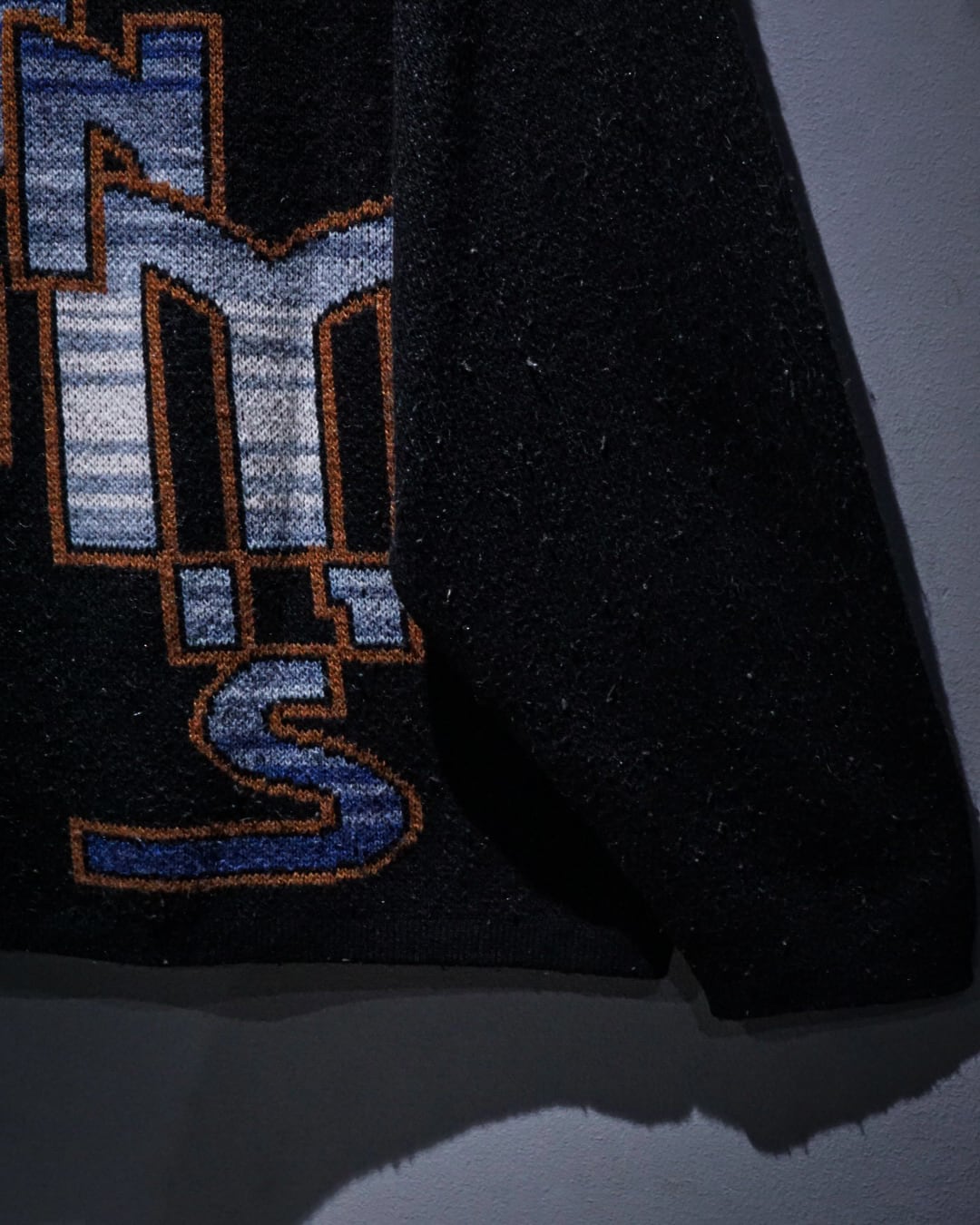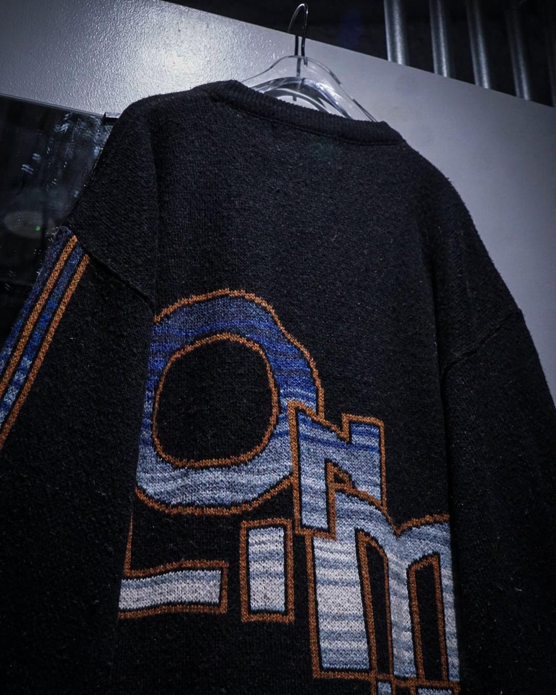 ブラックをベースに、フロントから袖、バックにかけて大胆に配置されたグラフィカルなニットパターンが目を惹く存在感抜群の仕上がり。直線的で矢印のようなモチーフや、立体感のあるロゴ表現が、80〜90年代のスキーウェアを想起させるレトロフューチャーなムードを演出しています。