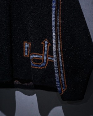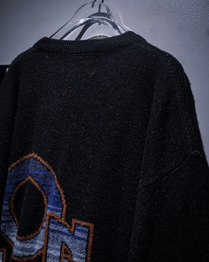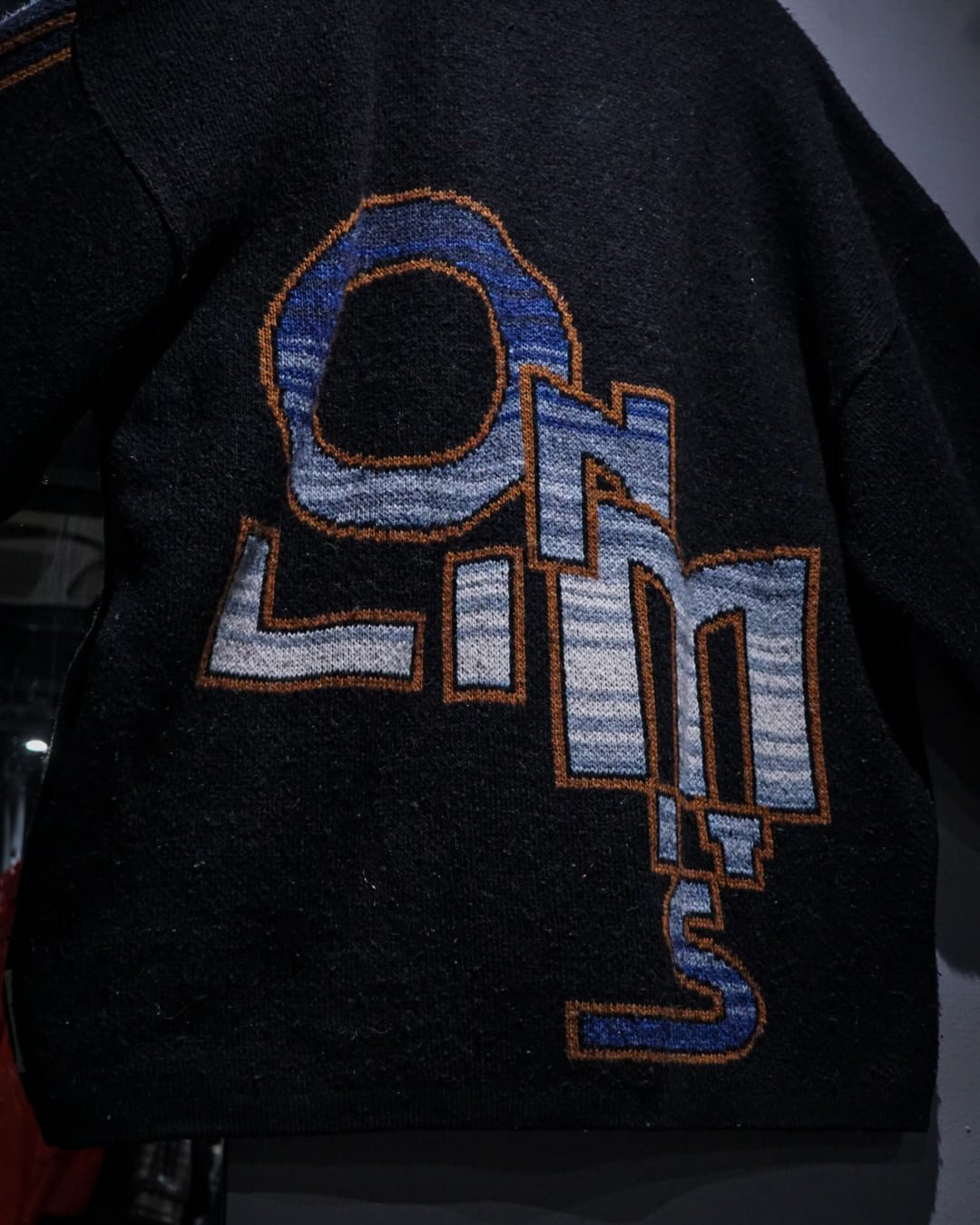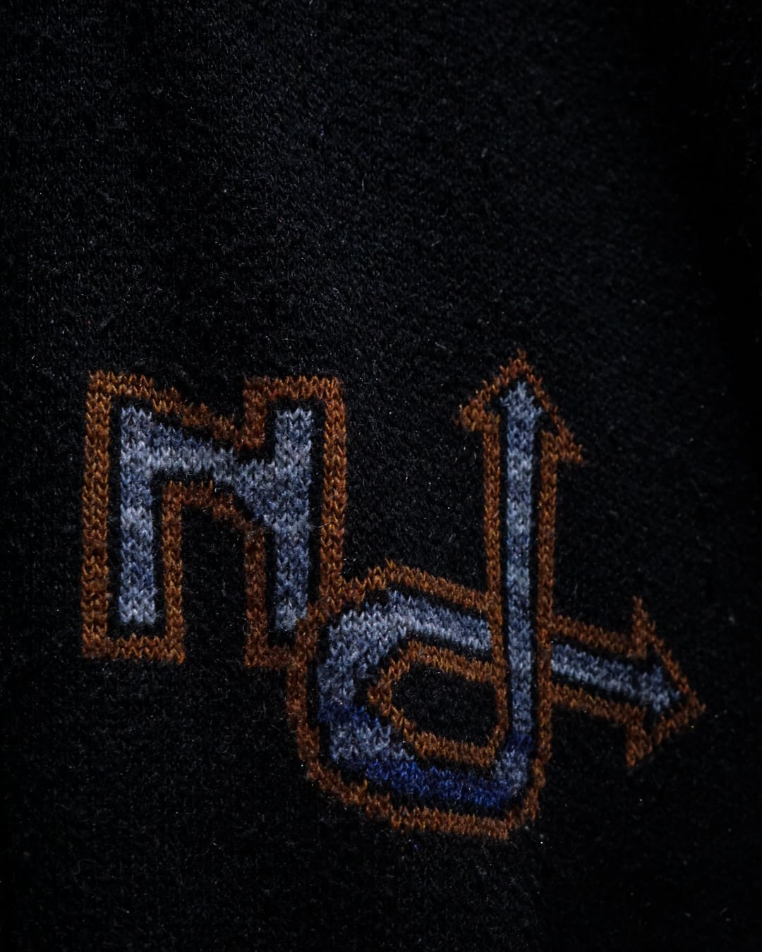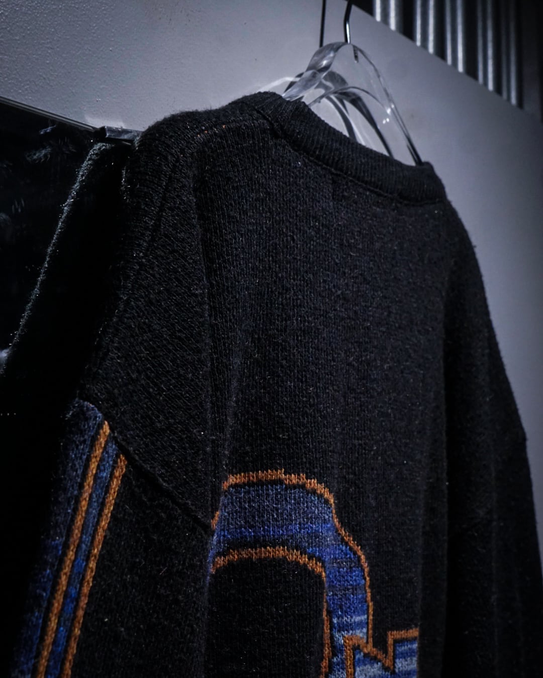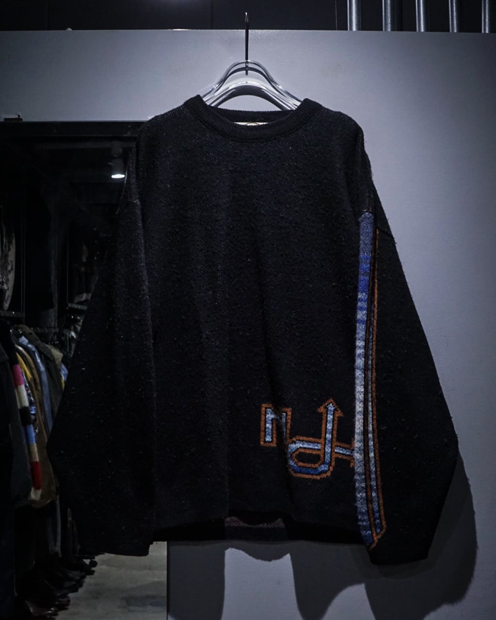 ブラックをベースに、フロントから袖、バックにかけて大胆に配置されたグラフィカルなニットパターンが目を惹く存在感抜群の仕上がり。直線的で矢印のようなモチーフや、立体感のあるロゴ表現が、80〜90年代のスキーウェアを想起させるレトロフューチャーなムードを演出しています。