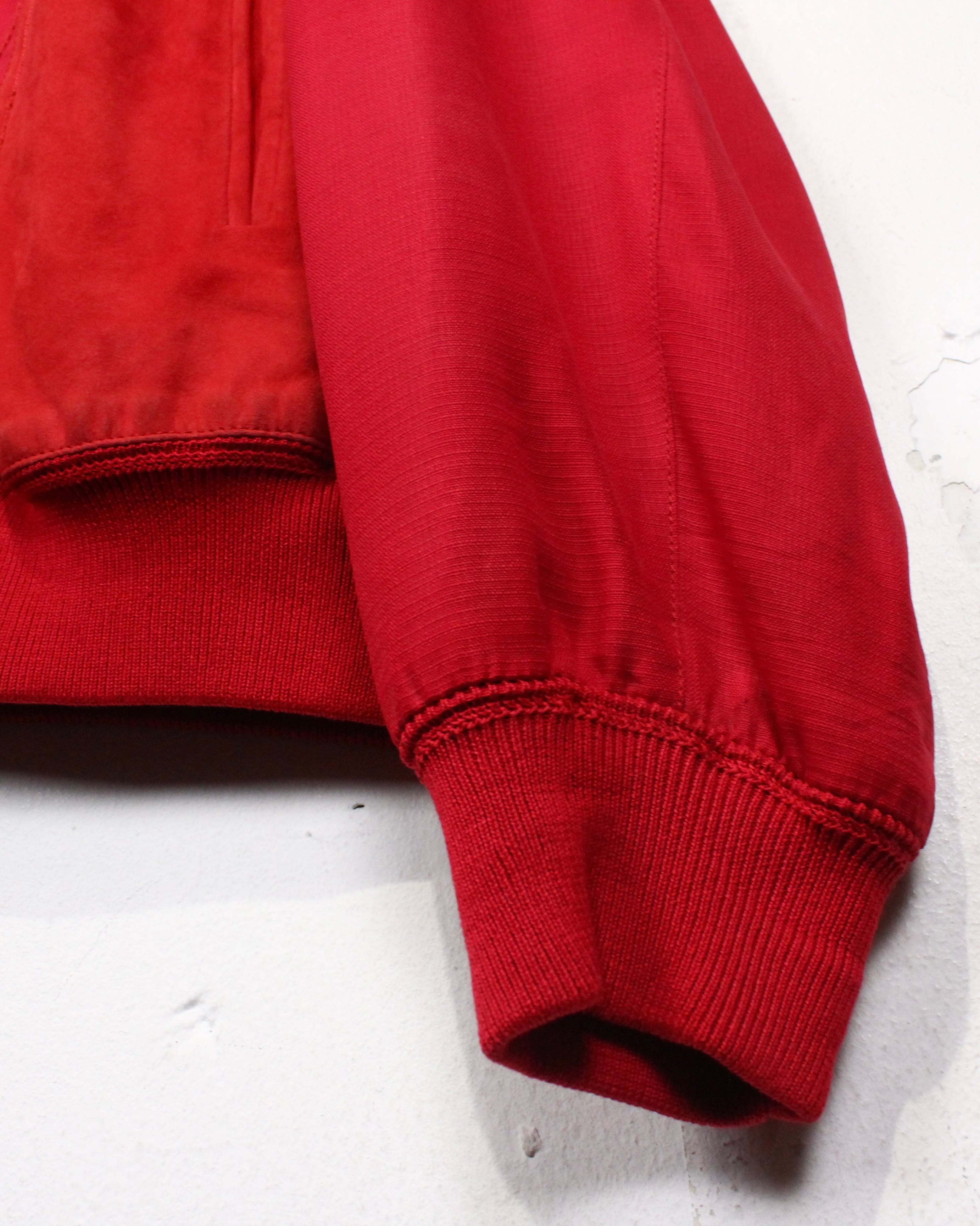 レザー特有のしっとりとした質感と、シルクの柔らかさがマッチした、非常に奥行きのある表情が魅力です。ステッチワーク、発色の良い赤色も◎