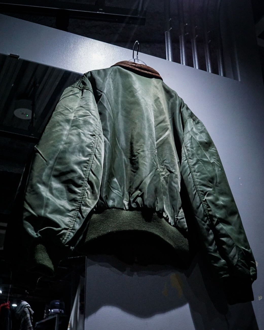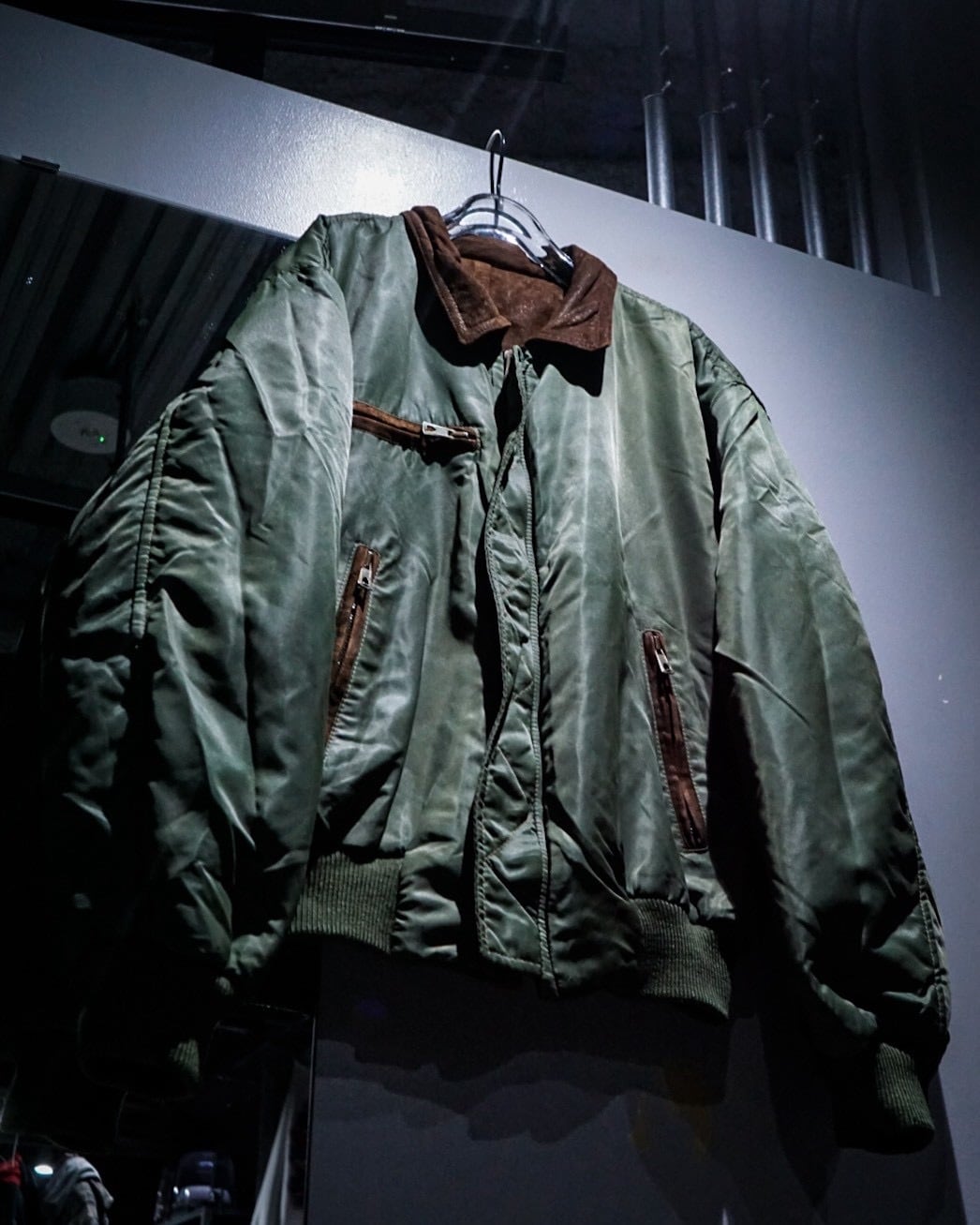 ボディはMA-1を思わせるナイロンシェルをベースに、切り替え部分へスエードレザーを採用。ナイロン特有の鈍い光沢と、スエードのマットで奥行きのある質感が好対照を生み、単なるミリタリーで終わらない表情に仕上がっています。