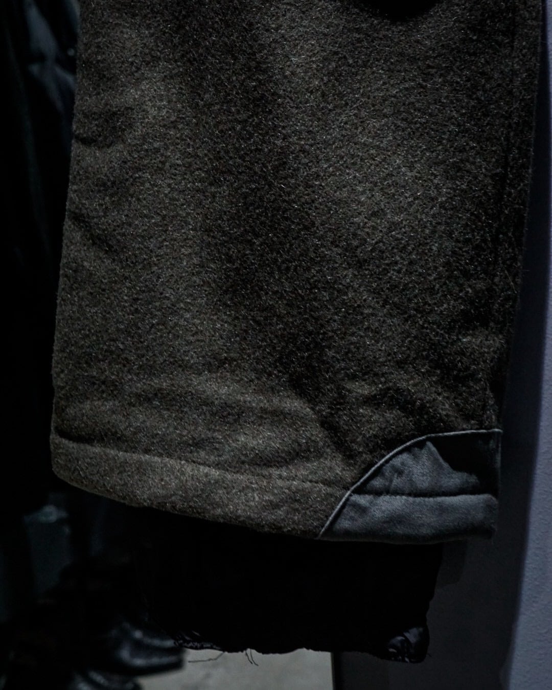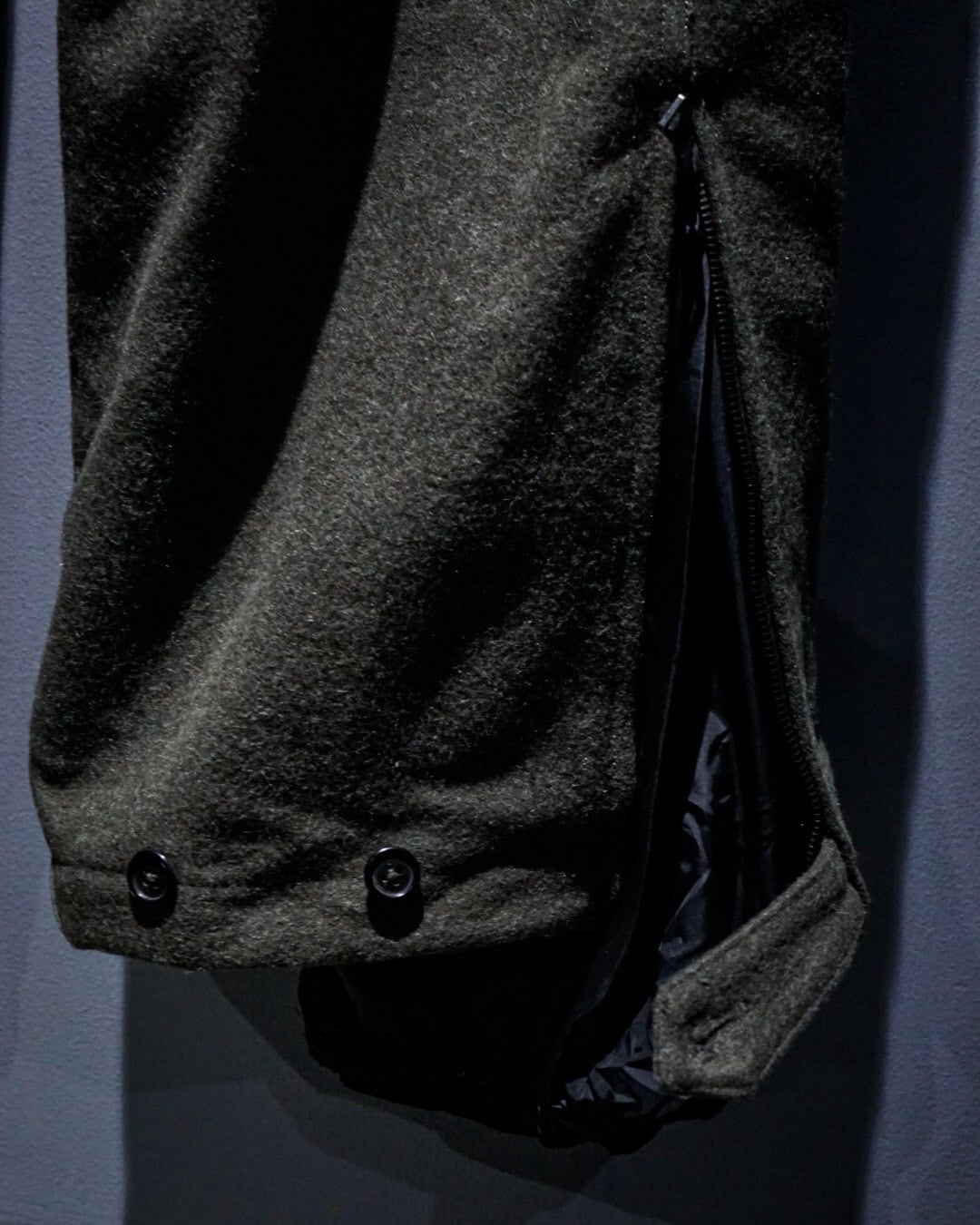 裾部分にはレッグウォーマーをレイヤード風に施し、単なるウールパンツに留まらない立体的な表情をプラス。足元に自然な溜まりと奥行きが生まれ、シンプルなスタイリングでもしっかりと存在感を放ちます。