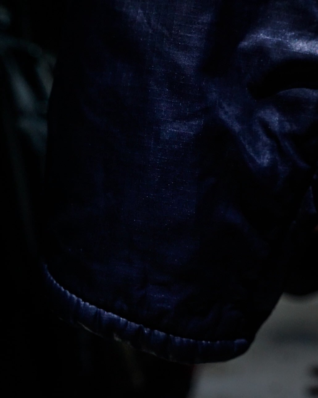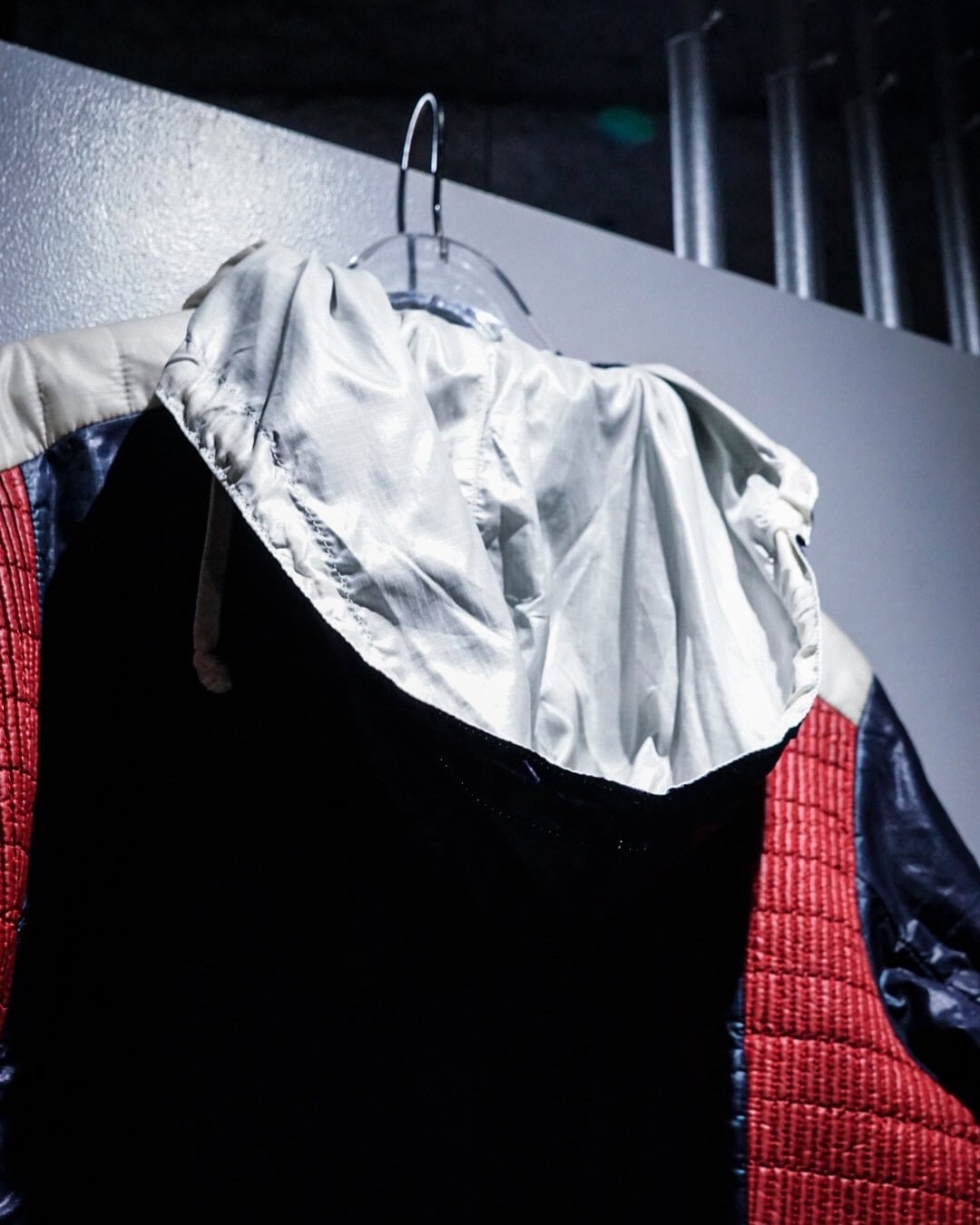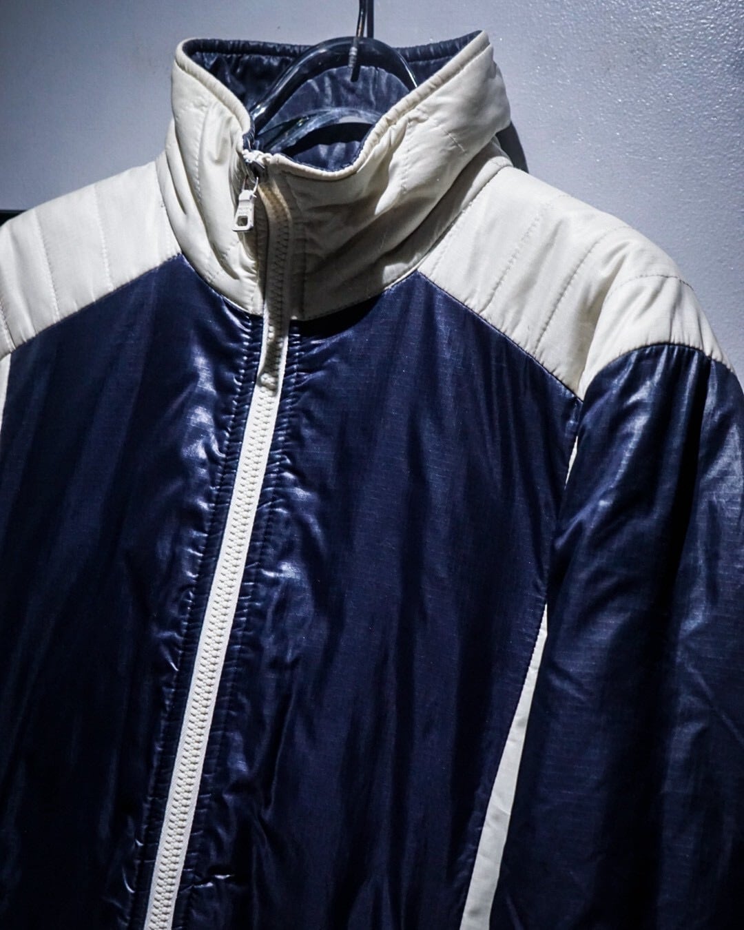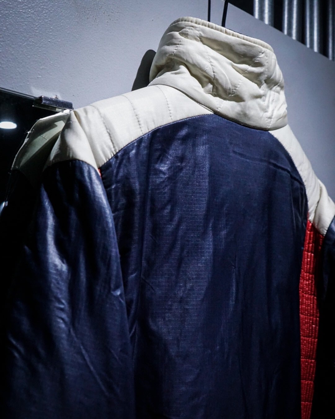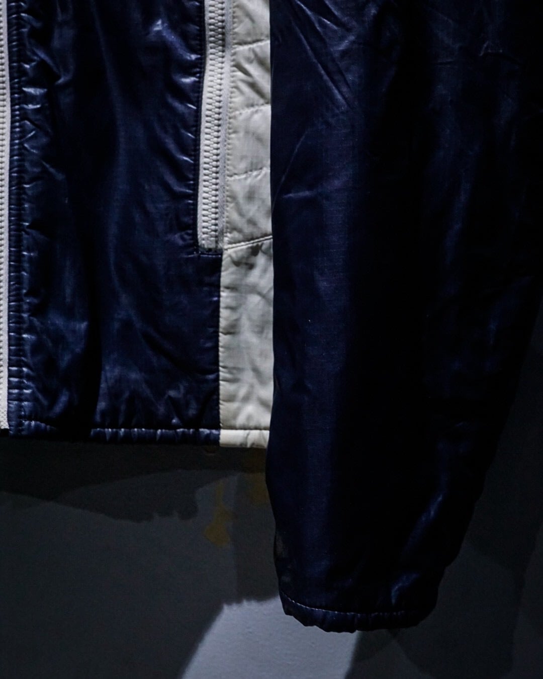 ボディは深みのあるネイビーカラーをベースに、エッジの効いた切り替えを施したナイロンパデットジャケット。