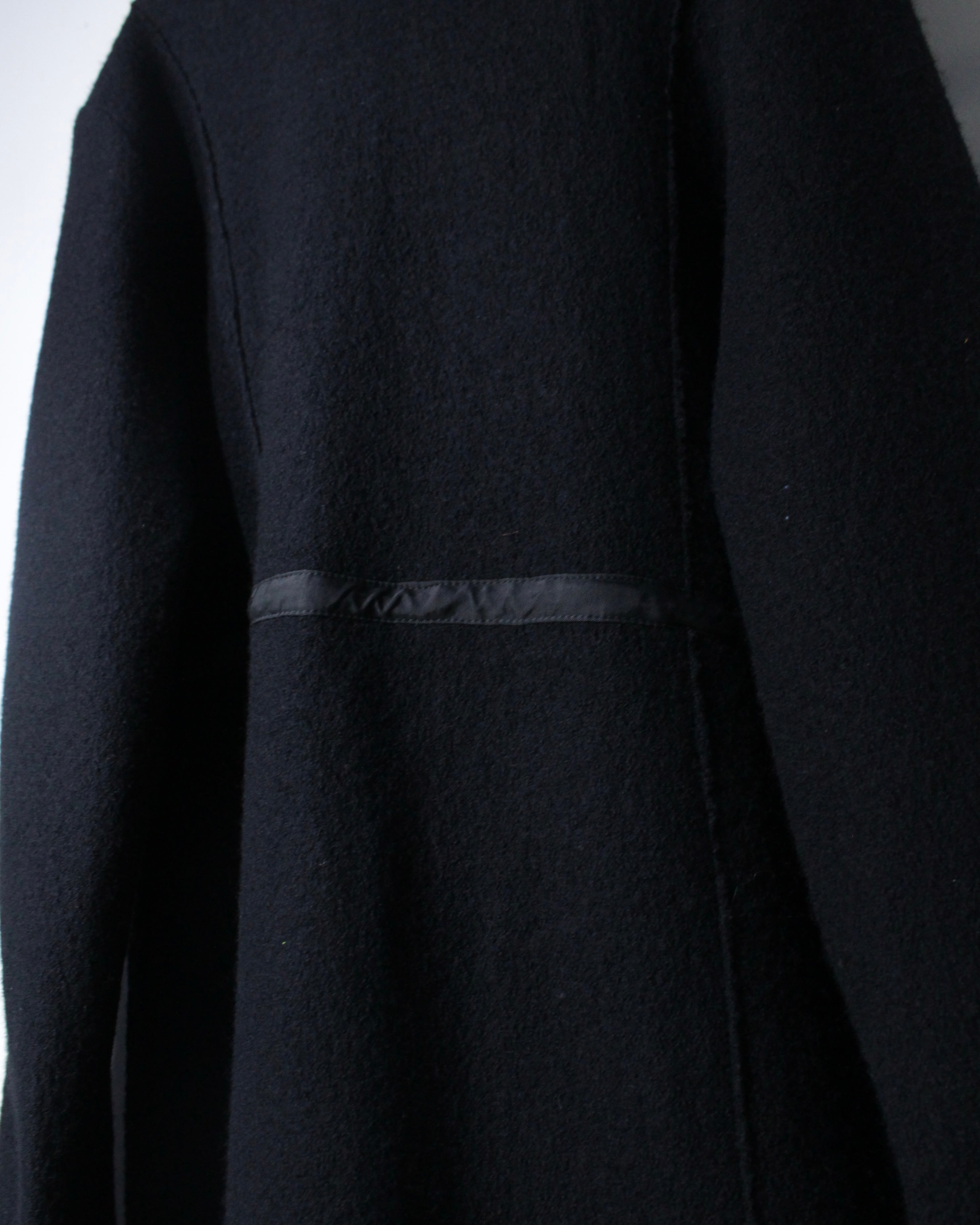 インサイドアウト風のデザインにフロントは比翼仕立てとモードな雰囲気を纏った仕上がり。ポケット部分には異素材を用い、ミニマルな中にさりげない表情を加えています。