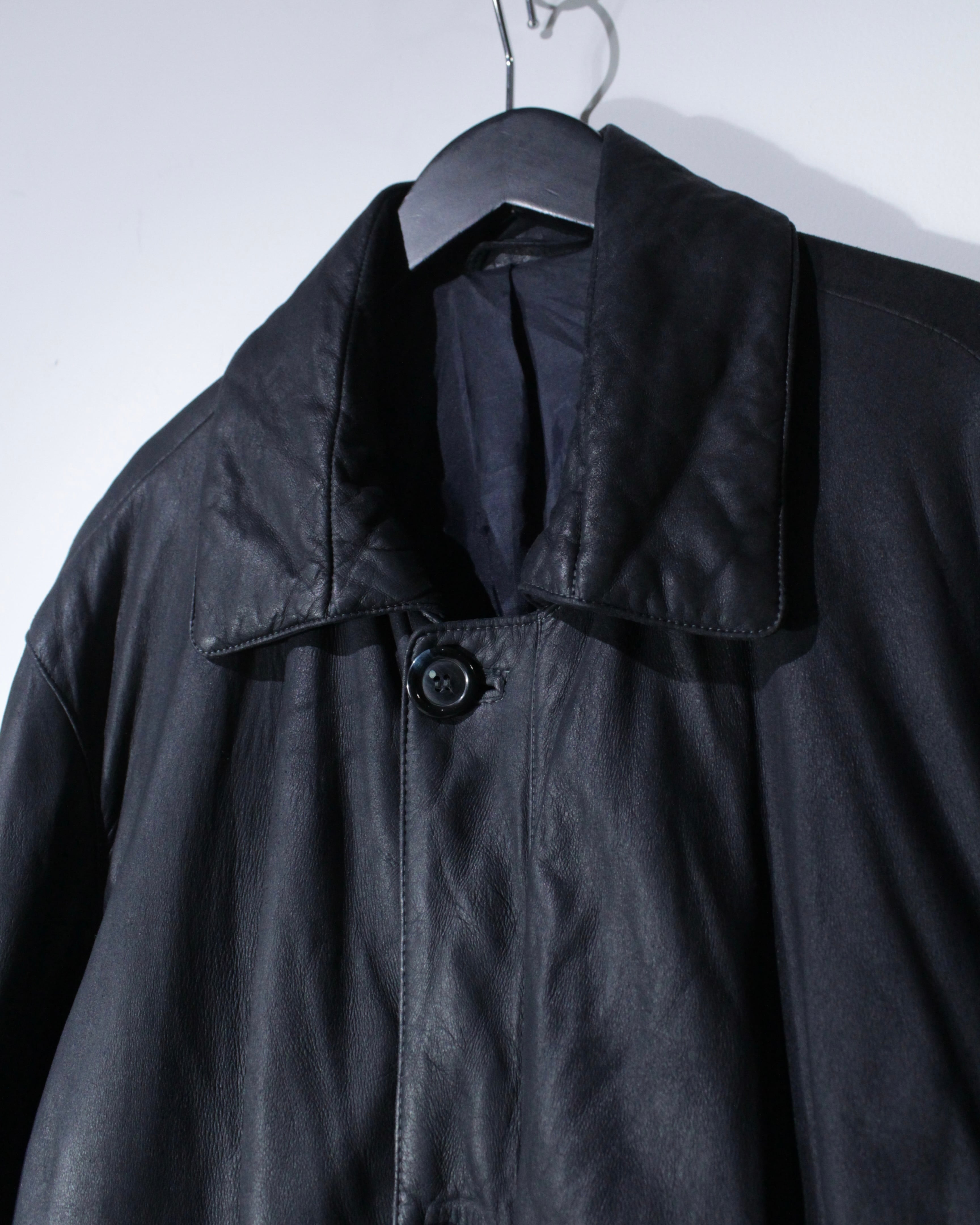 落ち着いたブラックレザーを用いた、クラシックな佇まいのレザーコート。