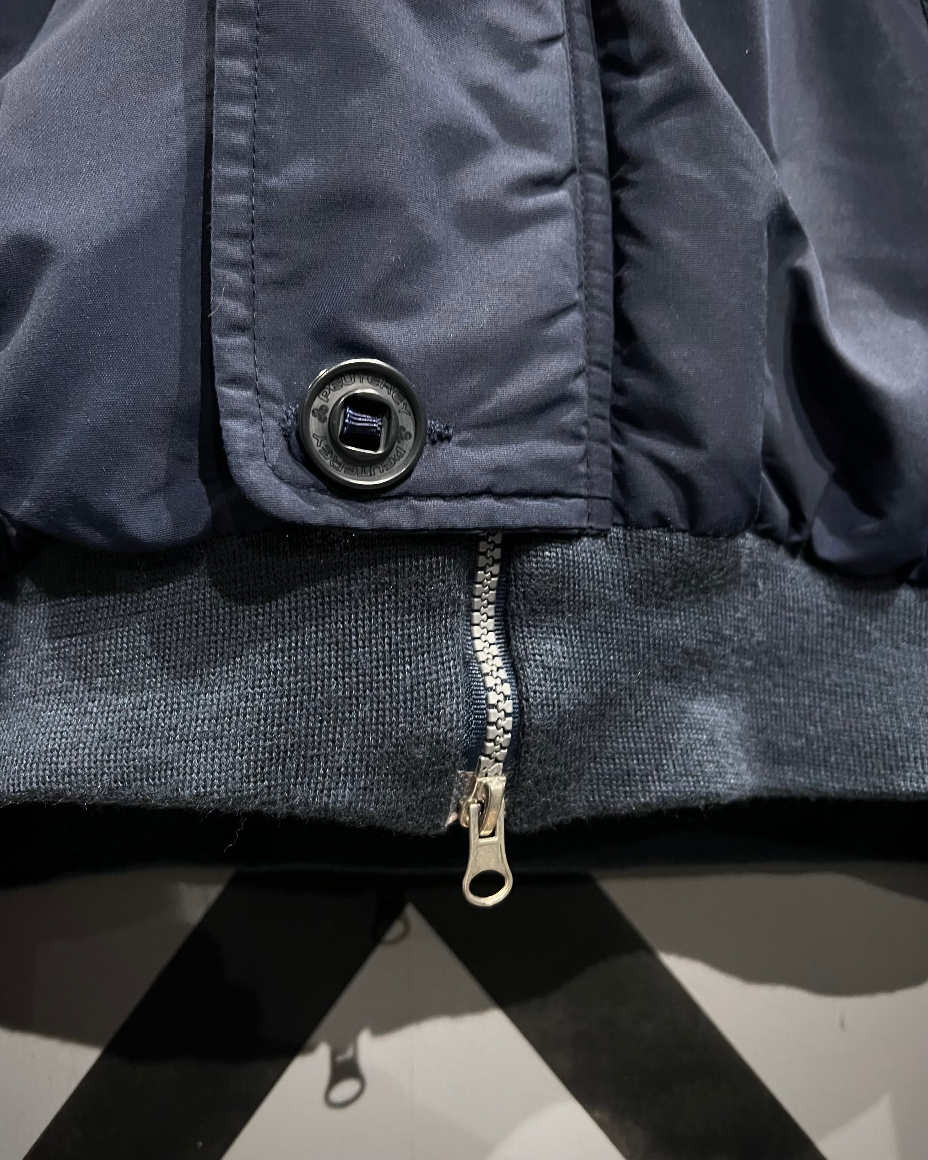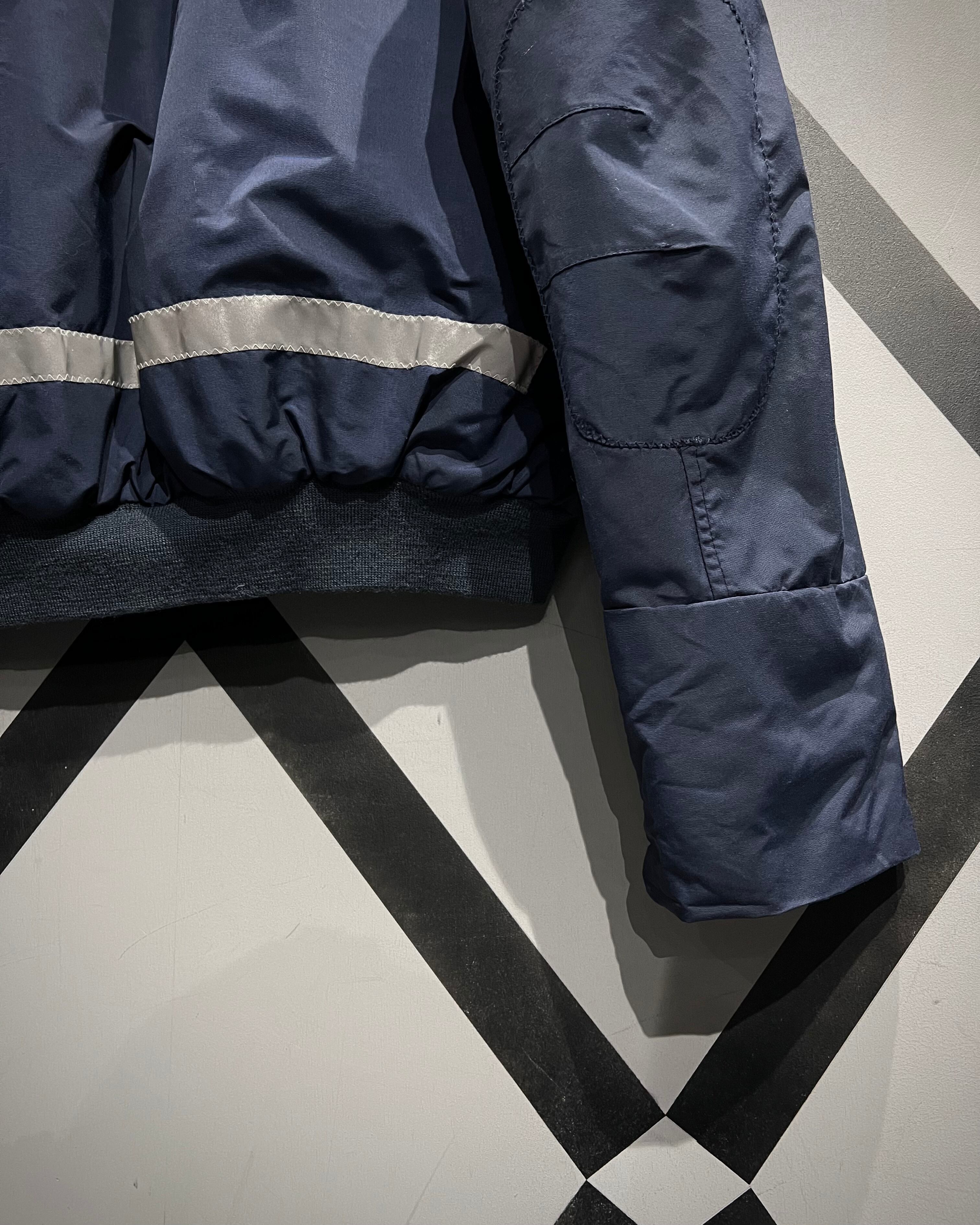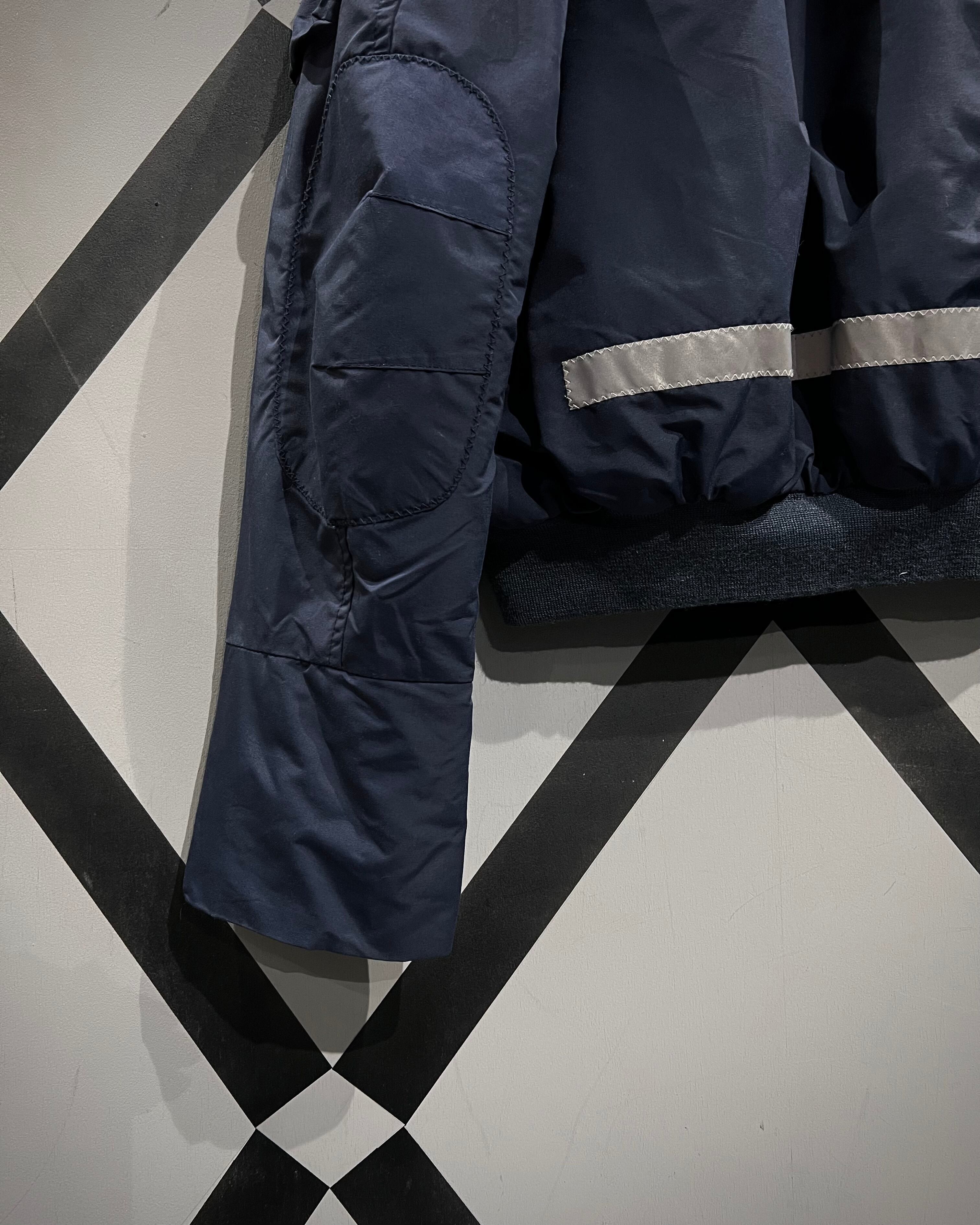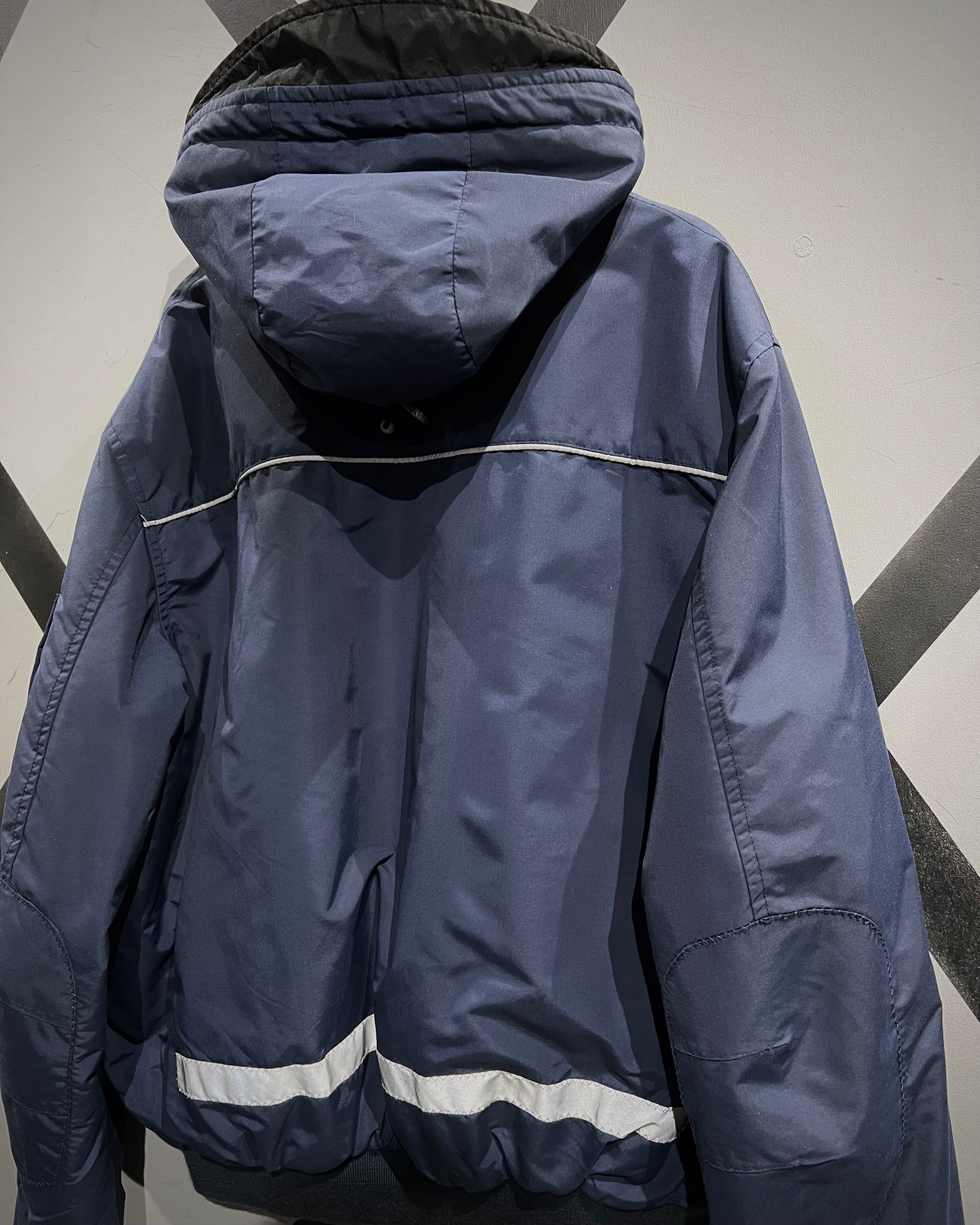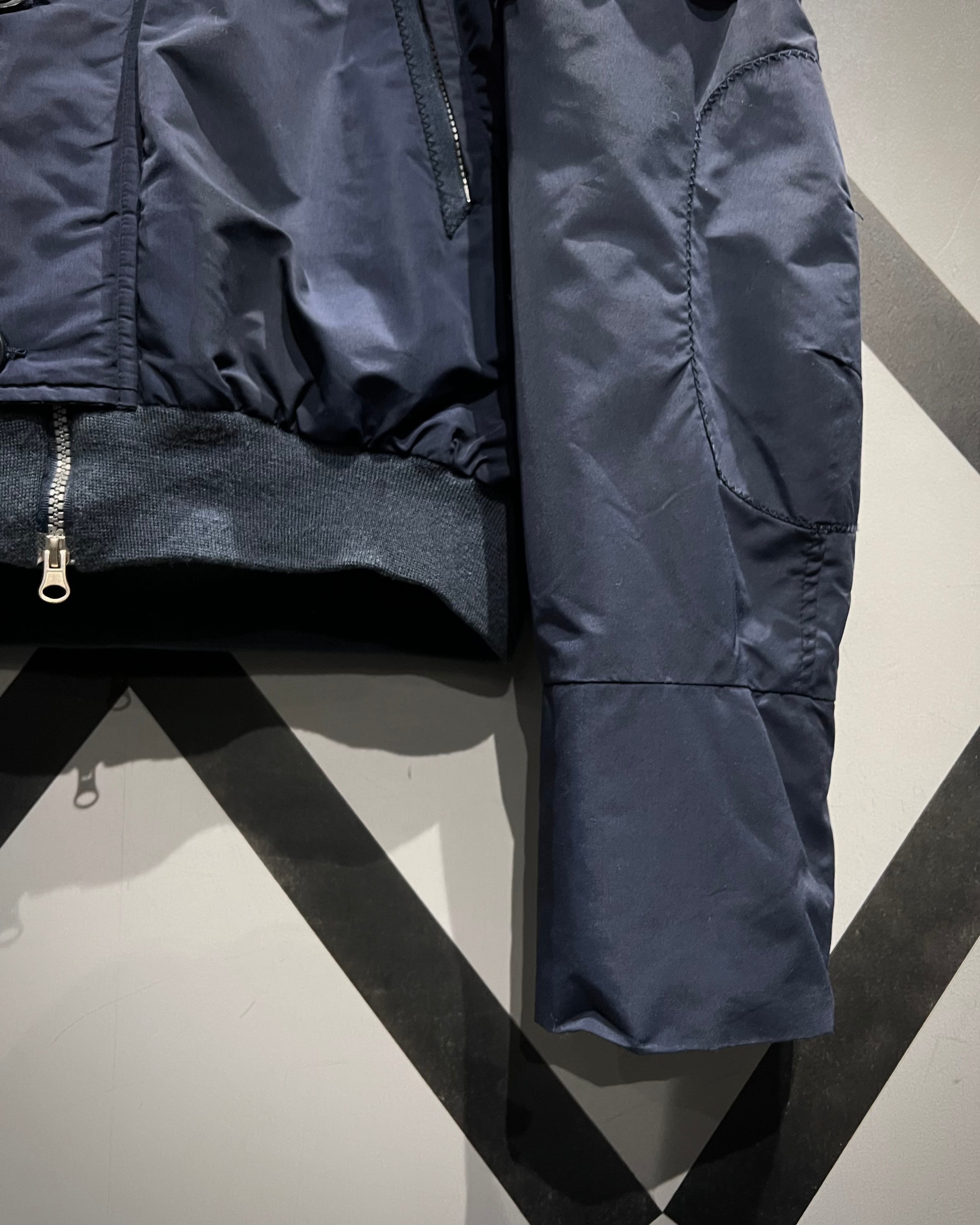 ネイビーのボディに、フロントはダブルジップ+ボタンのダブルクロージャー仕様。袖にはフライトジャケットらしいユーティリティポケットを配置し、背面にはリフレクティブテープを走らせることで機能美を強調。