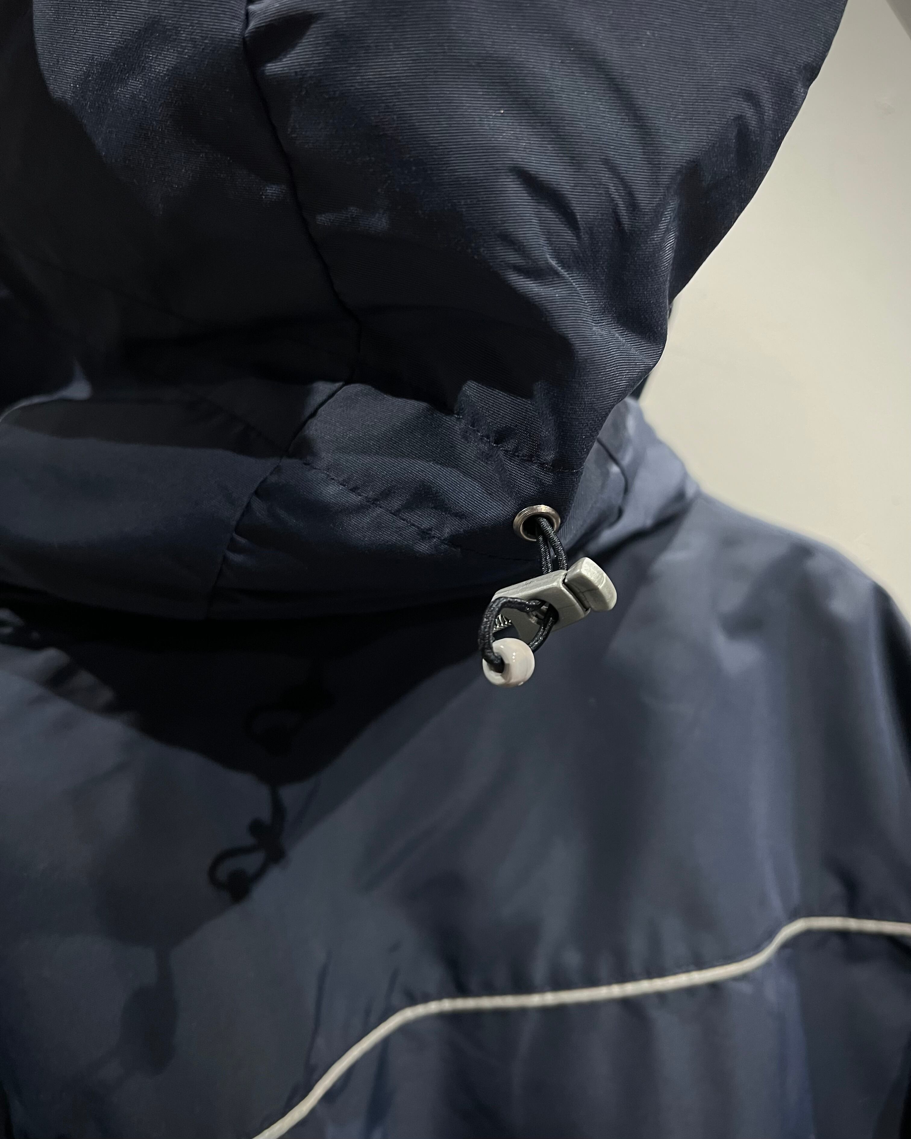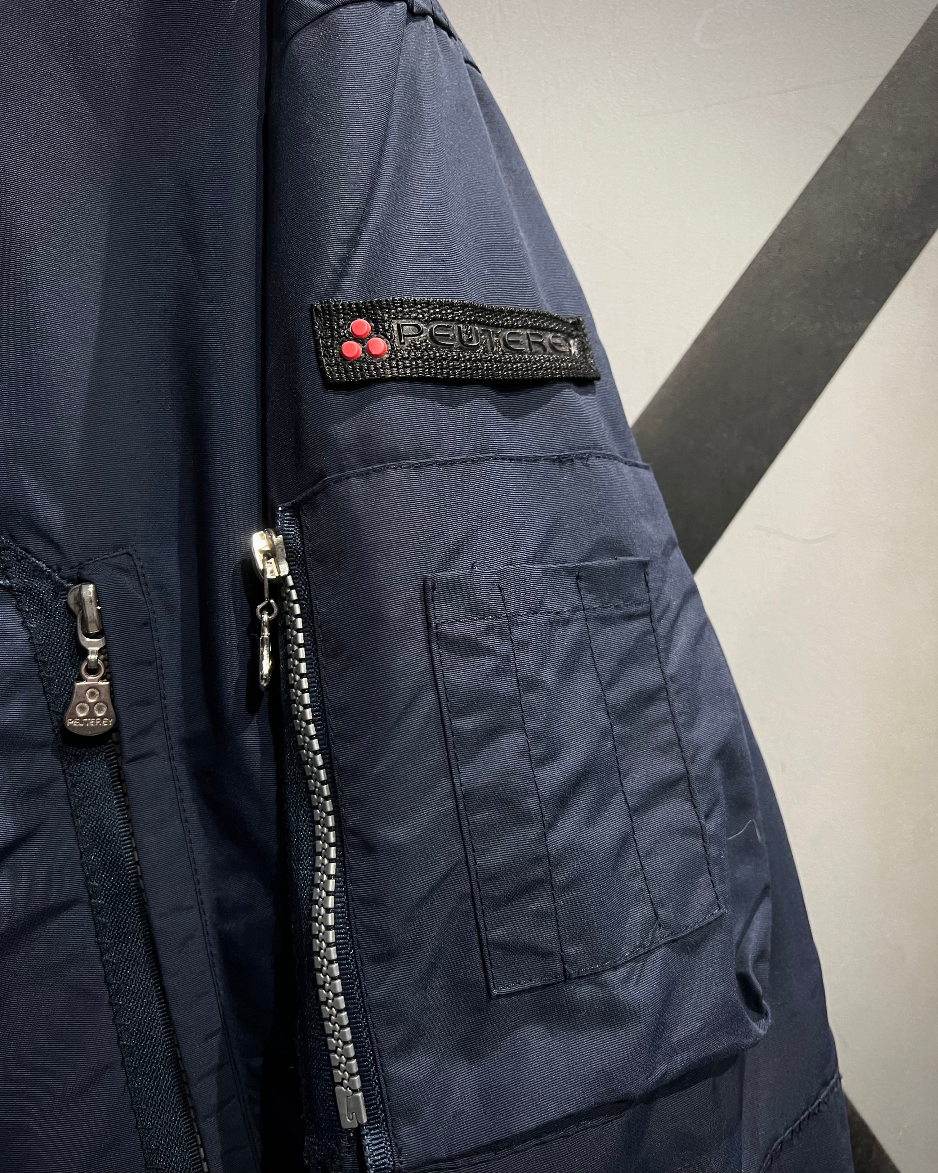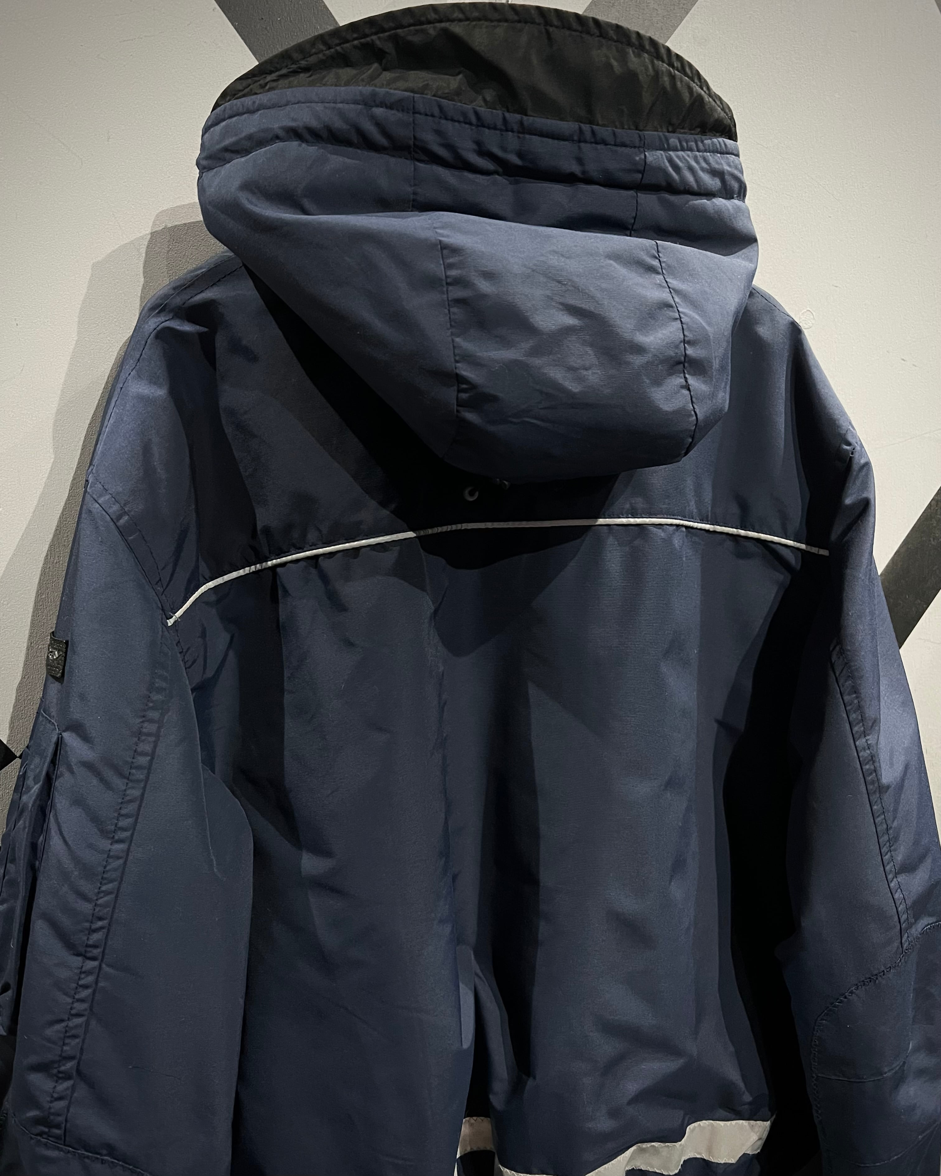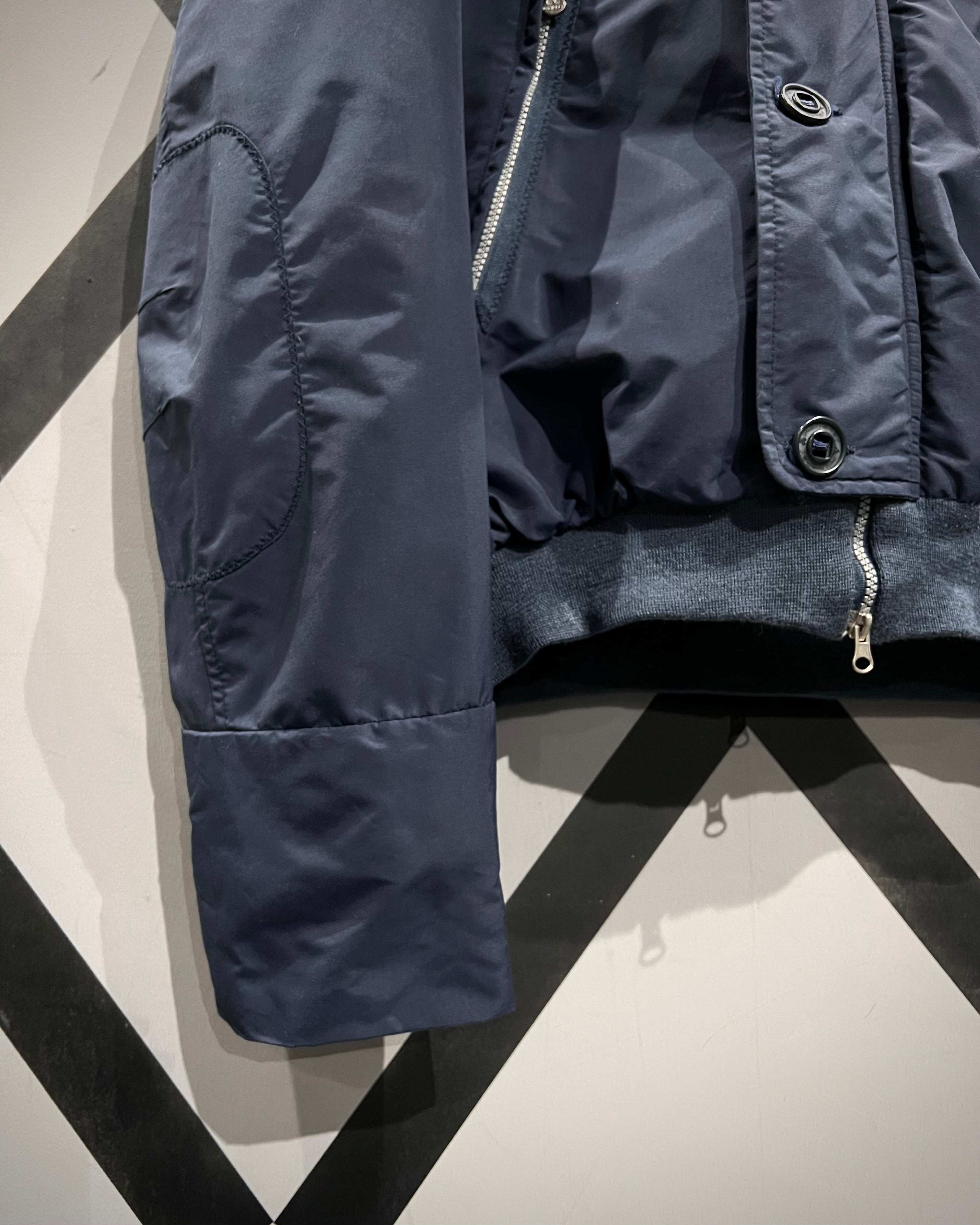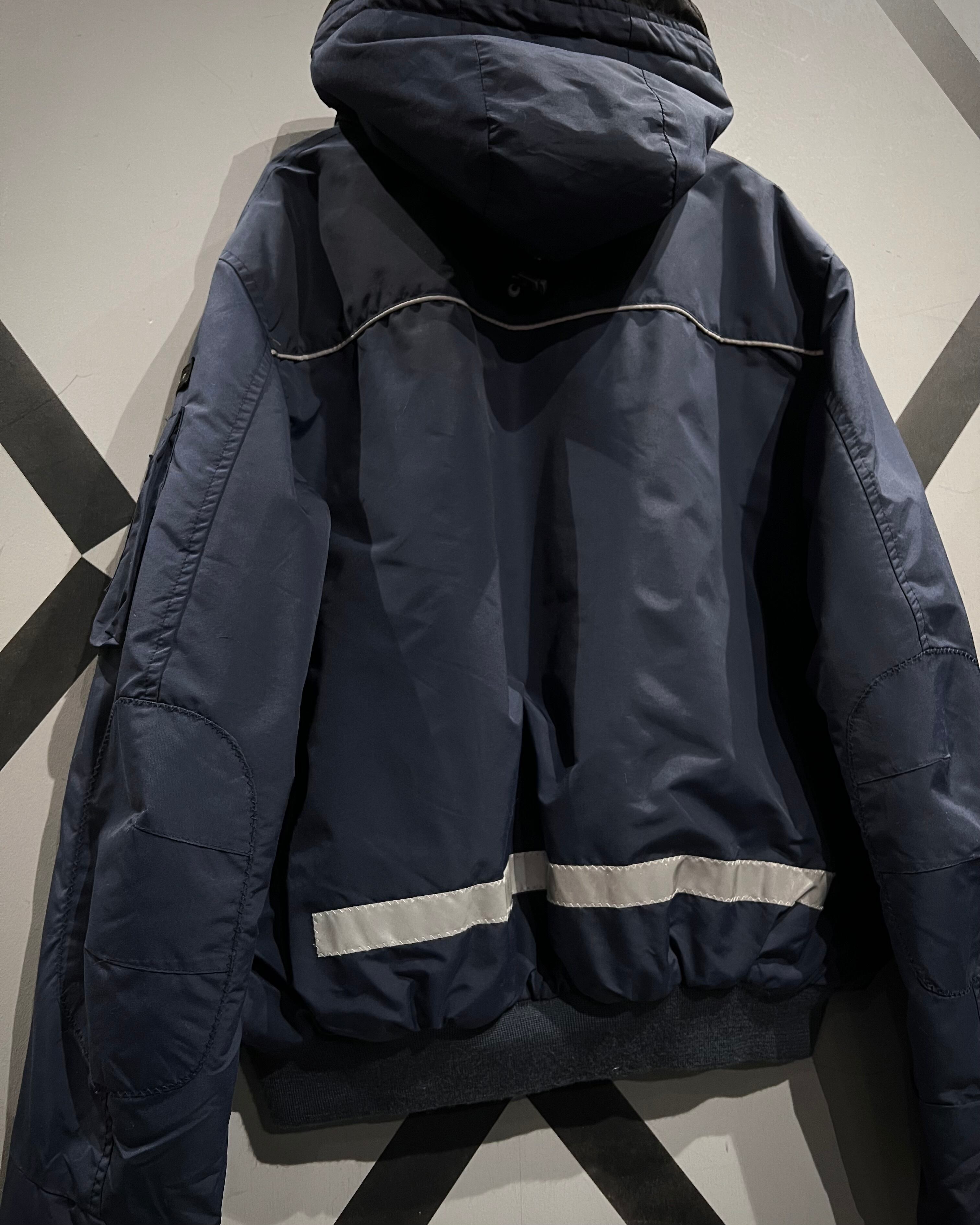 ネイビーのボディに、フロントはダブルジップ+ボタンのダブルクロージャー仕様。袖にはフライトジャケットらしいユーティリティポケットを配置し、背面にはリフレクティブテープを走らせることで機能美を強調。