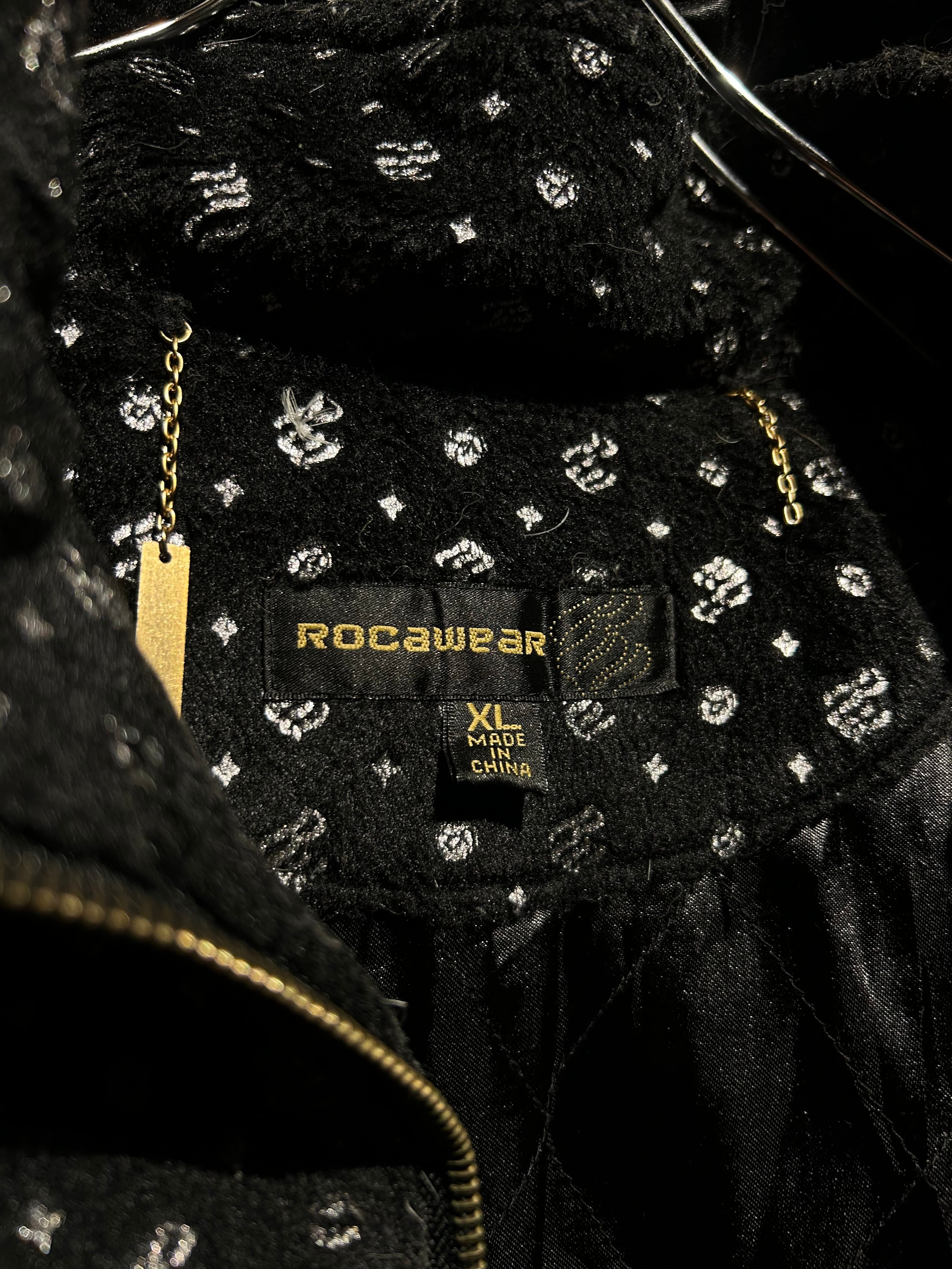 起毛感のあるブラックベースのボディには、ROCAWEARのイニシャルモチーフを総柄で落とし込み、単色ながらもしっかりと主張のある仕上がりに。光の当たり方で浮かび上がるパターンが、ラグジュアリー×ストリートな空気感を演出します。