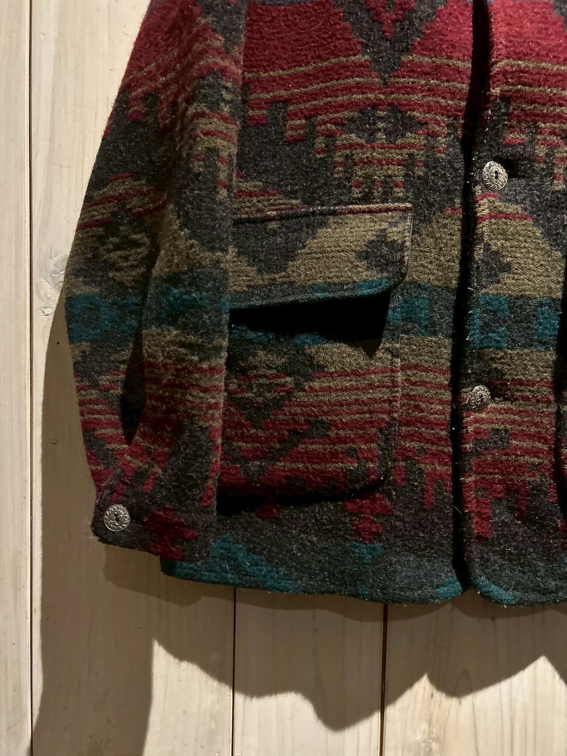 肉厚でしっかりとしたウールファブリックをベースに、ブルー、ボルドー、グリーンを織り交ぜたネイティブパターンを全面に配置。奥行きのある配色と織りの立体感が相まって、このブランドならではの表情豊かな仕上がりを見せます。