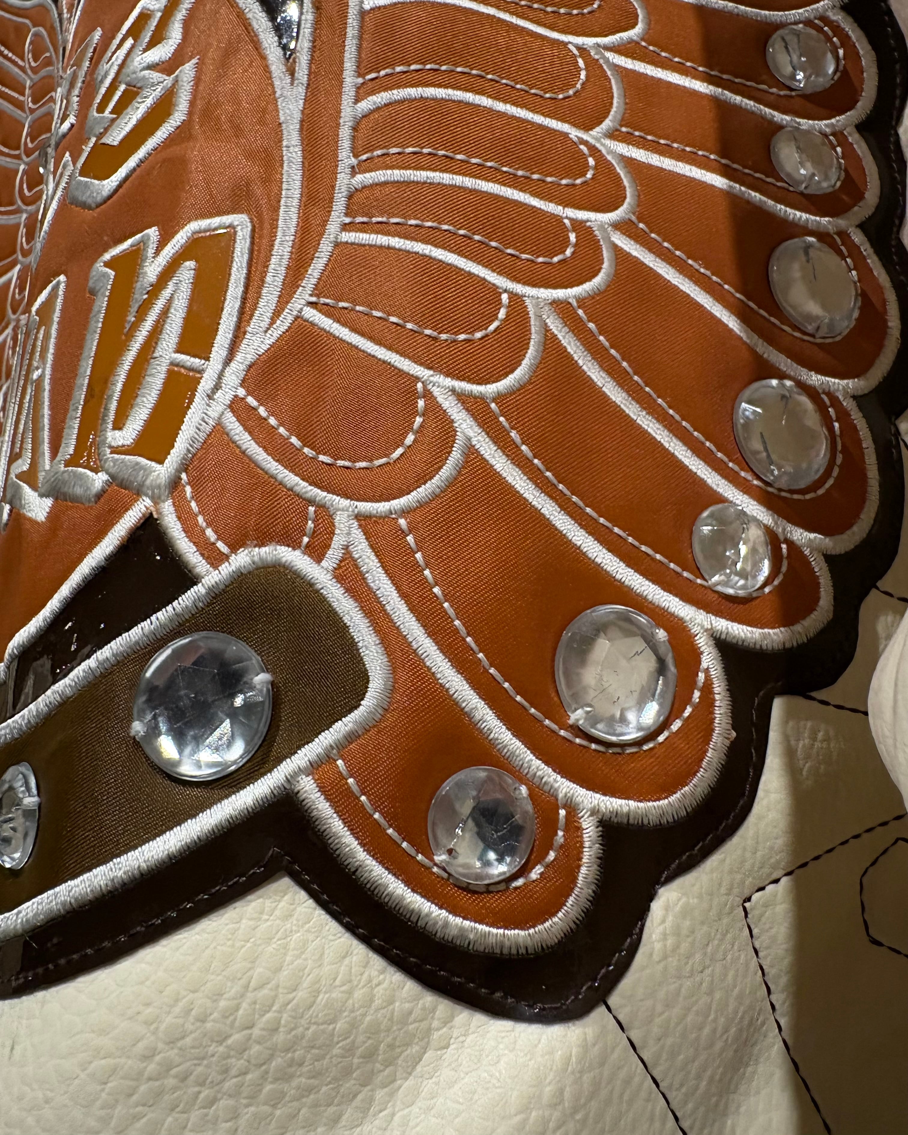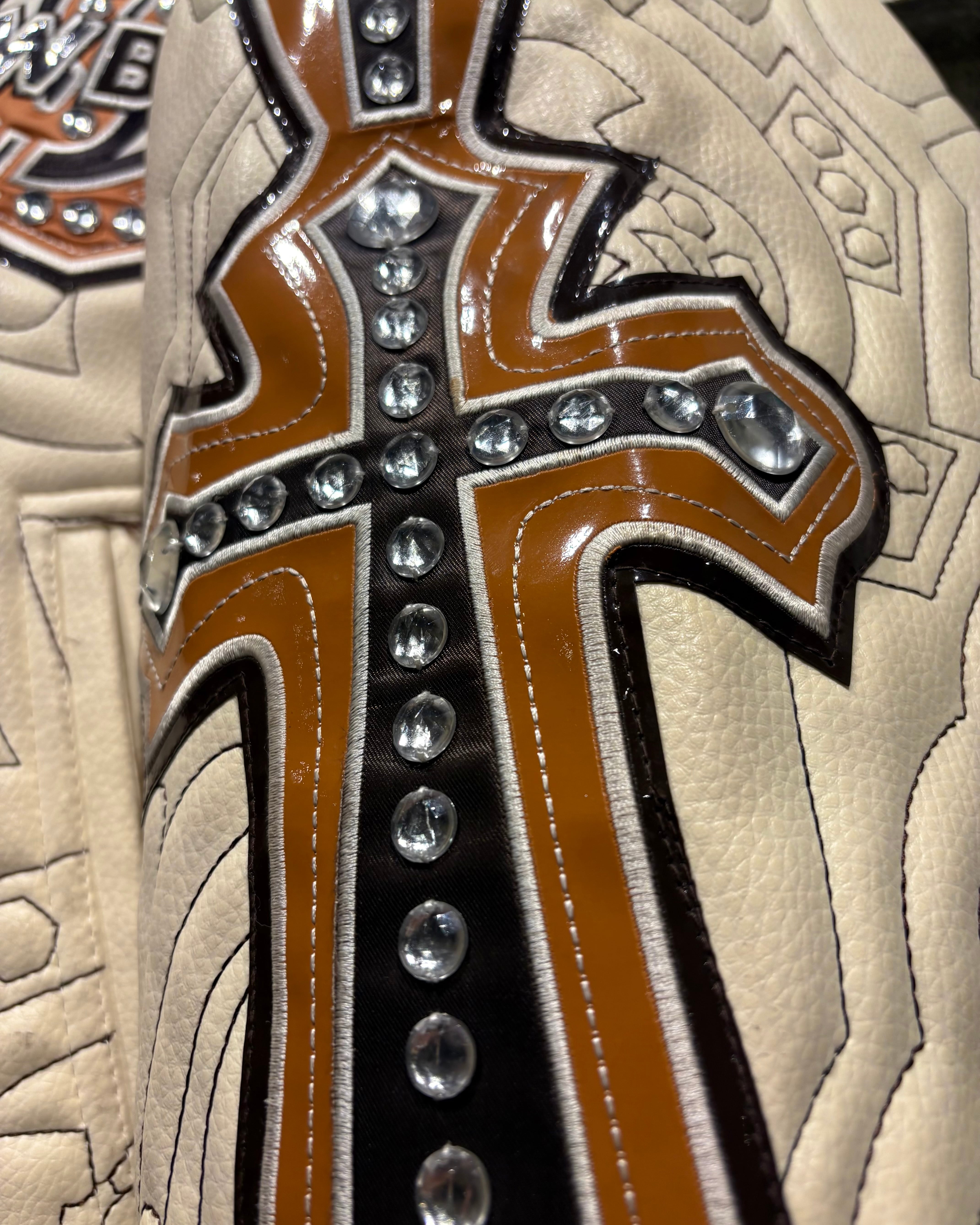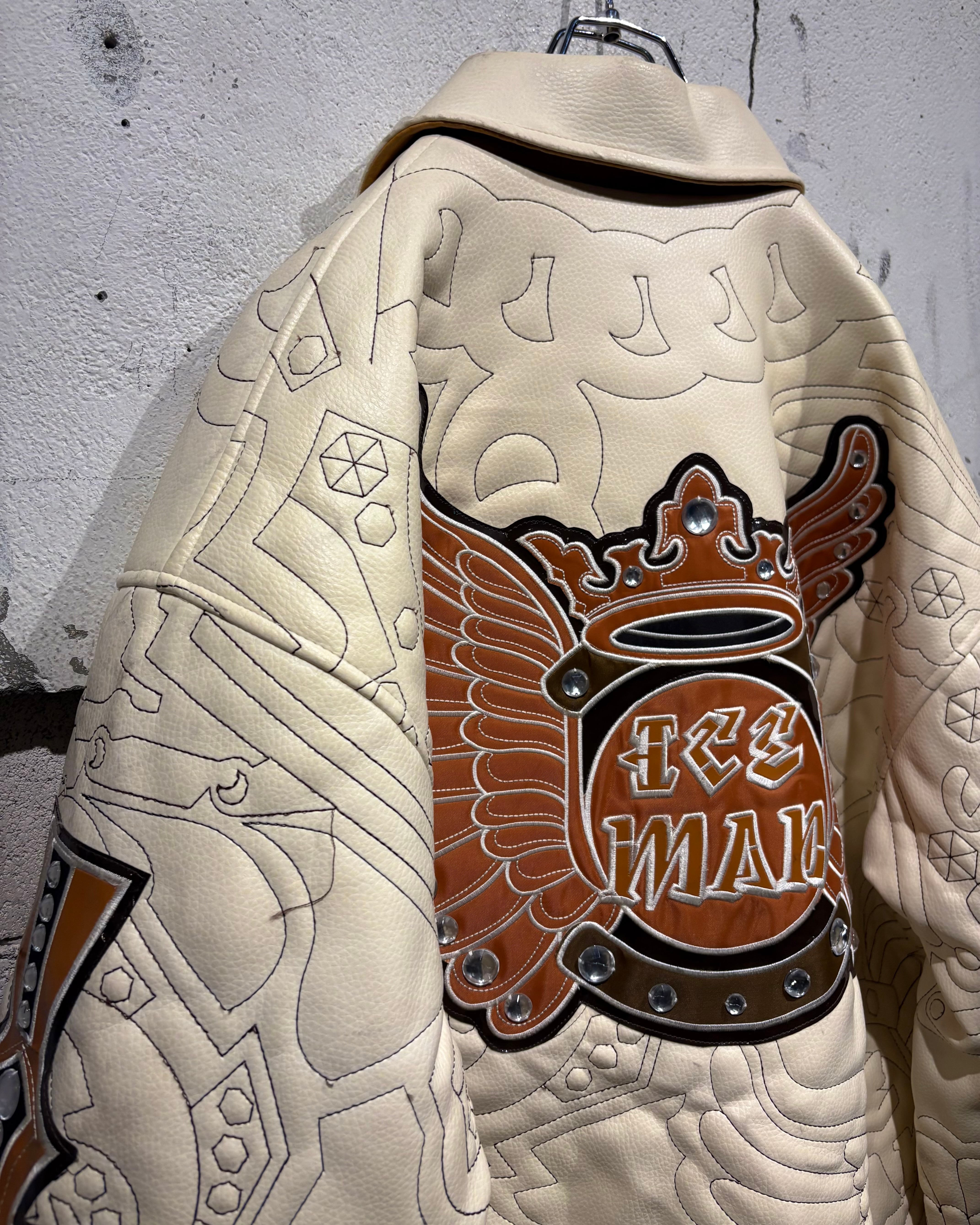 ボディにはハリのある上質なベージュカラーのフェイクレザーを採用。両腕から背面にかけては、十字架やクラウン、ウイングのワッペンを大胆に配置し、大粒のラインストーンを載せたインパクトのある1着。