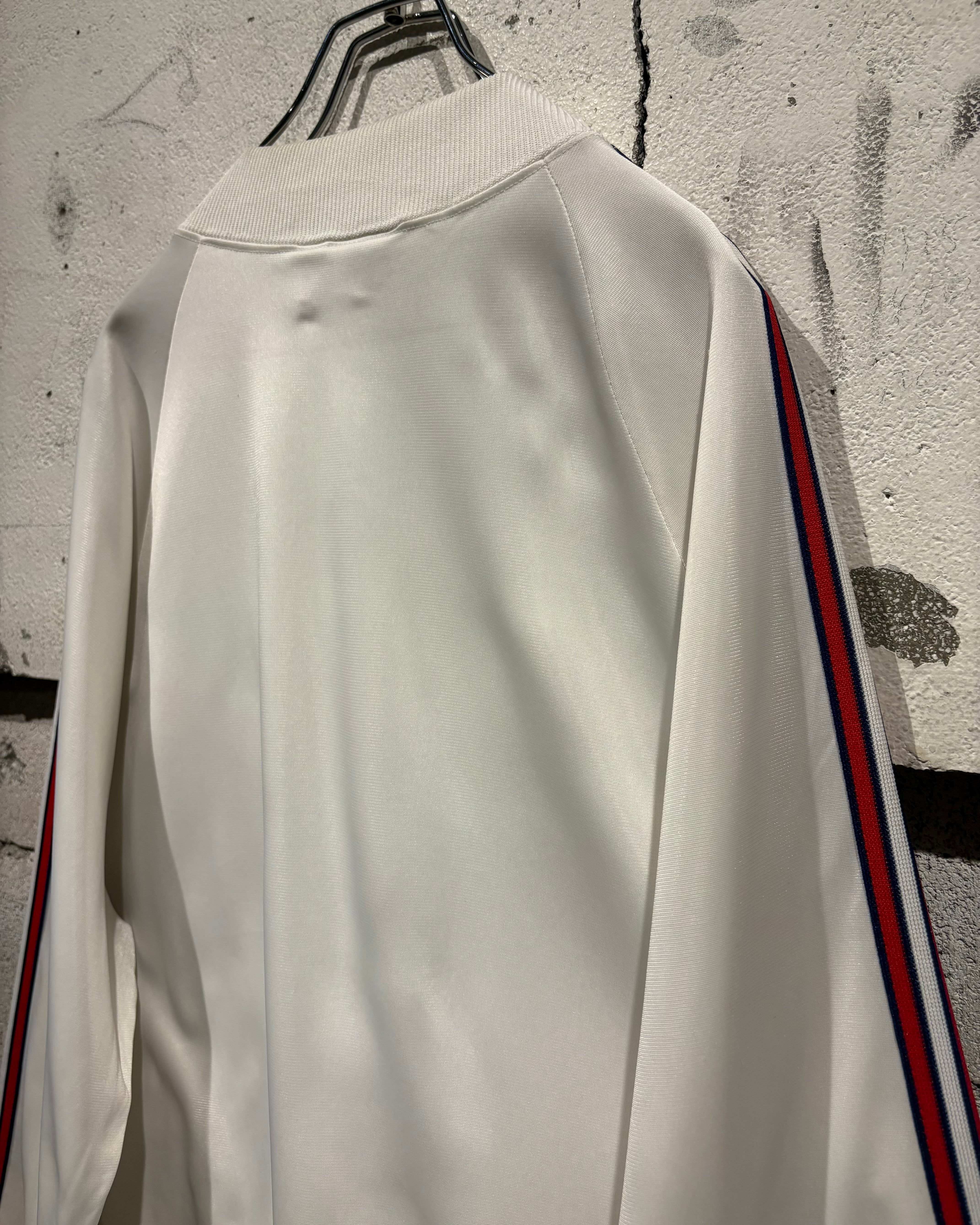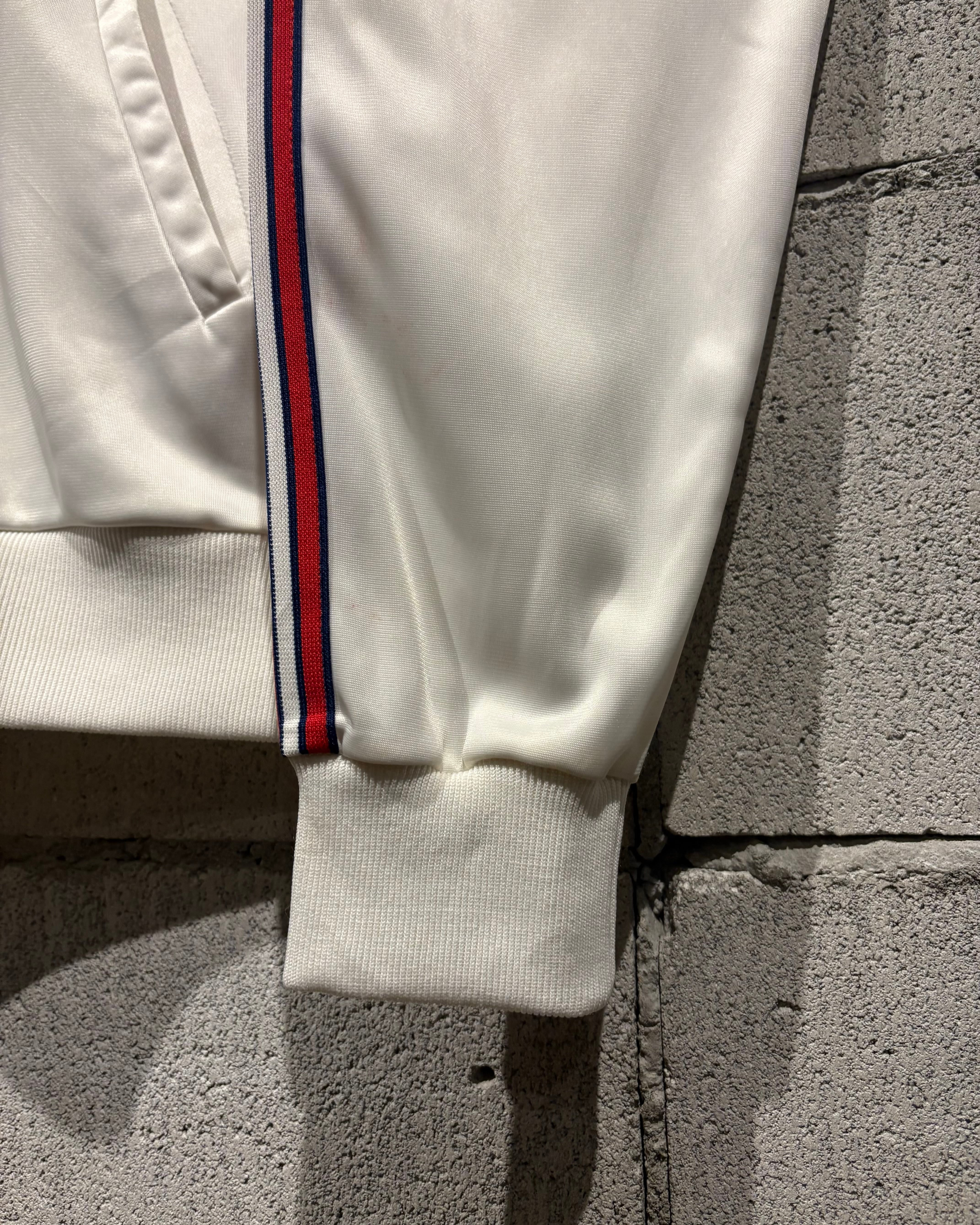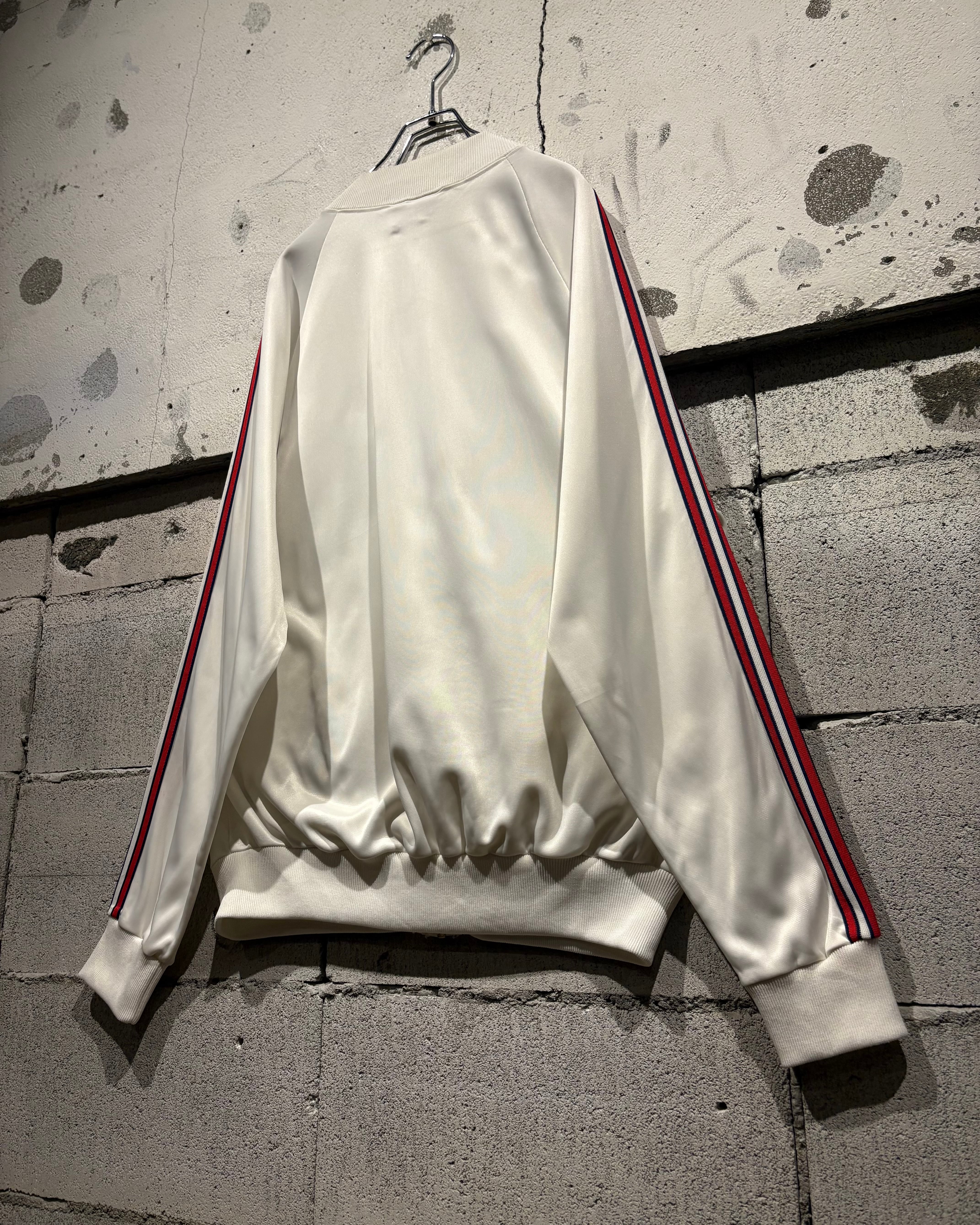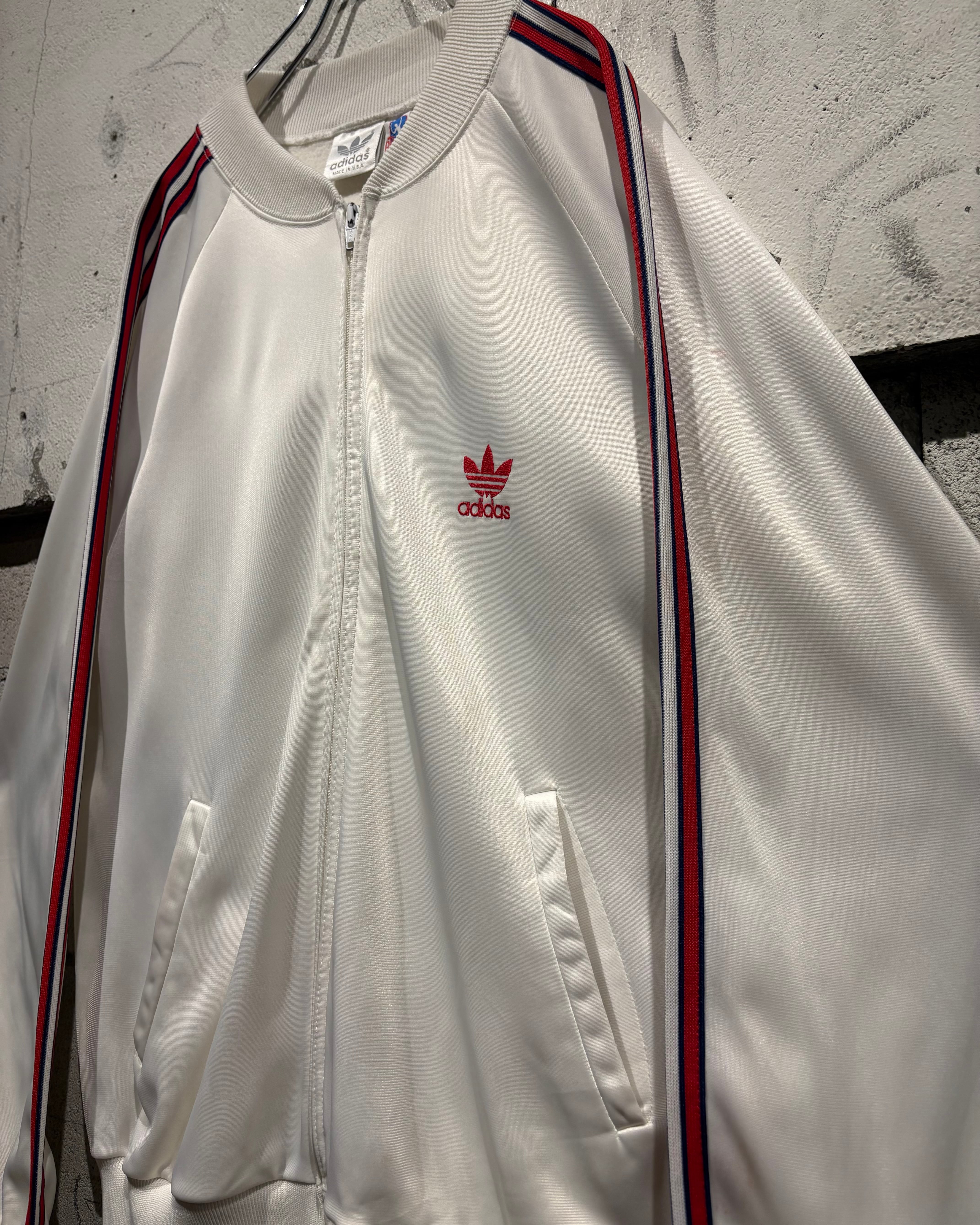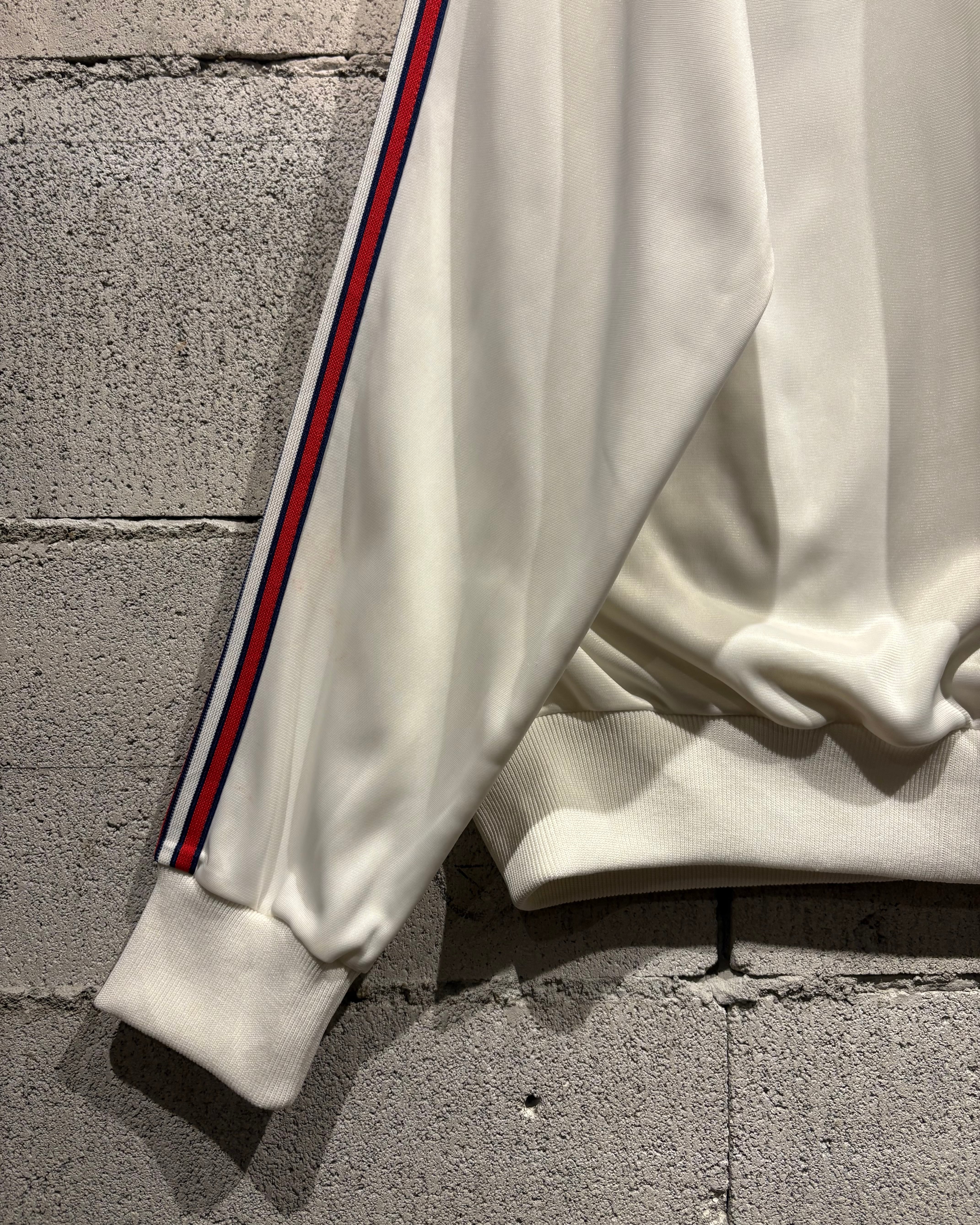 光沢のあるホワイトのボディに、赤×黒の3ストライプス、トレフォイルロゴを刺繍で配した名作“ATP”の80's USA製の1着。