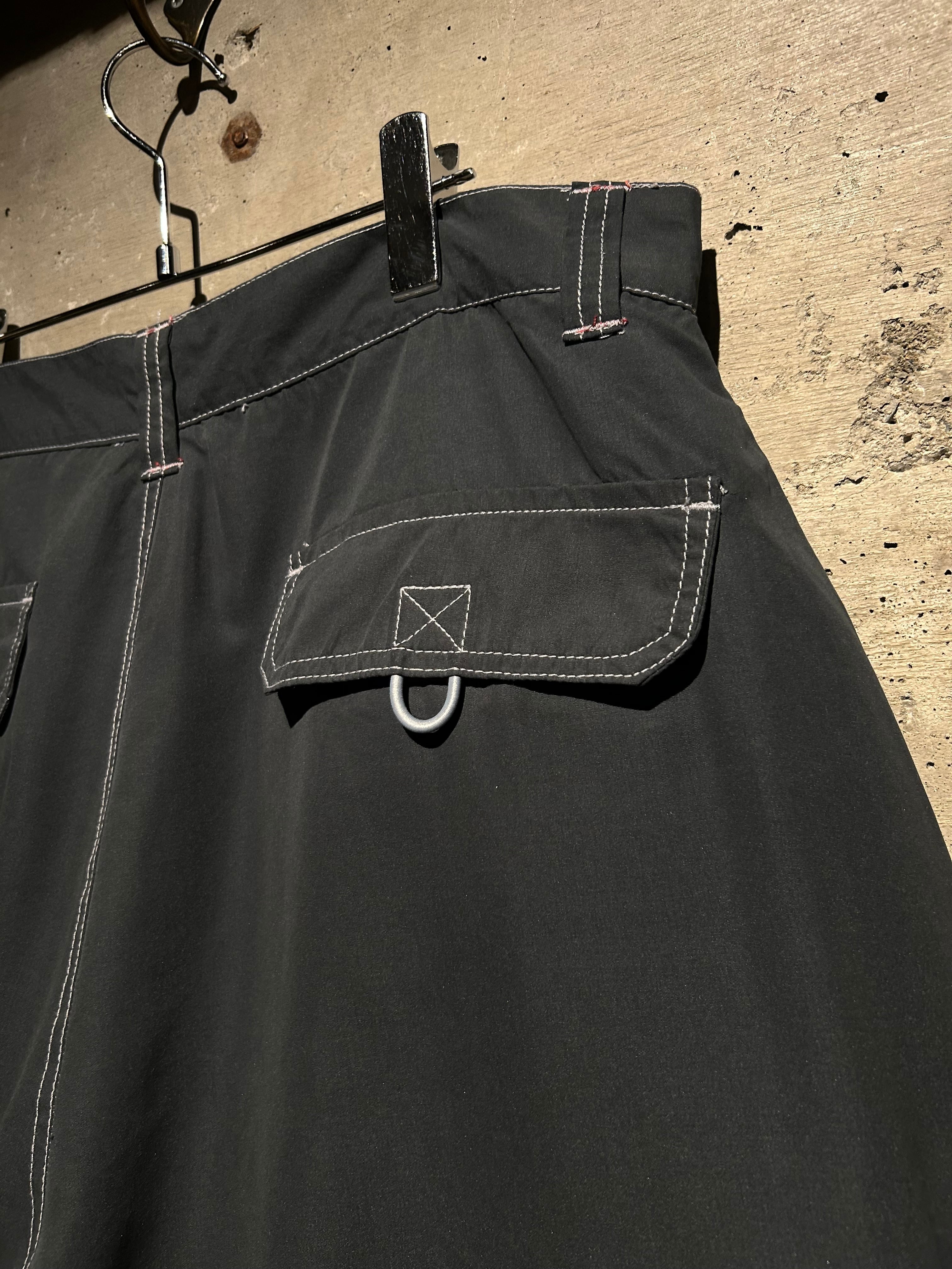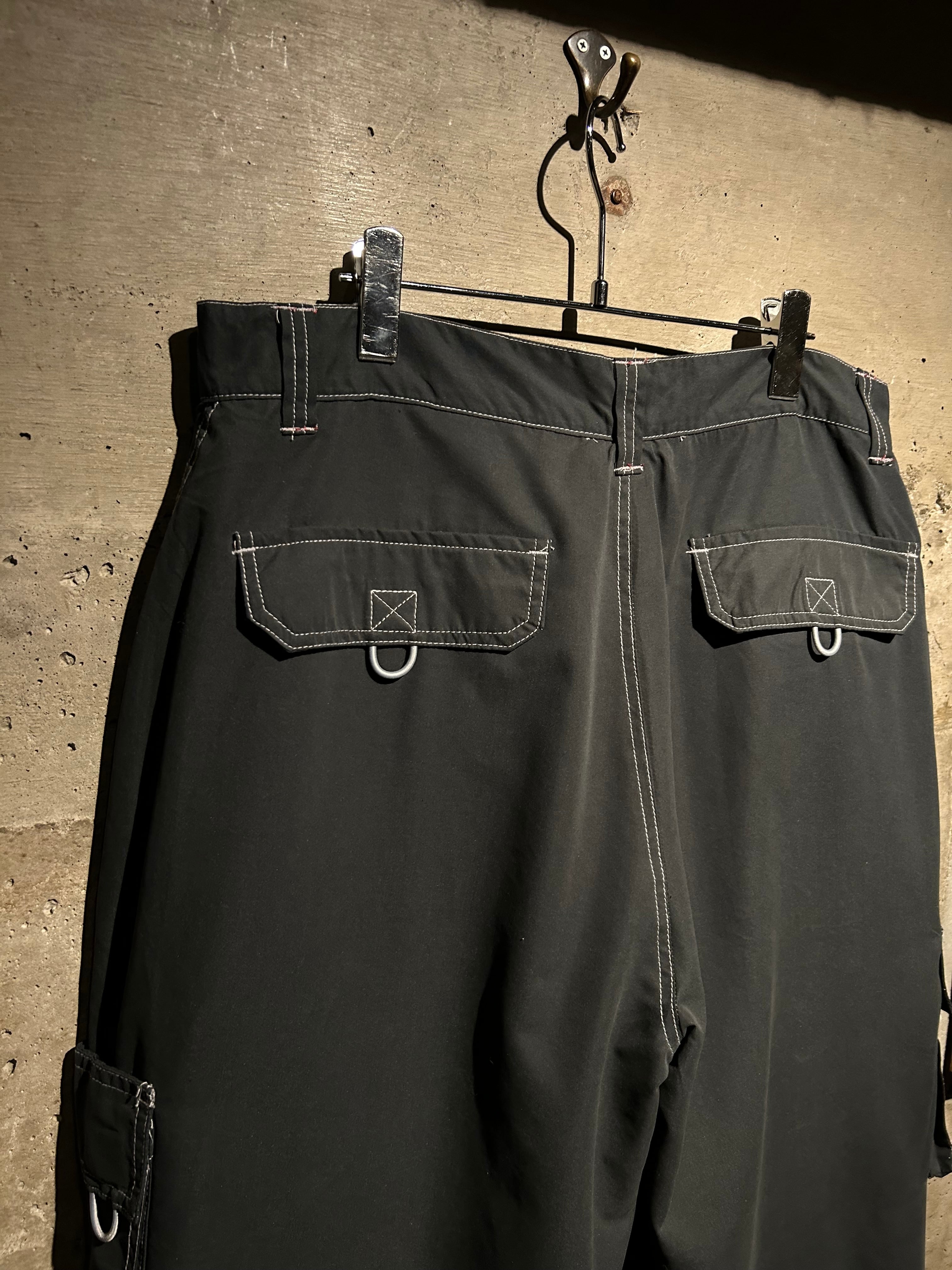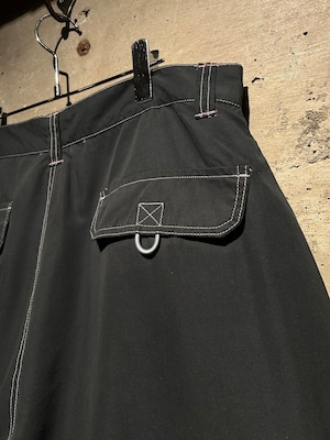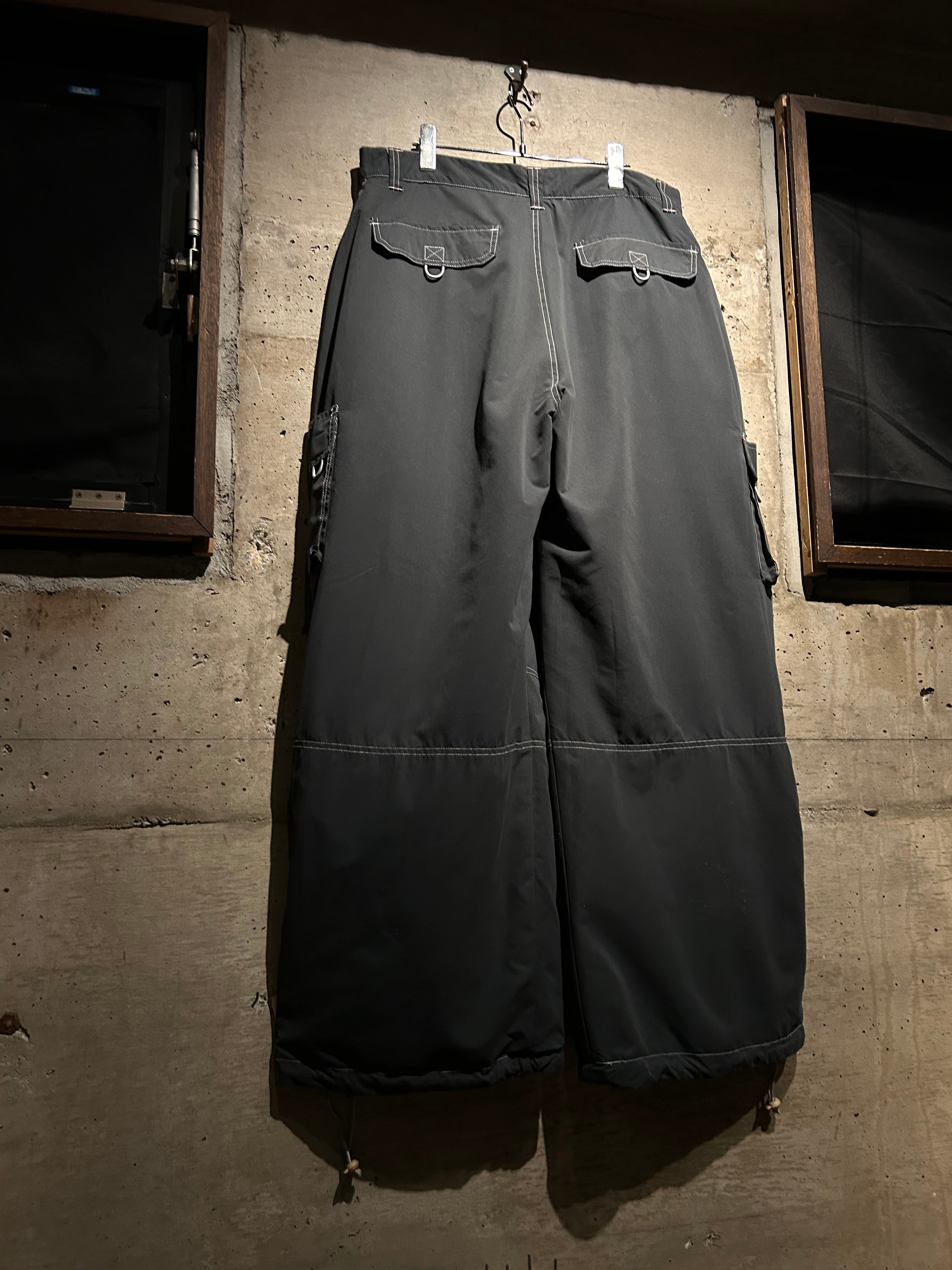 片面は、レイヴカルチャーのムードを色濃く映し出すカモフラージュパターン。ハリのあるタフなファブリックをベースに、メッシュ切り替えや赤のパイピングを効かせた、無骨さとテクニカルさが共存する仕上がりです。サイドのカーゴポケットやDカン、裾のドローコードなど、当時らしいギミックも抜かりなく搭載。