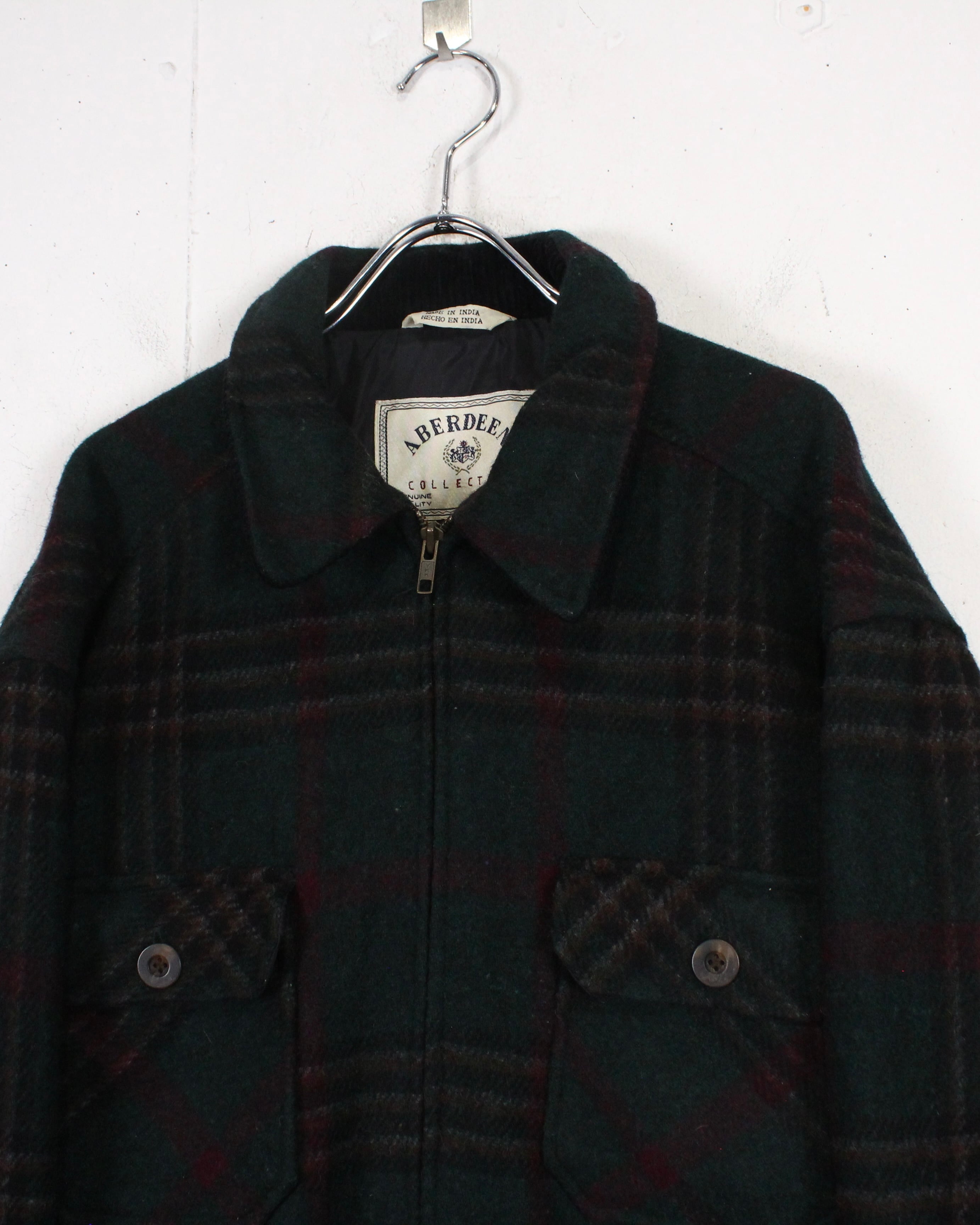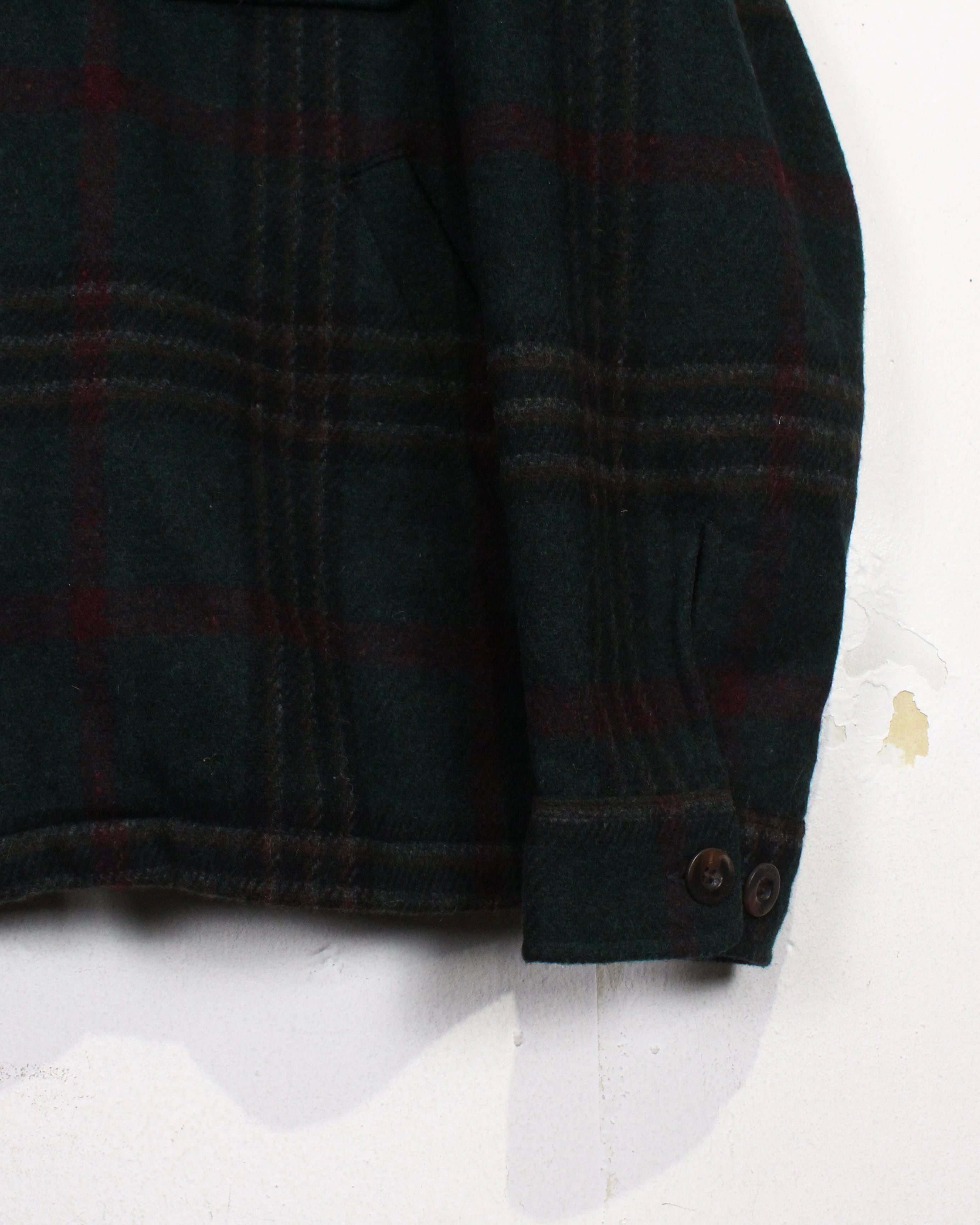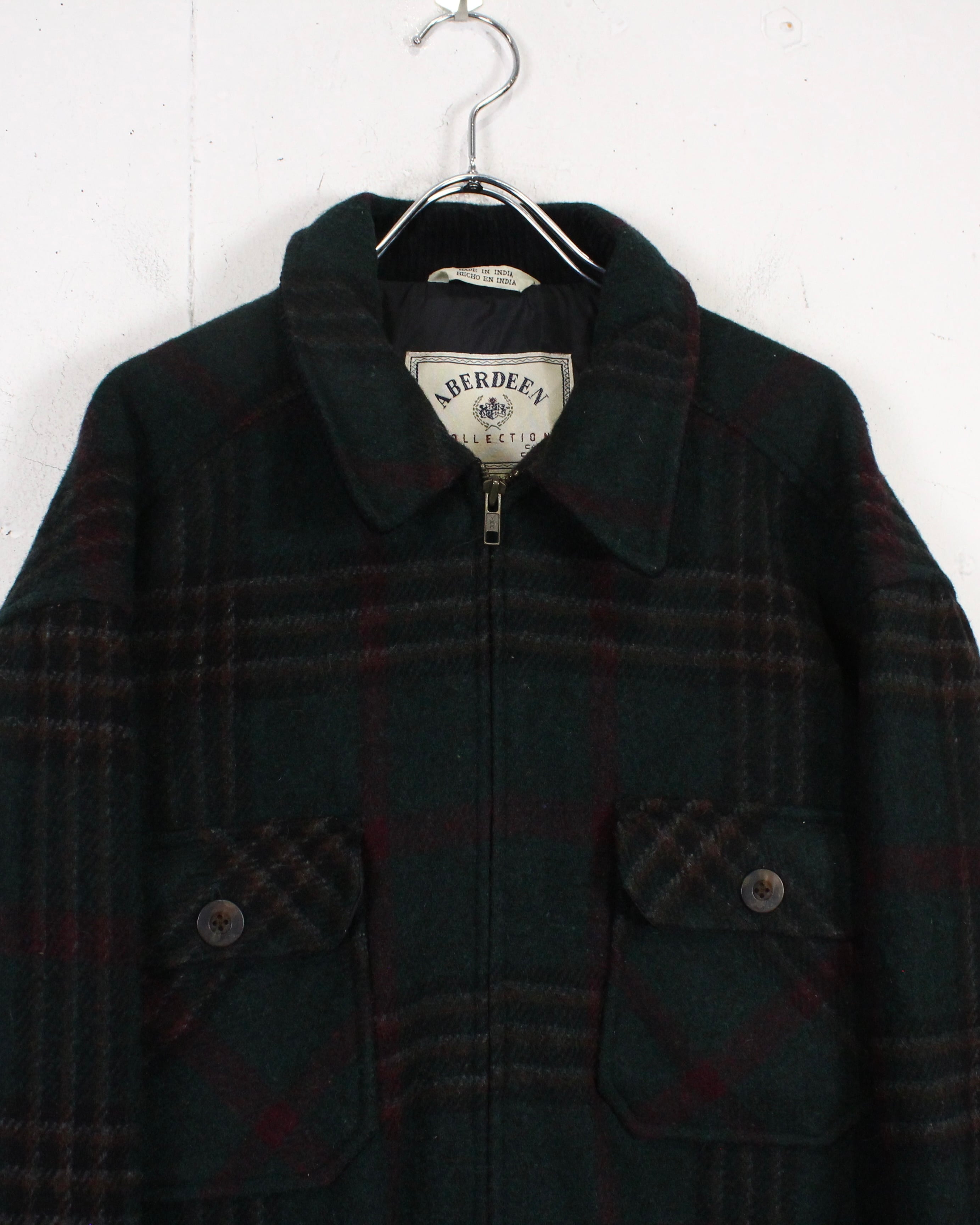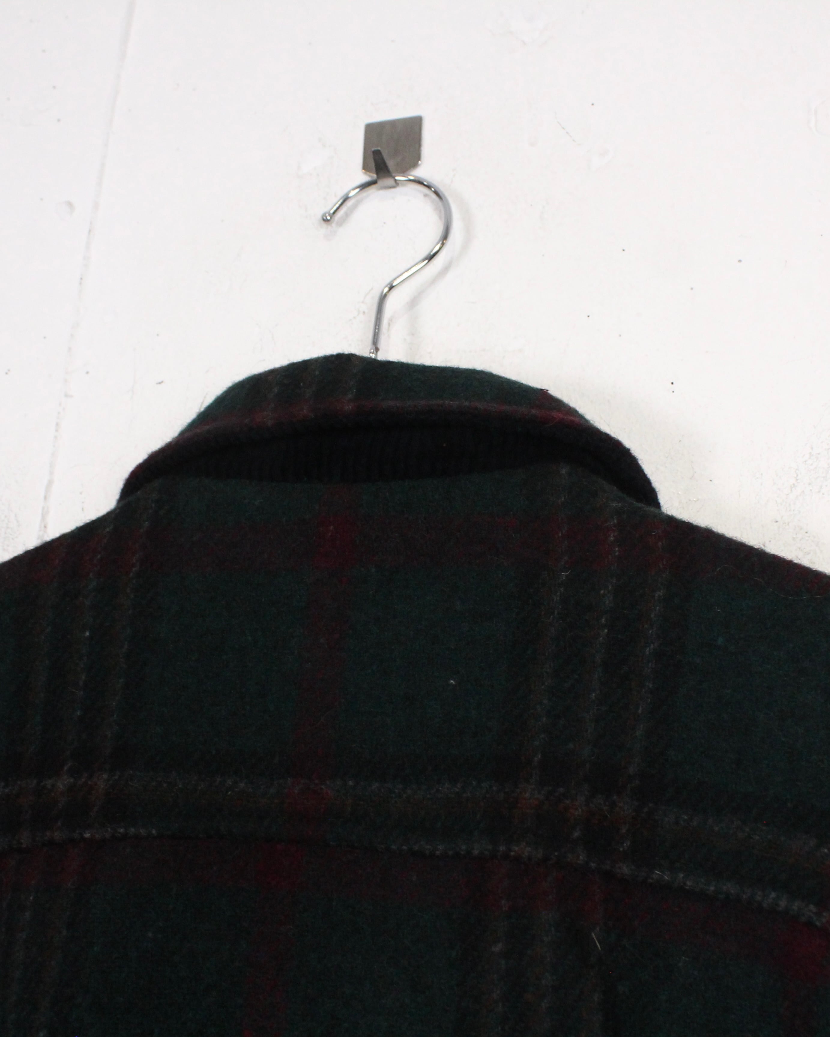 深みのあるグリーンのボディに、赤やベージュのチェックを載せたジップアップウールジャケット。