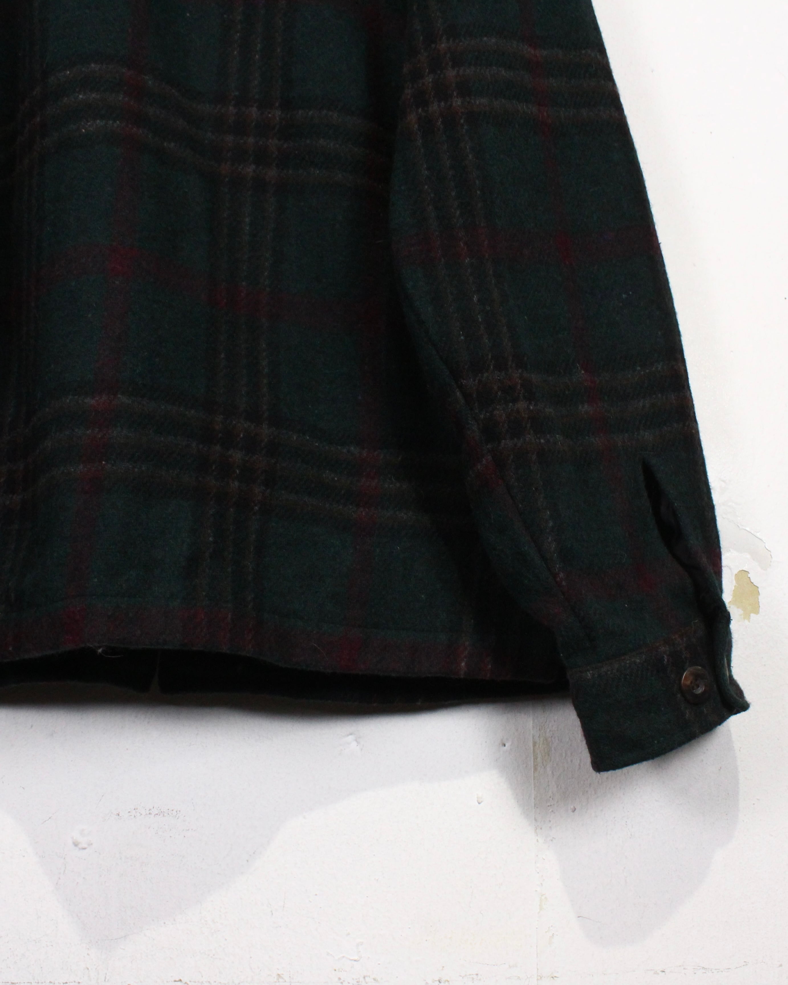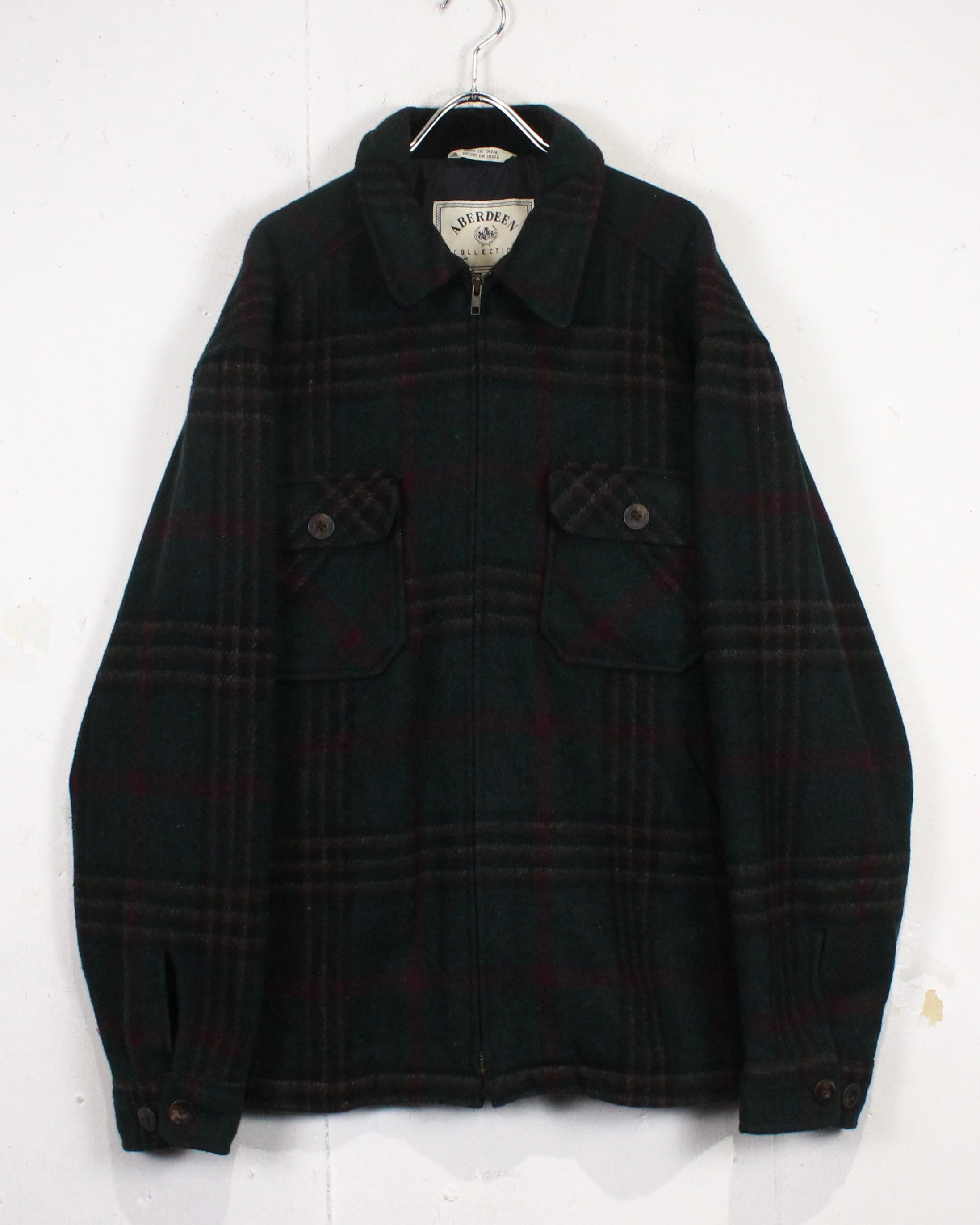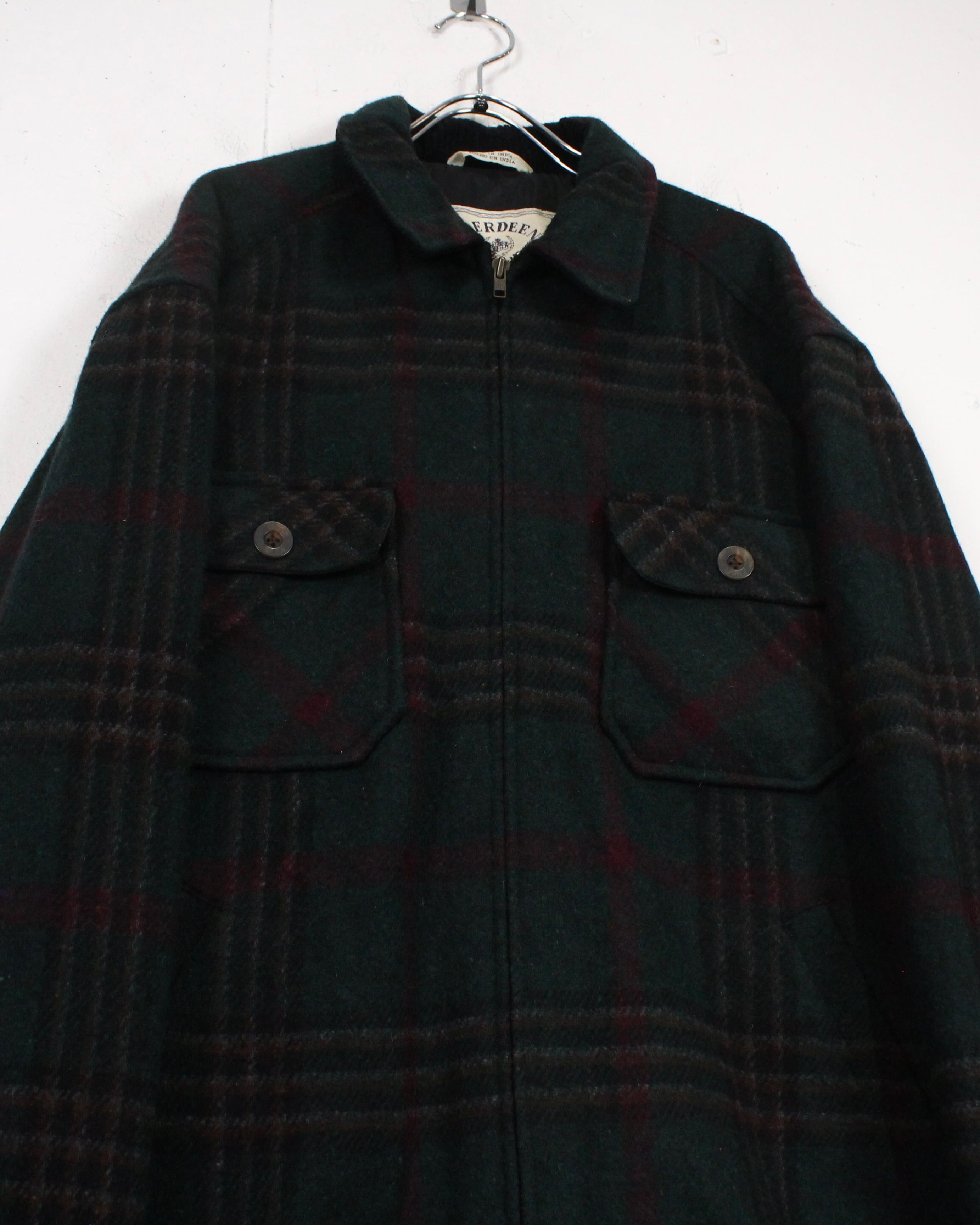 深みのあるグリーンのボディに、赤やベージュのチェックを載せたジップアップウールジャケット。