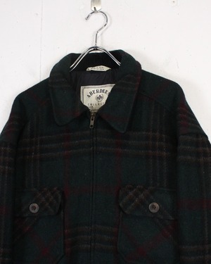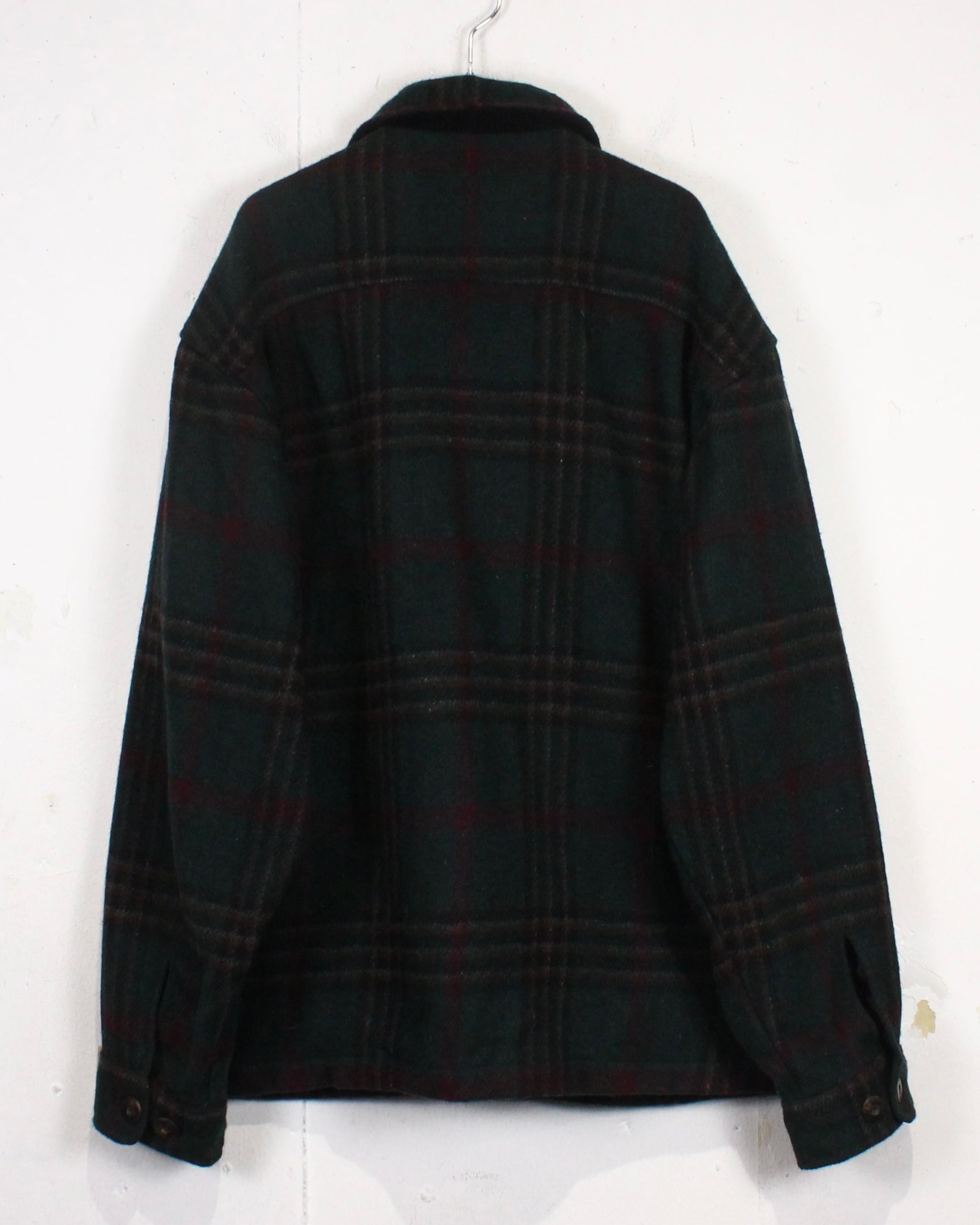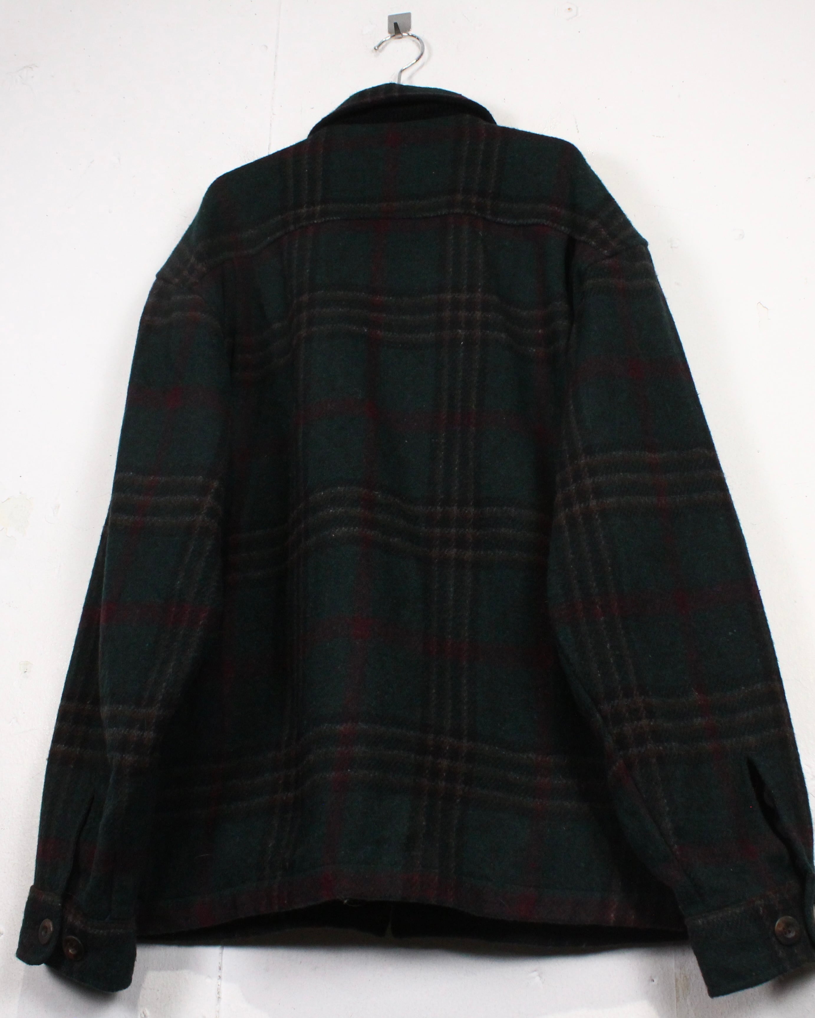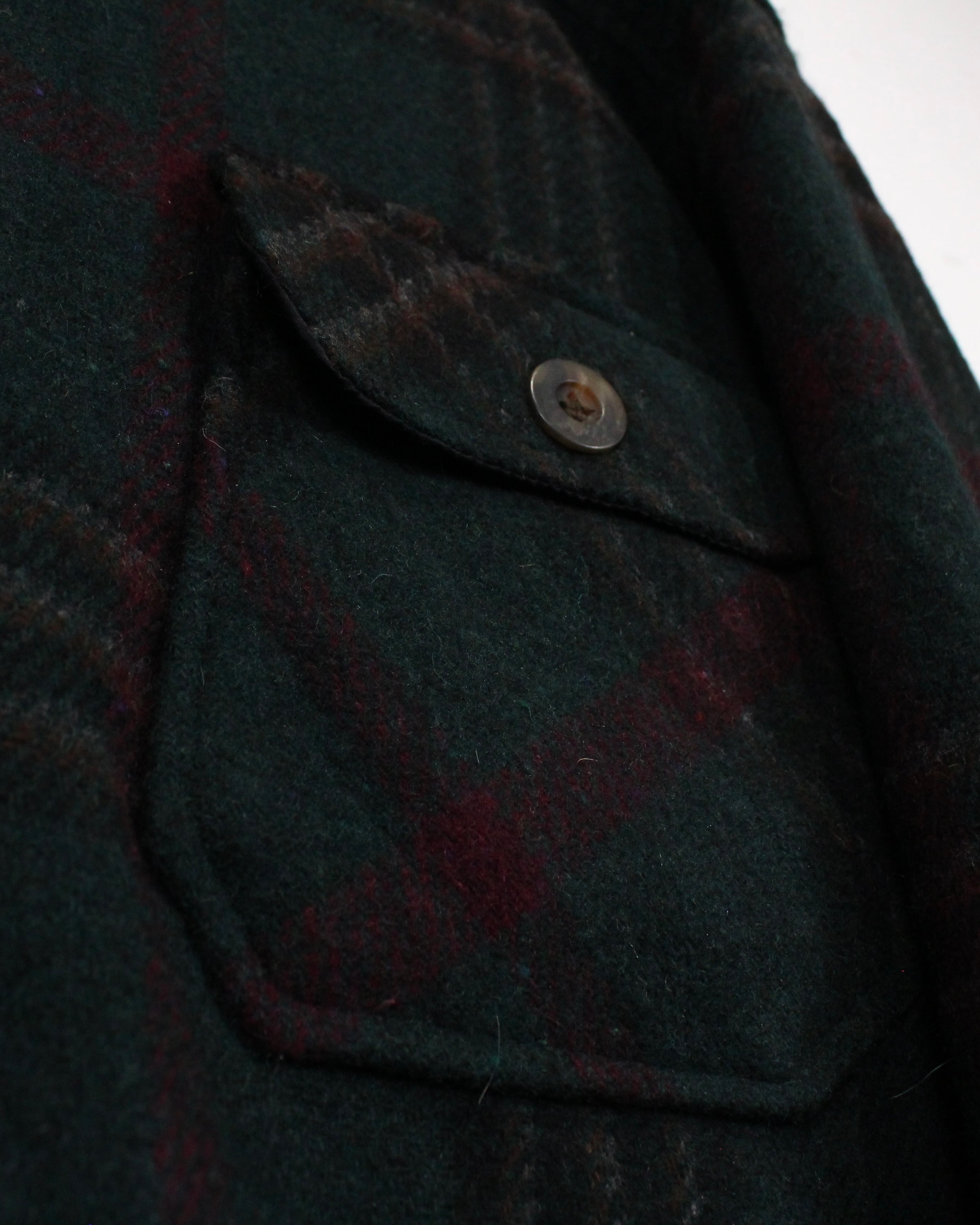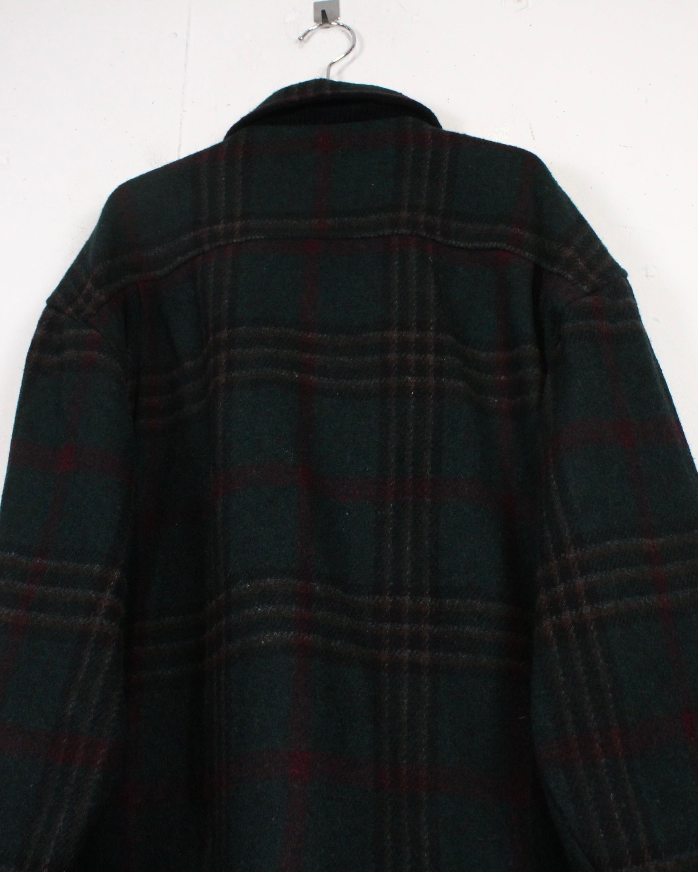 深みのあるグリーンのボディに、赤やベージュのチェックを載せたジップアップウールジャケット。