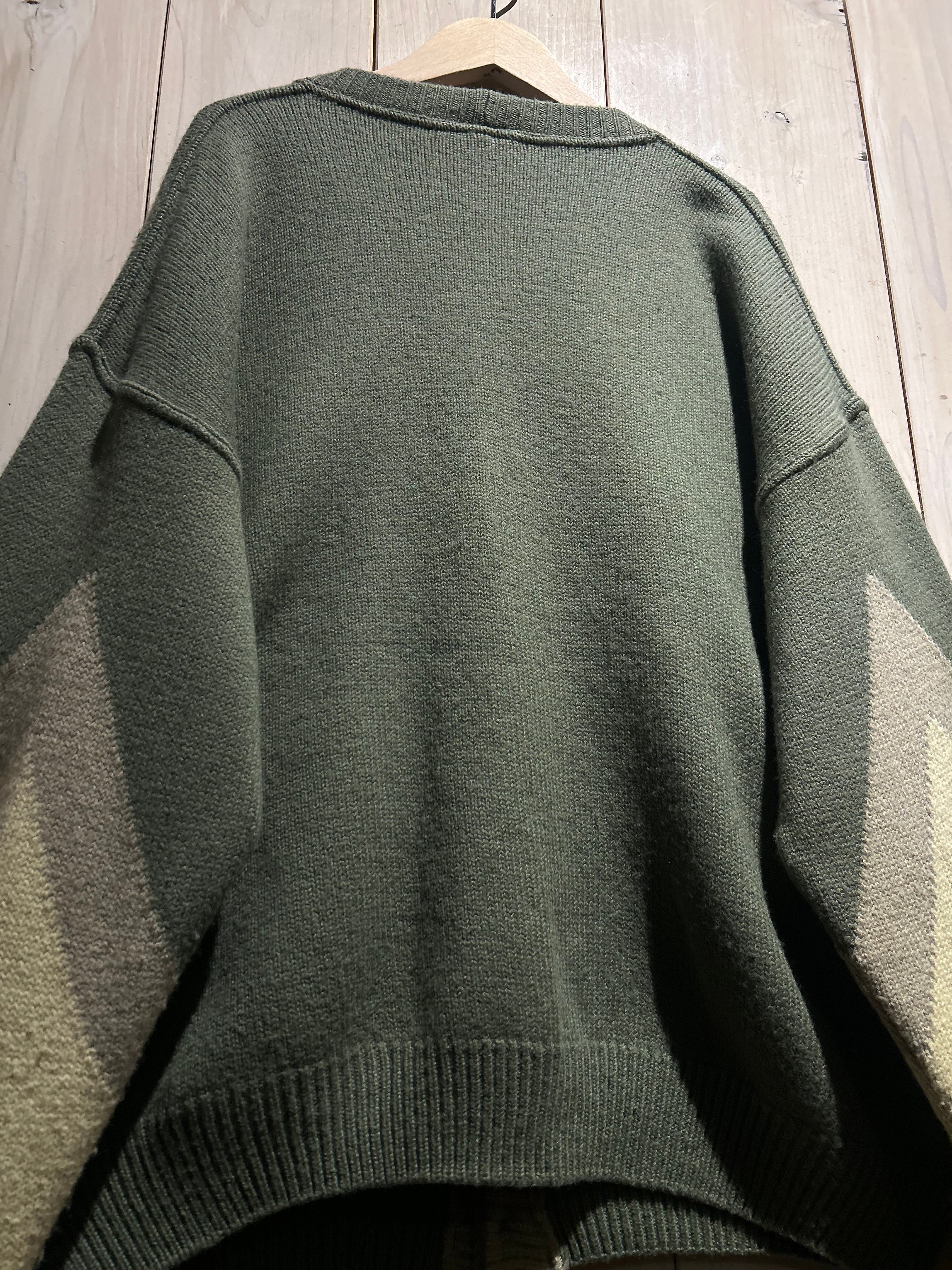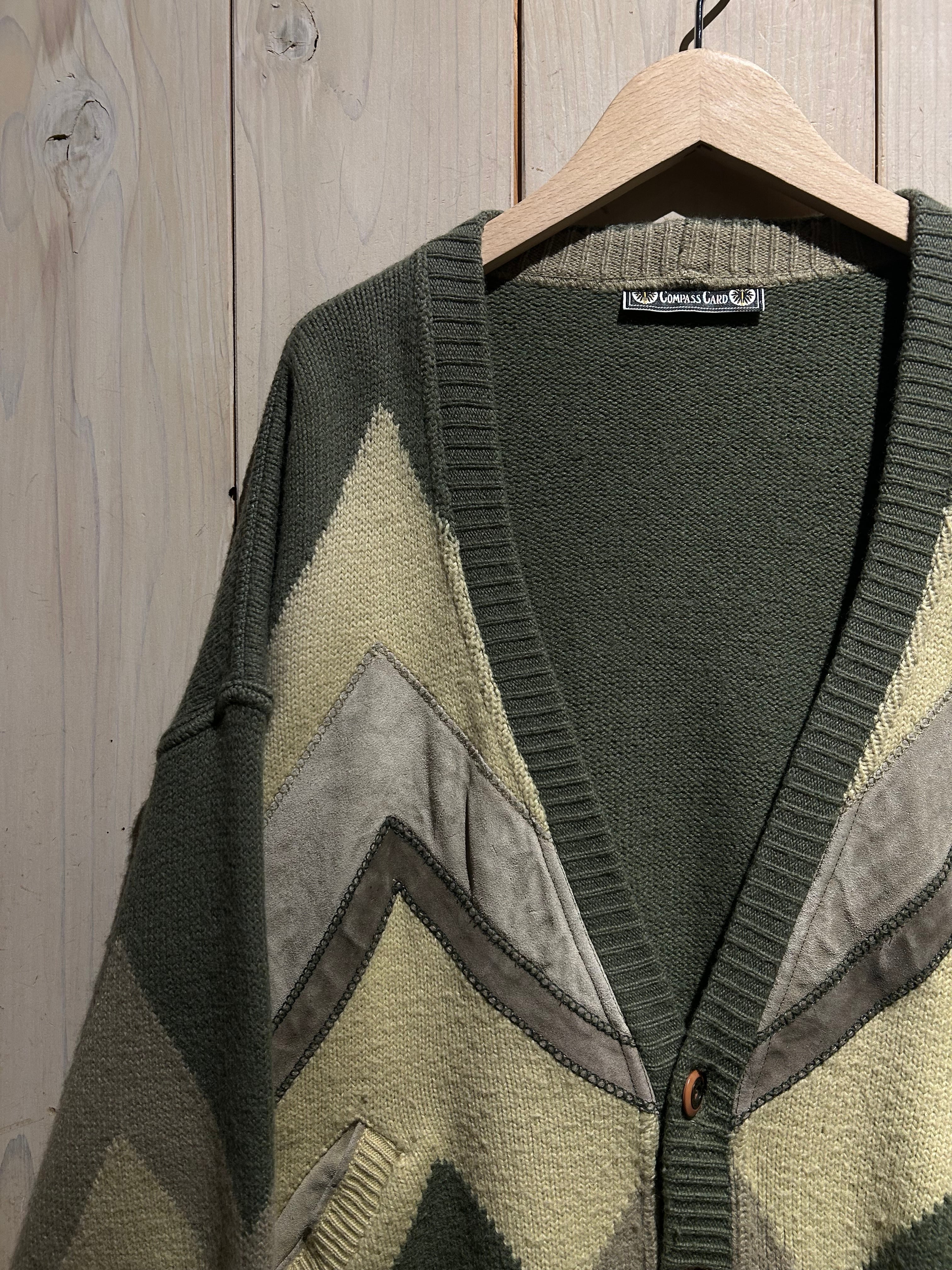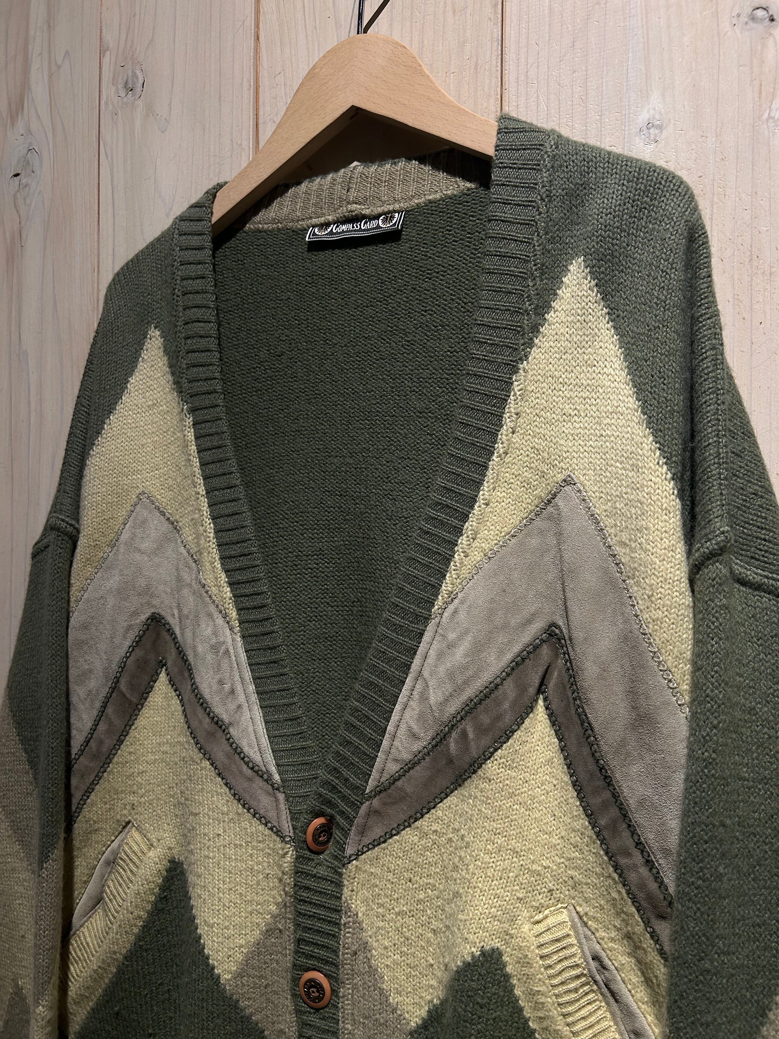 フロントに幾何学的なニットパターンを配し、それに沿うようスエードレザーを切り替えた、存在感抜群のカーディガン。