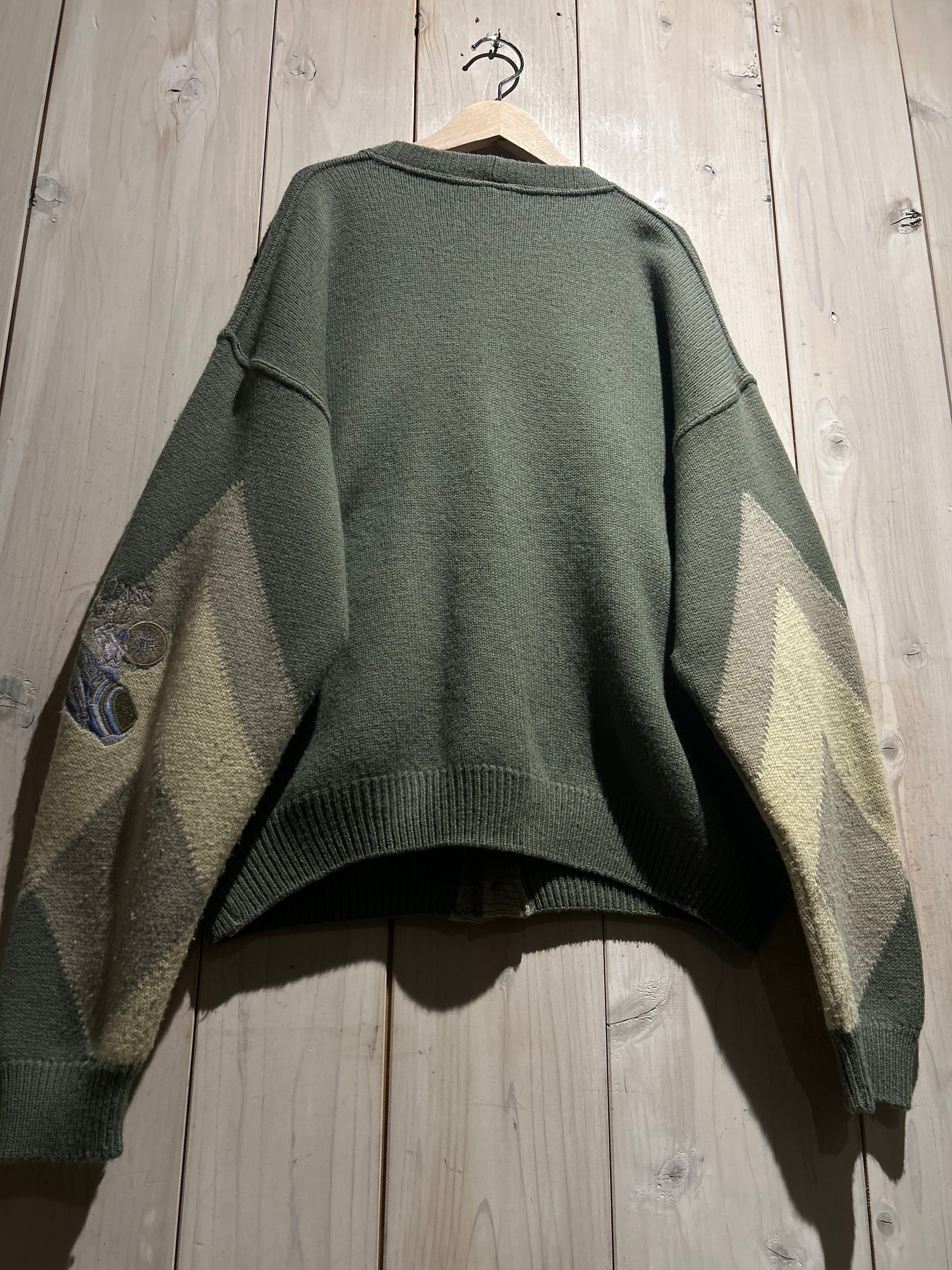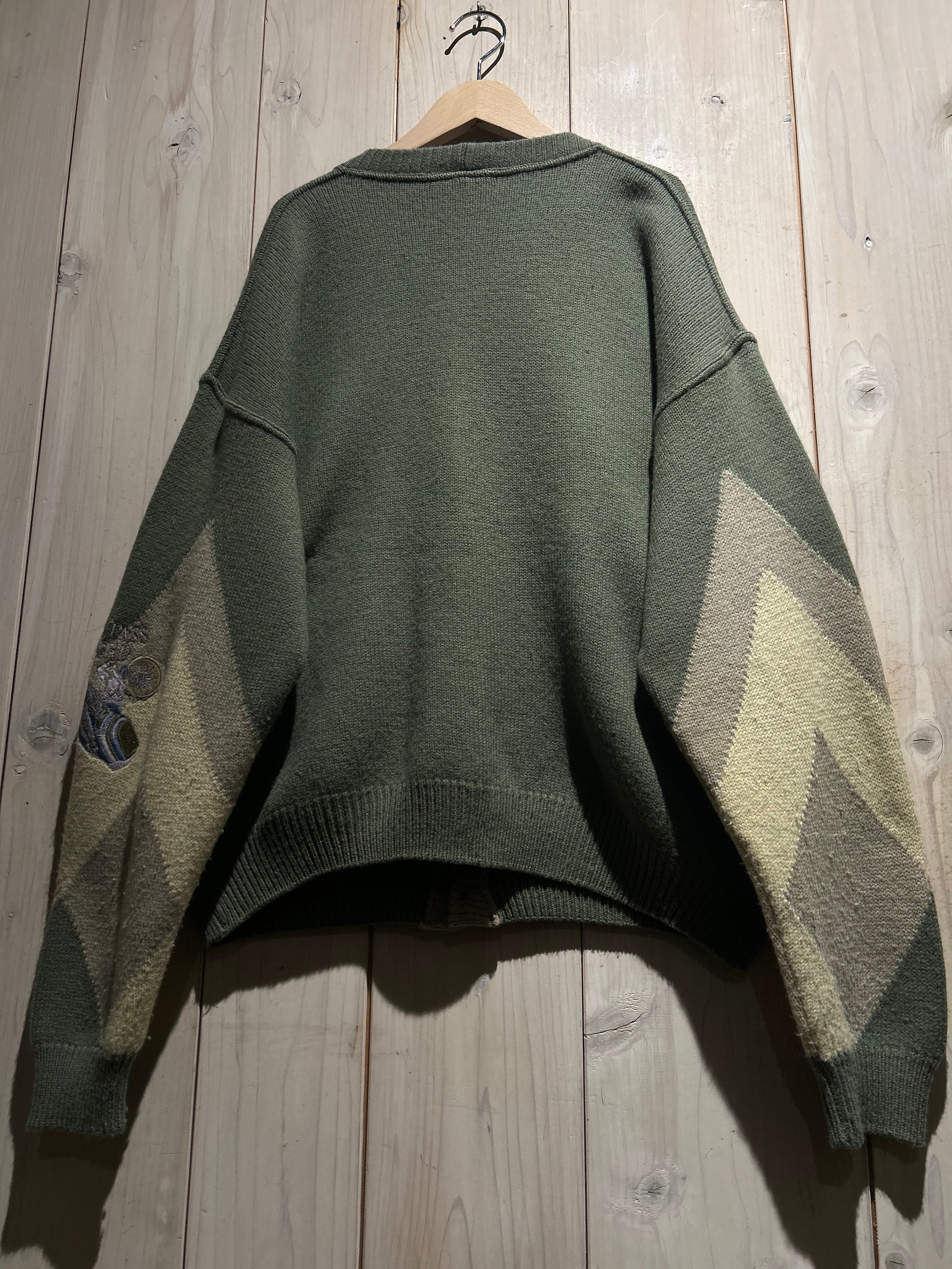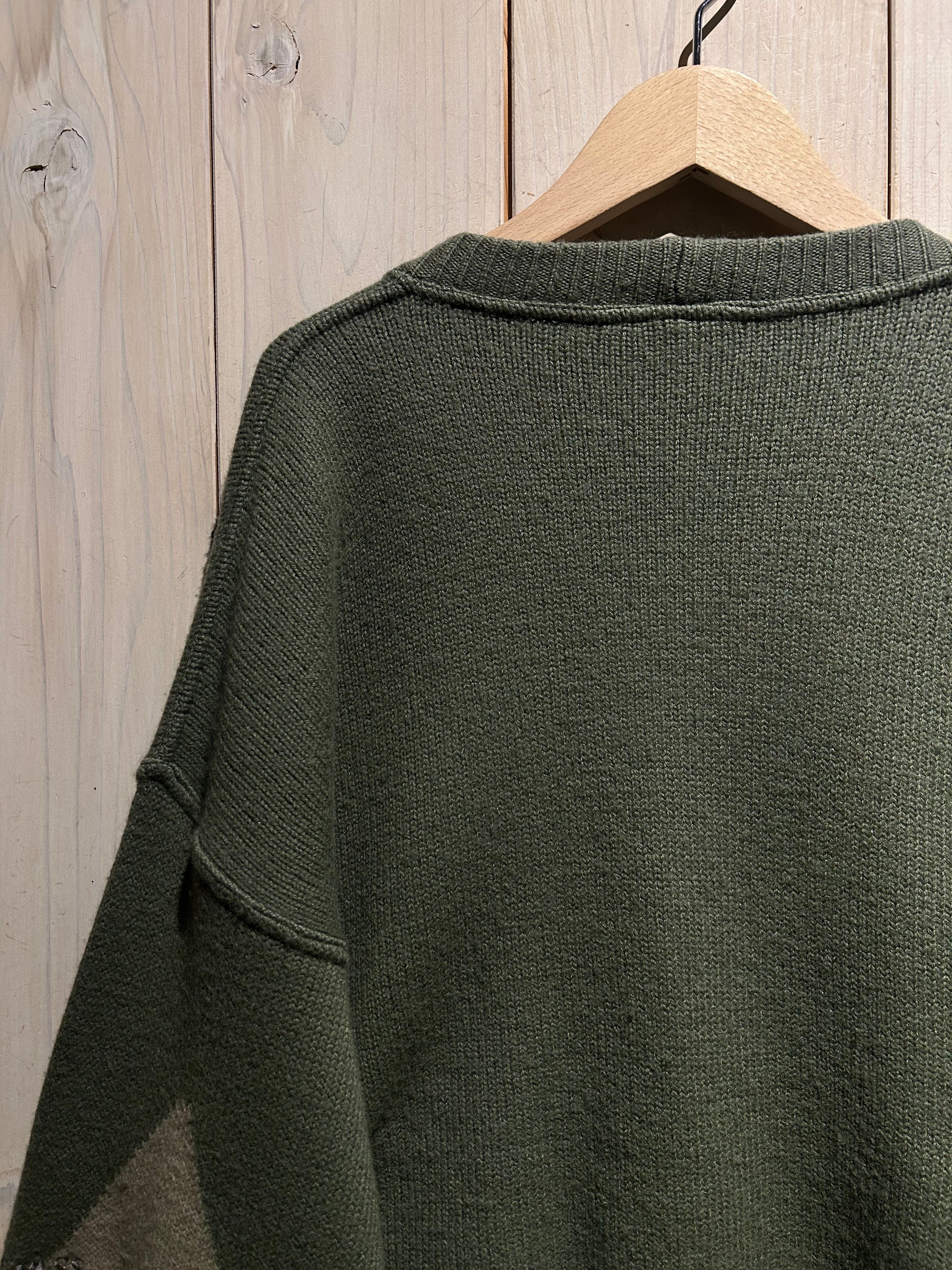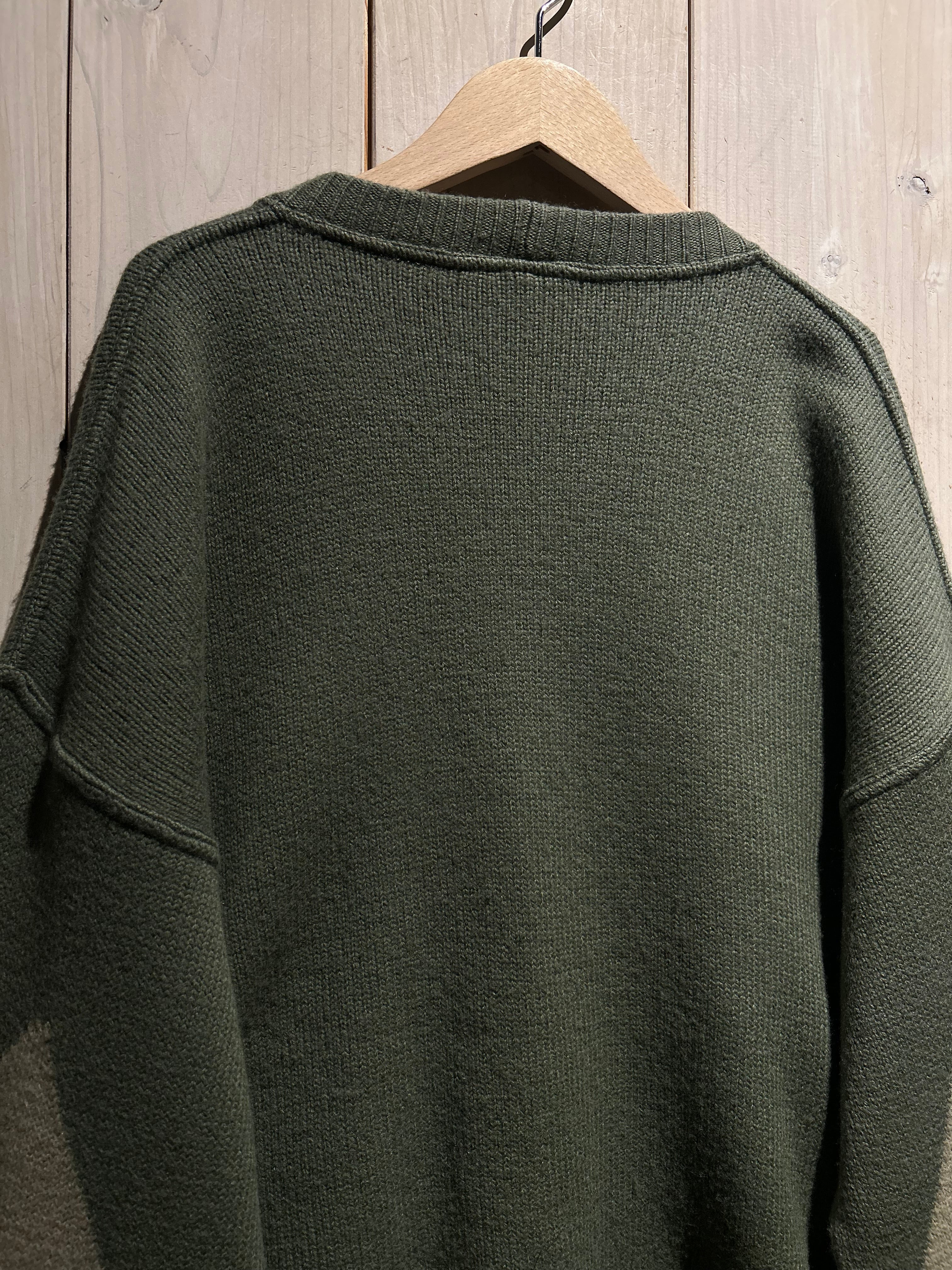 フロントに幾何学的なニットパターンを配し、それに沿うようスエードレザーを切り替えた、存在感抜群のカーディガン。