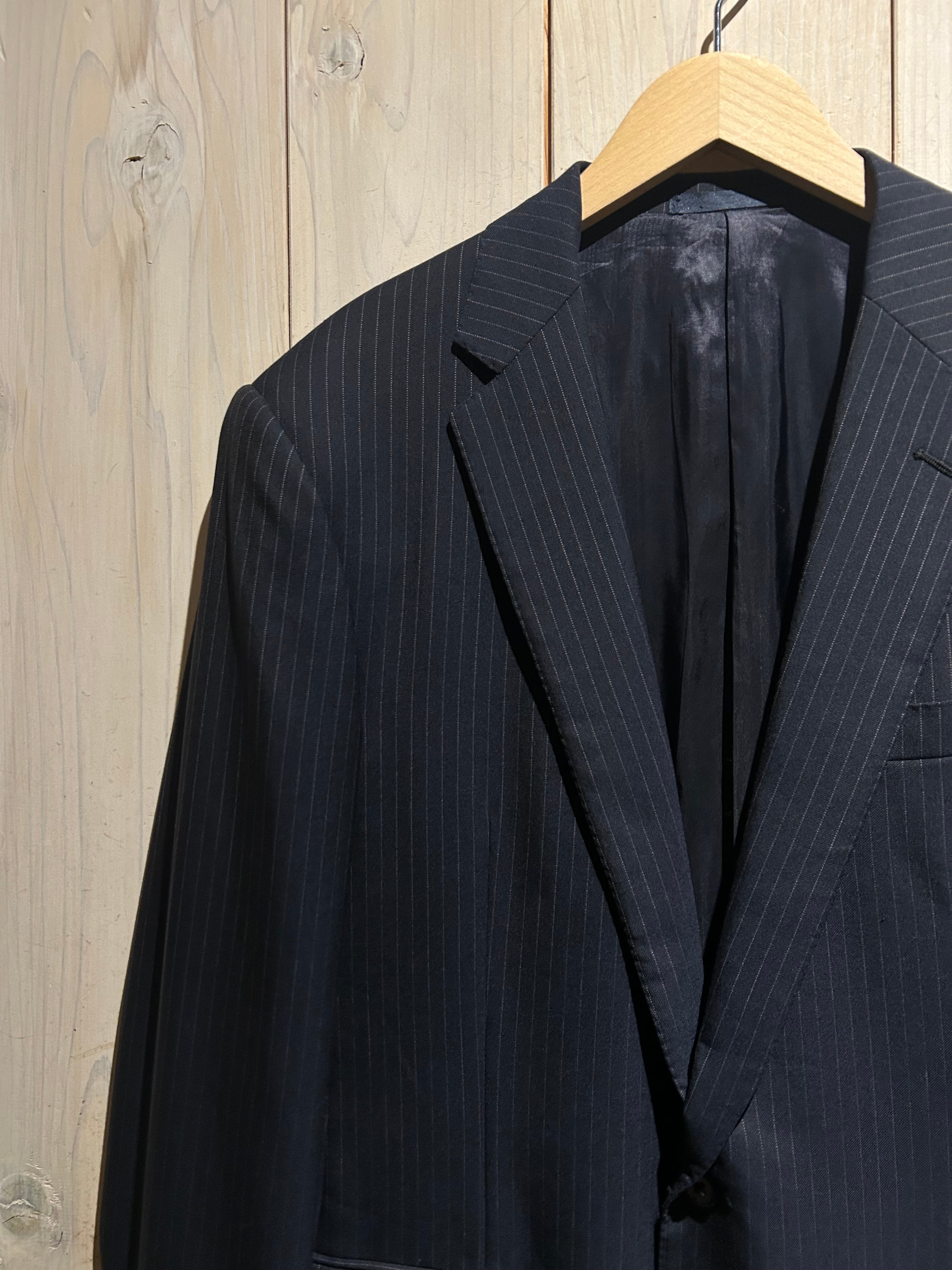 ネイビーベースに繊細なピンストライプを配した1着で、ボディは自然なライン、肩肘張らずに着られる一方、きちんと感も損なわない絶妙な仕上がりです。ラペルのバランスやフロントのフラップポケットなど、ミニマルながらもテーラリングの美しさが随所に宿ります。