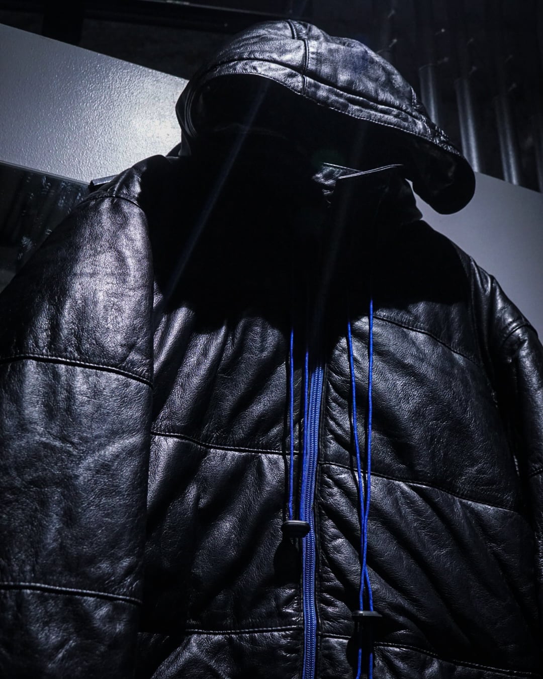 レザーのブラックに対して、鮮やかな青のカラーリング、取り外し可能なフードは裏地がシルバーになっており良いアクセントに◎