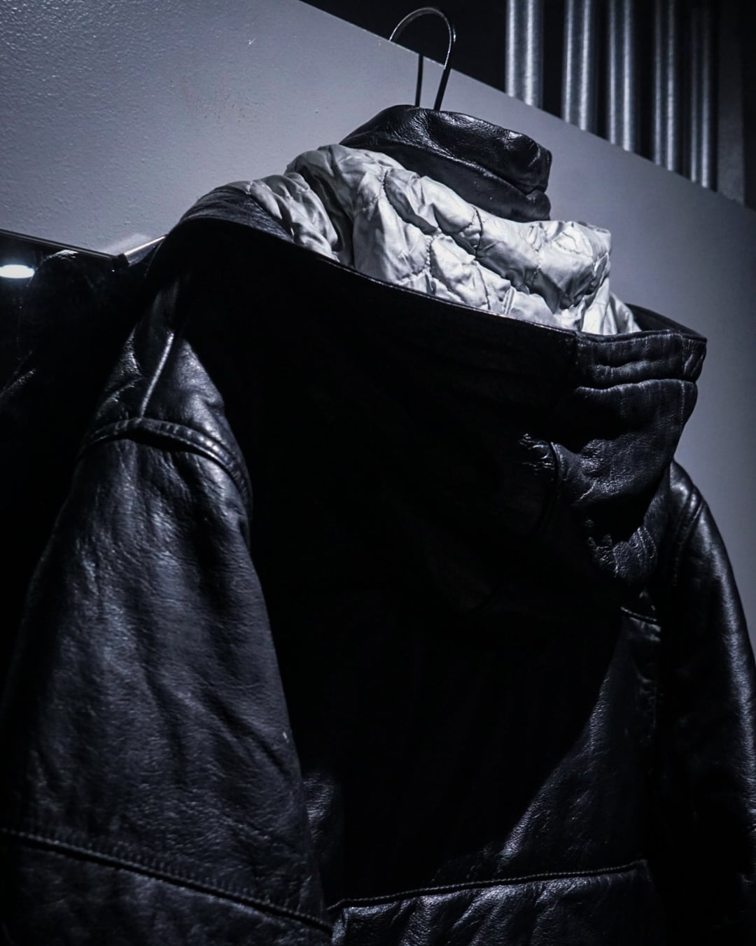 ダウンアウターのフォルムをベースにしながらレザーならではの艶とシボ感が加わることで、無骨さとモード感が合わさった1着に仕上がっています。