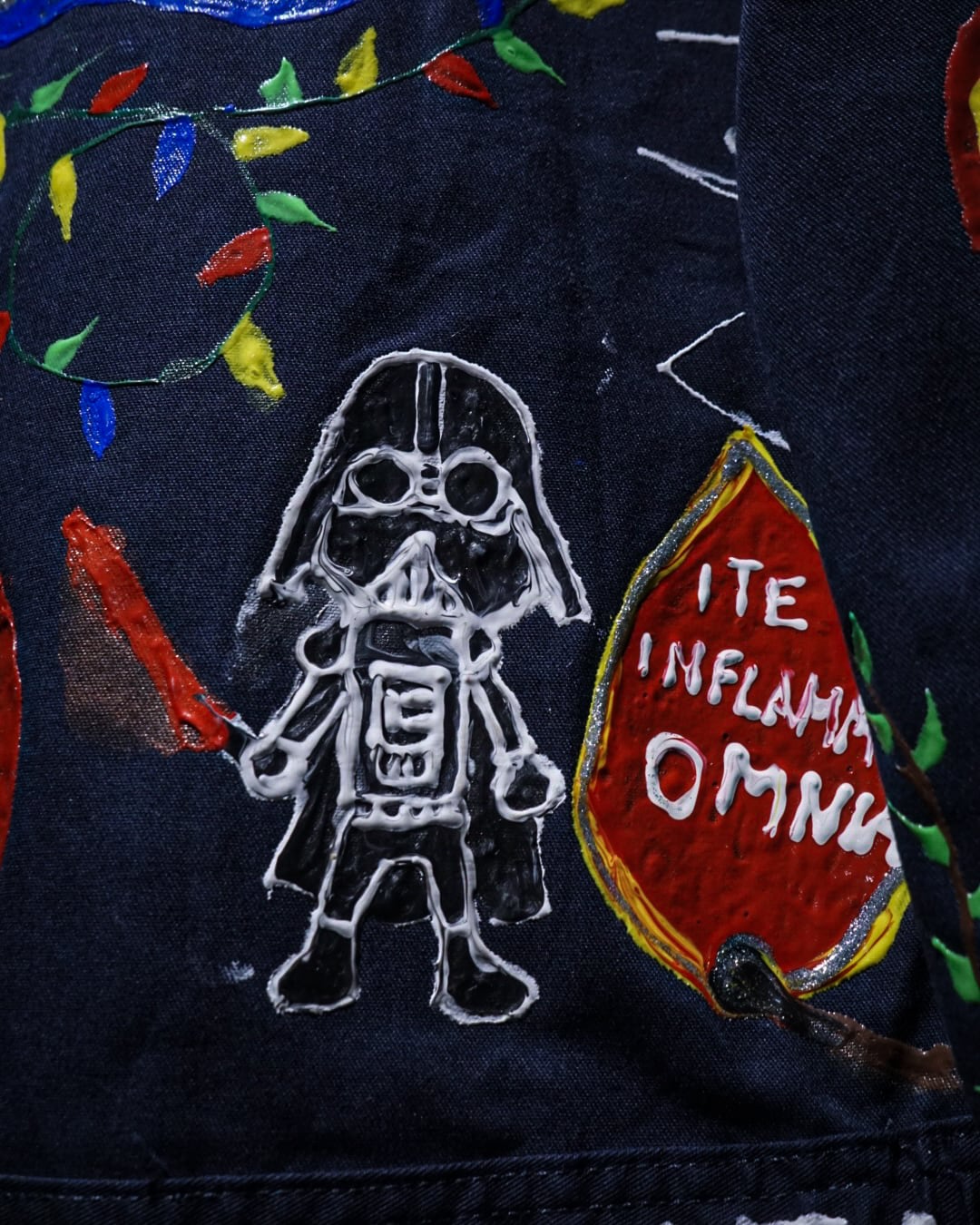 ネイビーボディのキャンバス地全体に、キャラクターやシンボル、メッセージを縦横無尽に描き込んだデザイン。フロントからバック、脚部に至るまで余白を残さずペイントが走り、既製品では決して到達し得ない情報量と熱量を放っています。