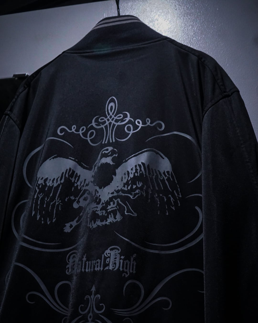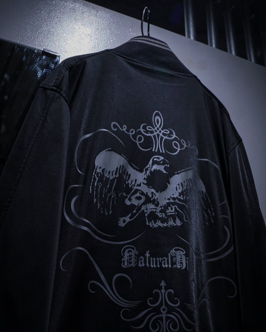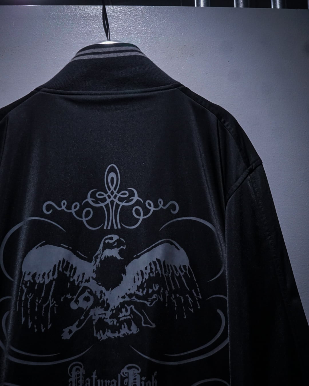 背面にはブランドの世界観を象徴するグラフィックをプリントで大胆に配置。イーグルモチーフとゴシック調のデザインが組み合わさり、レイヴカルチャー特有の退廃的かつ高揚感のあるムードを強く演出。