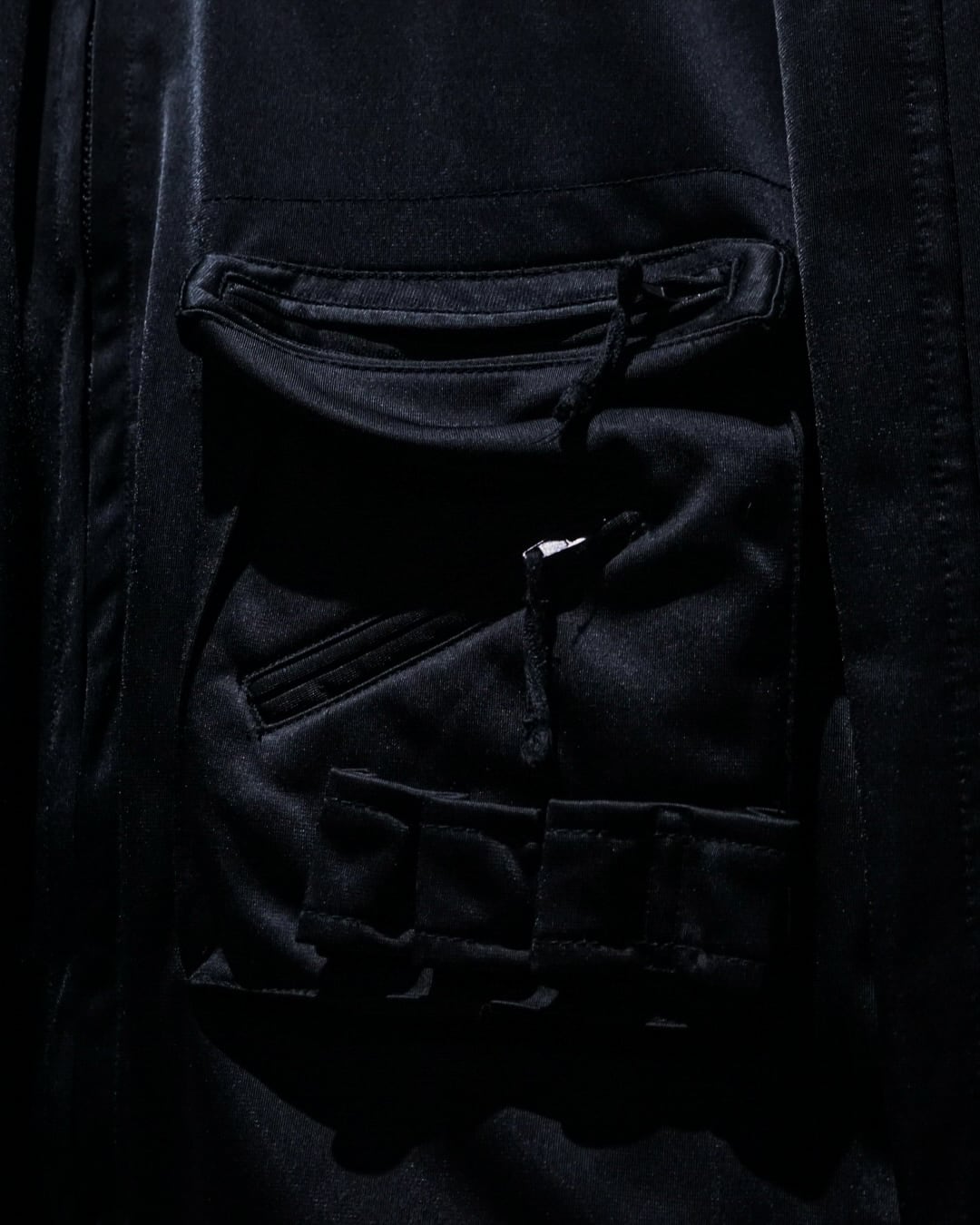 ボディはブラックを基調としたジャージー生地を採用し、随所に配された立体的なポケットワークが特徴的。ミリタリーやテックウェアの要素を感じさせる実用的なディテールが盛り込まれ、視覚的にも機能的にも完成度の高い仕上がりとなっています。