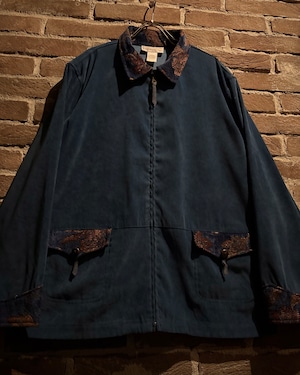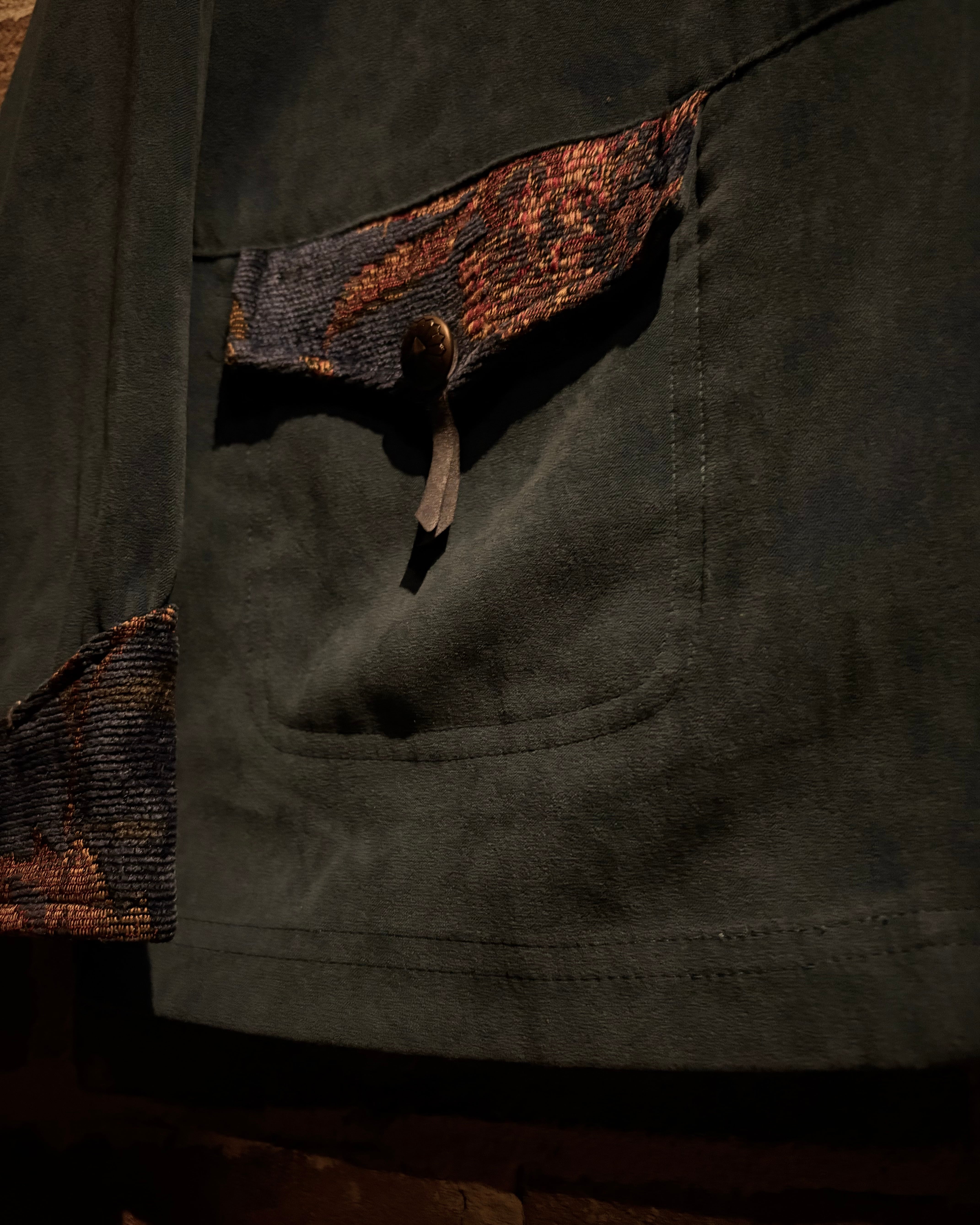 最大の特徴は、襟元やカフス、フラップ、背面に大胆に切り替えられたゴブラン織のファブリック。花柄モチーフの重厚なテキスタイルがアクセントとなり、シンプルなボディに強い個性をプラス。背面の切り替えにはコンチョボタンが施され、よりレトロな雰囲気に。
