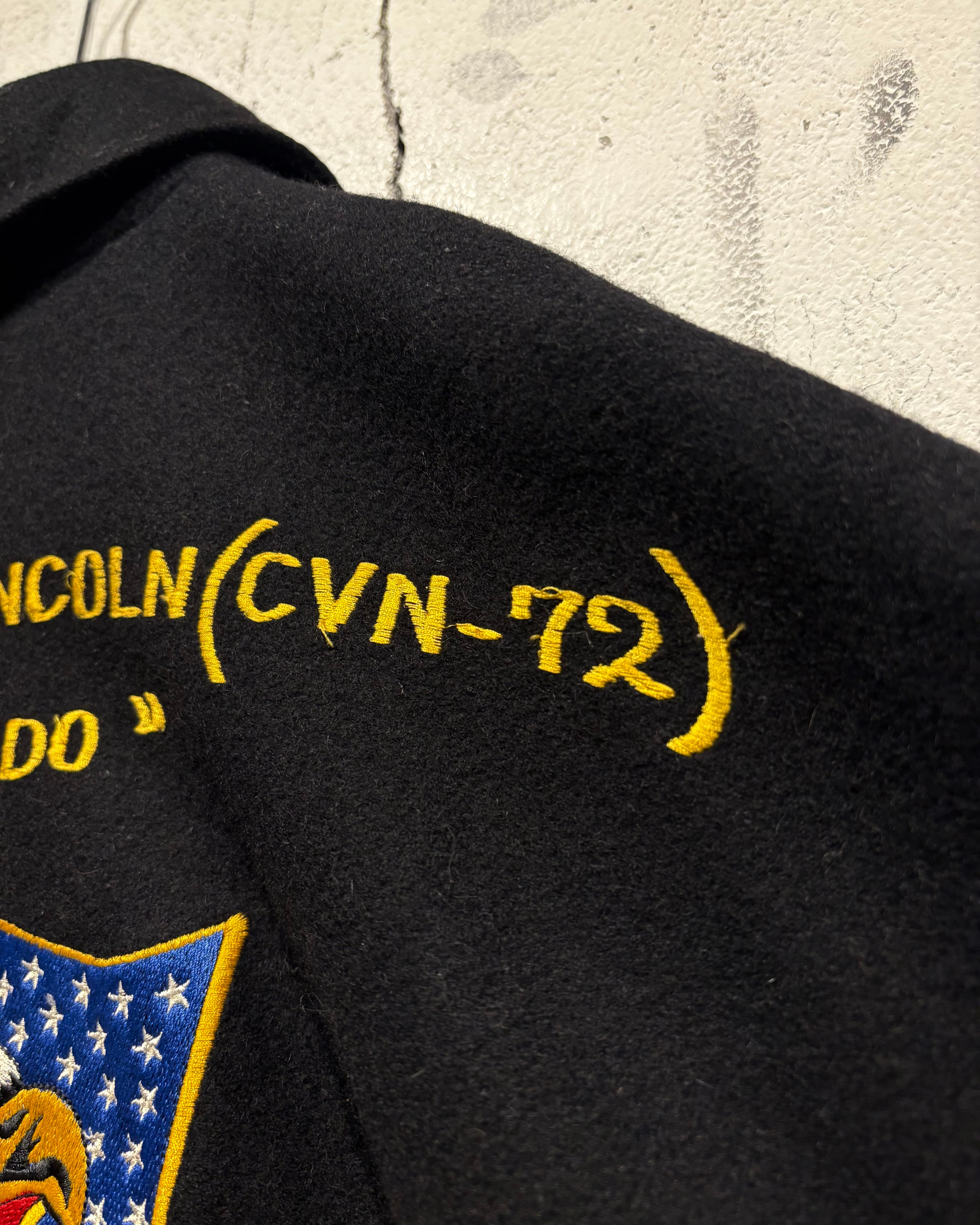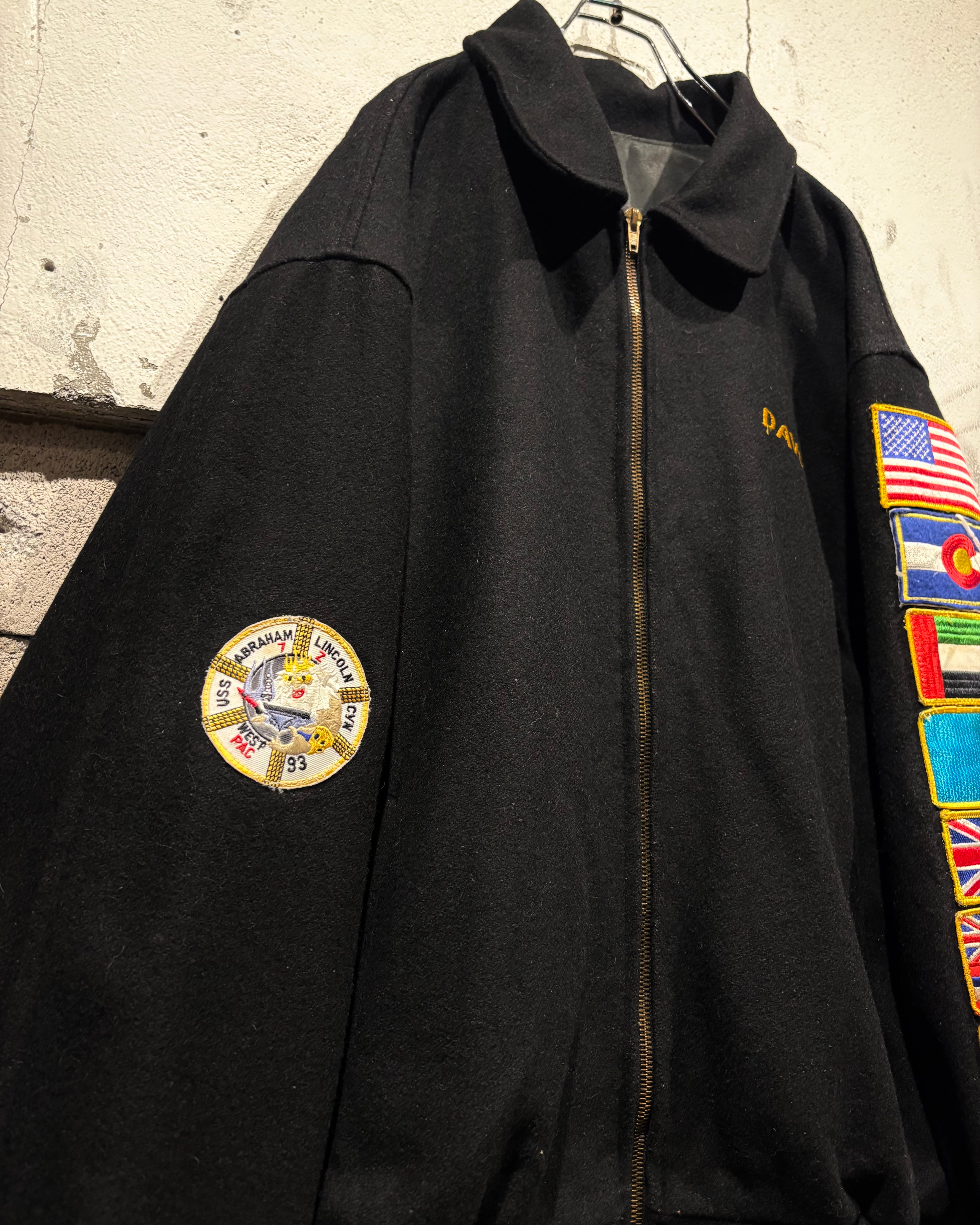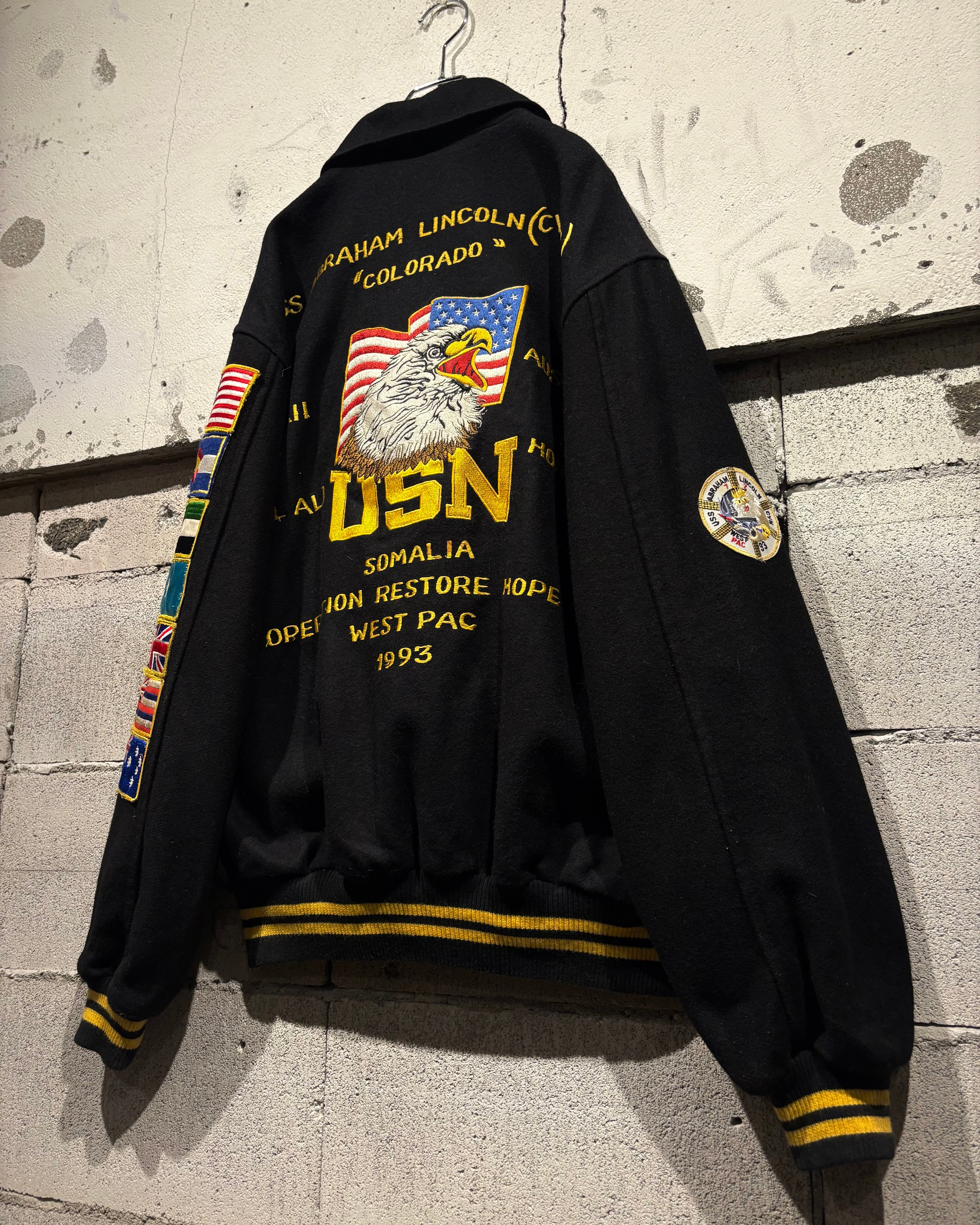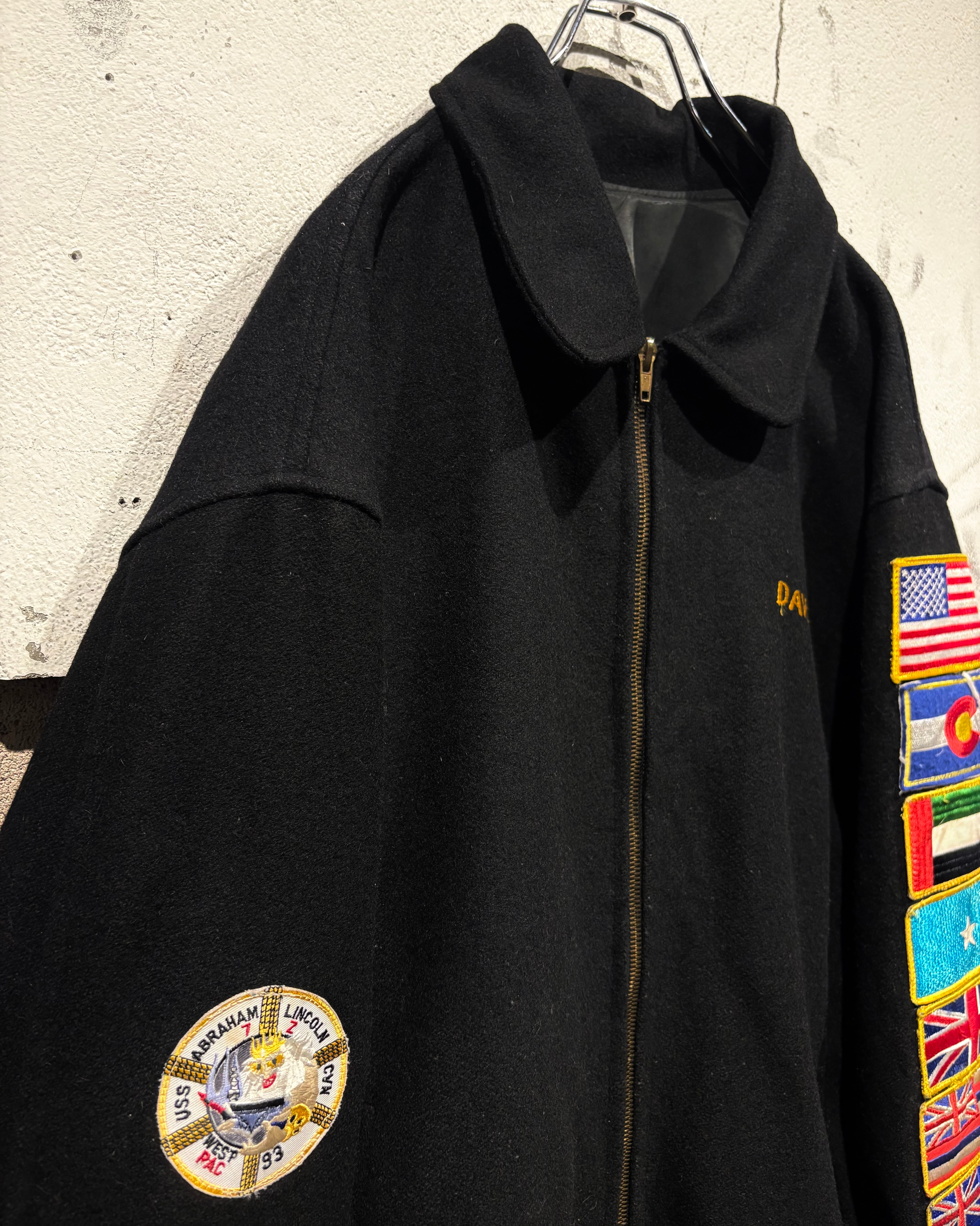 ブラックボディをベースに、フロントは比較的抑えた表情でまとめつつ、最大の見どころは袖からバックにかけて贅沢に施された刺繍。バックにはアメリカ国旗を背にしたイーグルモチーフとUSNのロゴ、艦名や作戦名、年代が丁寧に刺繍で表現されています。袖の国旗ワッペンも◎