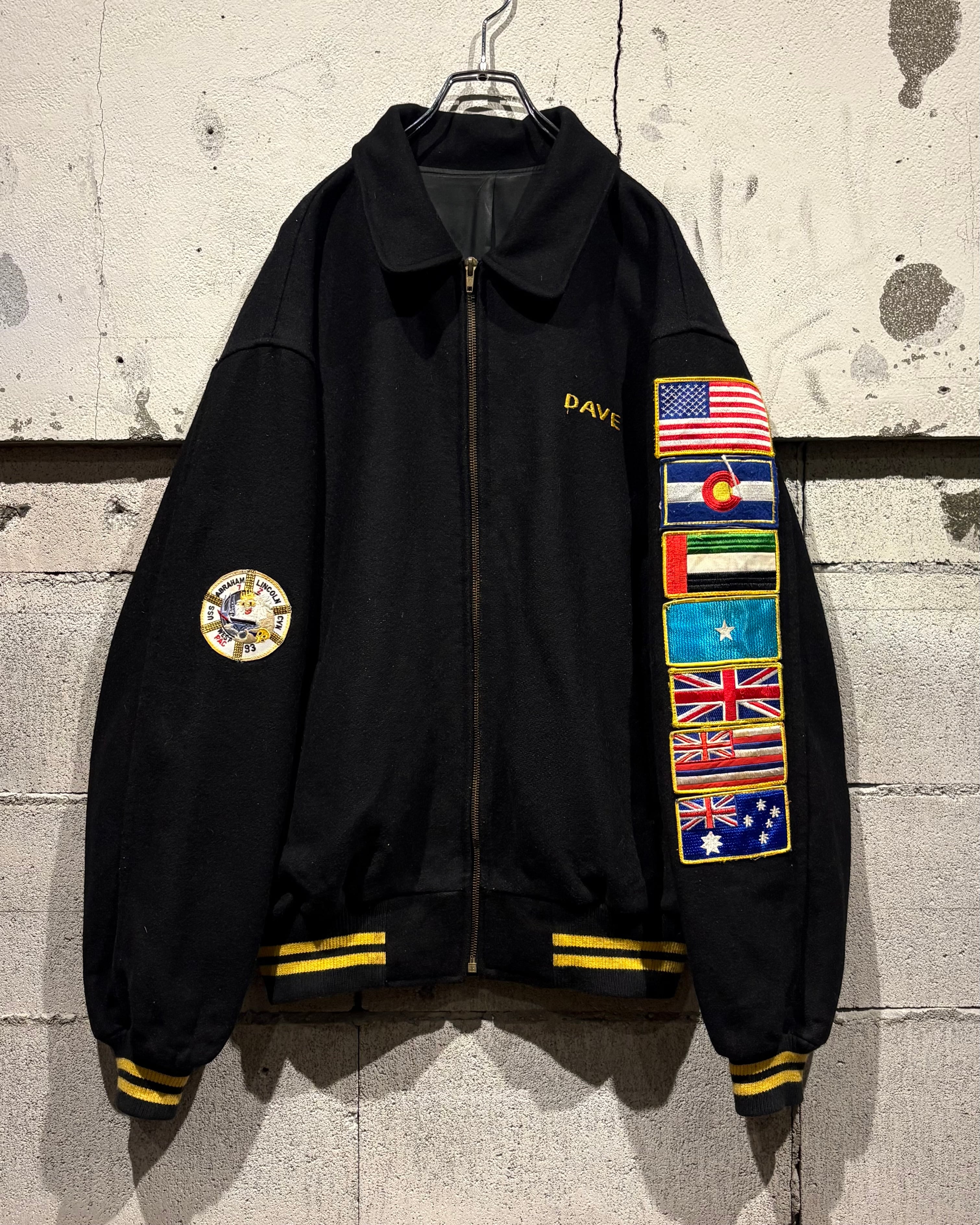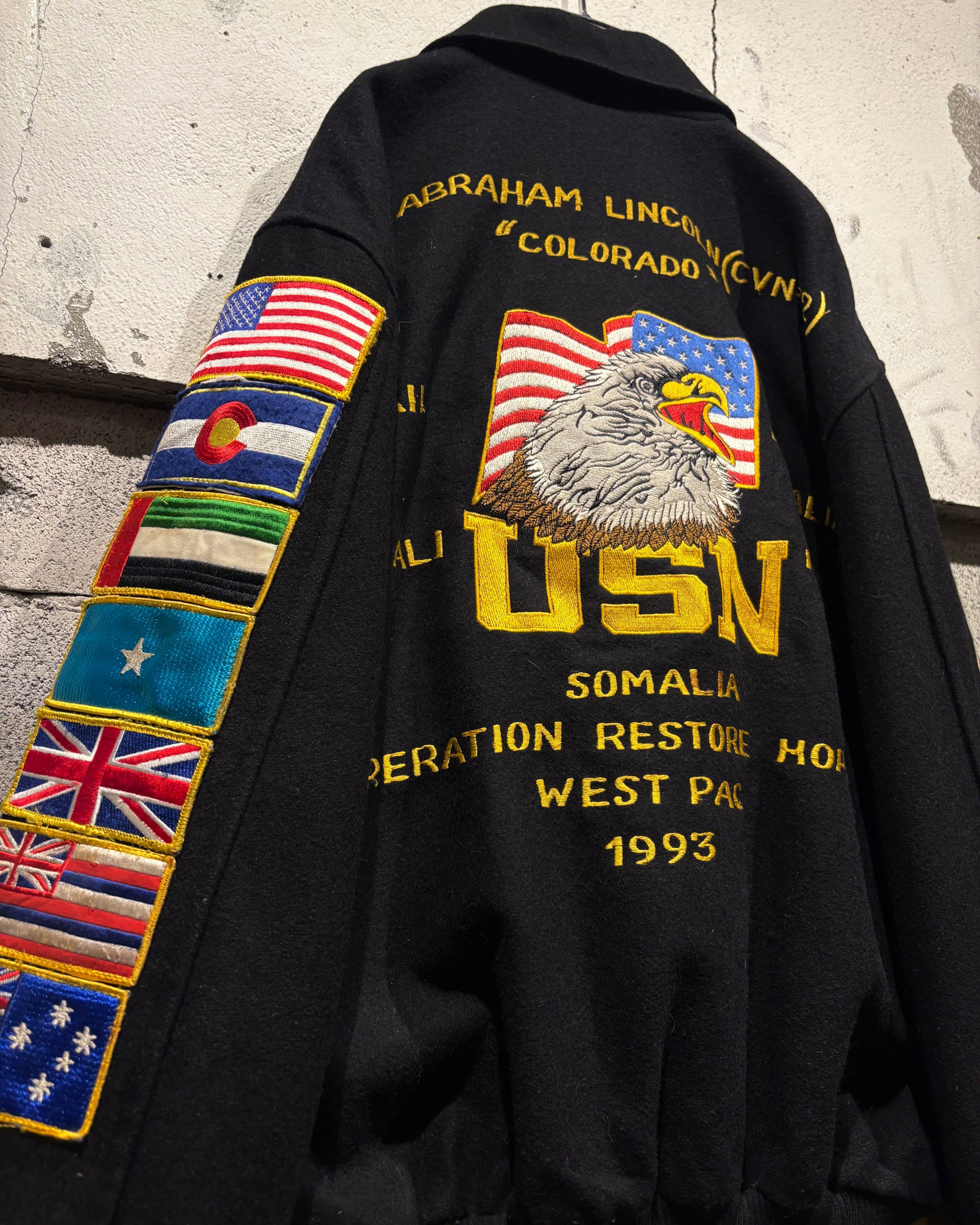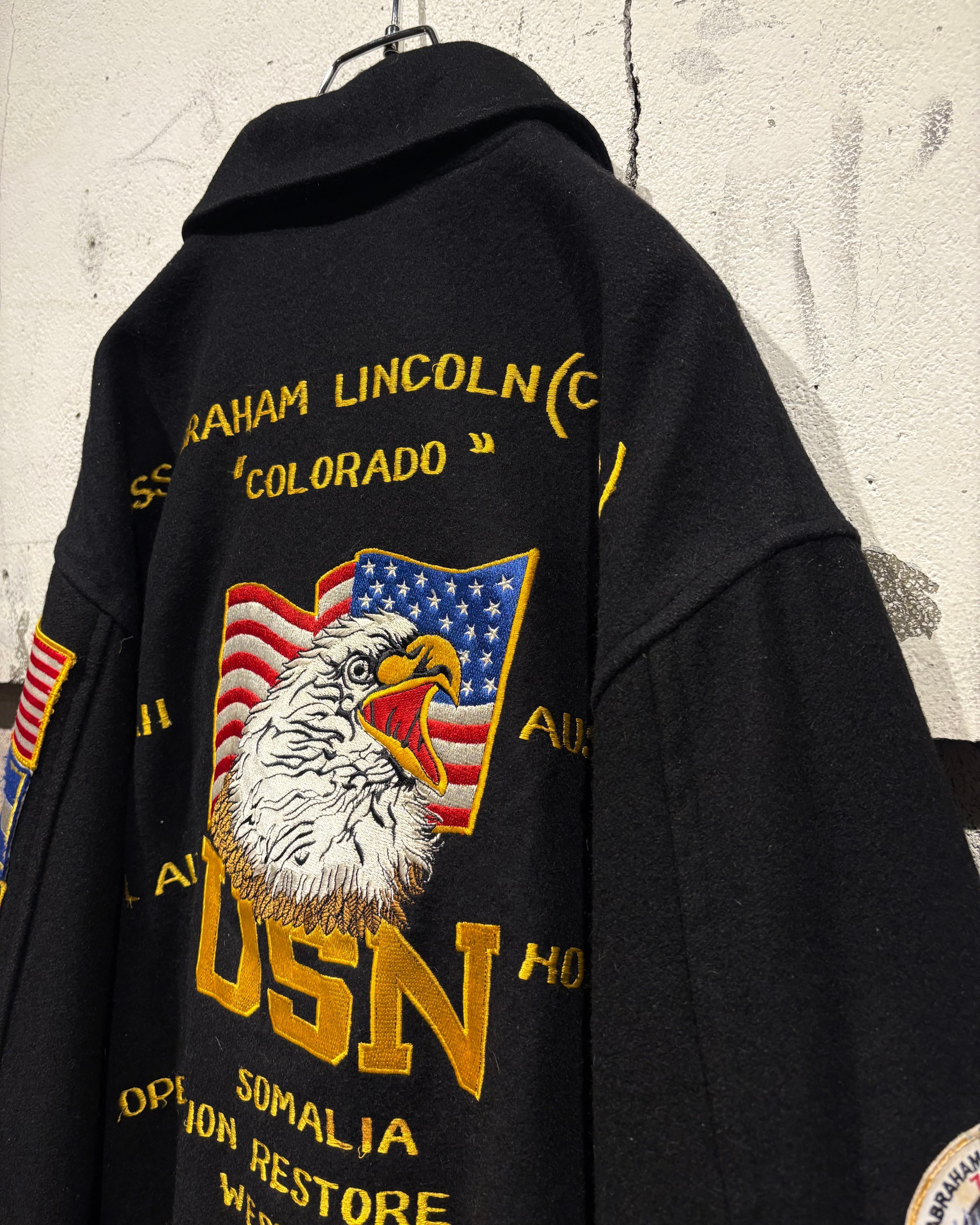 ブラックボディをベースに、フロントは比較的抑えた表情でまとめつつ、最大の見どころは袖からバックにかけて贅沢に施された刺繍。バックにはアメリカ国旗を背にしたイーグルモチーフとUSNのロゴ、艦名や作戦名、年代が丁寧に刺繍で表現されています。袖の国旗ワッペンも◎