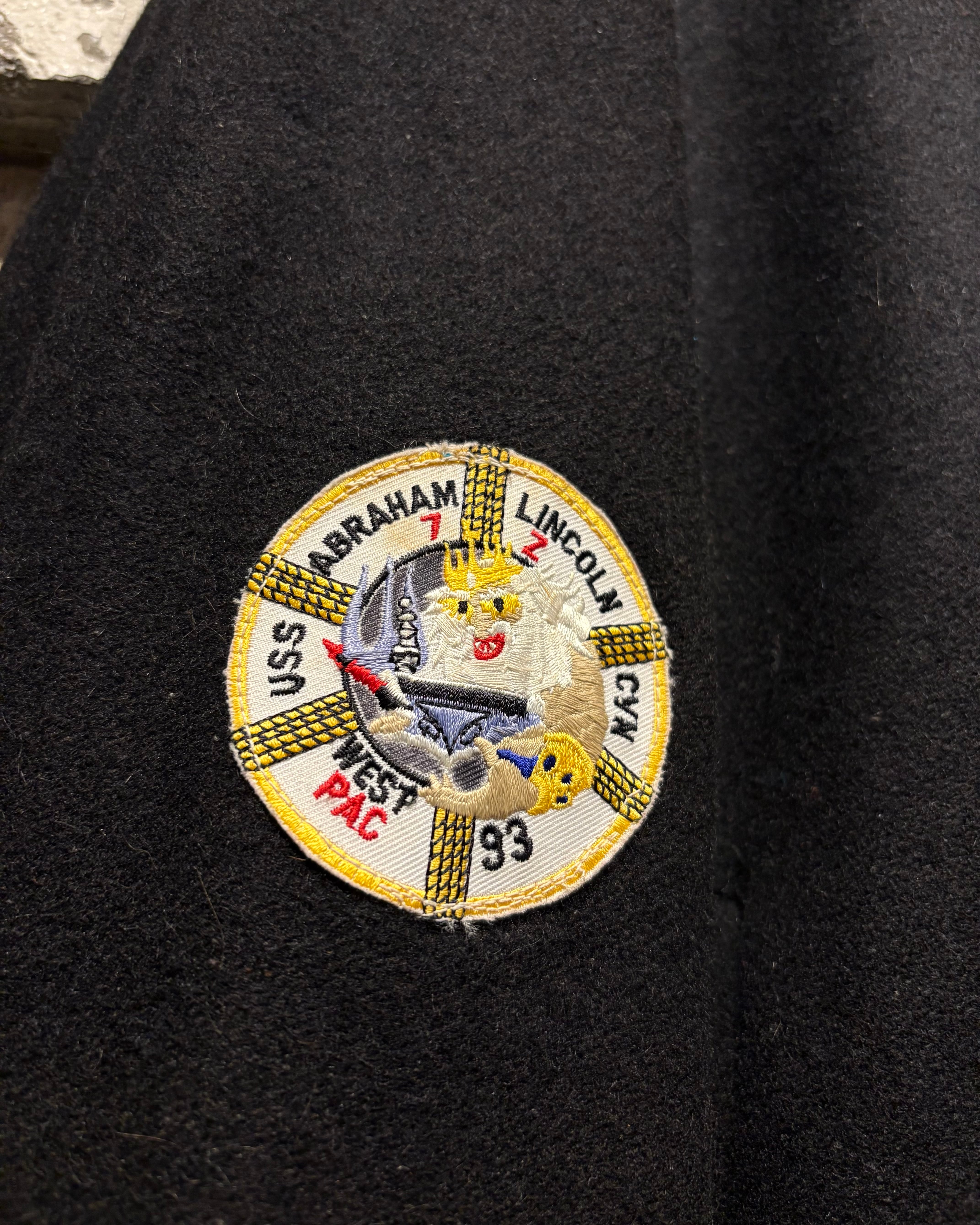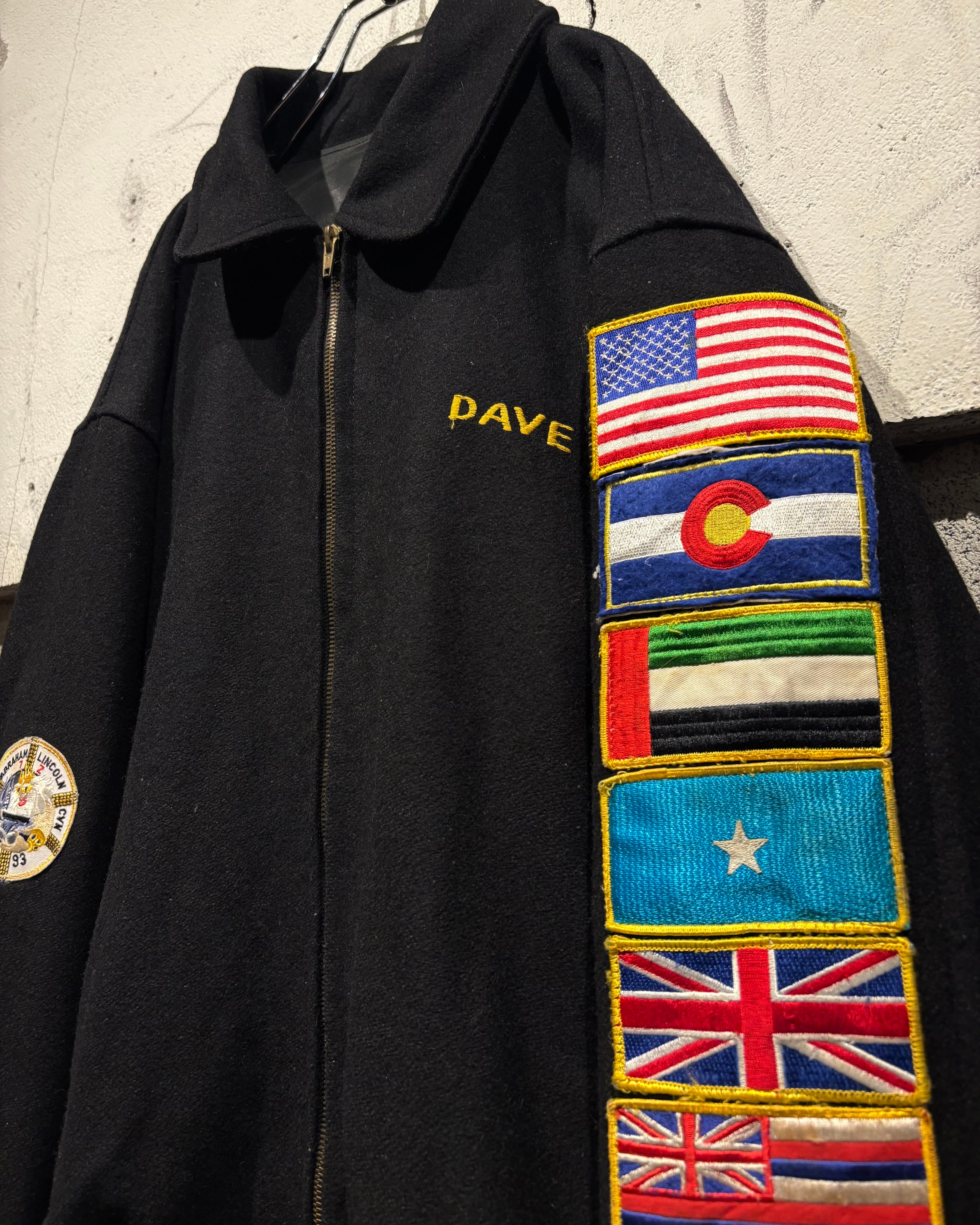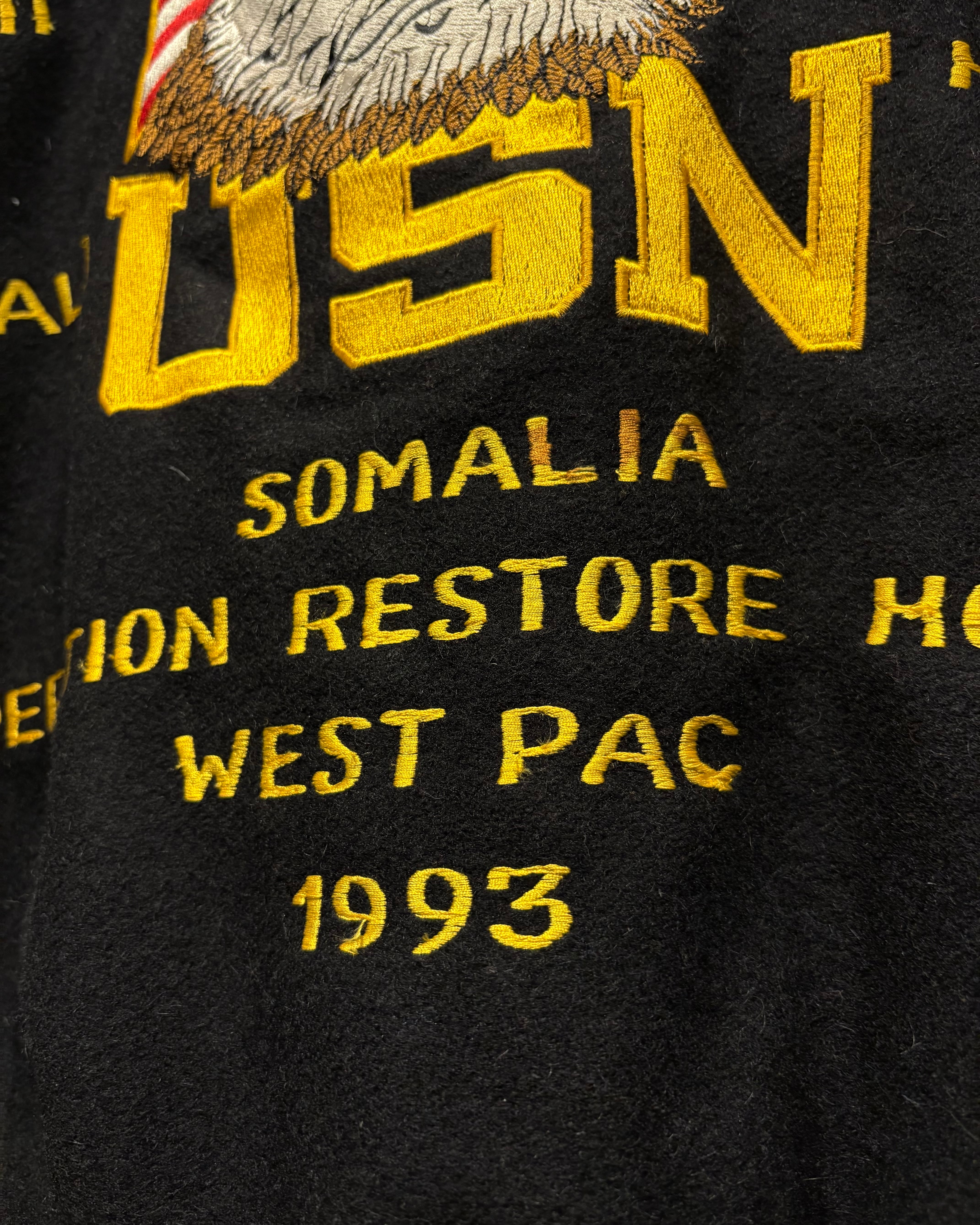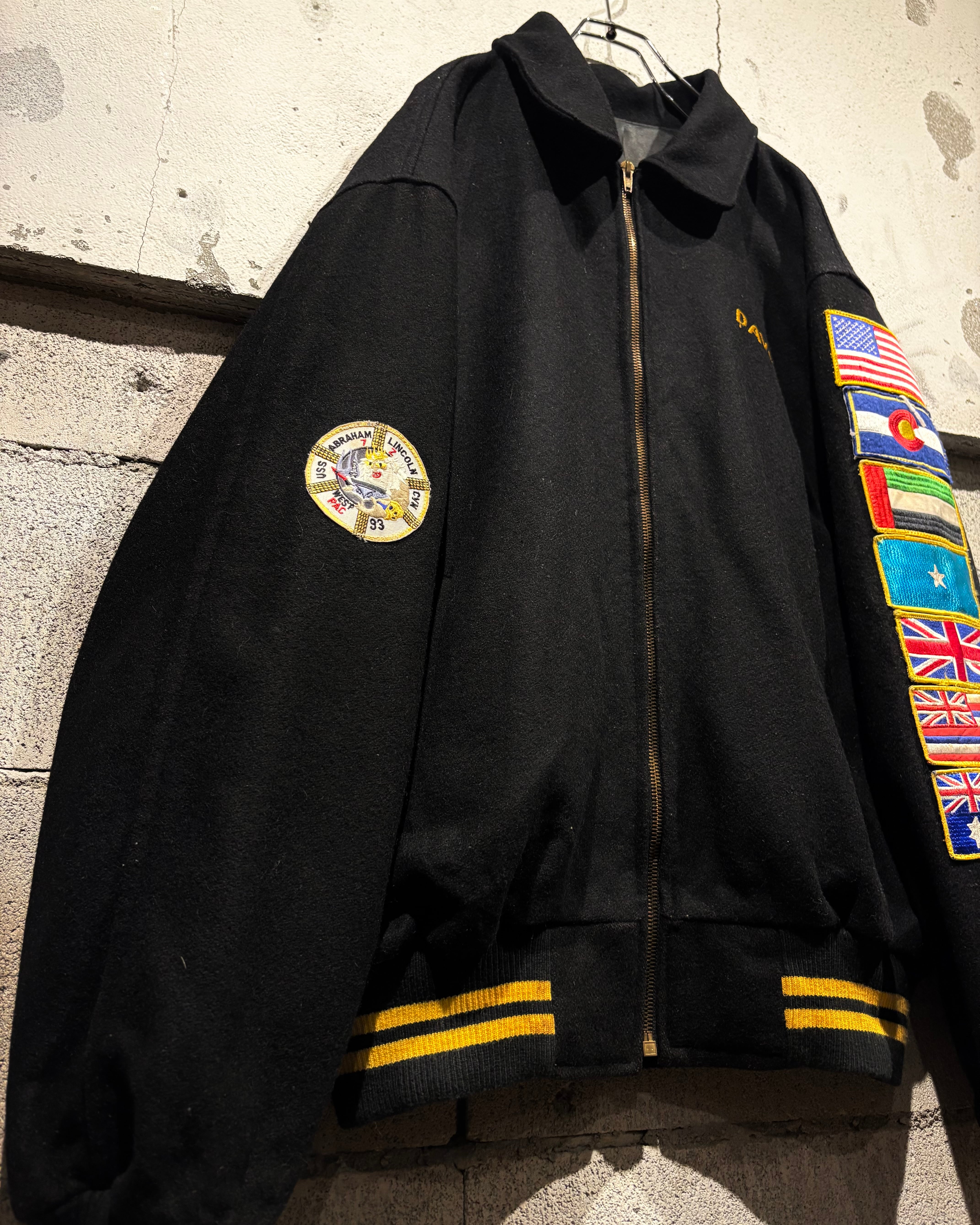 ブラックボディをベースに、フロントは比較的抑えた表情でまとめつつ、最大の見どころは袖からバックにかけて贅沢に施された刺繍。バックにはアメリカ国旗を背にしたイーグルモチーフとUSNのロゴ、艦名や作戦名、年代が丁寧に刺繍で表現されています。袖の国旗ワッペンも◎
