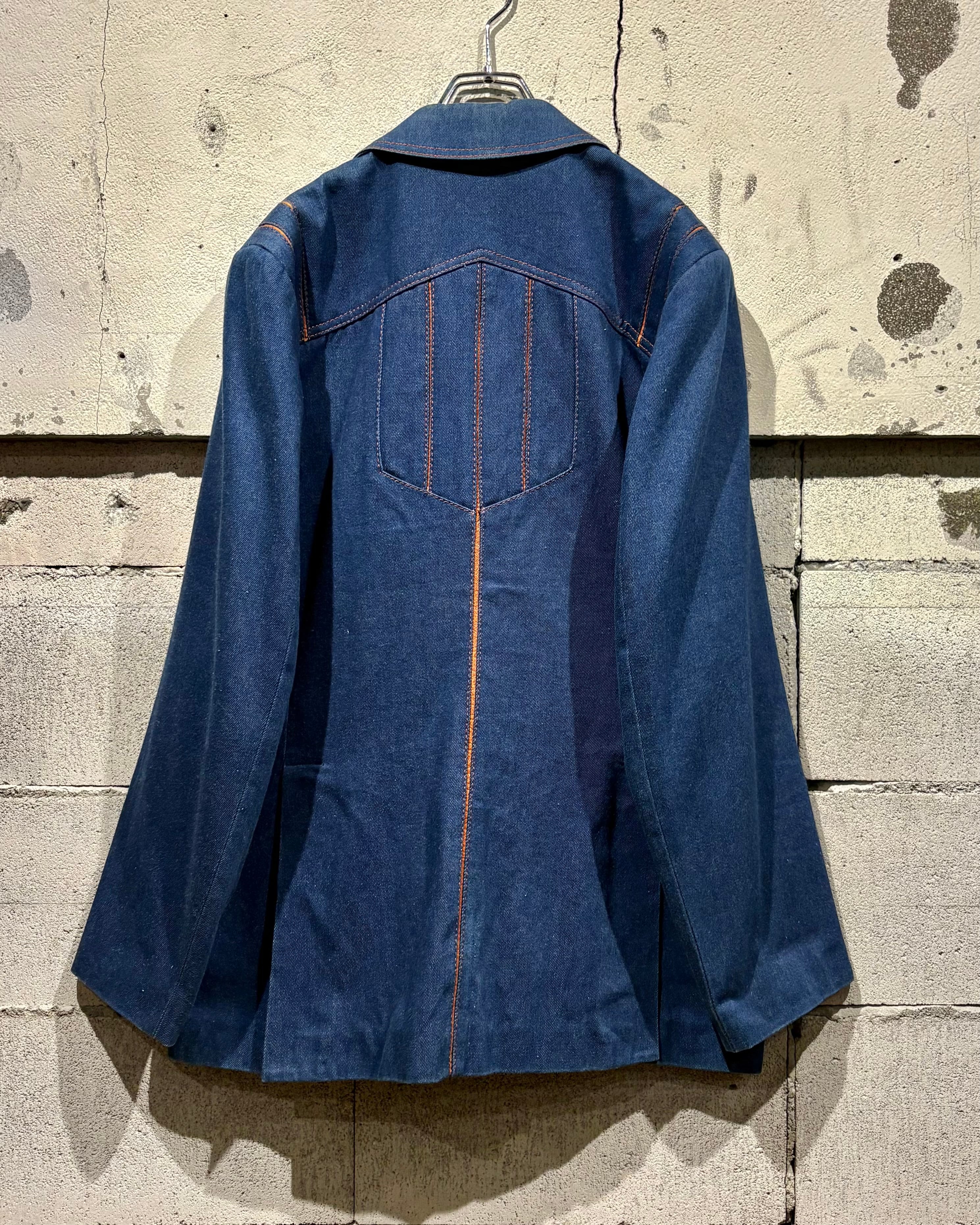 ジャケットは大きめのラペルに、フロント、バックともに走る切り替えステッチが印象的なデザイン。オレンジのステッチワークがデニムのインディゴに映え、切り替えにも抜かりなし。