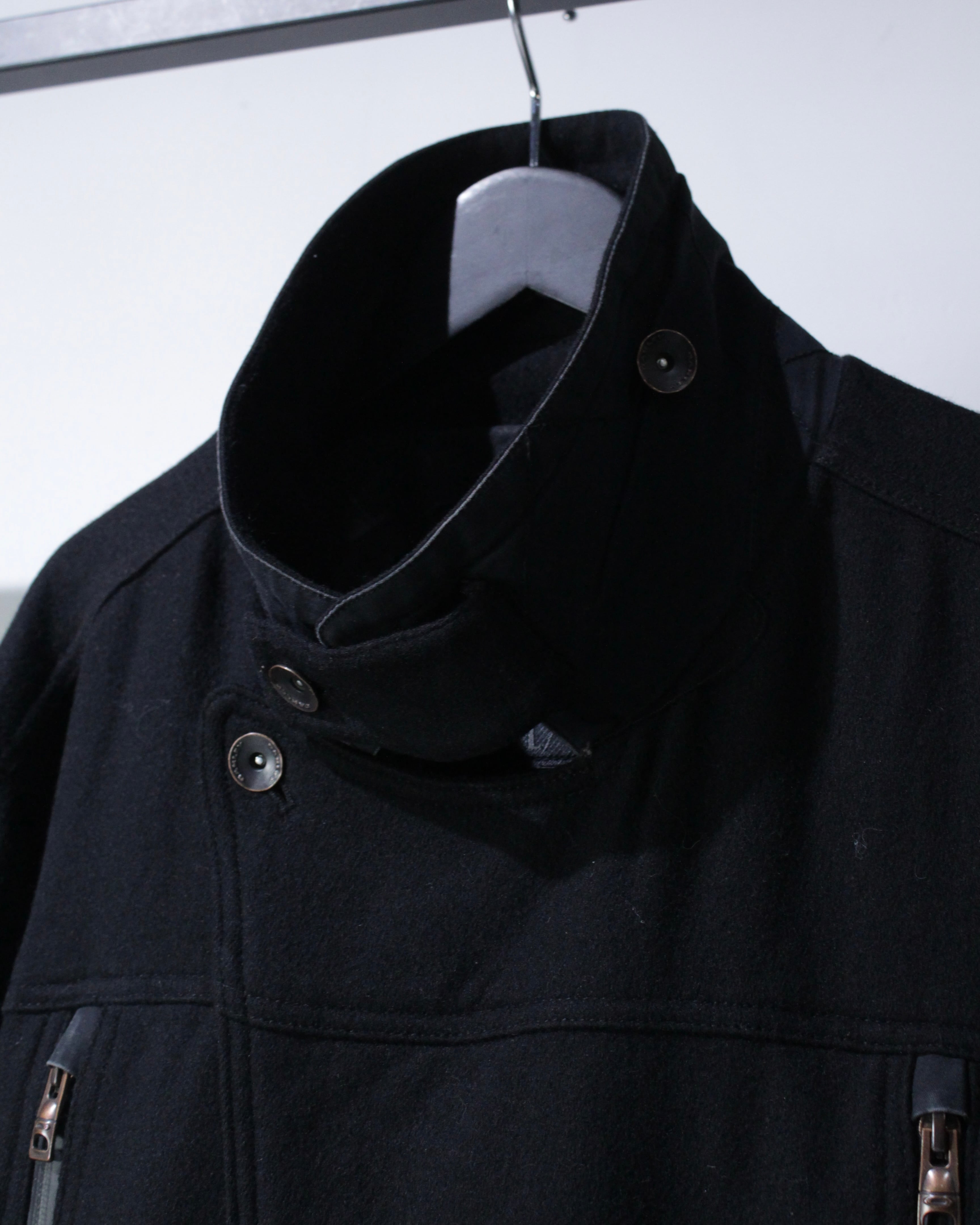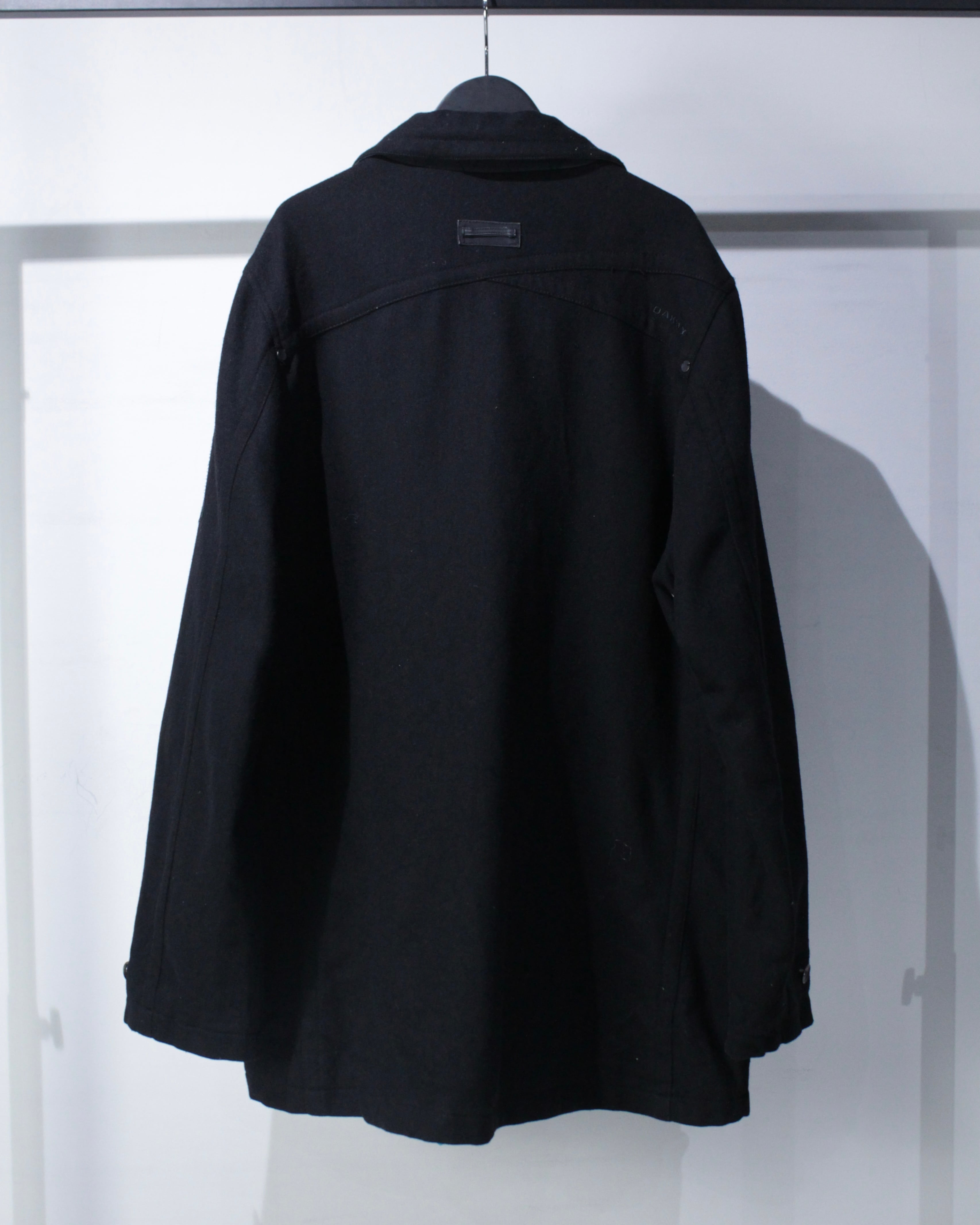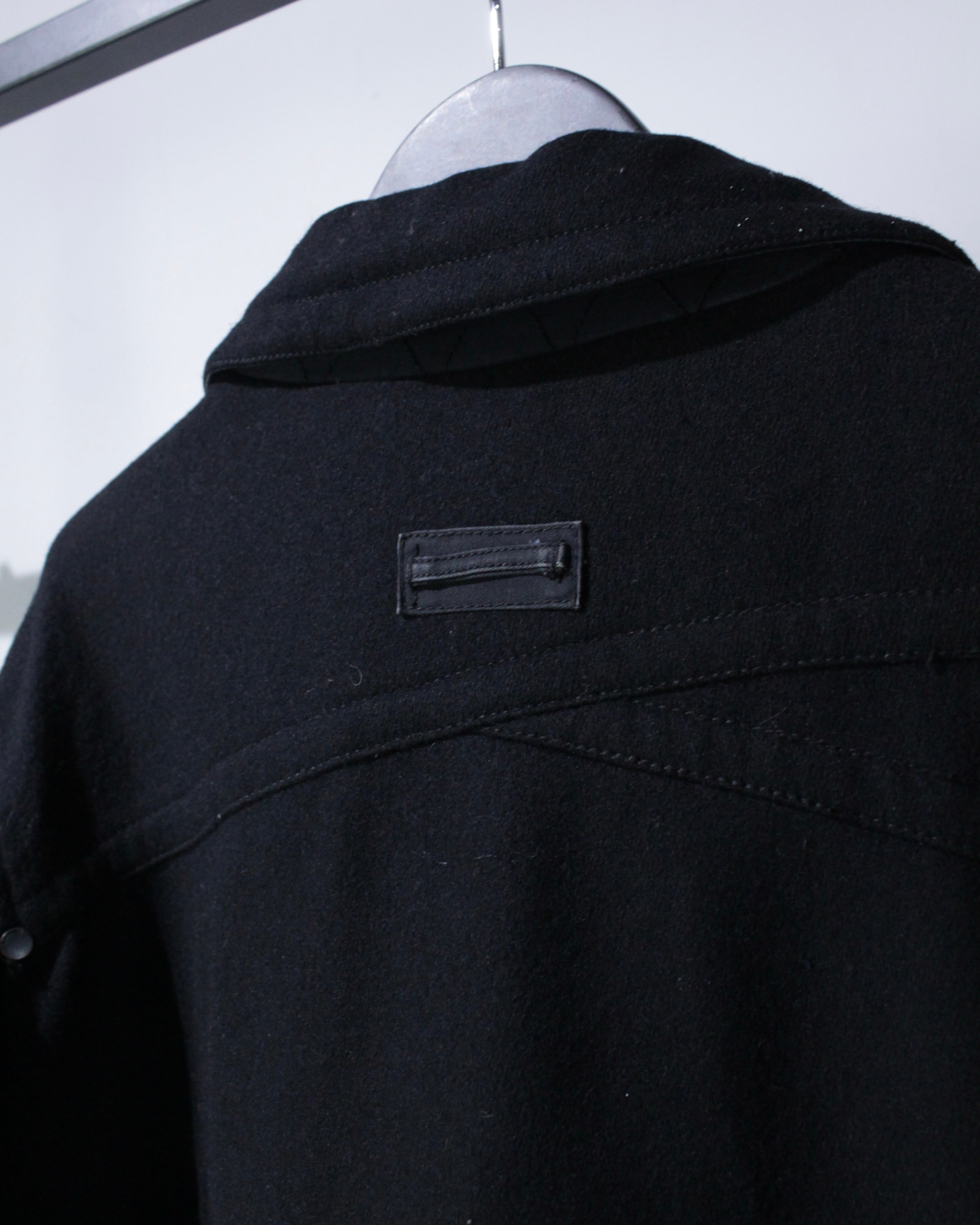 ボディには重厚感のあるウールを採用。ピーコートらしいダブルブレストをベースにしながらも、どこかテックウェアを思わせるシャープな空気感が漂う仕上がりです。