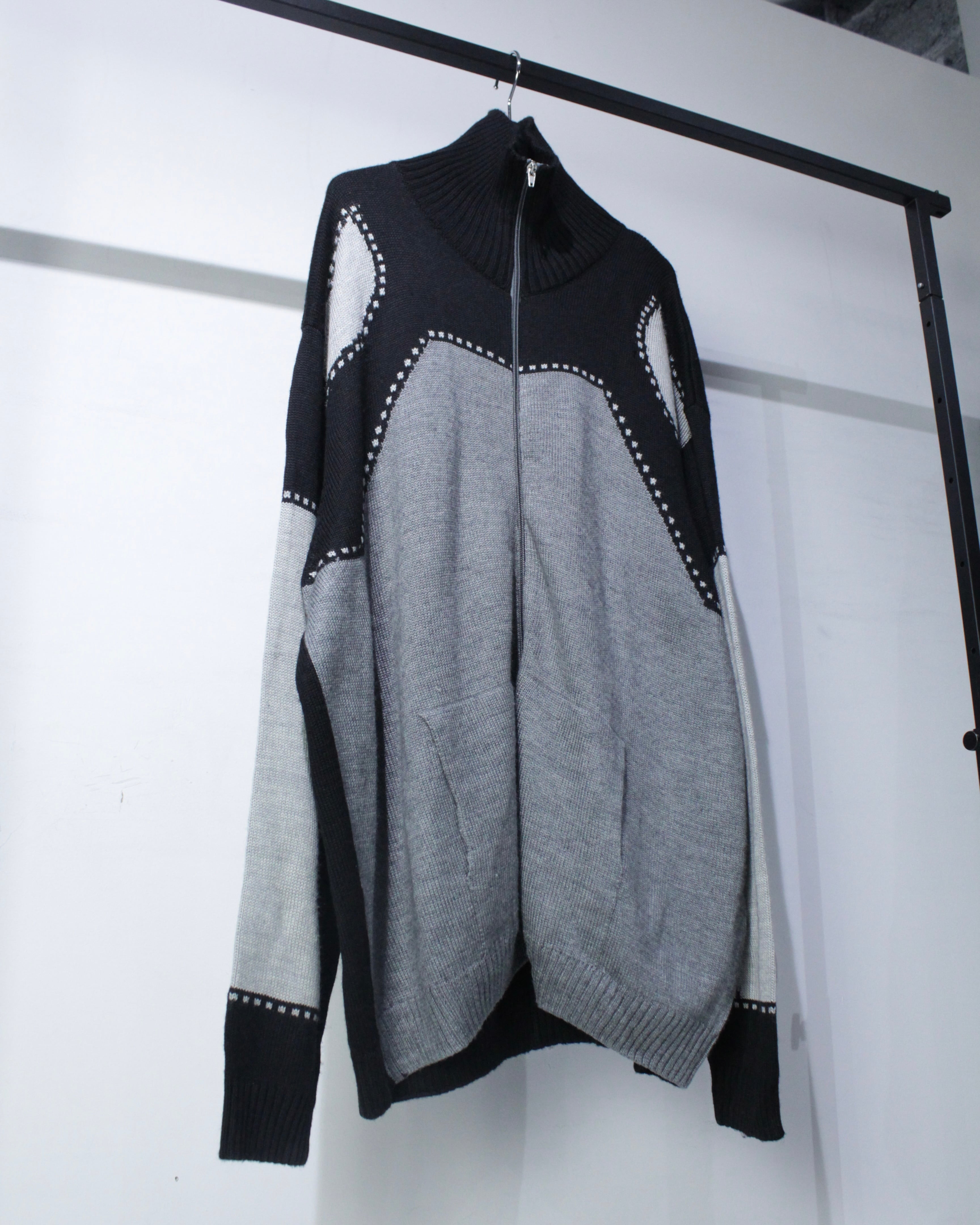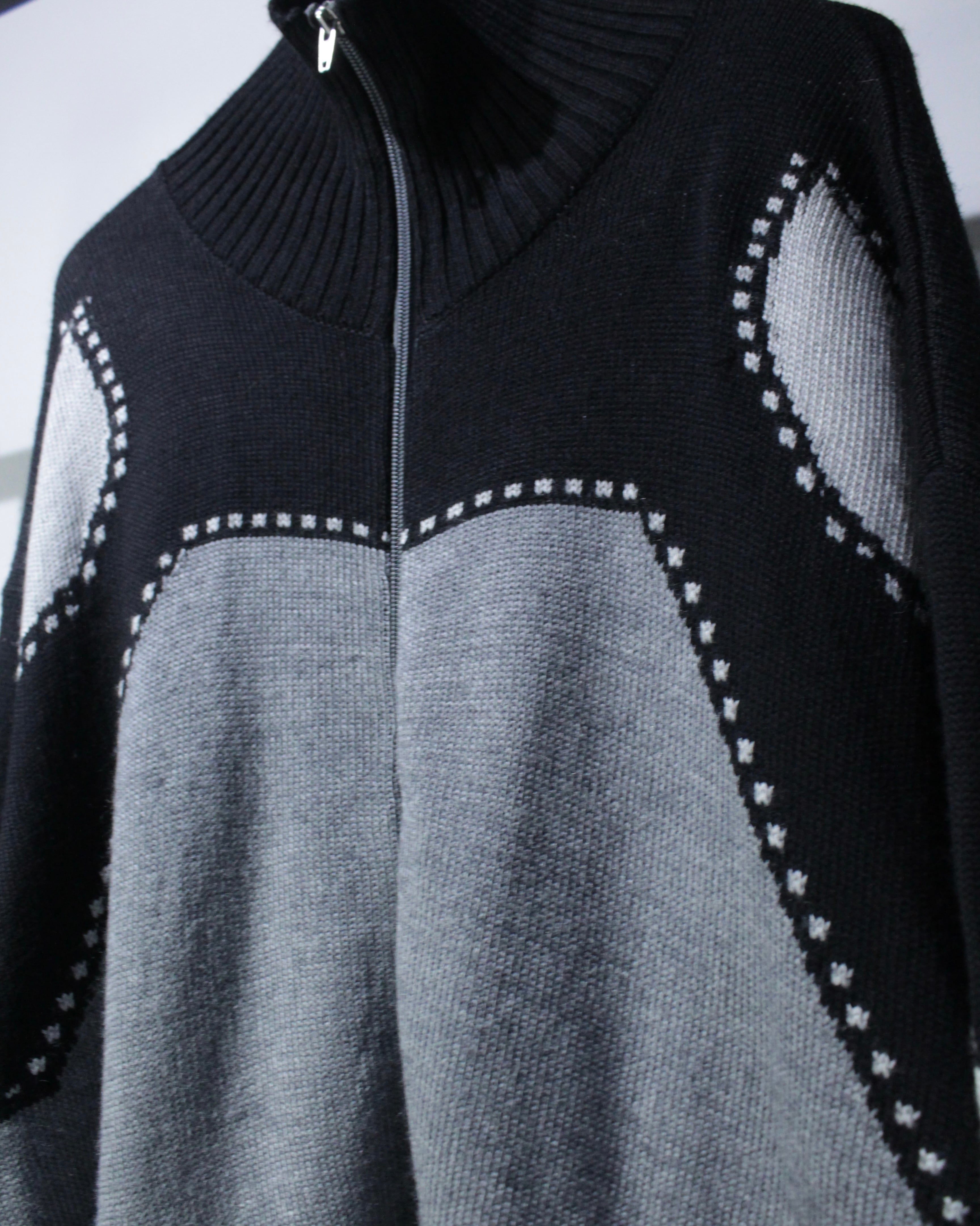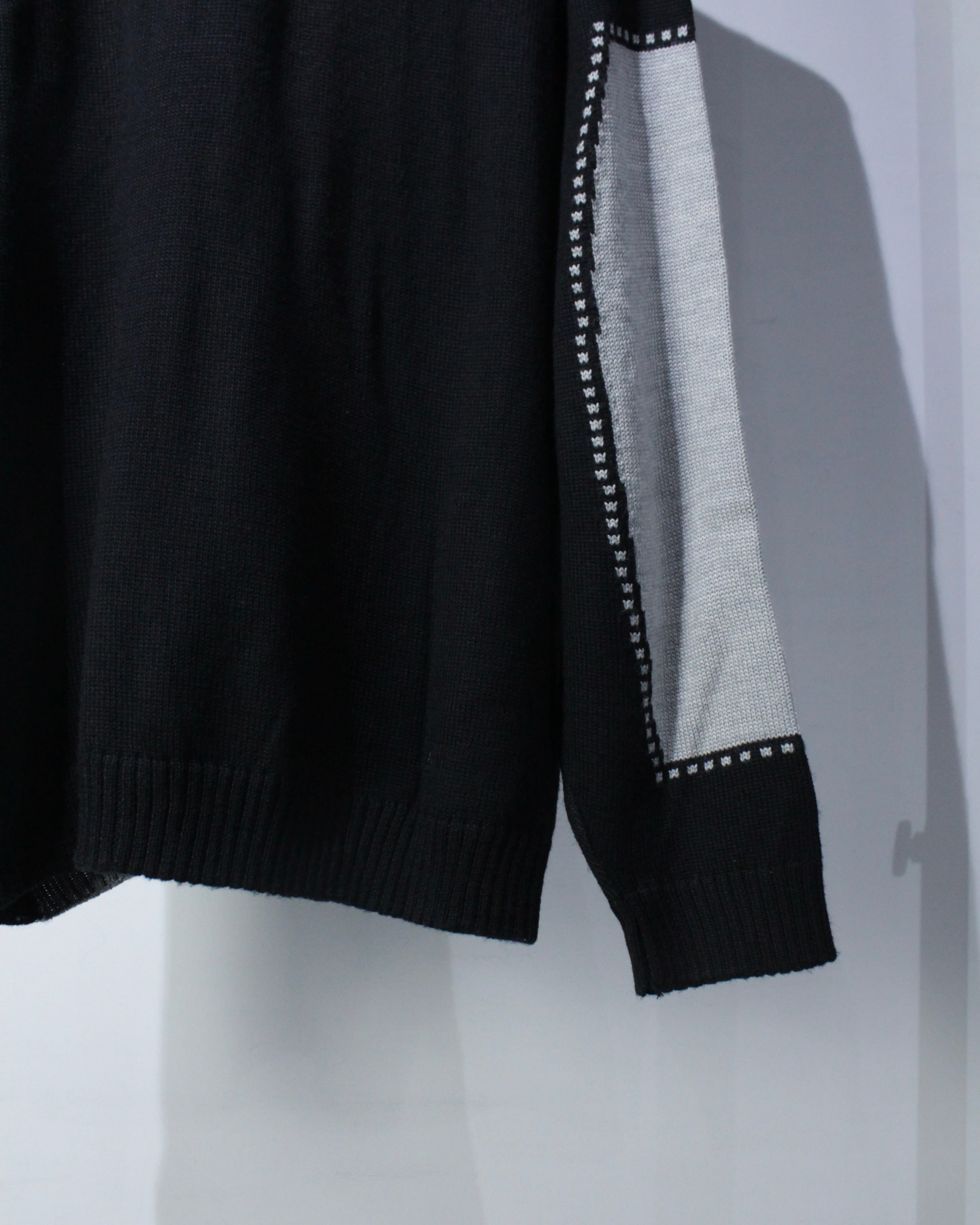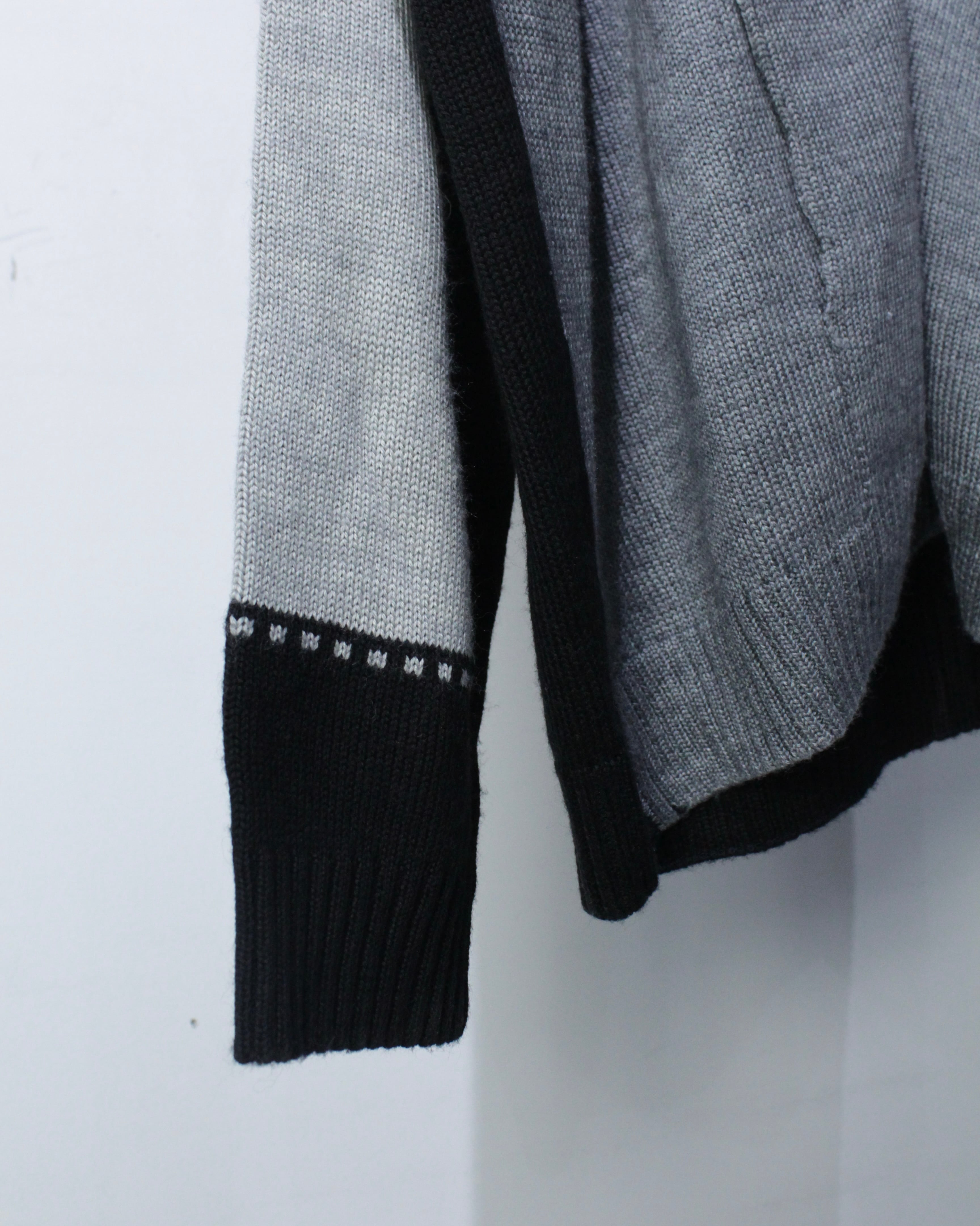 ベースはブラック×グレーの落ち着いた配色ながら、切り替え方やステッチ調の編み柄によって、単調にならない立体的な表情に。