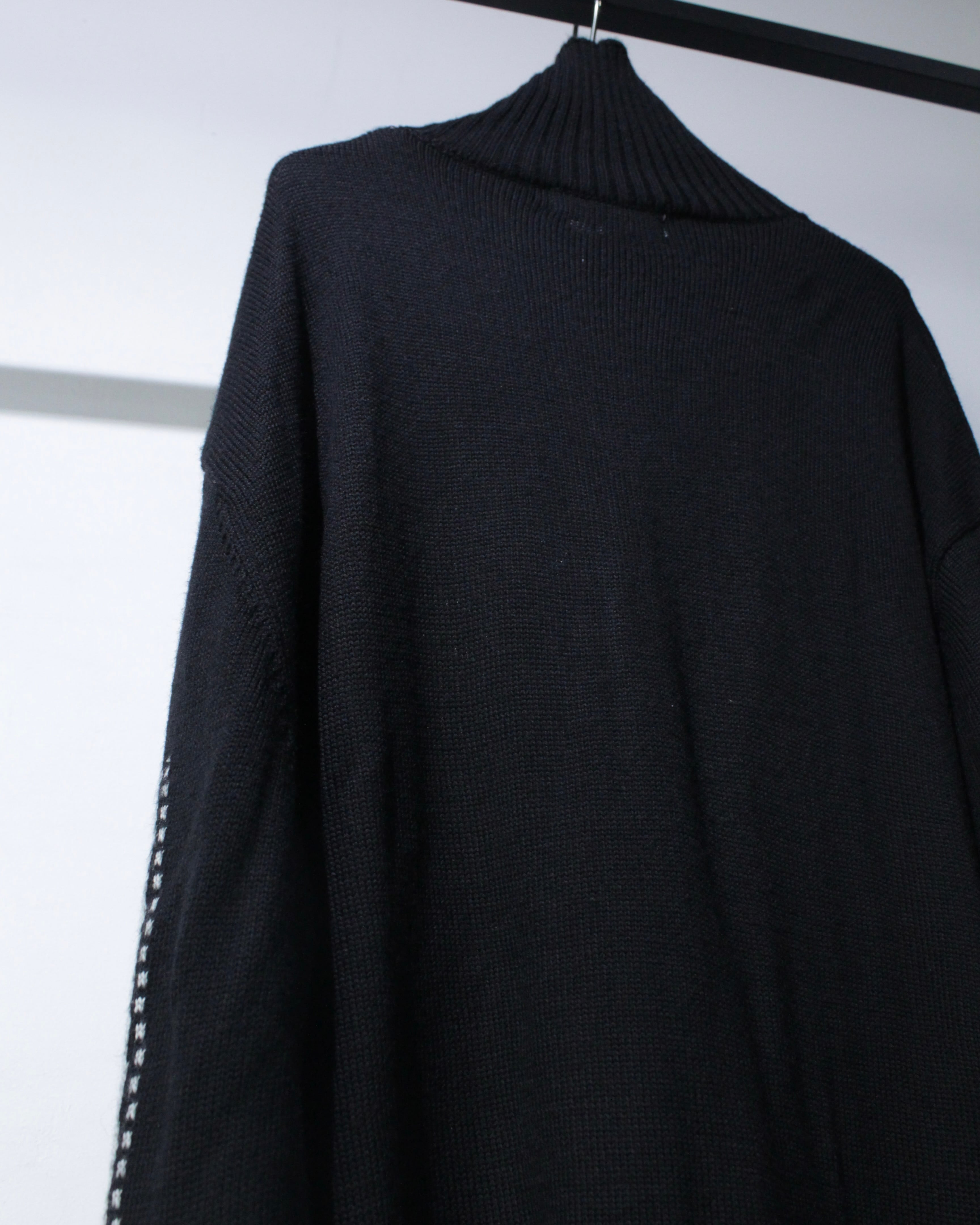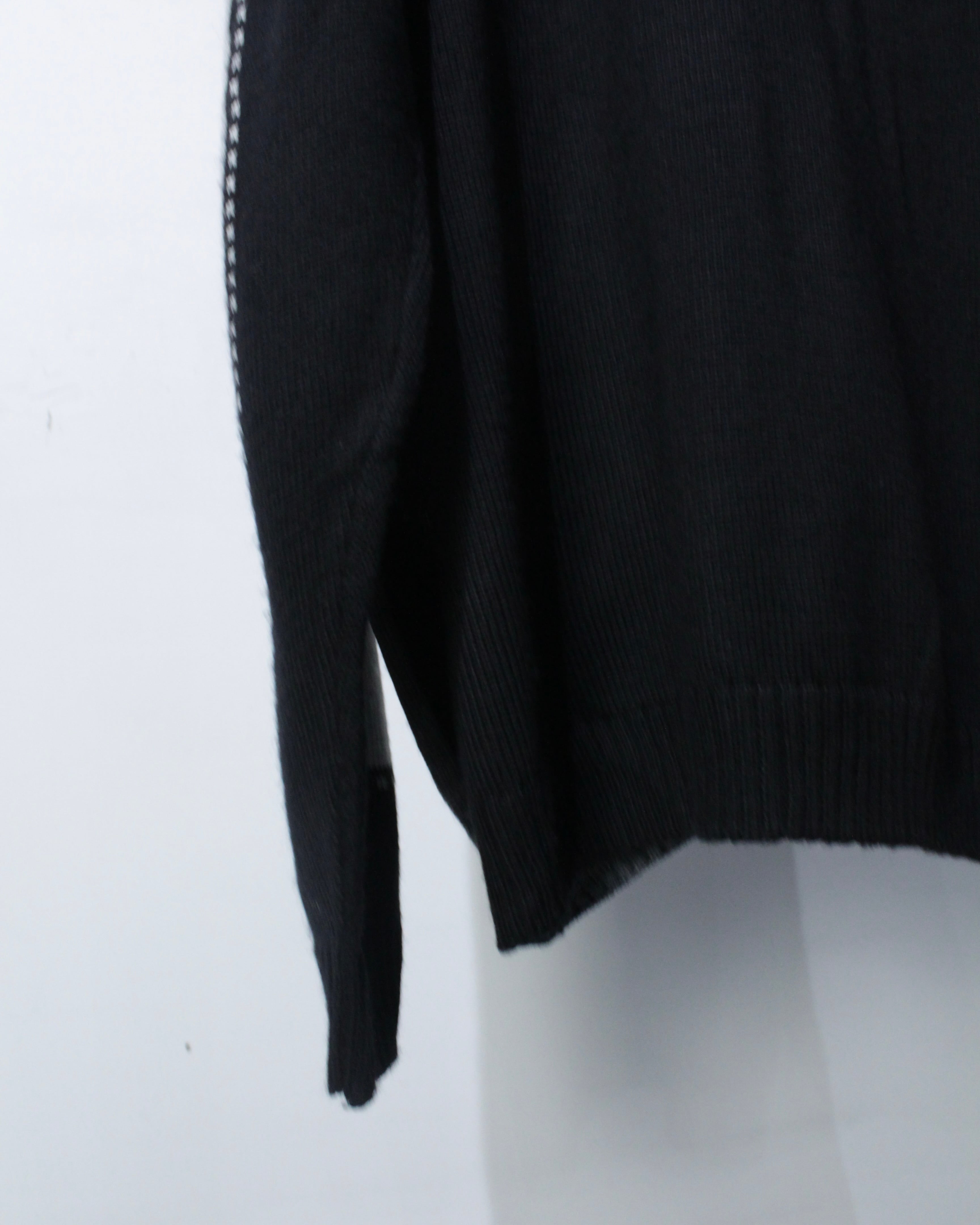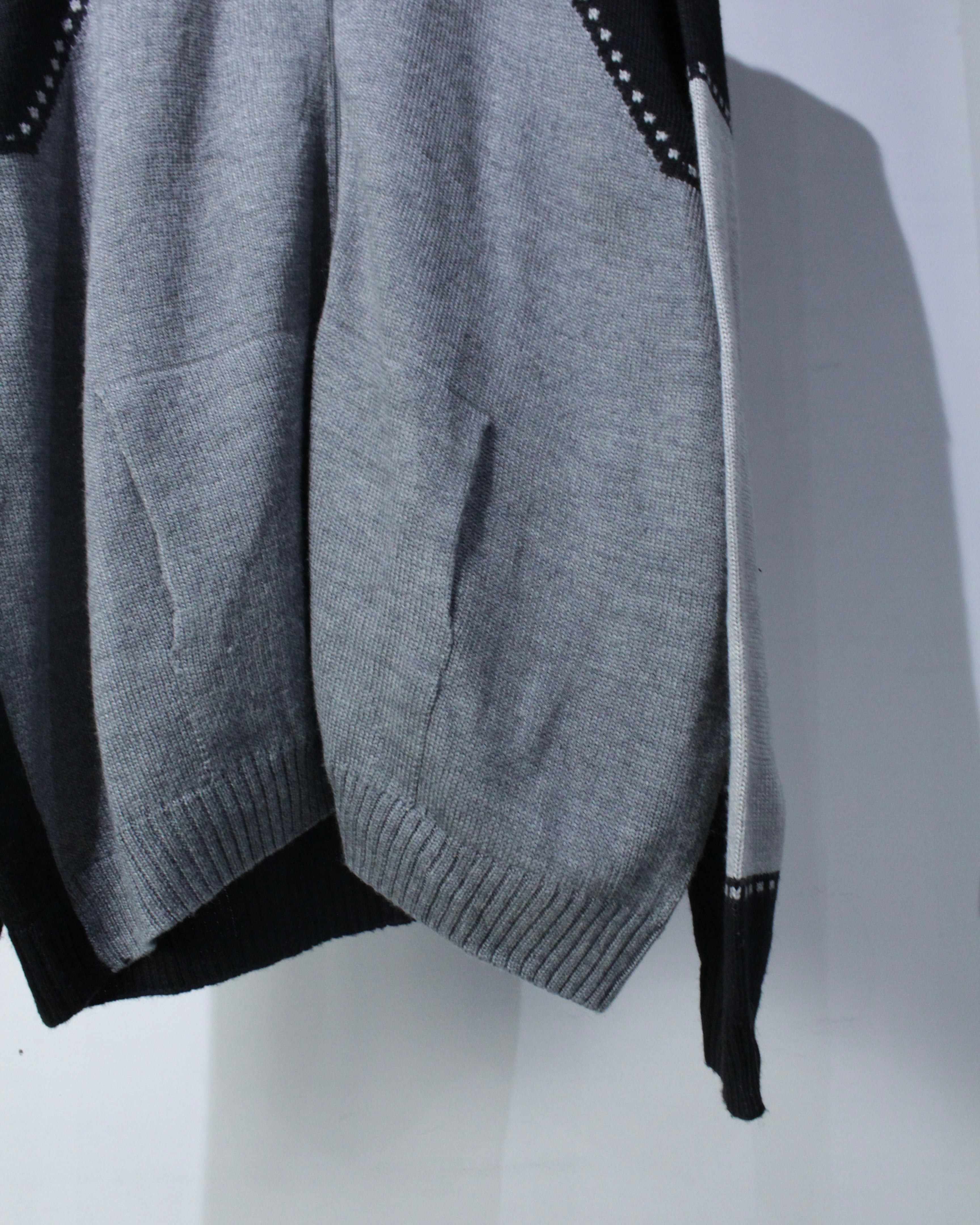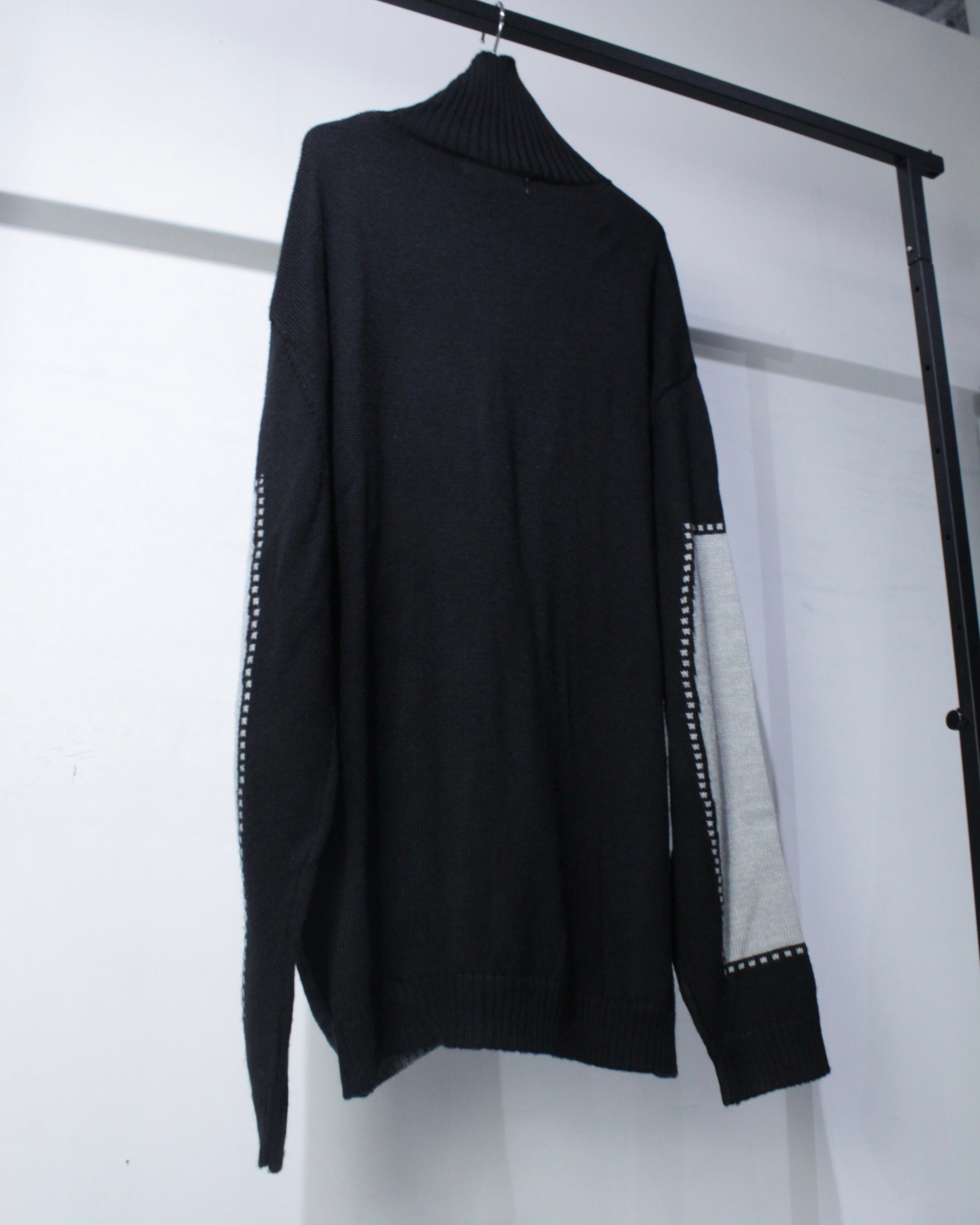 ベースはブラック×グレーの落ち着いた配色ながら、切り替え方やステッチ調の編み柄によって、単調にならない立体的な表情に。